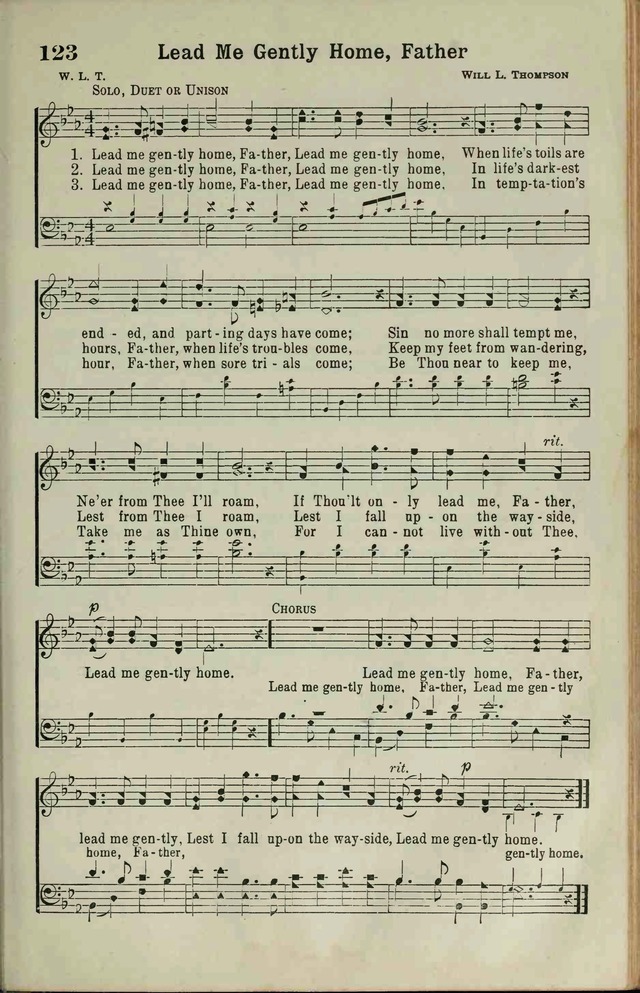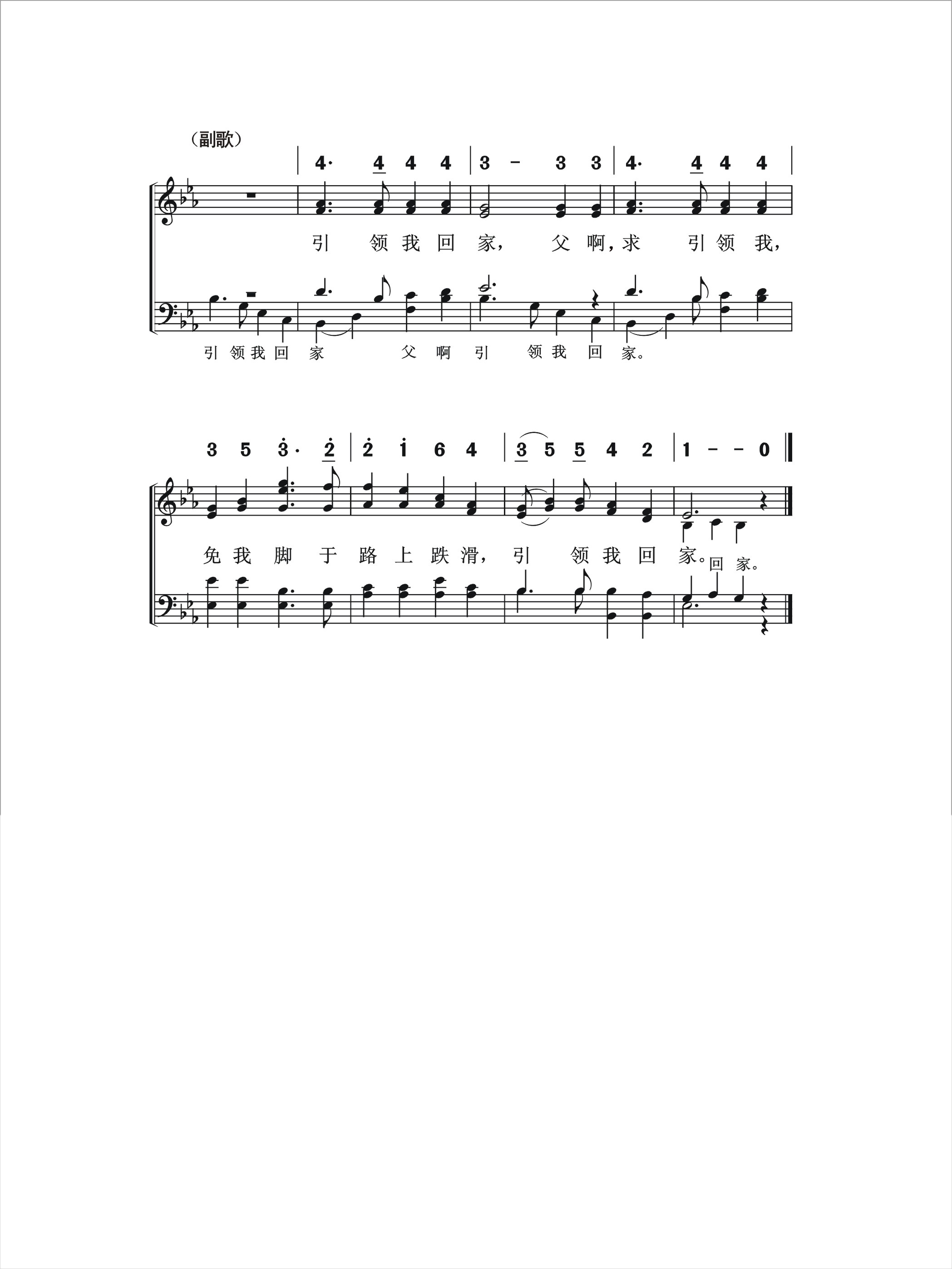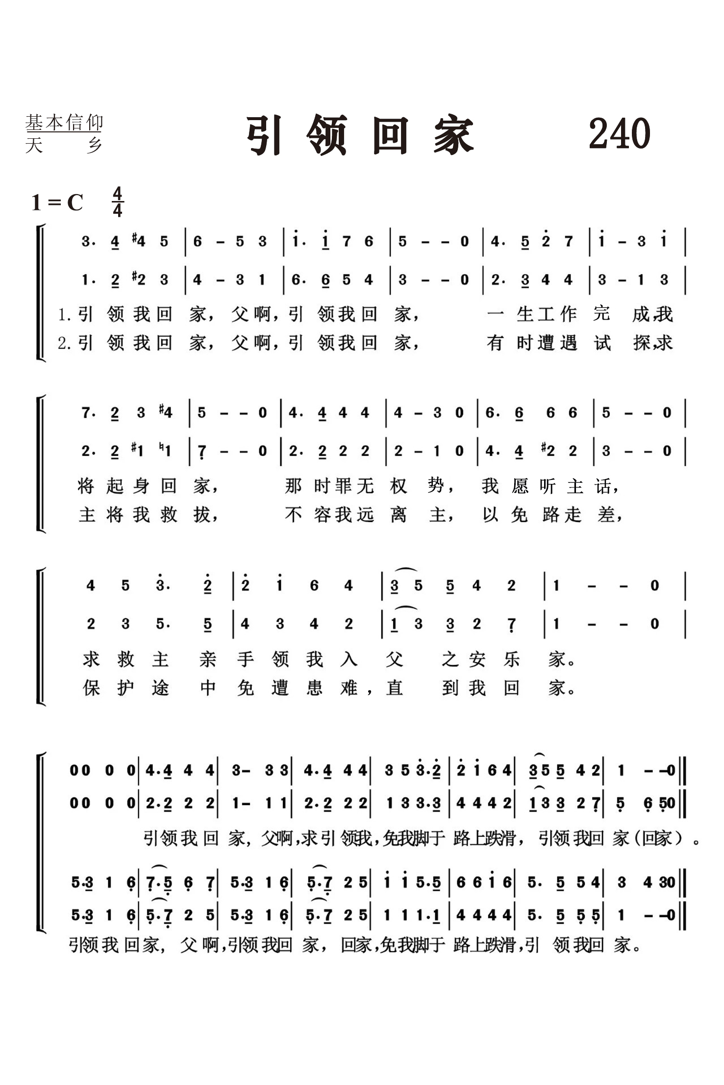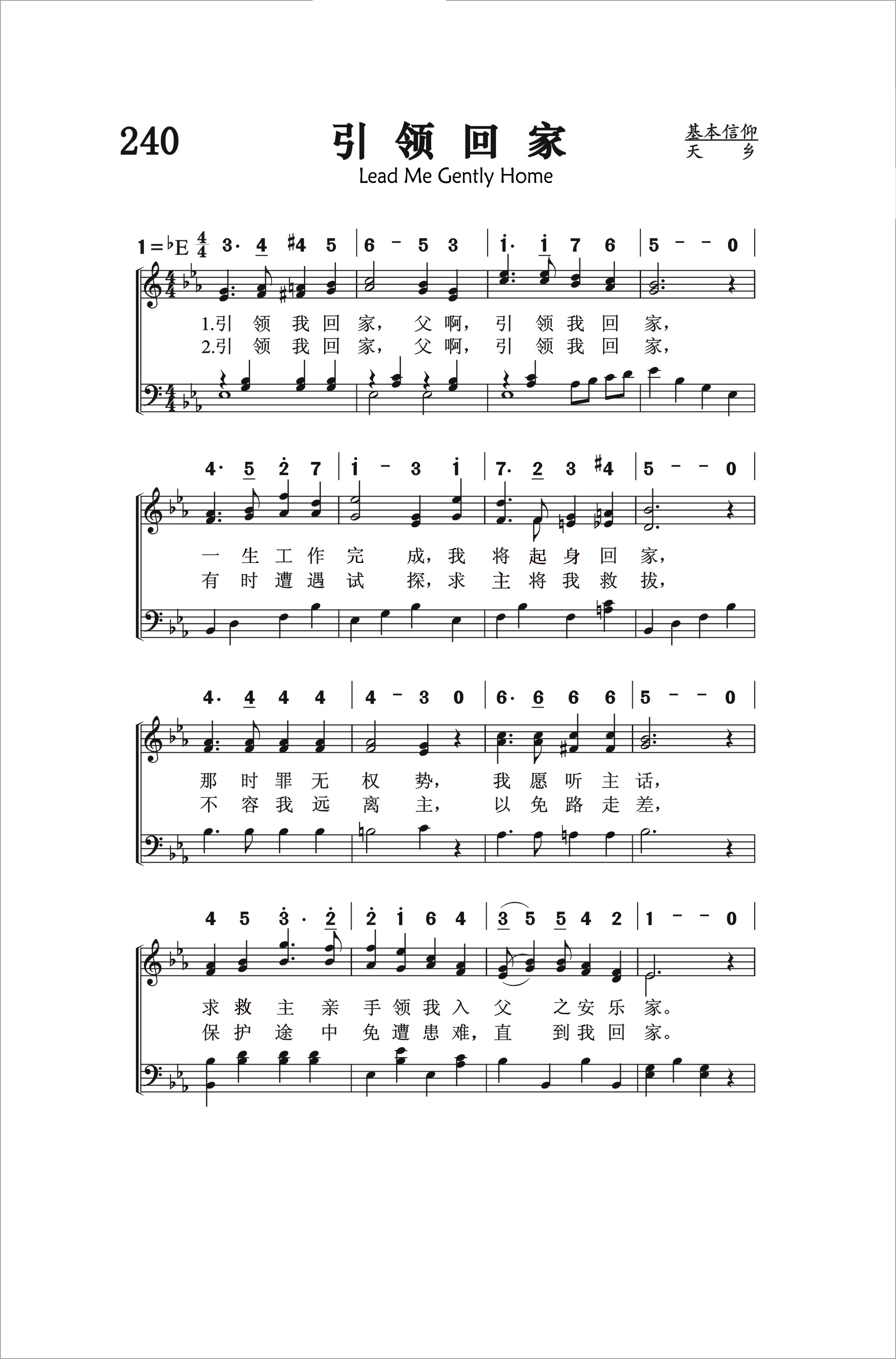 第240首 引领回家Lead Me Gently Home 汤普森(Will.L.Thompson,1847,11,7-1909,2,20)作词作曲 引领我回家,父啊,引领我回家, 一作工作成就,我将等候回家, 那时罪无权势,我愿听主话, 求主亲手领我进入父的安乐家。 引领我回家,父啊,引领我回家, 有时遭遇试探,求父将我救拔, 不容我远离主,以免路走差, 保护途中免遭患难直到我回家。 这首旋律优美的赞美诗表达了基督徒回家的喜乐。虽然道路充满危险和艰难,但他们有一位永生的天父可以依靠。他们深信,在这位愿意舍弃爱子拯救罪人的慈父亲手引领下,他们一定能穿越患难,安抵天家。 被誉为“俄亥俄的诗人”和“百万富翁歌唱家”的汤普森出生于美国俄亥俄州的东利物浦,父亲是个商人。他自幼即表现出音乐天才,16岁就开始制谱作曲。他从波士顿音乐学校毕业以后,留学德国,学成回国后分别在芝加哥和他的故乡创办汤普森出版社,主要印刷发行音乐书刊。他除了自己创作福音圣诗以外,还出版了许多爱国歌曲。他的作品很受欢迎,成为当时很有名望的青年音乐家。汤普森在四十岁时,受了上帝的感召,放下如日中天的事业,决心把自己音乐的天赋奉献给主,专心从事教会圣乐工作。他在自己的出版社里专门出版圣诗和赞美上帝的乐谱。单是四重唱一项就发行了两百万份,使他的福音歌曲不胫而走,传遍全球。当时交通很不便,农村既无留声机,也无收音机,农民没有机会听到有名的歌曲,汤普森就用马车装上钢琴深入农村自编自唱,受到群众的欢迎。布道家慕迪称赞说:“汤普森的品德与他创作的诗歌是一致的——真诚,朴素,正直。” 当年风靡一时,令汤普森成名致富的那些流行歌曲,如今早已被人遗忘,但他所作的圣诗如《生命至宝》(Jesus Is All the World to Me,580首),《引领回家》(LeadMeGentlyHome,Father)等,至今仍为全世界基督徒吟唱,百年不衰。