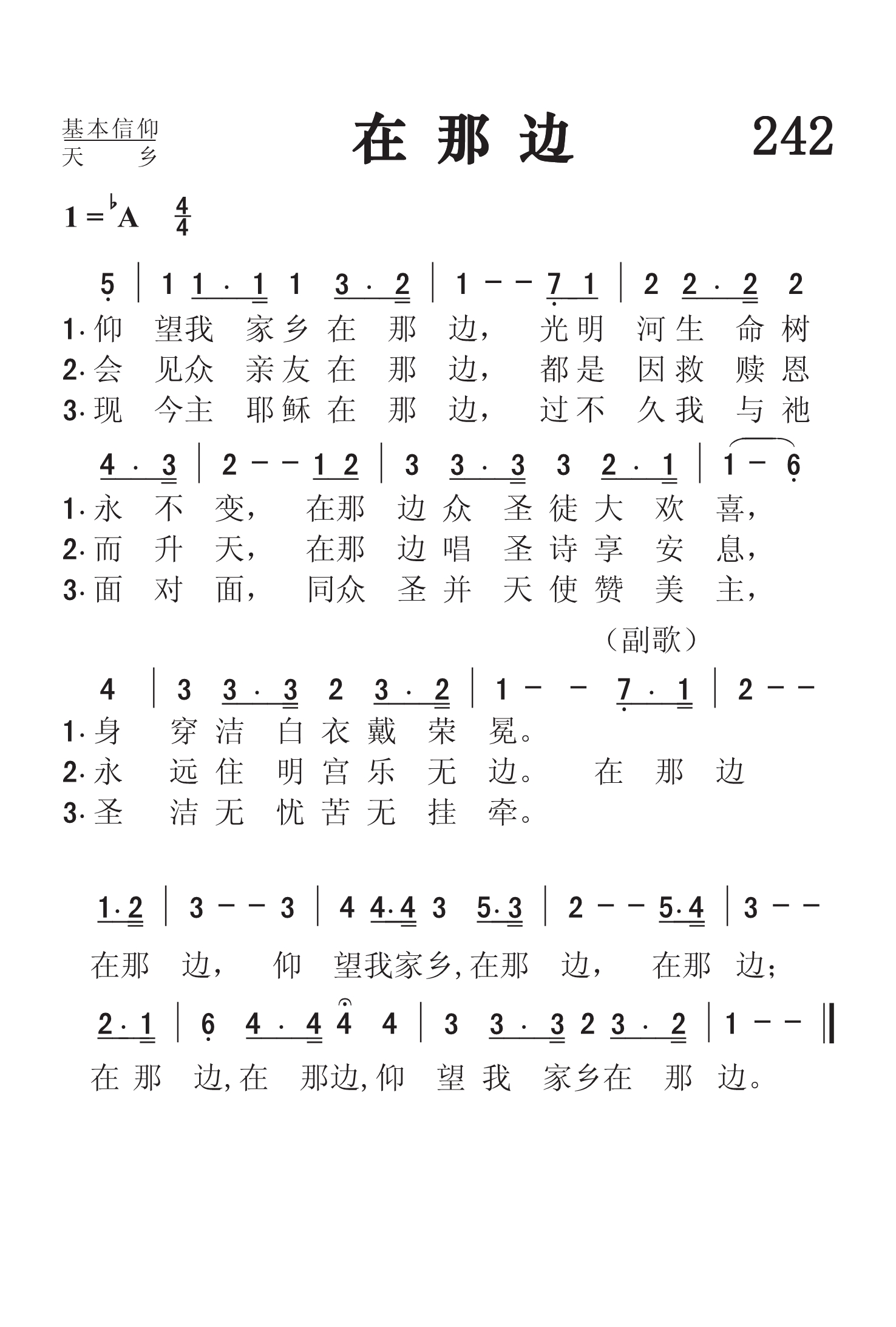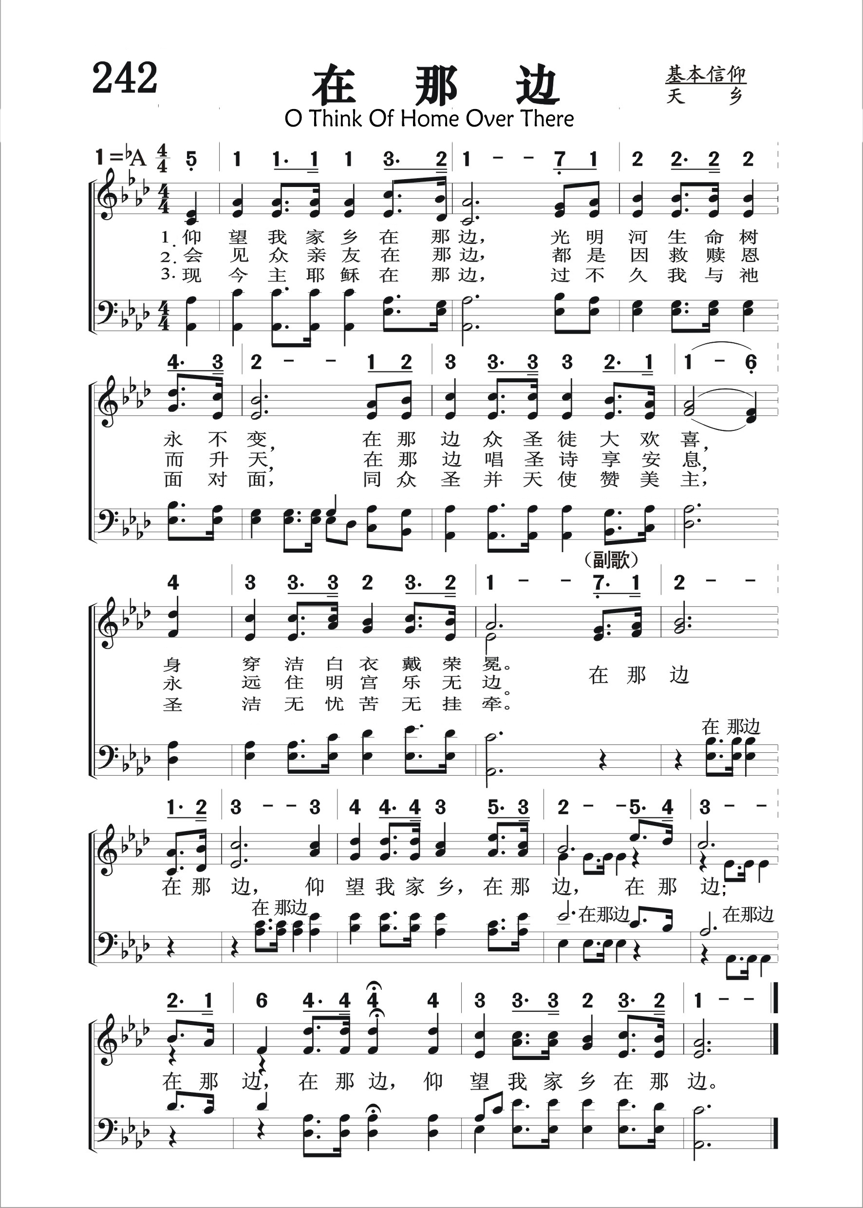 第242首在那边O Think of Home Over There 亨廷顿(D.W.C.Huntington,1830,4,27-1919)作词,奥凯恩(T.C.O‘Kane,1830,3,10-1912)作曲 仰望我家乡在那边,光明河生命树永不变, 在那边众圣徒大欢喜,身穿沽白农戴荣冕。 会见众亲友在那边,都是因救赎恩而升天, 在那边唱圣诗享安息,永远住明宫乐无边。 现令主耶稣在那边,过不久我与祂面对面, 同众圣并天使赞美主,圣洁无忧苦无挂牵。 在那边,在那边,仰望我家乡。 在那边,在那边.在那边,在那边,仰望我家乡在那边。 本诗是作者依据《诗篇》55篇第6节所写的。 词作者亨廷顿出生于美国佛蒙特州,在锡拉丘兹大学毕业后又在吉耶斯大学获神学和文学博士学位。他一生几乎都在内布拉斯州的林肯市教学,担任牧师和写作。 曲作者奥凯恩是出生于特拉华州的音乐家和赞美诗曲谱作家。这首诗的曲调庄重而亲切,使人油然而生对圣徒永久家乡的向往。