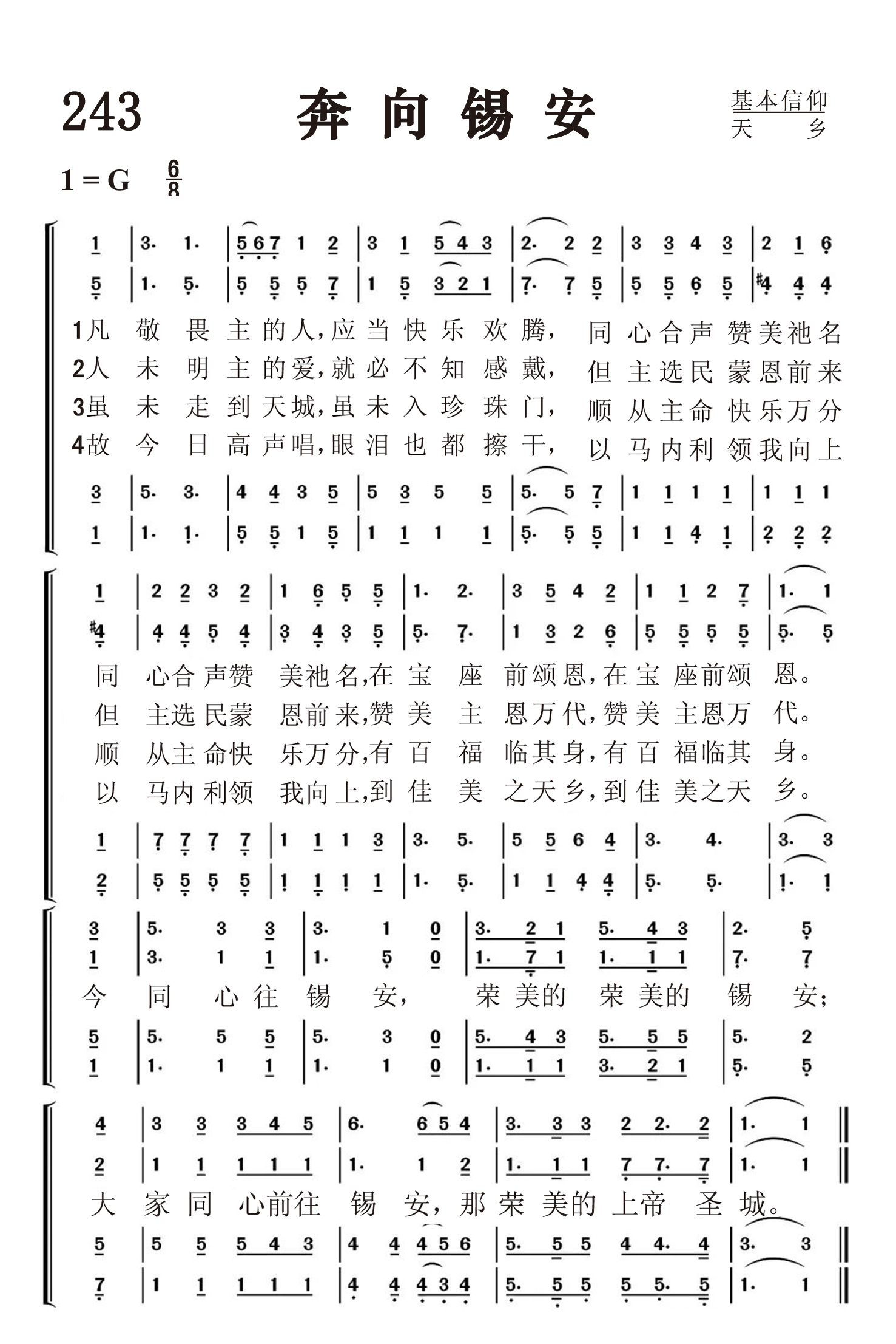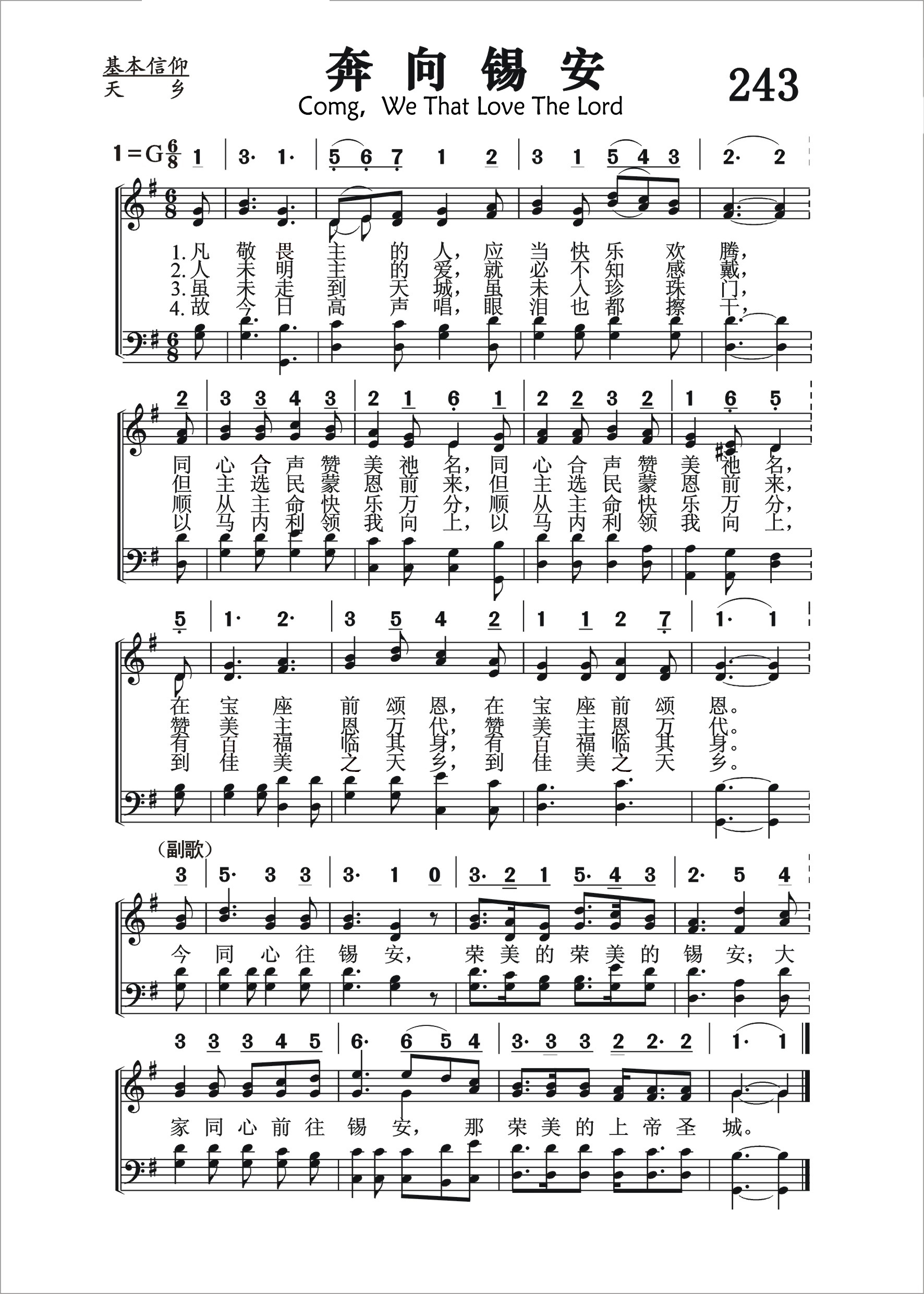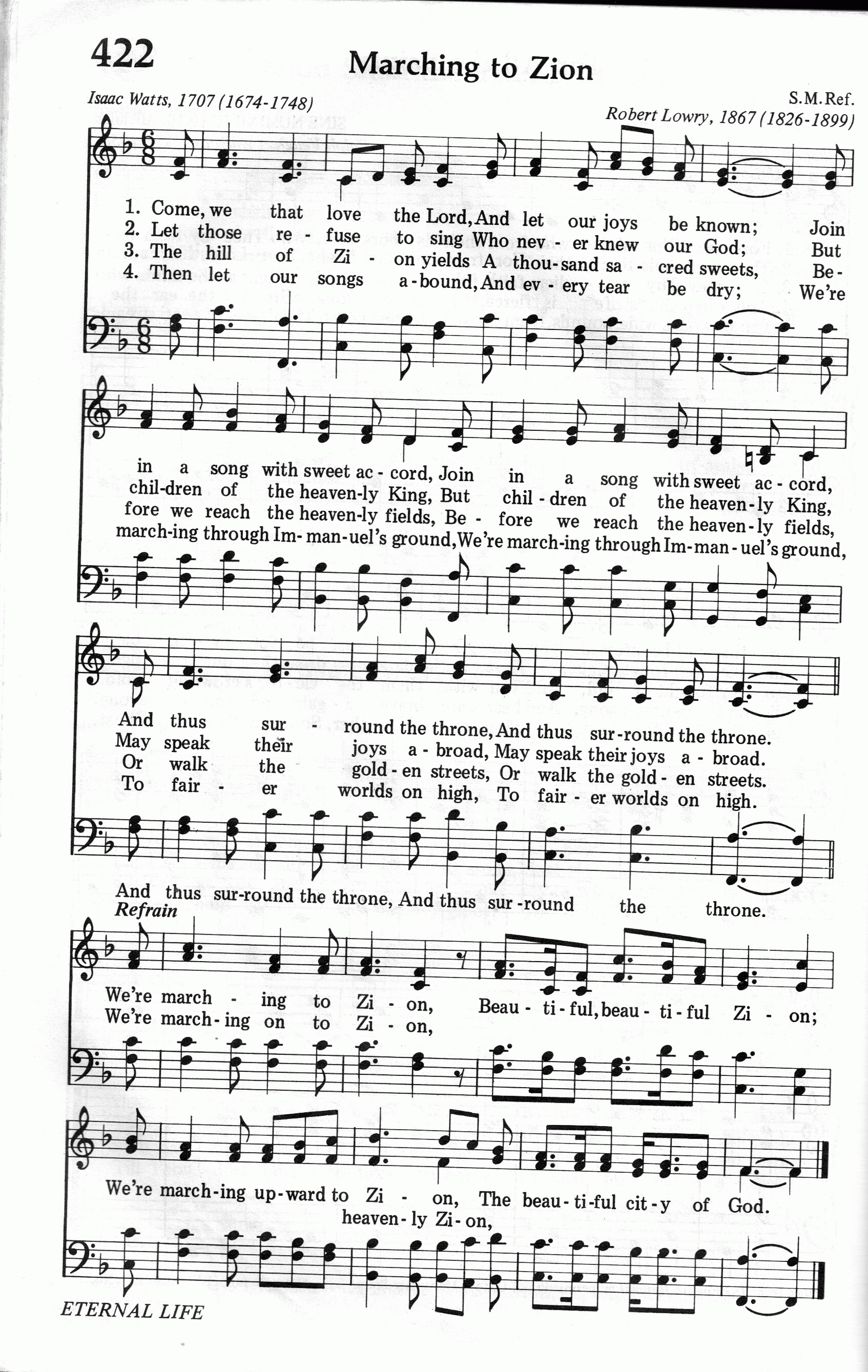 第243首 奔向锡安Come,We That Love the Lord 瓦茨(Isaac Watts, 1674-1748)作词,劳里(R .Lowry,1826,3,12-1899,11,25)作曲 凡敬畏主的人,应当快乐欢腾, 同心和声赞美祂名,在宝座前颂恩。 人未明主的爱,就必不知感戴, 但主选民蒙恩前来,赞美主恩万代。 虽未走到天城,虽未入珍珠门, 顺从主命快乐万分,有永福临其身。 故今日高声唱,眼泪也都擦干, 以马内利领我向上,到佳美之天乡。 今同心往锡安,荣美的荣美的锡安; 大家同心前往锡安,那荣美的上帝圣城。 词作者瓦茨出生于英国独立教会一位执事的家庭。当时不属国教的信徒横遭迫害,瓦茨的父亲曾因此被捕入狱,但他们全家人都信仰坚定,刚强不屈。母亲常抱着小瓦茨去探监。由于家境贫困,营养不足,小瓦茨从小身体虚弱,身体矮小。及至长大无钱上学。曾有人愿出资供他上学,但以毕业后要在国教内任圣职为条件,遭到他父子的坚决拒绝,毅然决定自己到伦敦私立学校半工半读。 瓦茨从小就表现出文学方面的才华。18岁那年他从伦敦学校回家度暑假,在参加礼拜后,他指出所唱诗篇实在平淡乏味。担任该堂执事的父亲对他说:“青年人,你不要消极地指责和批评。你说不好,请你写点好的给我们吧!”他接受了这个挑战,回家后就根据《启示录》第5章写了一首八节的长诗,题为《颂赞被杀的羔羊》,下周带到教会,让信徒群众试唱,受到他们热烈的欢迎。他们要求他继续写下去。于是他几乎每周都写一首,到他21岁时便积累了一百多首,先后出版了好几本圣诗集,其中以1707年问世的《圣诗与灵歌》和1719年出版的《以新约的言语仿写大卫的诗篇》,最为脍炙人口。这些以旧约的诗篇为依据所写的具有福音特点的现代圣诗,为教会的崇拜增色不少。 瓦茨虽然很有才华,但为人和蔼可亲,平易近人,通情达理。他一生健康欠佳, 却坚持登台讲道,诲人不倦。 瓦茨在1712年因身体不佳,就接受了伦敦阿布尼爵士夫妇的邀请,到他家别墅休养。原定做客一星期,谁知一住就是36年,直到去世。瓦茨的许多诗文是在这个别墅内写成的。除写圣诗以外,瓦茨还将《诗篇》译为韵诗,且着《逻辑学》一书,英国牛津大学曾选作课本。1728年爱丁堡大学授予他荣誉博士学位;他的名字被列入《英国诗人传》之中。他去世后,英国威斯敏斯特教堂特为他立了一个纪念碑。 瓦茨一生写诗600余首,在当时是一个最高记录,难得的是至今仍有许多为人传诵不衰。 瓦茨在这首诗中表达了基督徒对荣美天乡的向往和追求。诗人用最美丽的语言描绘了主耶稣为信徒所预备无限美好的家园。当我们在这充满危险和苦难的世界中行走的时候,天家的盼望将给我们带来鼓舞和安慰。因为今生的一切都是暂时的。我们要在永恒之中找到我们心灵的归宿。 曲作者劳里出生于美国费城。大学毕业后,担任费城,纽约布鲁克林等地浸会教堂的牧师。1869至1875年兼任母校修辞学教授,离校时母校赠送他荣誉神学博士学位。1875年起至1899年去世,一直任新泽西州普兰菲尔德地方浸会牧师。他自幼爱好音乐,但并没有专学音乐,直到他41岁后才致力于福音音乐圣诗的编写,并自己作曲配和声。有人问他:“你怎么又能作词又能作曲并能配以和声呢?”他回答说:“我也没有什么特别的办法。有时,音乐曲调在我心中出现,而词句也随着出来了,词与曲就配合得很好。我常常注意着自己的心境,无论是在家中,还是走在街上,任何事物触动了我的灵感,我就马上抓住它,把它记录下来。我有时在报纸的边上或一个旧信封的背面,把我的灵感记录下来。我觉得我的头脑就象一架常转动的纺车,音乐从其中流了出来,有时并不注意在我头脑里流出来的曲调是C调还是A调,只有当我把它写在纸上时,才想它当用什么调。我在纸上一面写,一面把它完成,成为一首曲调,然后再到管风琴上去试奏,不是先试奏而后写出,而常常是曲调与词一同写出。” 劳里还说:“我有时宁愿写赞美诗可以长期流传下来,影响很多的人,因为讲道完毕后常常会被人遗忘。”的确,他当时讲道的听众只有一千人,而他所写的赞美诗多年以来却有成千上万的人在颂唱。劳里牧师一生编辑过十八种不同的赞美诗集。