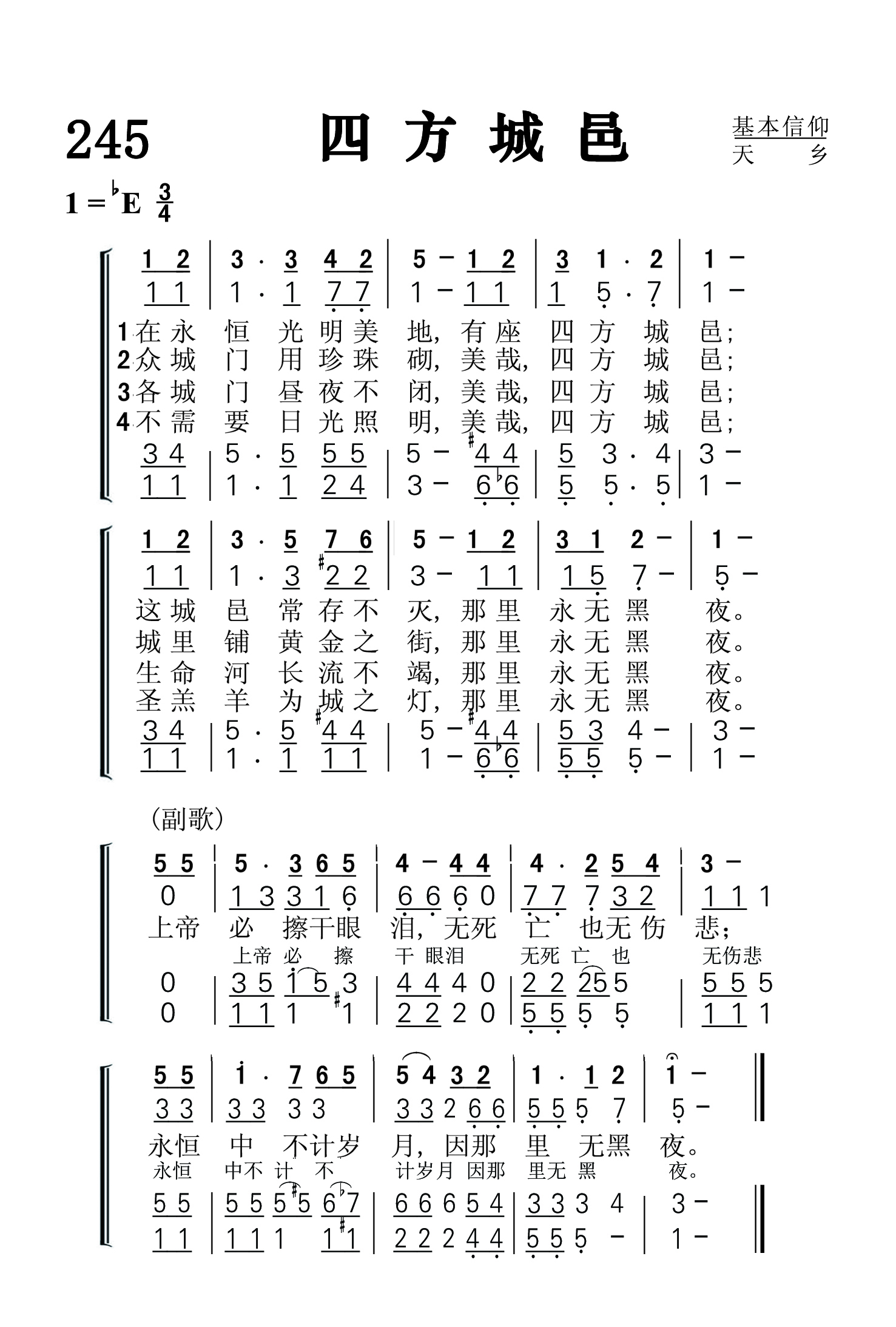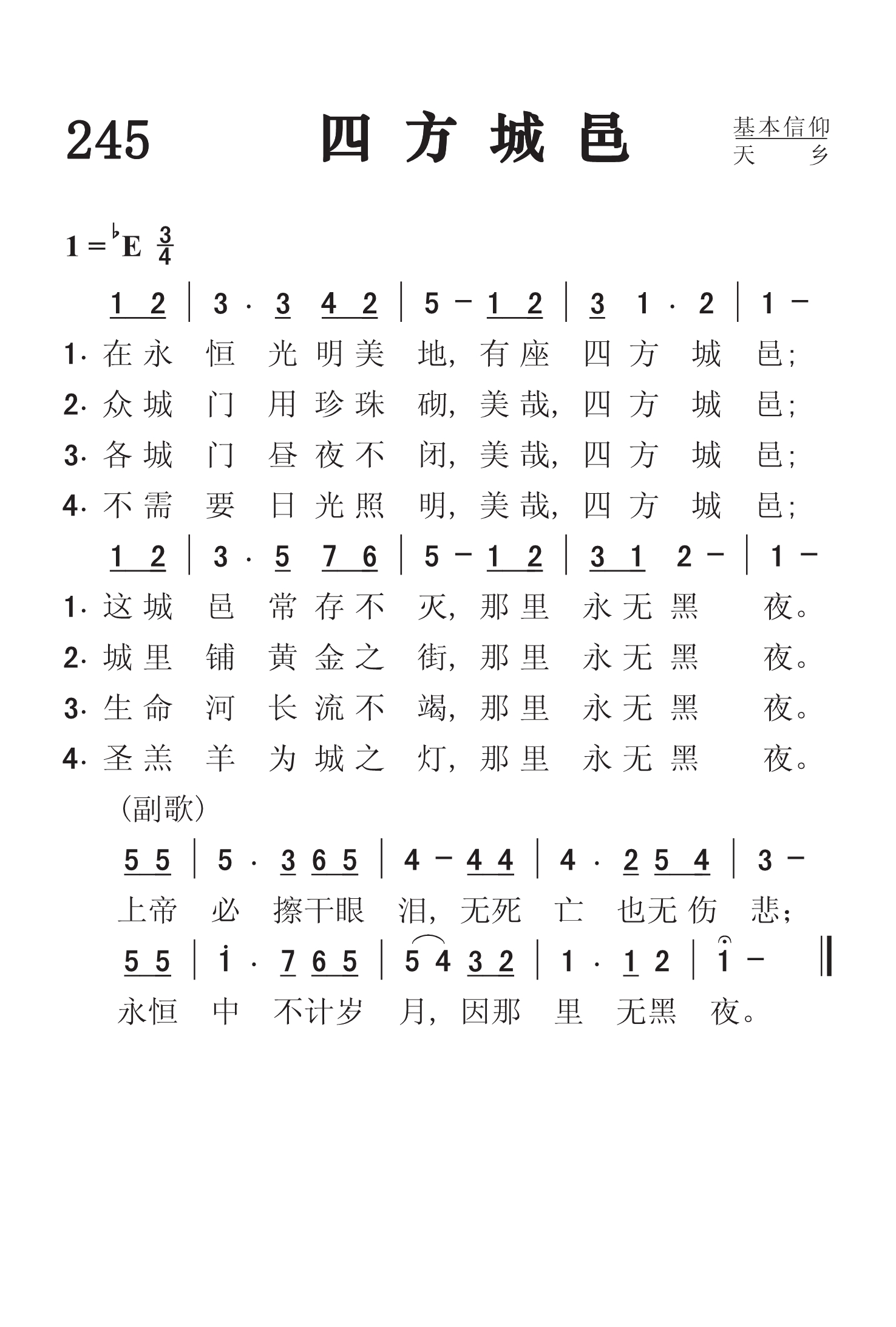 第245首四方城邑In the Land of Fadeless Day (《赞美诗》506版第223首) 约翰.克莱蒙茨(John R.Clements)作词,丹克斯(Hart.Pease.Danks,1834.4.6-1903.11.20)作曲 在永恒光明美地, 有座四方城邑; 这城邑常存不灭, 那里永无黑夜。 众城门用珍珠砌, 美哉, 四方城邑; 城里铺黄金之街, 那里永无黑夜。 各城门昼夜不闭, 美哉, 四方城邑; 生命河长流不竭, 那里永无黑夜。 不需要日光照明, 美哉, 四方城邑; 圣羔羊为城之灯, 那里永无黑夜。 这首诗歌以圣书的预言为依据,尽情讴歌圣徒永恒家园的美丽,辉煌和幸福。旋律优美动听,把人带进那恬静宜人的佳境。在上帝所描绘的永无黑暗的光明之所面前,今世的一切苦难都显得无足轻重了。让我们一边歌唱,一边盼望,以积极的姿态迎接人生的挑战,等待那无终安息的实现。 曲作者丹克斯出生于美国康涅狄格州纽黑文。8岁时全家迁往纽约州萨拉托加斯普林斯。他师从怀廷博士学习音乐,后在父亲的建筑公司做一段时间的木匠,不久就以音乐作为自己的终生事业,从事作曲,歌唱和带领诗班。1864年,他迁往纽约市。1892年,他出版了《教会诗班圣歌精选》。次年,他发表了他最著名的歌曲《白发吟》 (Silver Threads Among the Gold,埃本.雷克斯福德作词),销量超过三百万份。