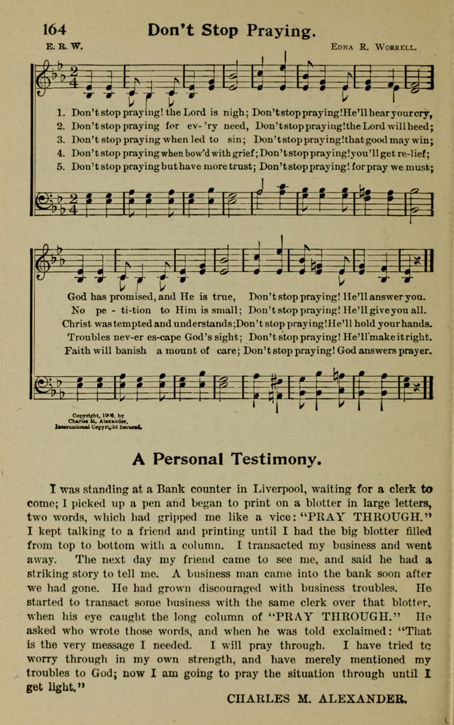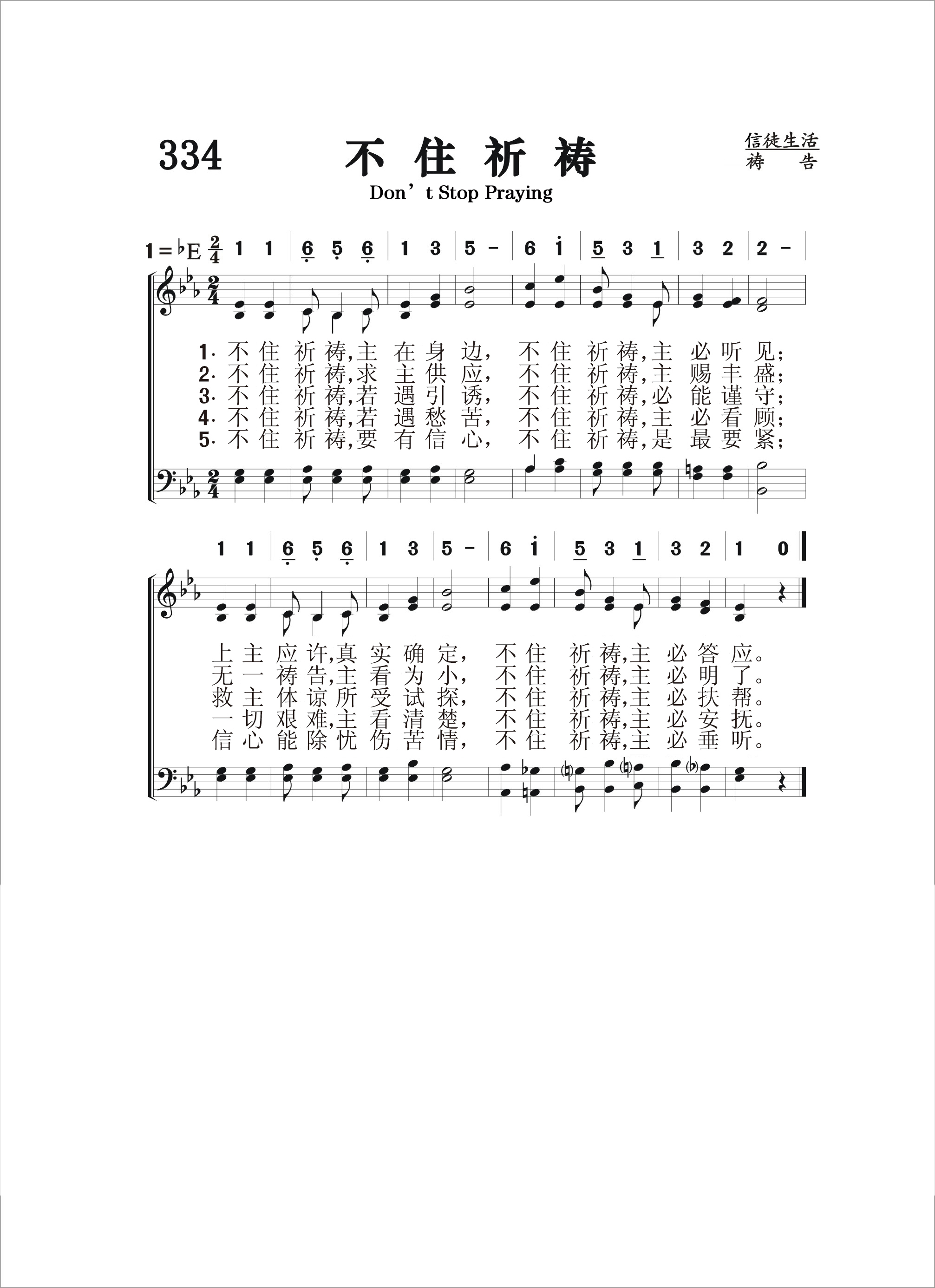 第334首 不住祷告Don’t Stop Praying 十九世纪的作家沃雷尔(Edna R. Worrell)作词作曲 不住祈祷,主在身边,不住祈祷,主必听见; 上主应许,真实确定,不住祈祷,主必答应。 不住祈祷,求主供应,不住祈祷,主赐丰盛; 无一祷告,主看为小,不住祈祷,主必明了。 不住祈祷,若遇引诱,不住祈祷,必能谨守; 救主体谅所受试探,不住祈祷,主必扶帮。 不住祈祷,若遇愁苦,不住祈祷,主必看顾; 一切艰难,主看清楚,不住祈祷,主必安抚。 不住祈祷,要有信心,不住祈祷,是最要紧; 信心能除忧伤苦情,不住祈祷,主必垂听。 全诗共五节,每节都三次提到不住祷告的重要性和迫切性。主耶稣教导我们要“常常祷告,不可灰心”(路18:1)。这首诗以简洁的语言,切身的经历,说出不住祷告的理由:因主时常亲近我们,必定应允;因人生旅程上一切所需“主必看顾”“主必明了”;在遭遇试探时“主必扶帮”。最重要的是“要有信心”,“主必垂听”。 沃雷尔生平不详。他只为我们留下38首赞美诗歌词,5首曲谱。