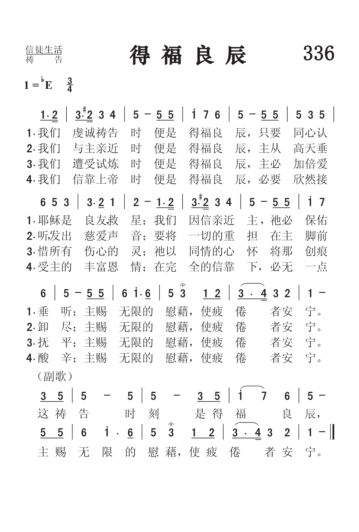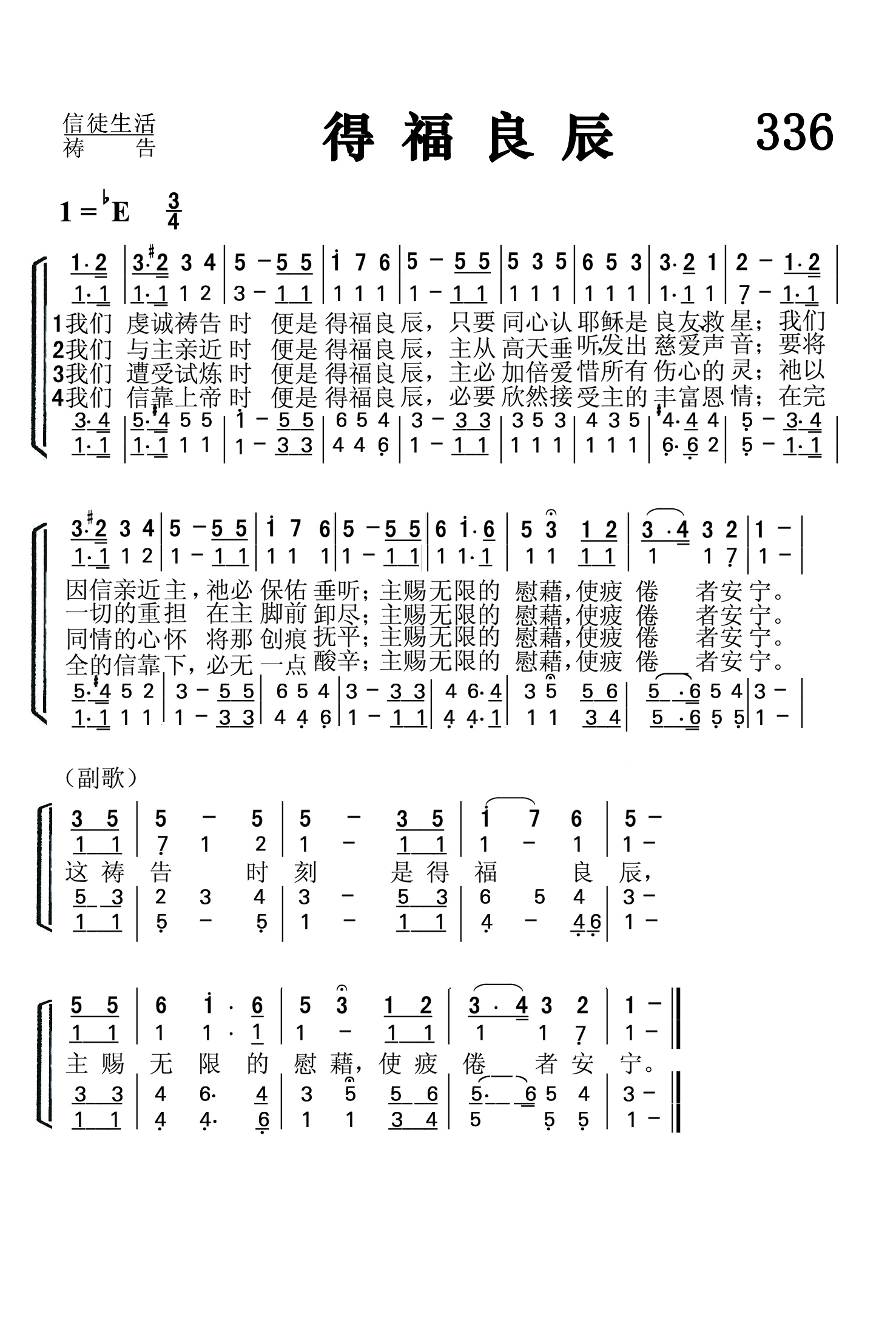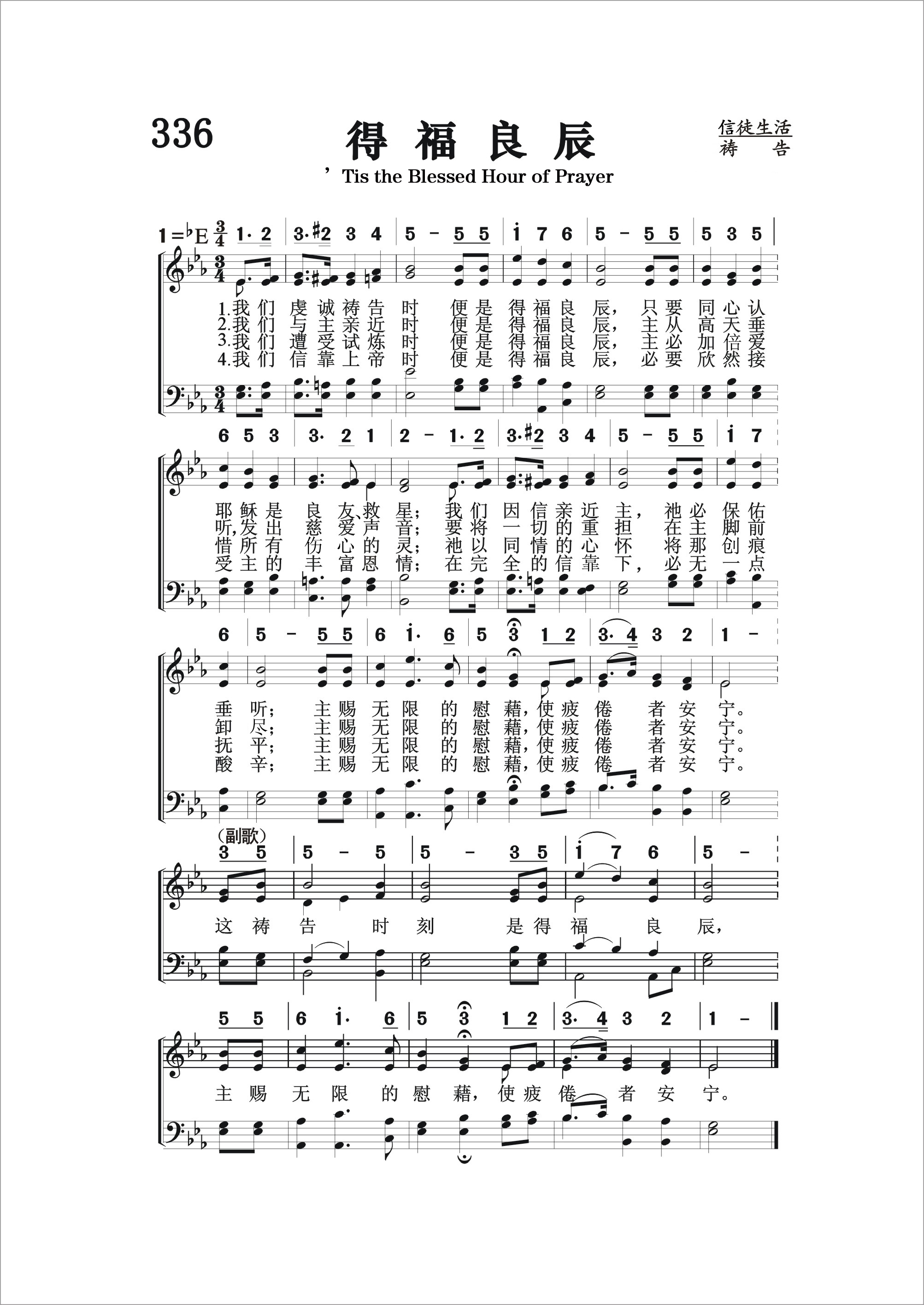 第336首 得福良辰’Tis the Blessed Hour of Prayer 克罗斯比(1820-1915年)作词,多恩(1832-1915年)作曲 我们虔诚祷告时便是得福良辰, 只要同心认耶稣是良友救星; 我们因信亲近主祂必保佑垂听; 主赐无限的慰藉,使疲倦者安宁。 我们与主亲近时便是得福良辰, 主从高天垂听发出慈爱声音; 要将一切的重担在主脚前卸清; 主赐无限的慰藉,使疲倦者安宁。 我们遭受试炼时便是得福良辰, 主必更加爱惜所有痛悔的灵; 祂以同情的心怀将那伤痕抚平; 主赐无限的慰藉,使疲倦者安宁。 我们信靠上帝时便是得福良辰, 必要欣然接受主的丰富恩情: 在完全的信托下必无一点酸辛; 主赐无限的慰藉,使疲倦者安宁。 这祷告时刻是得福良辰, 主赐无限的慰藉,使疲倦者安宁。 这首诗歌为我们展示了祈祷良辰的美妙画面。祷告是上帝赐给我们最美好的特权。它使我们能够与创造主和救赎主直接沟通和交流。不论我们有什么重担或试炼,尽可放心带到主的面前来。主一定会赐给我们无限的安慰,满足的平安和丰富的恩典。 词作者克罗斯比是美国才华出众,负有盛名的福音女诗人。她出生六个月时因庸医,误诊而双目失明。15岁时她就读于纽约最早的一所盲童学校。1847-1858年,她留在该校教授英语语法,修辞学,罗马史和美国历史。她少年时代就开始写诗,24岁时出版了《盲女与她的诗》,引起美国文坛的注意。1850年灵性奋兴的经验,使她集中全力专写圣诗,后在福音圣诗作曲家和编辑布雷得伯里的鼓励下,立志以创作福音圣诗作为自己的终生事业,于是与纽约一家出版社签订合同,每周写圣诗三首,结果写了5929首。此外,她还为布利斯写525首,为桑基写237首,为劳里写219首,为多恩写1500首。她一生共写了8440首圣诗,堪称为最多产的圣诗作家。 曲作者霍华德多恩是富有才华的音乐家,克罗斯比的多年合作者。他出生于美国康涅狄格州普理斯顿市,14岁就带领唱诗班,青年时代与他父亲经营布店,以后转任机器厂厂商。因他服务态度很好,受到市民的欢迎,曾被选为市政委员。他业余为福音圣诗谱曲达二千多首。其中有不少经典之作。