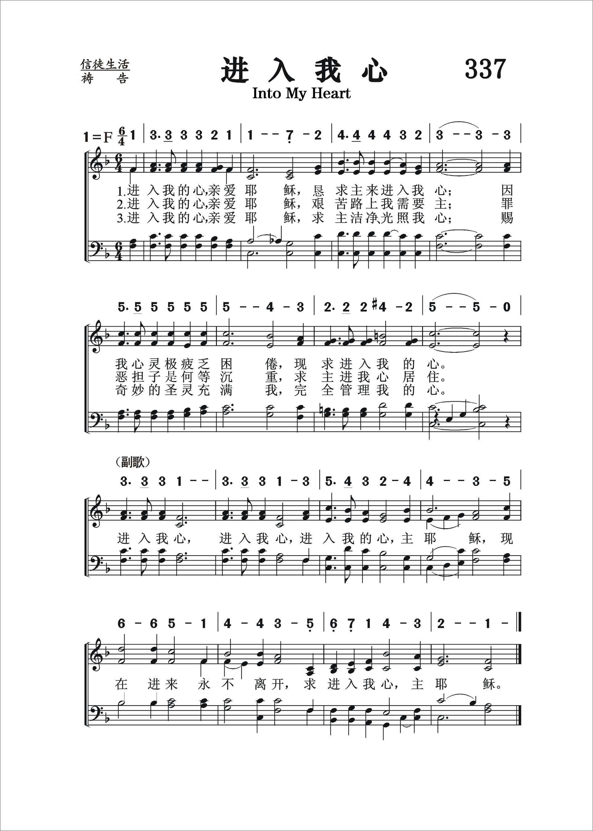 第337首 进入我心Into My Heart (《赞美诗》506版341首) 亨利.克拉克(Harry Dudley Clarke,1888,1,28-1957,10,14)作词作曲 进入我的心亲爱耶稣,恳求主来进入我心; 因我心灵极疲乏困倦,现在进入我的心。 进入我的心亲爱耶稣,艰苦路上我需要主; 罪恶的担子何等沉重,求主进我心居住。 进入我的心亲爱耶稣,求主沽净光照我心; 赐奇妙的圣灵充满我,完全管理我的心。 进入我心,进入我心,进入我的心,主耶稣, 现在进来永不离开,求进入我心,主耶稣 亨利.克拉克出生于英国威尔士的卡迪夫,自幼失去父母。后来他逃离孤儿院当了十来年的海员。后来他回到伦敦,最后去了美国,就读于芝加哥的慕迪圣书学院。毕业后从事作曲,音乐出版和传道工作。《进入我心》是他的代表作品之一。