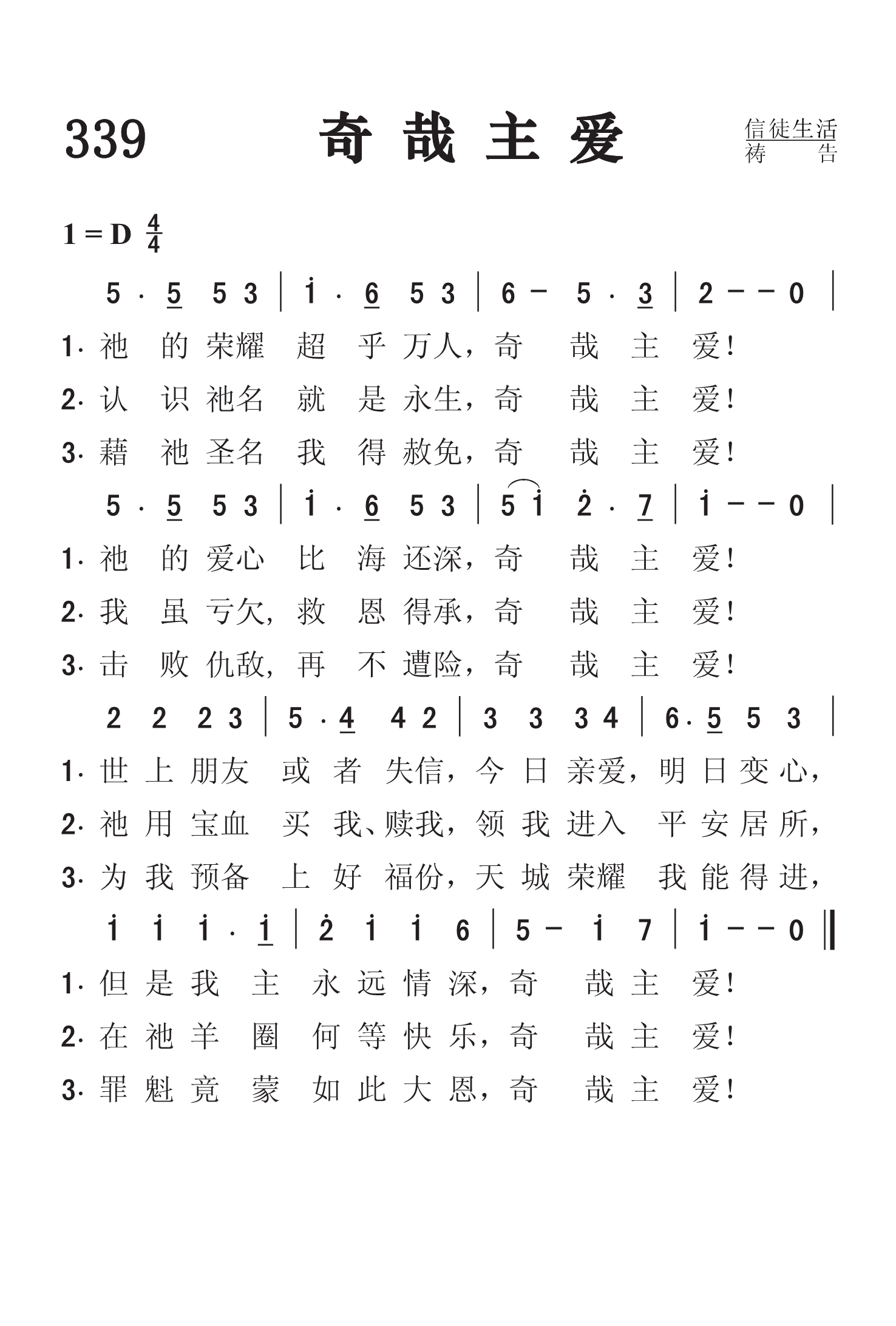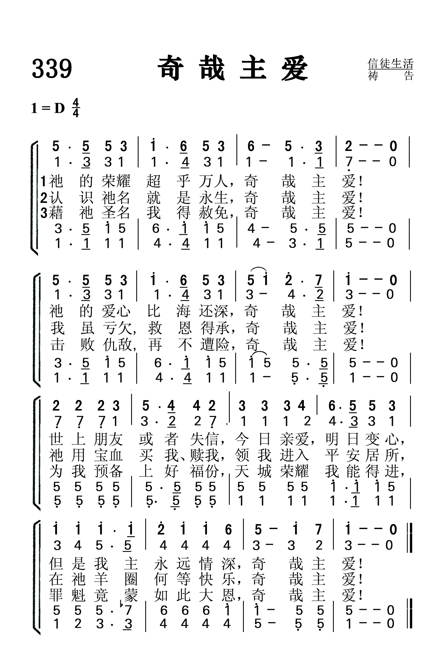 第339首 奇哉主爱O How He Loves. 梅因(Hubert Platt Main, 1839,8,17-1925,10,9)作,赵典仁、吴涤申译自《基督颂歌》(C.S)238首 祂的荣耀超乎万人,奇哉主爱! 祂的爱心比海还深,奇哉主爱! 世上朋友或者失信, 今日亲爱,明日变心, 但是我主永远情深,奇哉主爱! 认识祂名就是永生,奇哉主爱! 我虽亏欠, 救恩得承,奇哉主爱! 祂用宝血买我、赎我, 领我进入平安居所, 在祂羊圈何等快乐,奇哉主爱! 藉祂圣名我得赦免,奇哉主爱! 击败仇敌, 再不遭险,奇哉主爱! 为我预备上好福份, 天城荣耀我能得进, 罪魁竟蒙如此大恩,奇哉主爱! 梅因出生于美国康涅狄格州。其父原为一音乐学校老师,音乐造诣甚高,声音洪亮。梅因11岁就开始在他父亲的学校读书,直到1854年前往纽约市工作,协助已成为乐谱出版商的父亲。他的好友中有当时著名的作曲家布里斯托。他喜爱音乐,16岁就开始作曲。他精通和声学,写过一千首以上的音乐作品,包括福音歌曲,圣歌和一般歌曲,编辑过赞美诗。他是纽约几个重要音乐团体的会员,多年担任圣诗班指挥和司琴。 他收藏甚广,强记博闻。无数的调名,作者姓名,生卒年月,版权期限他都记得一清二楚。在美国,几乎没有一个人像他那样对教会音乐如此熟悉,是美国出版的教会音乐。这对出版界是个极大的帮助。