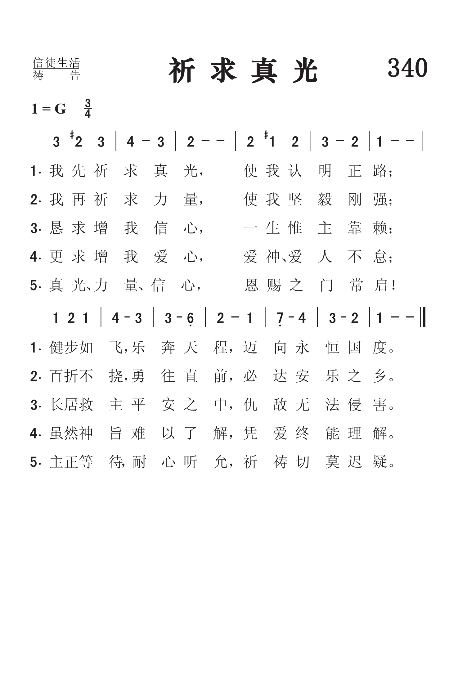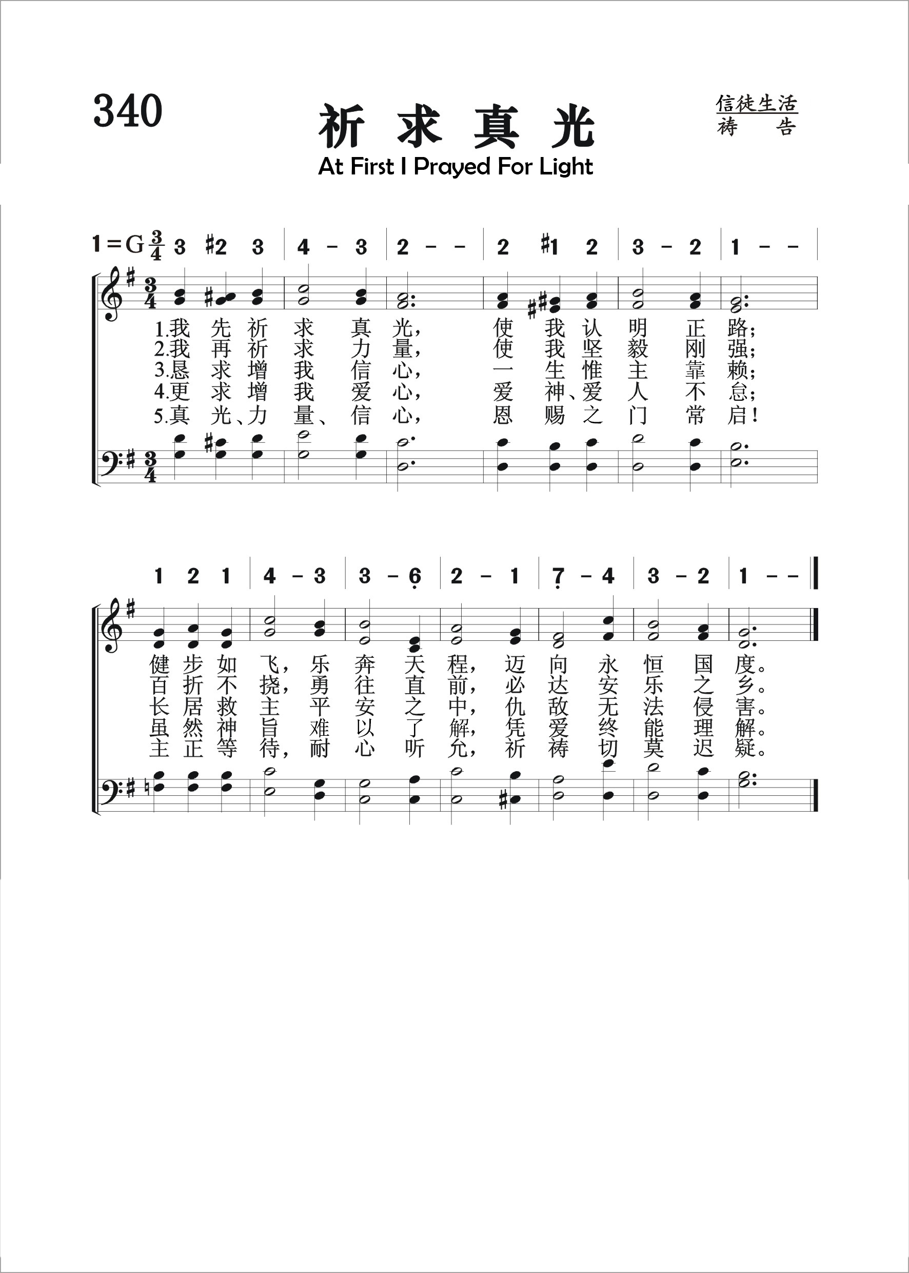 第340首 祈求真光At First I Prayed for Light 切尼夫人(Mrs.E.D.Cheney,1824,6,27-1904,11,19)作词,凯特尔(C.E.Kettle,1833-1895)作曲 我先祈求真光,使我认明正路; 健步如飞乐奔天程,迈向永恒国度。 我再祈求力量,使我坚毅刚强; 百折不挠勇往直前,必达安乐之乡。 恳求增我信心,一生惟主是赖; 长居救主平安之中,仇敌无法侵害。 更求增我爱心,爱神爱人不懈; 虽然神旨一时难明,凭爱终能理解。 真光力量信心,恩赐的门常启! 主正等待耐心听允,祈祷切莫迟疑。 这首著名祈祷诗歌的词作者切尼夫人出生于美国波士顿。她积极参加民权运动和普选运动,并担任报刊编辑。1853年她与画家切尼结合。著作甚丰。 曲作者凯特尔出生于英国萨福克,1881年迁往苏塞克斯,为著名的风琴师。