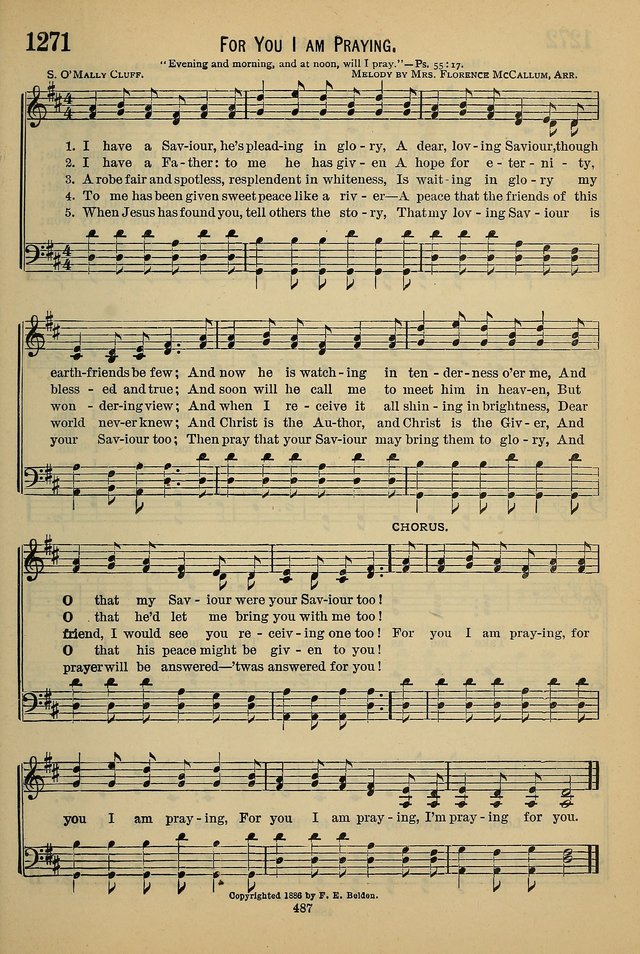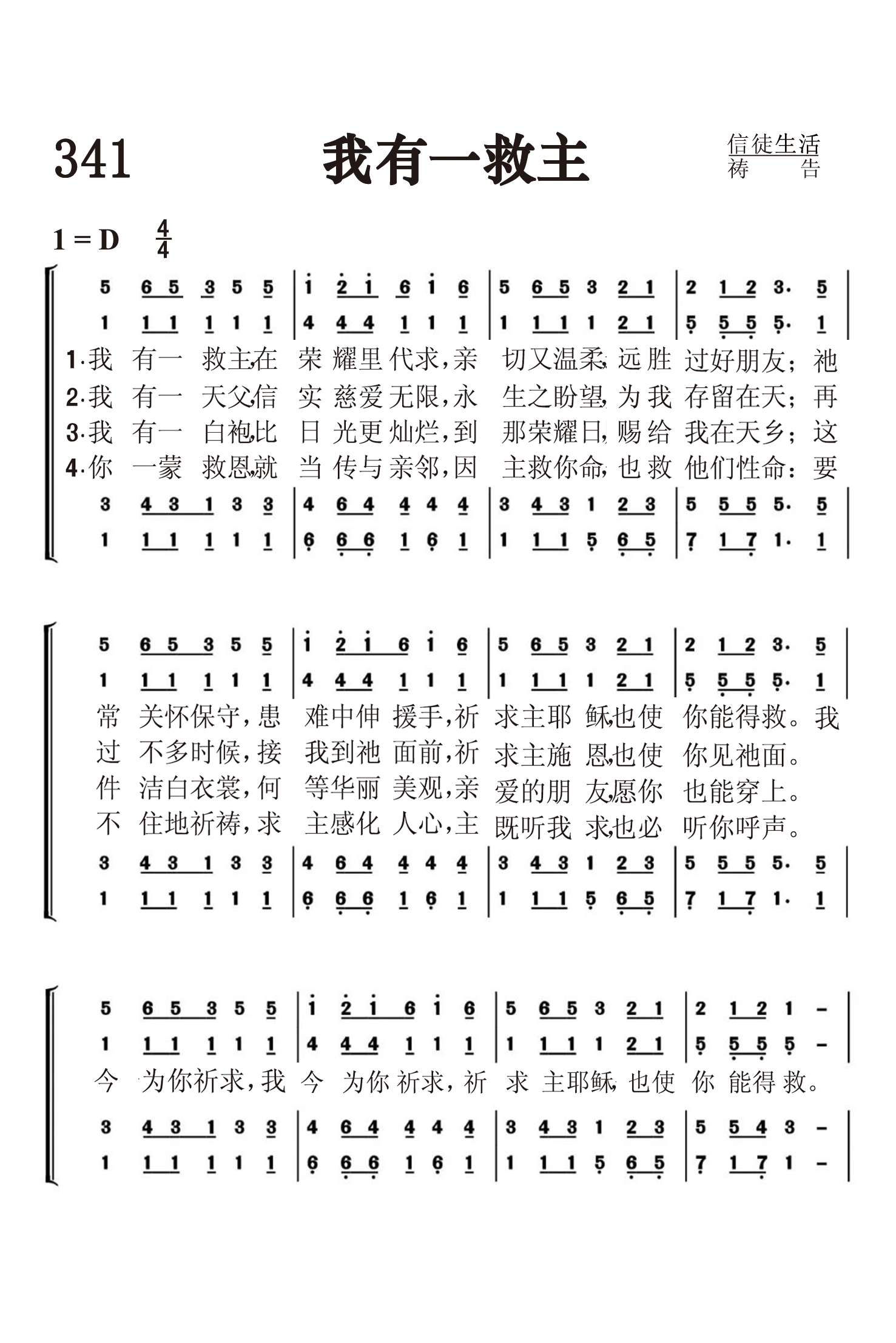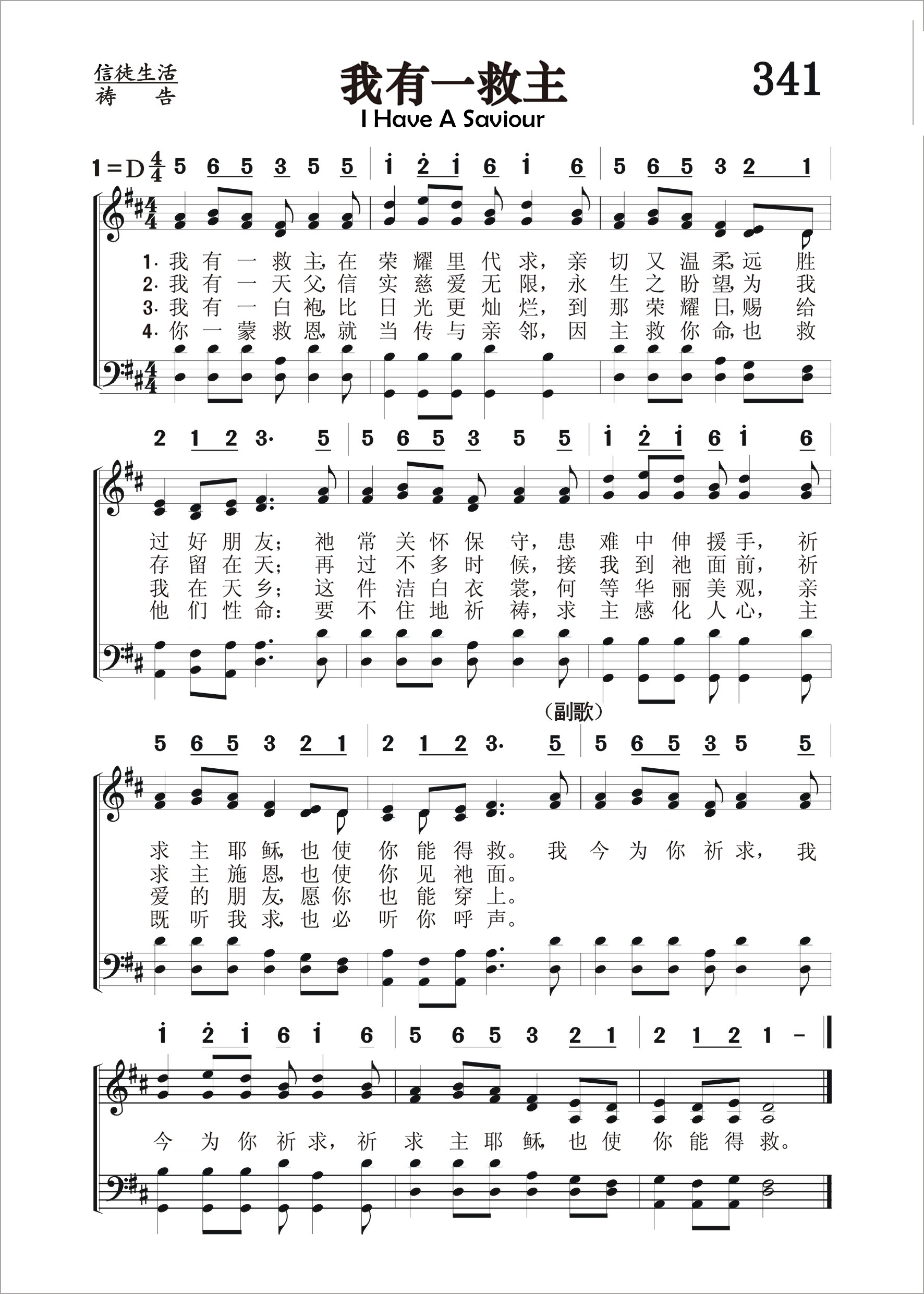 第341首 我有一救主I Have a Saviour 克拉夫(S.O’Maley Cluff,1837-1910)作词 我有一救主在荣耀里代求, 亲切又温柔,远胜过好朋友; 祂常关怀保守,患难中伸援手, 祈求主耶稣,也使你能得救, 我有一天父,信实慈爱无限, 永生之盼望,为我存留在天; 再过不多时候,接我到祂面前, 祈求主施恩,也使你见祂面。 我有一白袍,比日光更灿烂, 到那荣耀日,赐给我在天乡; 这件洁白衣裳,何等华丽美观, 亲爱的朋友,愿你也能穿上。 你一蒙救恩,就当传与亲邻, 因主救你命,也救他们性命: 要不住地祈祷,求主感化人心, 主既听我求,也必听你呼声。 我今为你祈求,我今为你祈求, 祈求主耶稣,也使你能得救。 词作者克拉夫出生于爱尔兰的都柏林,1862年毕业于三一学院,被按立为牧师牧养教会,曾发表出版过一本圣诗集,1874年他参加了普里茅斯兄弟会。 曲作者不详。但《赞美诗》(506版)第331首所采用的是另一首由桑基所作的曲调。