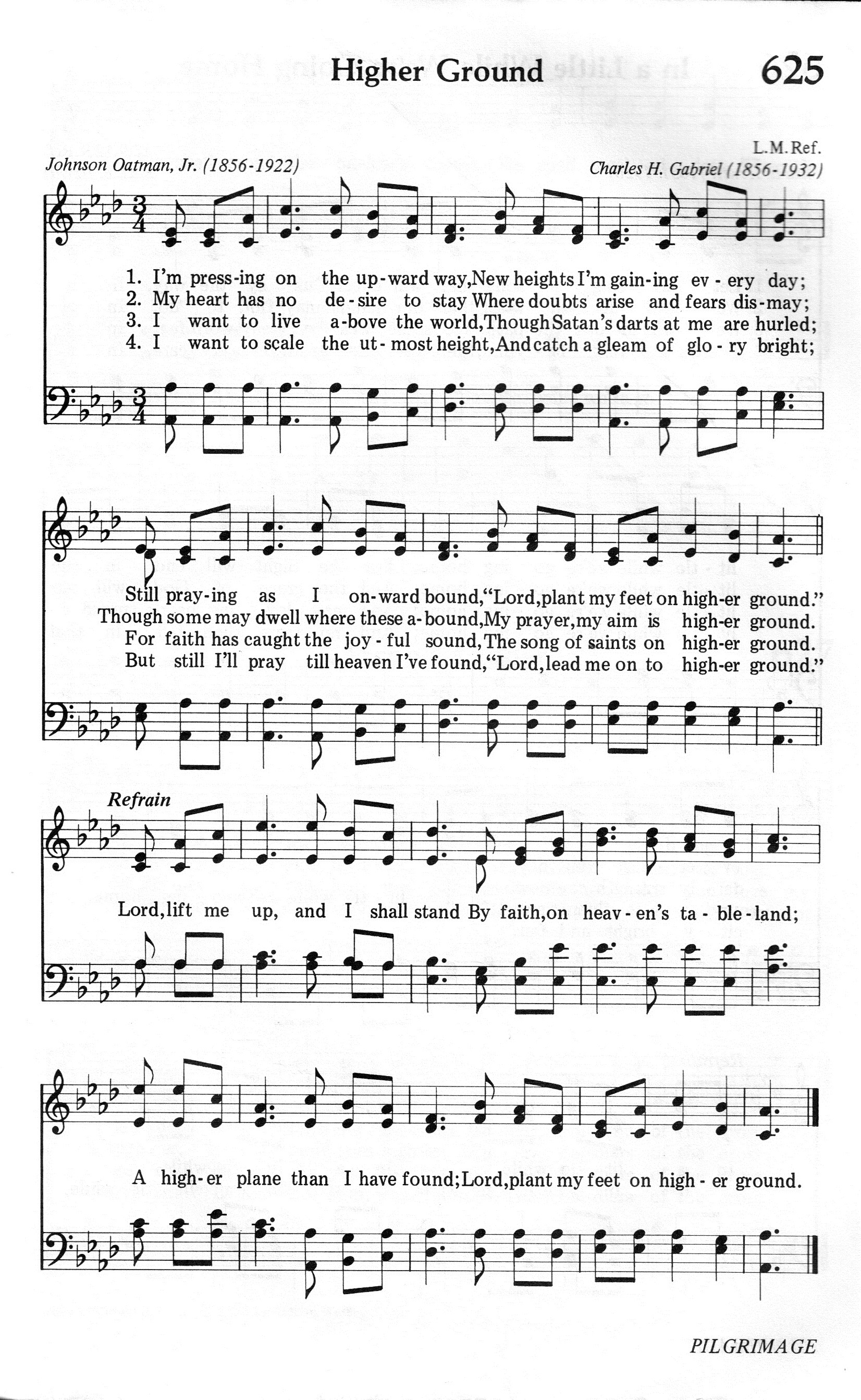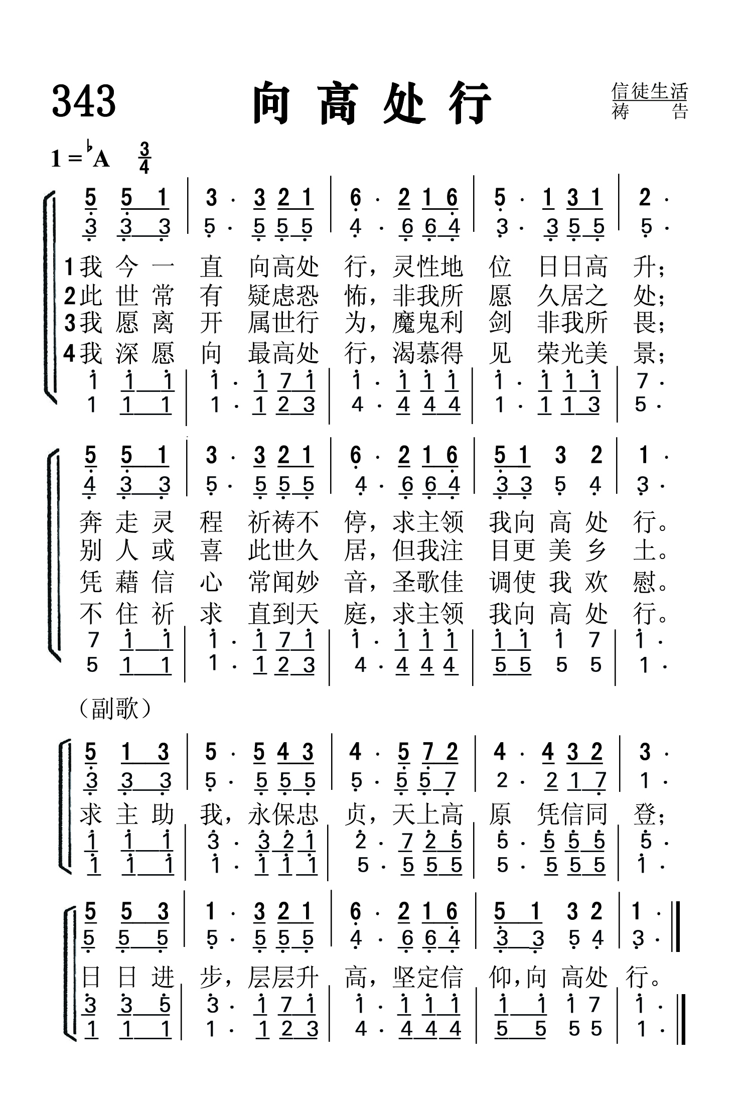 第343首向高处行I’m Pressing on the Upward Way 奥特曼(Johnson Oataman,1856,4,21-1922,9,25)作词,加布里埃尔(C.H.Gabriel,1856,8,18-1932,9,15)作曲 我今一直向高处行,灵性地位日日高升; 奔走灵程祈祷不停,求主领我向高处行。 此世常有疑虑恐怖,非我所愿久居之处; 别人或喜此世久居,但我注目更美乡土。 我愿离开属世行为,魔鬼利剑非我所畏; 凭藉信心常闻妙音,圣歌佳调使我欢慰。 我深愿向最高处行,渴幕得见荣光美景; 不住祈求直到天庭.求主领我向高处行。 求主助我.永保忠贞.天上高原凭信同登; 日日进步,层层升高,坚定信仰.向高处行。 这是一首基督徒的信心之歌,表达了我们在属灵生活中不断进步,生命不停长进的决心。我们唯有攀上信心的高原,才能超脱尘世的一切恐惧和疑虑,克服仇敌的诱惑和攻击,聆听无比美妙的佳音,展望那永久的天上家乡。愿这首诗歌伴随我们行走在主所引导的天路之上。 奥特曼是一位著名歌唱家的儿子。父子二人都是美以美会的热心信徒。俄特曼从小就经常跟父亲到教堂做礼拜,听牧师讲道和父亲唱歌,因深受感动,就决心去读神学,准备献身传道,并继承父亲音乐的事业。他神学院毕业以后,被按立为牧师,但没有在教会里担任具体的圣职。于是他和父亲合作经商,在生意上十分活跃,后来又自办保险公司。但在商海的风浪中,他依然不忘依靠主,数算主的恩典。1892年,在他36岁时,他发现自己有音乐的才能,可以写诗来为主作见证,代替讲道。从此他便一心写诗。他一年平均要写200首诗。他的诗深入千万人的心里。 394首《无人比主》和513首《数算恩典》也是奥特曼作词的。 加布里埃尔是20世纪20年代美国布道团中最受欢迎的自学成才歌唱家和作曲家。他在美国南方衣阿华州农场中长大,平生爱音乐,好唱歌,自己在家里学习,在一架破旧的小风琴上弹奏。16岁时就自告奋勇到附近音乐学校教唱,成绩显著,不久被正式聘为教员。从此,他更努力学习,精益求精,终于成为一个有名的作曲家,业余时间还兼任旧金山一个卫理公会礼拜堂的音乐指导。1895年迁居芝加哥,继续写作、编曲,曾编印出版过好几本乐谱。