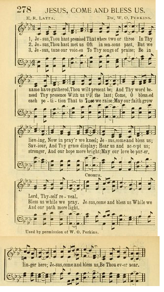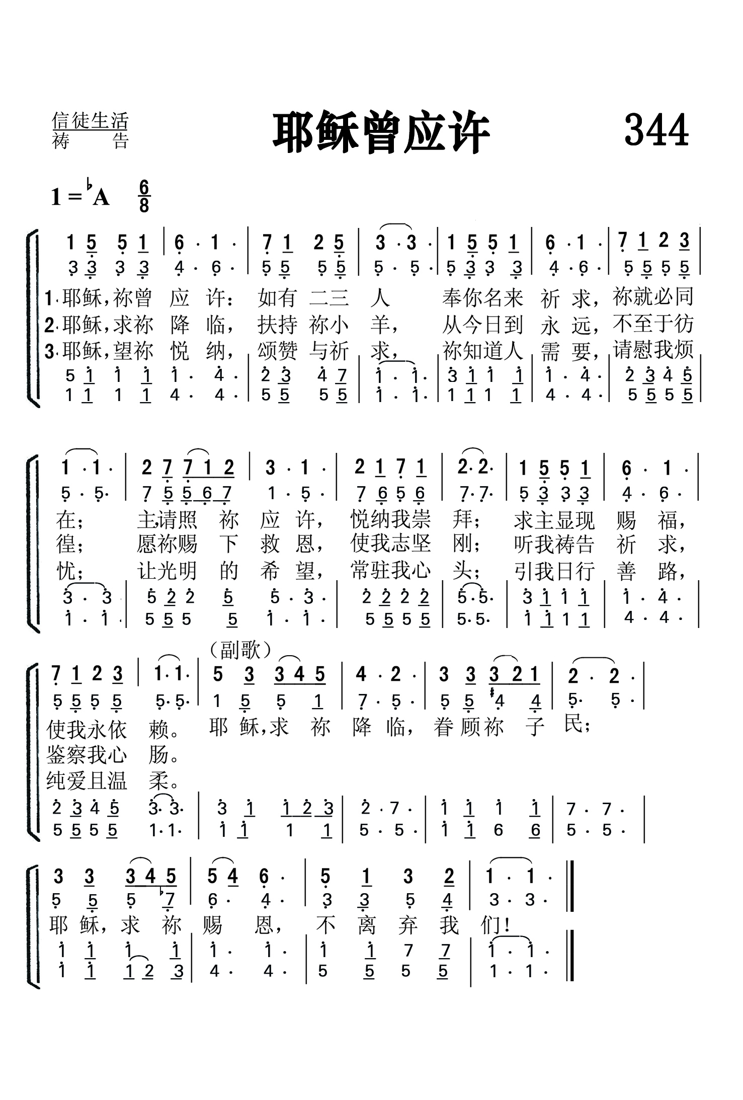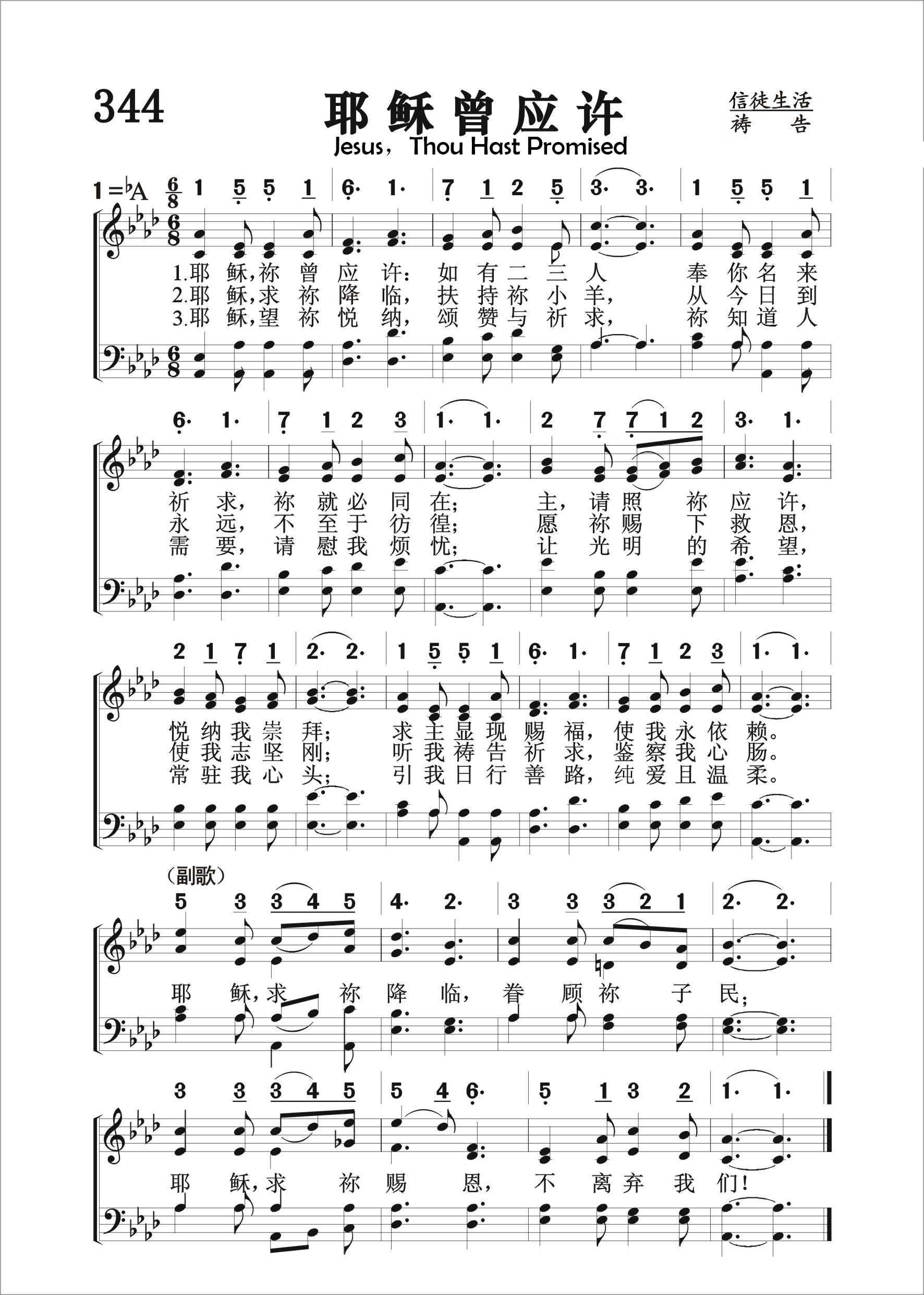 第344首 耶稣曾应许Jesus,Thou Hast Promised 拉塔(Eden.Reeder.Latta,1839,3,24-1915,12,21)作词,珀金斯 (William.Oscar.Perkins,1831,5,23-1902,1,13)作曲 耶稣,祢曾应许:如有二三人 奉你名来祈求,祢就必同在; 主请照祢应许,悦纳我崇拜; 求主显现赐福,使我永依赖。 耶稣,求祢降临,扶持祢小羊, 从今日到永远,不至于彷徨, 愿祢赐下救恩。使我志坚刚: 听我祷告祈求,鉴察我心肠。 耶稣,望祢悦纳,颂赞与祈求, 祢知道人需要,请慰我烦忧. 让光明的希望,常驻我心头; 引我日行善路,纯爱且温柔。 耶稣,求祢降临,眷顾祢 子民, 耶稣,求祢赐 恩,不离弃我们! 词作者拉塔出生于美国印地安那州,是圣诗作家奥格登( 第121首介绍)的童年朋友,曾在衣阿华州科尔斯堡的公立学校任教。他一生共创作了1600多首诗歌。《耶稣曾应许》就是其中较有代表性的一首。 曲作者珀金斯出生于美国佛蒙特州,曾在波士顿,伦敦和意大利的米兰学习音乐。后定居在波士顿,创办音乐学校,发表了许多赞美诗。1879年汉密尔顿学院授与他荣誉音乐博士学位。1884年,他迁居纽约。579首《只要你》也是他作曲的。
