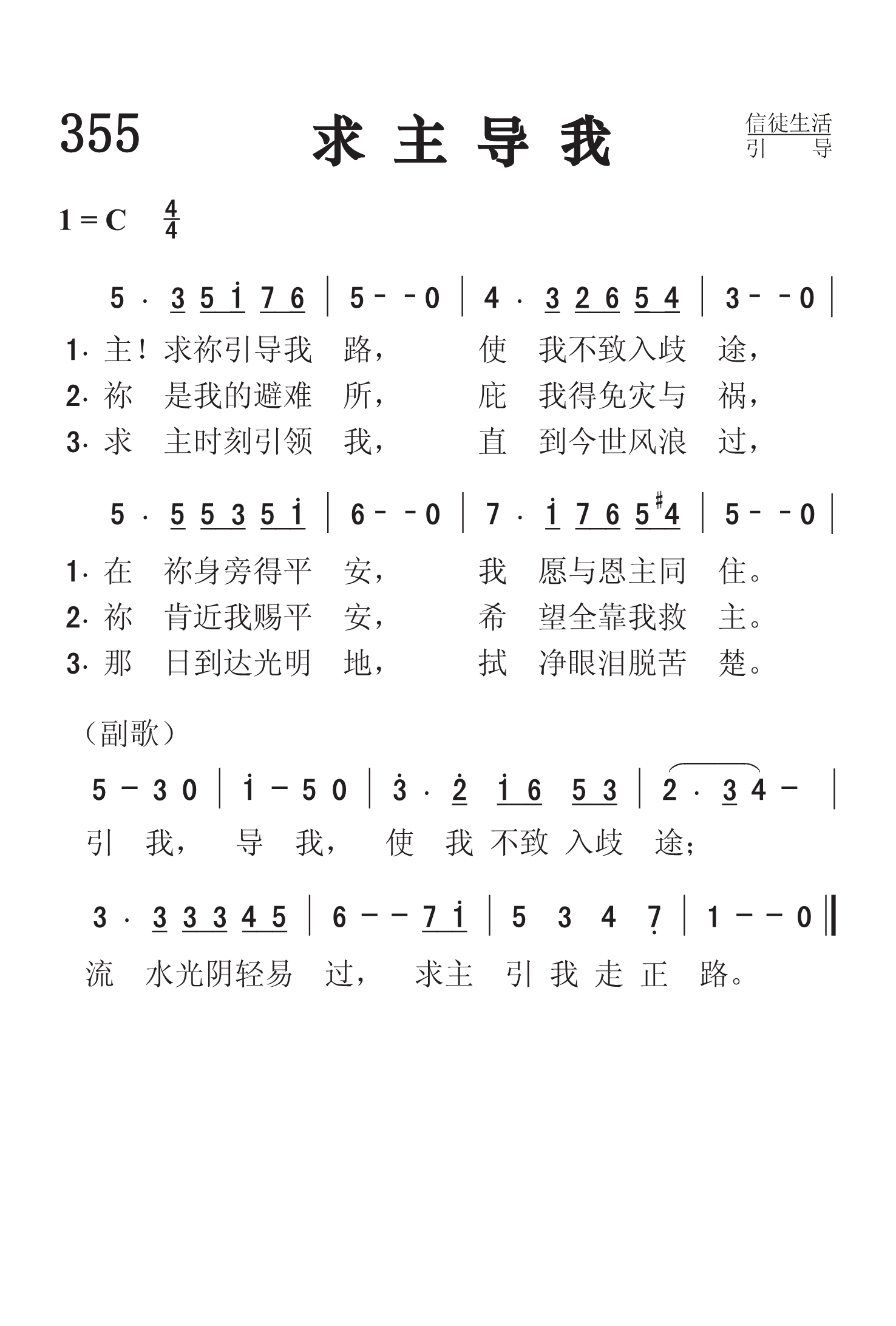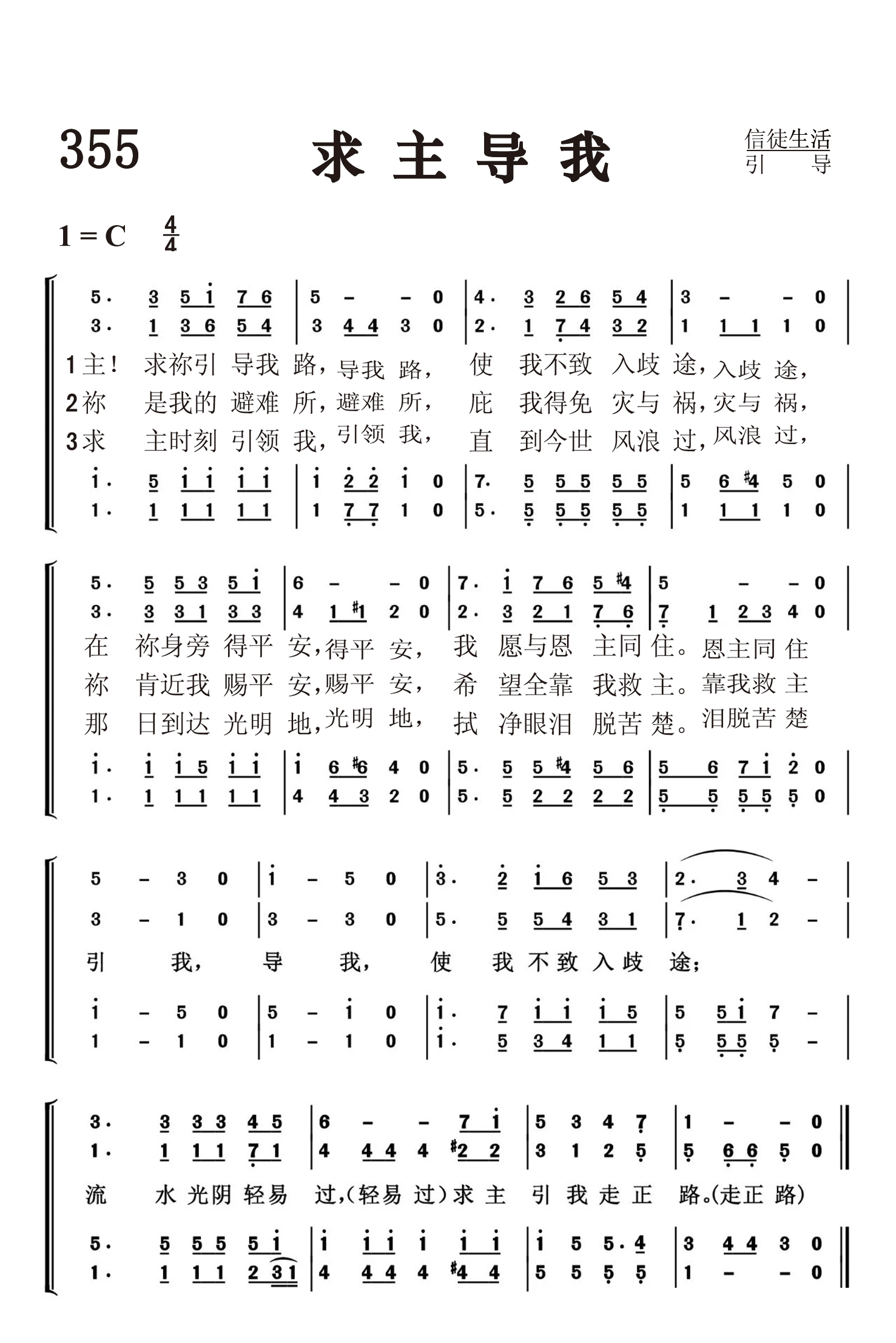 第355首 求主导我Saviour,Lead Me 弗兰克.戴维斯(Frank M.Davis,1839,1,23-1896,8,1)作词作曲 主!求祢引导我路,使我不致入歧途, 在祢身旁得平安,我愿与恩主同住。 祢是我的避难所,庇我得免灾与祸, 祢肯近我有平安,希望全靠我救主。 求主时刻引领我,直到今世风浪过, 一日我到光明地,拭净眼泪脱苦楚。 引我,导我,使我不致入歧途; 流水光阴轻易过,求主引我走正路。 戴维斯在《求主导我》这首赞美诗中,表达了他恳求慈悲救主时刻带领他前程的祈愿。在人生的道路上,每天都会遭遇危险和困难。如果没有一位可靠的向导,我们随时都有误入歧途的可能。诗人还真诚地希望主擦干他的眼泪,以祂的能力和智慧牵着他经过今世的风浪,直到那光明的美地。 戴维斯出生于美国纽约州,曾周游过许多地方。他是出色的音乐家,在各地教授声乐和器乐,指导圣诗班工作。他终生未娶,曾创作大量的音乐作品。 第230首《名录生命册》也是戴维斯作曲的。