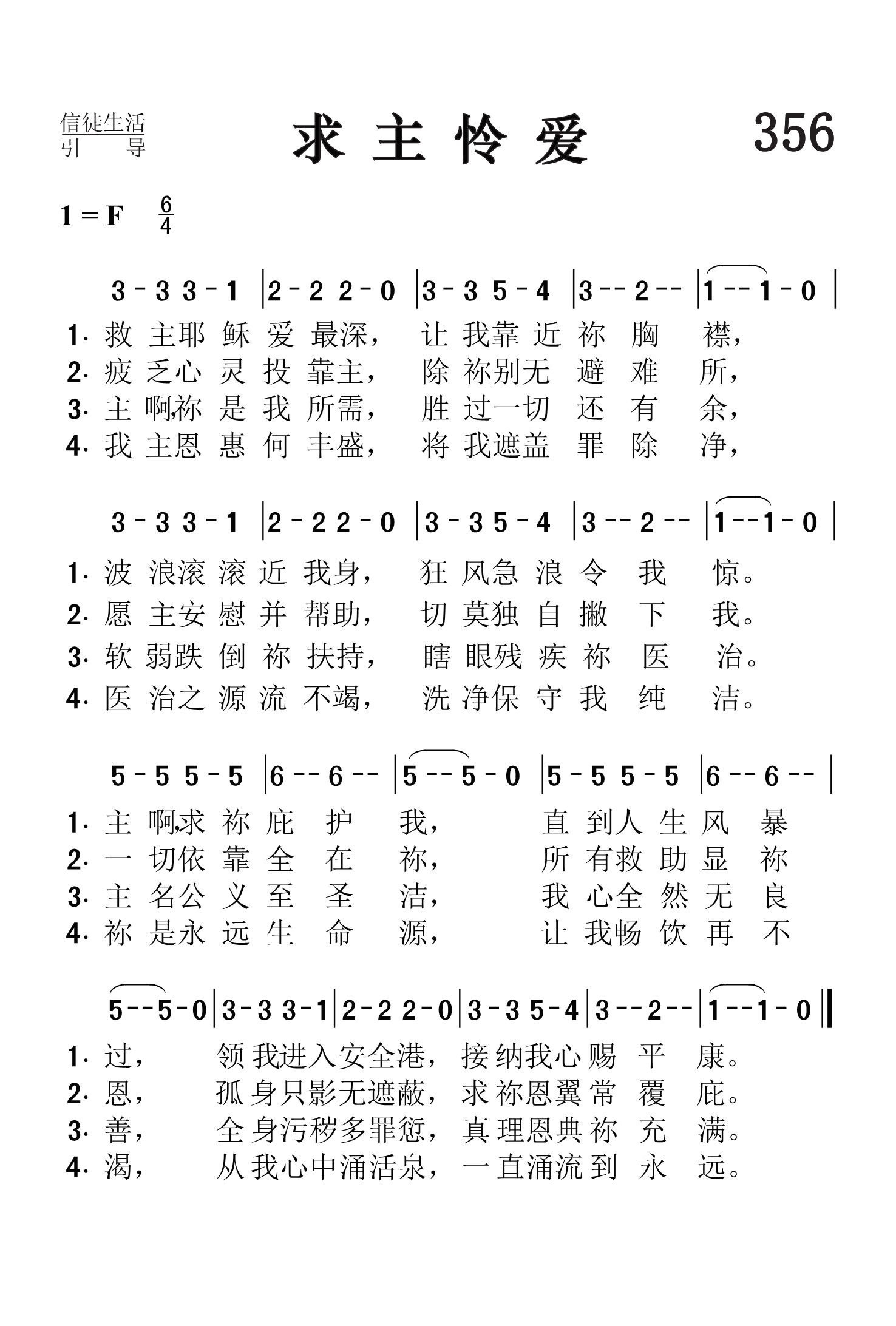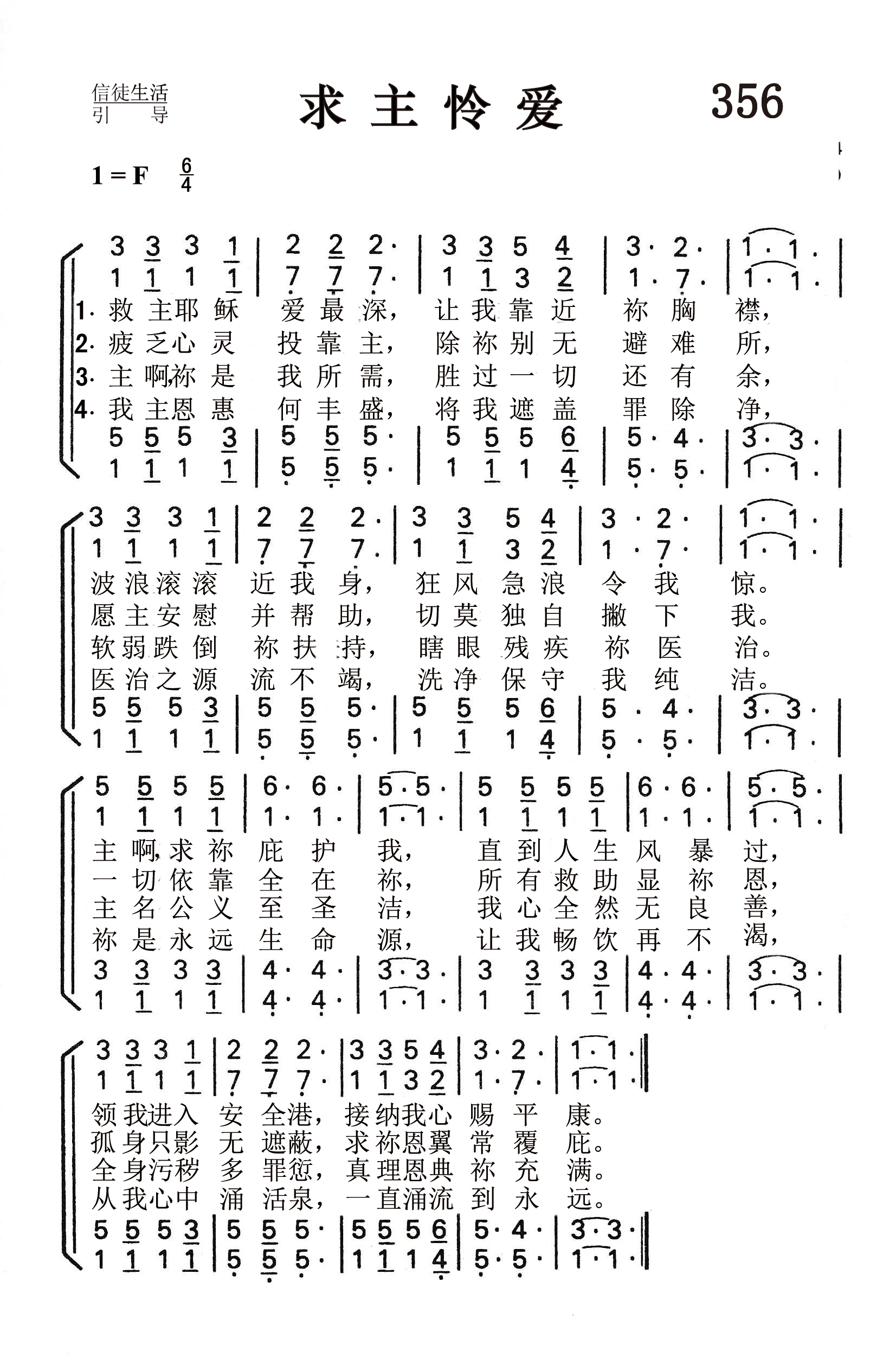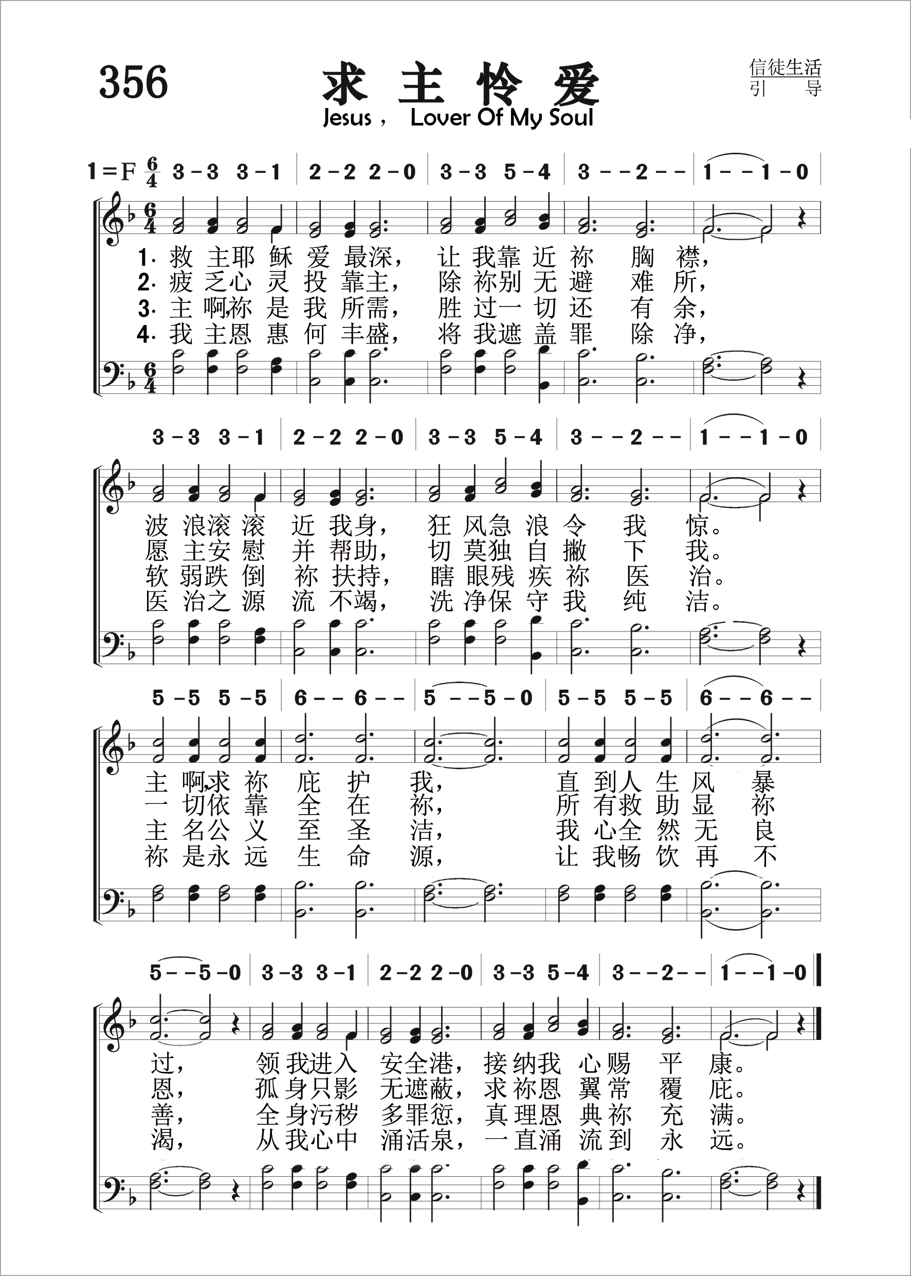 第356首 求主怜爱Jesus , Lover of My Soul 查理.卫斯理(Charles Wesley,1707,12,18-1788,3,29,见第51首介绍)作词(1740年),马许(Simeon.B.Marsh 1798,6,1—1875,7,14)作曲(1834年) 救主耶稣爱最深,让我靠近祢胸襟, 波浪滚滚近我身,狂风急浪令我惊。 主啊,求祢庇护我, 直到人生风暴过, 领我进入安全港,接纳我心赐平康。 疲乏心灵投靠主,除祢别无避难所, 愿主安慰并帮助,切莫独自撇下我。 一切依靠全在祢, 所有救助显祢恩, 孤身只影无遮蔽,求祢恩翼常覆庇。 主啊,祢是我所需,胜过一切还有余, 软弱跌倒祢扶持,瞎眼残疾祢医治。 主名公义至圣洁, 我心全然无良善, 全身污秽多罪愆.真理恩典祢充满。 我主恩惠何丰盛,将我遮盖罪除净, 医治之源流不竭,洗净保守我纯洁。 祢是永远生命源,让我畅饮再不渴, 从我心中涌活泉,一直涌流到永远。 《求主怜爱》作于1740年。一次,查理与哥哥到爱尔兰去布道,有暴徒听见消息,拿着凶器要寻索他的性命。查理得知消息,便向一片荒野逃跑,暴徒在后面紧紧追赶。危急间,他们进入一座小房子中,向这家的主妇说明情由,主妇动了慈心,将他们安置在房子后面的树林深处。暴徒冲进房子,四处寻找,没有发现,便穿过后门,向树林走去。这时,查理兄弟二人见暴徒向他们走来,逃跑已经来不及,只有祷告救主,急难中求主帮助,暴徒临近他们身边,却没有看见他们,竟从他们身边穿了过去。查理从这次象大海汹涌波涛似的危险中得到拯救,就写下了这首诗。 美国南北战争后,一只游船满载乘客向华盛顿驶去,船上一位参加过战争的战士唱了几首圣诗和大家共同分享,当他唱完《求主怜爱》时,一位彪型大汉走上前来,握着他的手问:“朋友,请原谅我的冒昧,你是不是在格兰特将军手下当过兵?” 唱歌的人看看对方陌生的脸,惊奇地问:“你怎么知道?” “你是不是有一天晚上放哨时唱过这首歌?” “啊!你怎么知道得这样详细?”他越发奇怪了。经过解释,原来是这样:这人当时在南方军队中当兵,正好与格兰特将军的部队在对峙,长官命令他射击对方的哨兵,因他枪法很准。他偷偷地爬到前沿阵地,选择好有利地形,在月光下举起枪口向他的对方胸口瞄准,在扳机即将扣发的一瞬间,突然听到了这样的歌声: “疲乏灵魂投靠主,你外别无避难所。 愿常安慰并帮助,切莫独自撇下我......” 他听了大受感动,不再开枪了。因为他违背了长官的命令,回去后就潜逃了。现在他听见这声音曲调与那夜间的很象,就起来询问,原来当天唱歌的正是此人。 唱诗的人此时百感交集,他握紧对方的手,告诉他,那夜不知何故,心中被忧郁之情笼罩,非常难受,在苦难中想到上帝,就开始唱这首诗歌,做为他心中的祷告。当时天上的平安就临到心中。此时此刻他才知道,上帝已经答应了他的祷告,免去了他的一次死难。 著名圣诗学者亨利.比彻牧师(H.Boecher)曾说:“我情愿能作《求主怜爱》这首诗,而不愿有世上一切君主的荣耀。这一首诗中有更大的荣耀,更大的权柄。我情愿做这个作者,不愿拥有纽约最大富翁的财产,这首诗能引天使谛听,能达到神的面前。” 写《站立为耶稣》的著名圣诗作者杜菲尔德说:“为了这首诗,我的琴就要从柳树上重新拿下来,我能再弹奏,是我平生最有福的日子。” 曲作者马许出生于美国纽约州,一生几乎都是担任唱诗班的歌手及指挥的工作。他曾兼任过主日学主任,管风琴师。他谱过几首赞美诗,也写过一些圣歌和两部康塔塔(注.康塔塔cantata一语,从18世纪末起,一般用来指带独唱或不带独唱的,有乐队伴奏的世俗合唱曲或宗教合唱曲。与清唱剧相似,但篇幅较小)。这首曲调是马许在1834年为另一首诗而写的。多少年来《求主怜爱》曾改换了许多曲调,但都不十分合宜。创作《万古磐石》曲调的黑斯廷斯,发觉马许所写的这首曲调,配以查理.卫斯理的诗最为合宜。从此,这首诗就和马许的曲调一同流传开了。