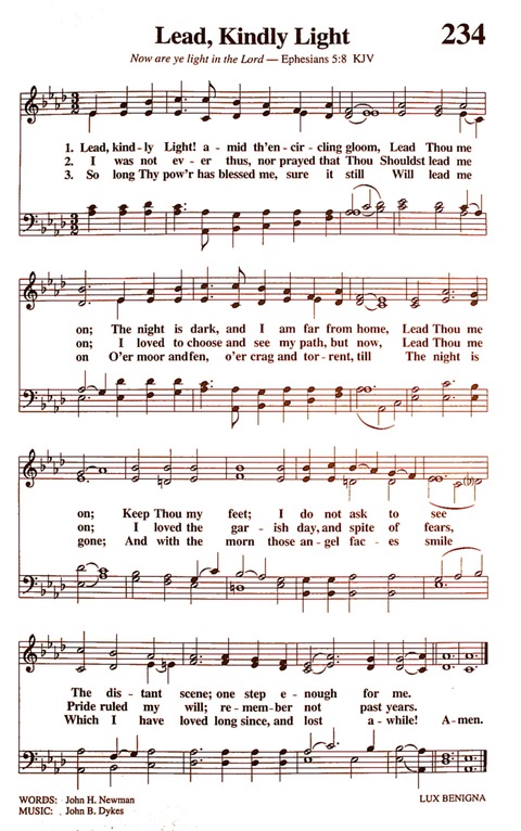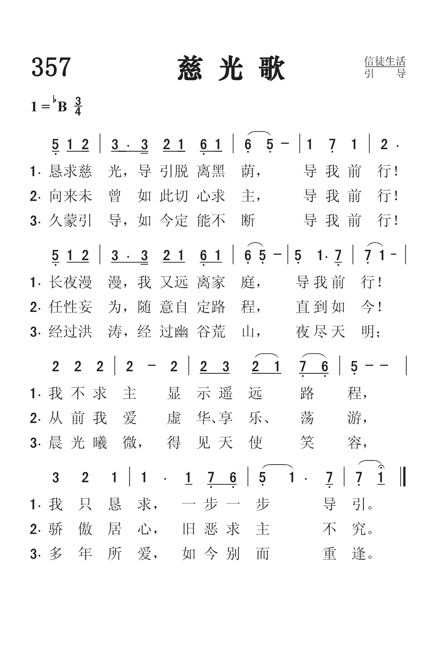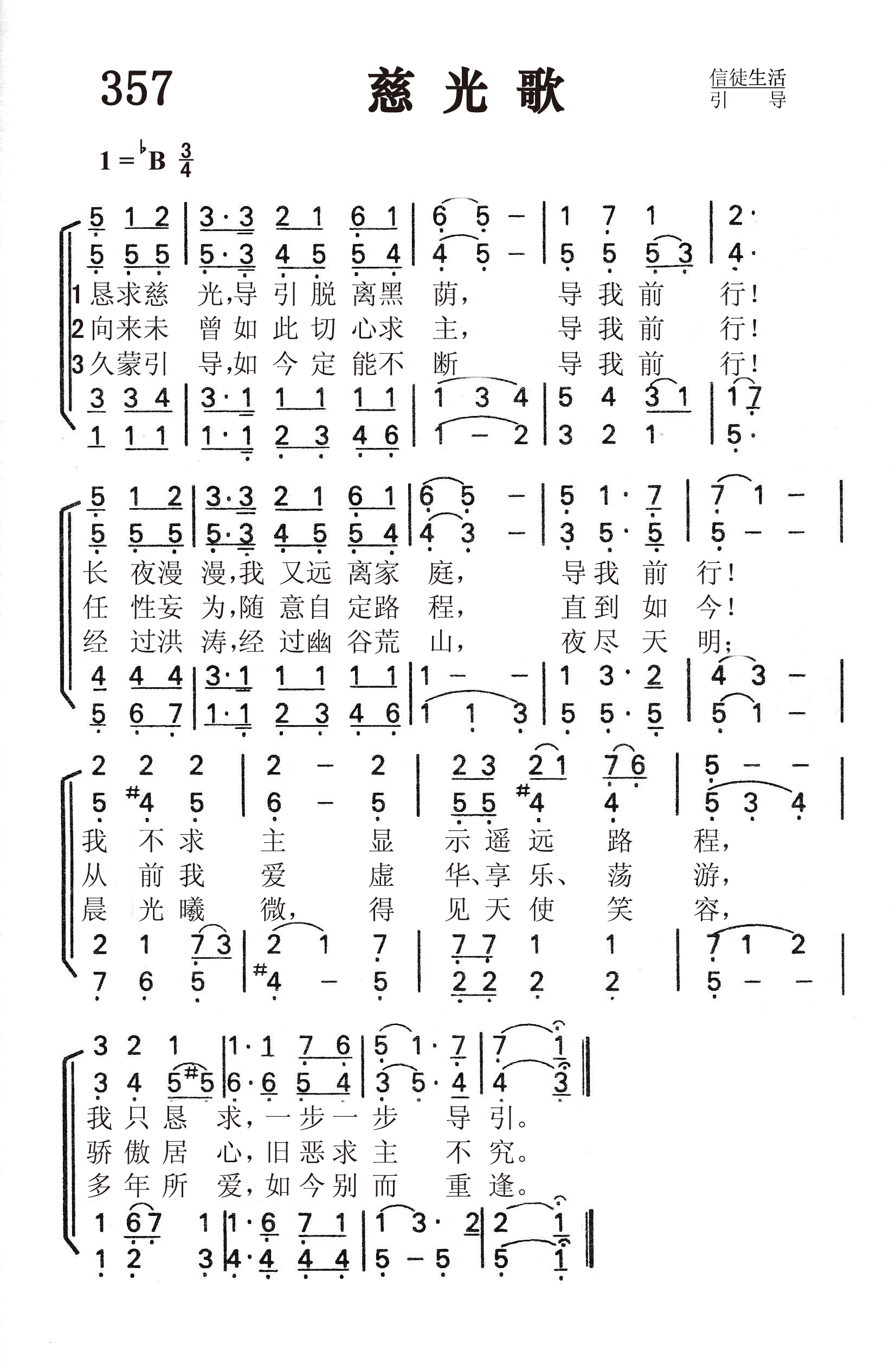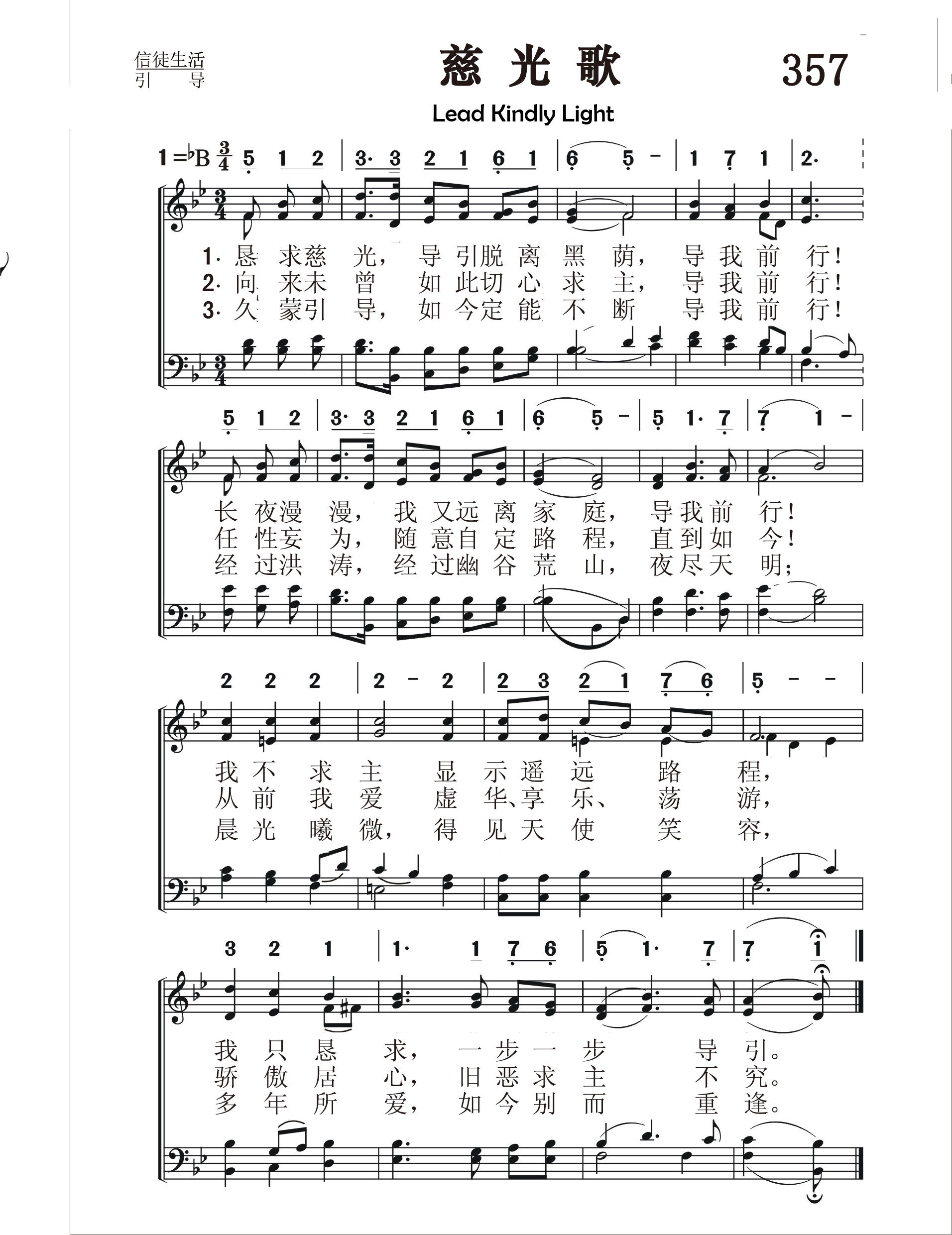 第357首 慈光歌Lead Kindly Light 约翰.纽曼(Newman 1801,2,21-1890,8,11)作词(1833年6月16日),戴克斯(B .Dykes,1823,3,10-1876,1,22)作曲(1865年),刘廷芳译(1933年) 恳求慈光,导引脱离黑荫,导我前行! 长夜漫漫,我又远离家庭,导我前行! 我不求主,显示遥远路程, 我只恳求,一步一步导引。 向来未曾如此切心求主,导我前行! 任性妄为,随意自定路程,直到如今! 从前我爱虚华、享乐、荡游, 骄傲居心,旧恶求主不究。 久蒙引导,如今定能不断导我前行! 经过洪涛,经过幽谷荒山,夜尽天明。 晨光曦微,得见天使笑容, 多年所爱,如今别而重逢。 在牛津大学里,一位青年人正聚精会神地阅读圣书,读了一会儿,又拿起《天方夜谭》来看。他模糊了,他徘徊了,似乎两者都有道理,又似乎两者都是神话。没有真理的方向,就没有做人的方向。他后来回忆说:“我原想生命不过一场梦。……在我悔改之前,生活是很虚空的,常常陷入极深的黑暗。我如同一个人在漆黑的房间里摸索前进。上帝的手在黑暗中引导我,我自己却不知道。” 一八二〇年,这位青年人毕业于牛津大学。一八二四年被按立为牧师,上帝的手终于引导他走上悔改的道路。但是当时英国教会死气沉沉,信徒的灵性冷落低沉。他看见了十分失望。于是他不远万里来到罗马去,想看看罗马教会到底如何。他见了罗马教会的主教,经过一番谈论,他的疑惑更深了。哪个教会正确呢?是罗马教会还是英国教会?他带着沉重的心情登上地中海的轮船,准备返回英国牛津。前面的道路一片茫茫,似乎无法看清。 轮船在地中海慢慢地行驶着。六月的骄阳当空而照,海上没有一丝凉风,他在船上病倒了,一连20多天未见好转。他会在船上死去吗??身边没有一个亲人和朋友,上帝对他要如何引导?是否还会继续引导?还是祷告吧!当他回忆上帝过去的引导时,他就恢复了信心,相信祂今天仍然在引导。他认识到上帝不会预先让我们看得太远。祂对我们的引导是一步一步的。他的信心看穿了幽暗。他用自己的经历写下了一首诗歌,成了我们的宝贵财产。 他的名字叫约翰纽曼,作诗时32岁(1833年) 这首名为“云柱”的诗,是比拟上帝引领以色列人出离埃及在旷野中前行的情形(出13:21-22)。第一段歌词是描述他内心精神上的冲击,飘泊在茫茫大海中,不知方向和目的。第二段是在上帝面前的自我反省及认罪,承认自己早年的骄纵不羁。第三段呈现夜尽天明的喜乐。纽曼离世后被同胞誉为“一代英国人、一代圣者”。但对大多数基督徒来说,这首《慈光歌》所呈现的纽曼,是一位在困难疑虑中懂得承认自己的有限和缺失,并全心依靠上主的“信徒”。 美国总统麦根莱遇刺身死,临终前,唱他平生最爱唱的赞美诗《求主引导》和《更与我主亲近》这两首诗歌:全国开追悼会时也唱这两首诗歌。 曲作者戴克斯幼年时即在他祖父任牧师的教堂里参加唱诗班。他很有音乐天才,一首乐曲听完后就能弹奏。他在少年时就已任主教座堂琴师;入剑桥大学读书时,即以业余音乐家闻名。他曾组织剑桥音乐会,以吸引音乐家为圣乐贡献力量。 戴克斯大学毕业后(1847年)任圣公会牧师,兼任唱诗班指挥,后于英国达累姆大学获音乐博士学位。他听说编辑《古今圣诗》的消息后,即投搞七首,全被采用。《古今圣诗》1875年再版时,他的曲谱被选用的多达六十首。他的圣诗乐谱被各教派人士争相采用,有的成为非常流行的曲调。由于他对教会工作的杰出贡献,死后他被埋葬于圣奥斯瓦尔德教堂院中。 《颂赞诗歌》387首《慕主歌》,《赞美诗》(505版)17首《颂主之心》,21首《朝拜天父》,71首《巍然乘驴》,81首《请看上帝羔羊》,141首《圣灵降临》,143首《保惠师》,153首《我听耶稣慈声》,189首《敬听主声》,199首《圣徒朝觐》,340首《你是否看见?》,388首《乐哉家庭》,420首《大哉圣父权能》,448首《降恩之主》和471首《慈爱保存》等也是戴克斯谱曲的。