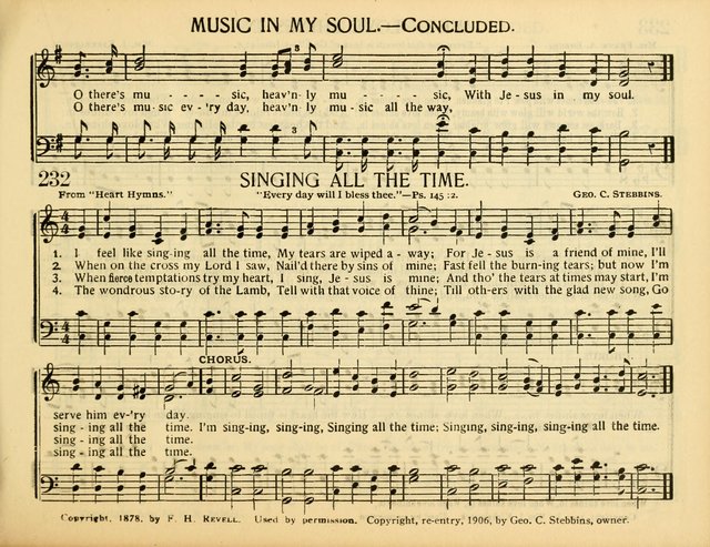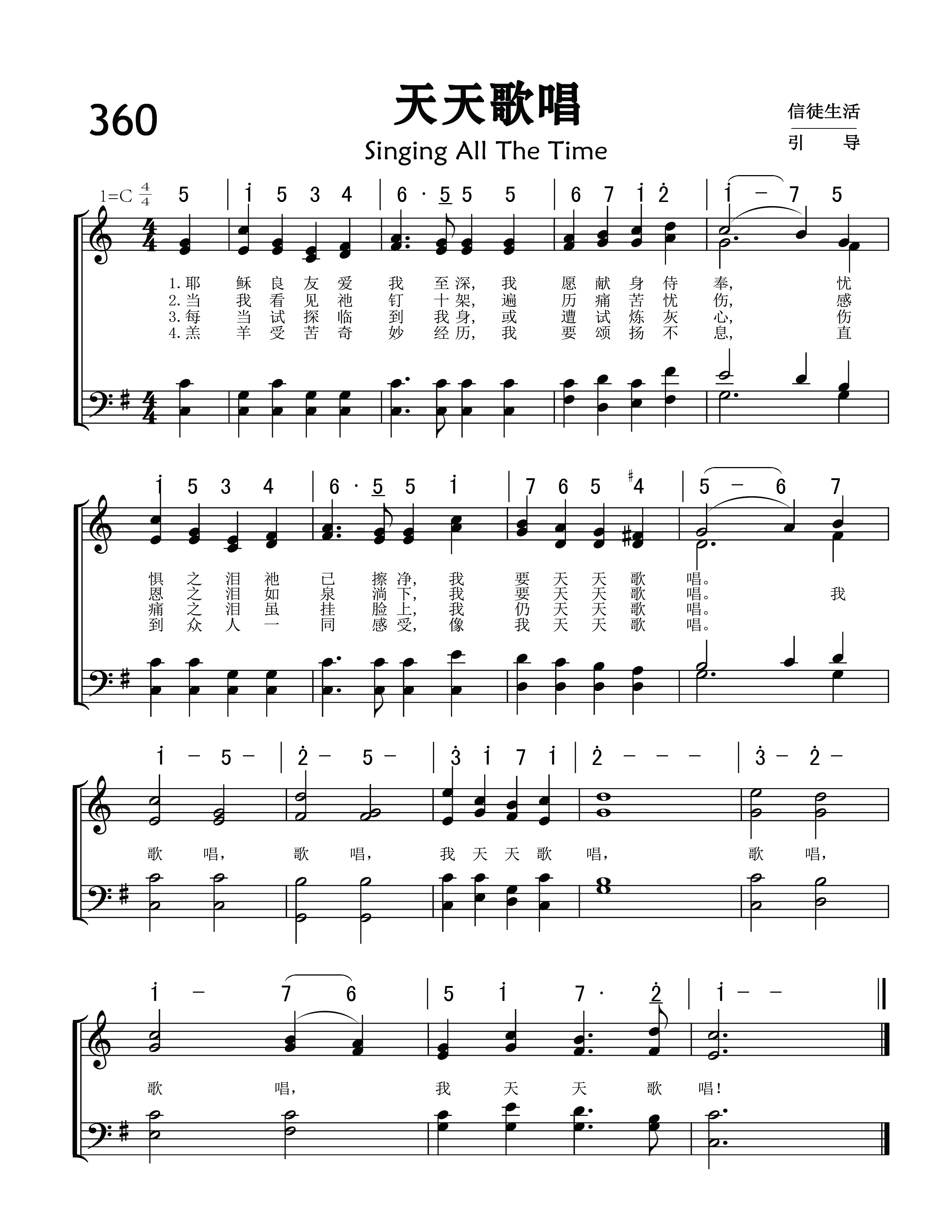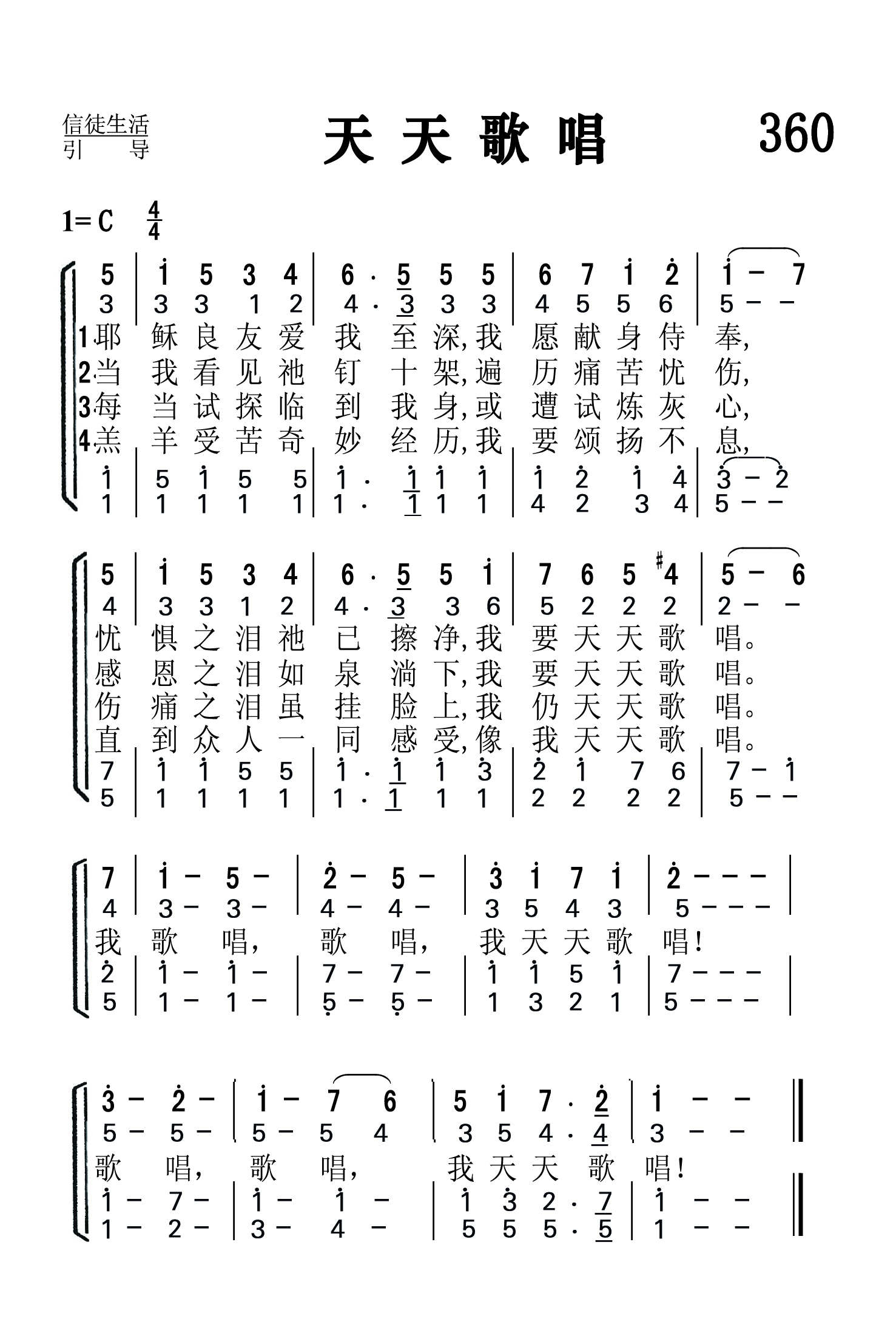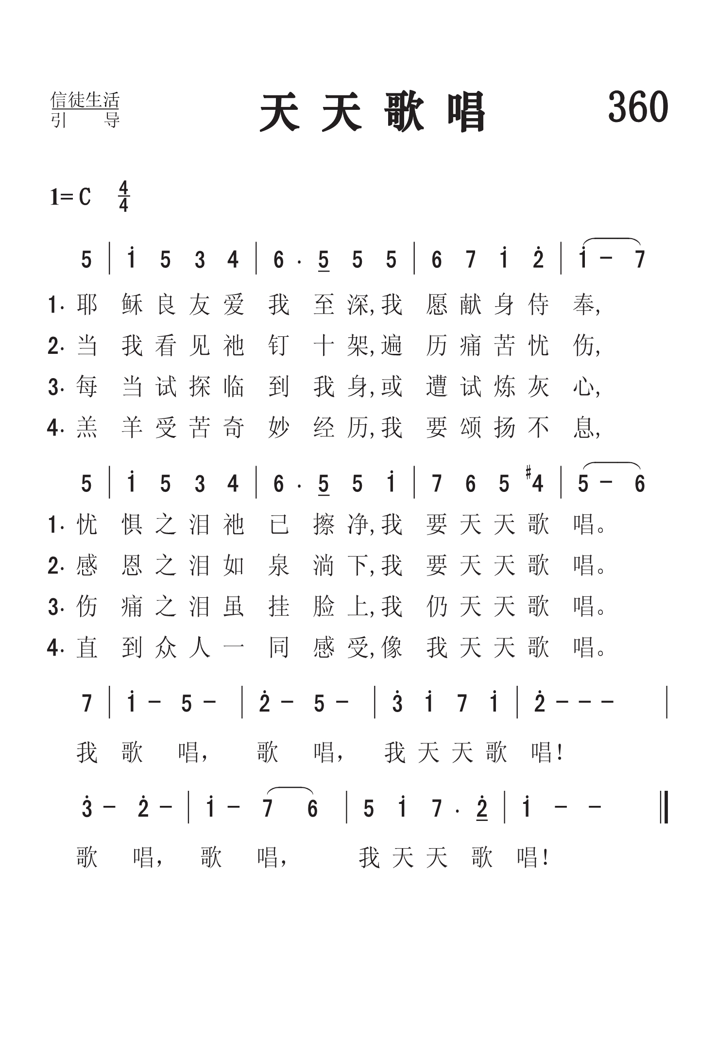 第360首天天歌唱Singing All the Time 《基督颂歌》(C.S)232首 作者:斯特宾斯(George C.Stebbins,1846,2,26-1945,10,6 ),赵典仁、吴涤申合译 耶稣良友爱我至深,我愿献身侍奉, 忧惧之泪祂已擦净,我要天天歌唱。 当我看见祂钉十架,遍历痛苦忧伤, 感恩之泪如泉淌下,我要天天歌唱。 每当试探临到我身,或遭试炼灰心, 伤痛之泪虽挂脸上,我仍天天歌唱 羔羊受苦奇妙经历,我要颂扬不息, 直到众人一同感受,像我天天歌唱。 作者斯特宾斯出生于美国纽约州的一个乡村,自幼喜爱音乐,13岁即进音乐学校学习,后到布法罗和纽约市继续深造。他23岁到芝加哥一个音乐商店工作,业余担任一个教堂唱诗班的指挥。1876年他随墓迪和桑基的布道团到过英国、印度、巴勒斯坦、埃及等地,以他的歌声为主作见证,并且多半是他自编自唱,收到了良好的效果。后来他将所谱的曲调和诗歌出版发行,使福音诗歌流传各地,备受欢迎。有人称他是福音诗歌的泰斗。他晚年所著《回忆录与福音圣诗的故事》,一方面作自传式的叙述,一方面收集其他福音诗歌作家的生平和故事,成为一部美好的见证。该书至今仍为研究圣诗的重要参考资料。