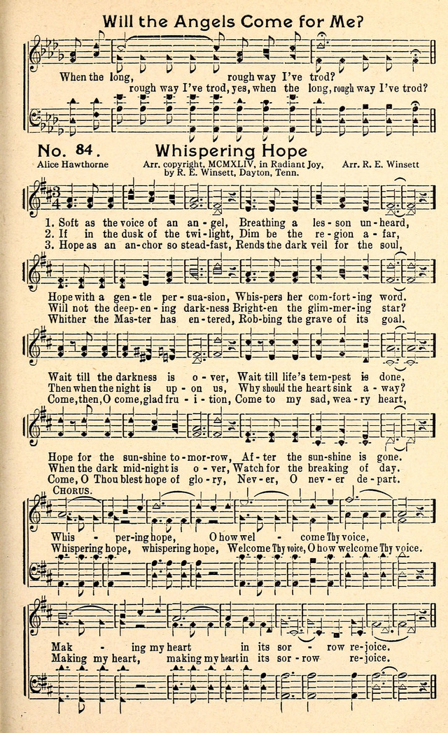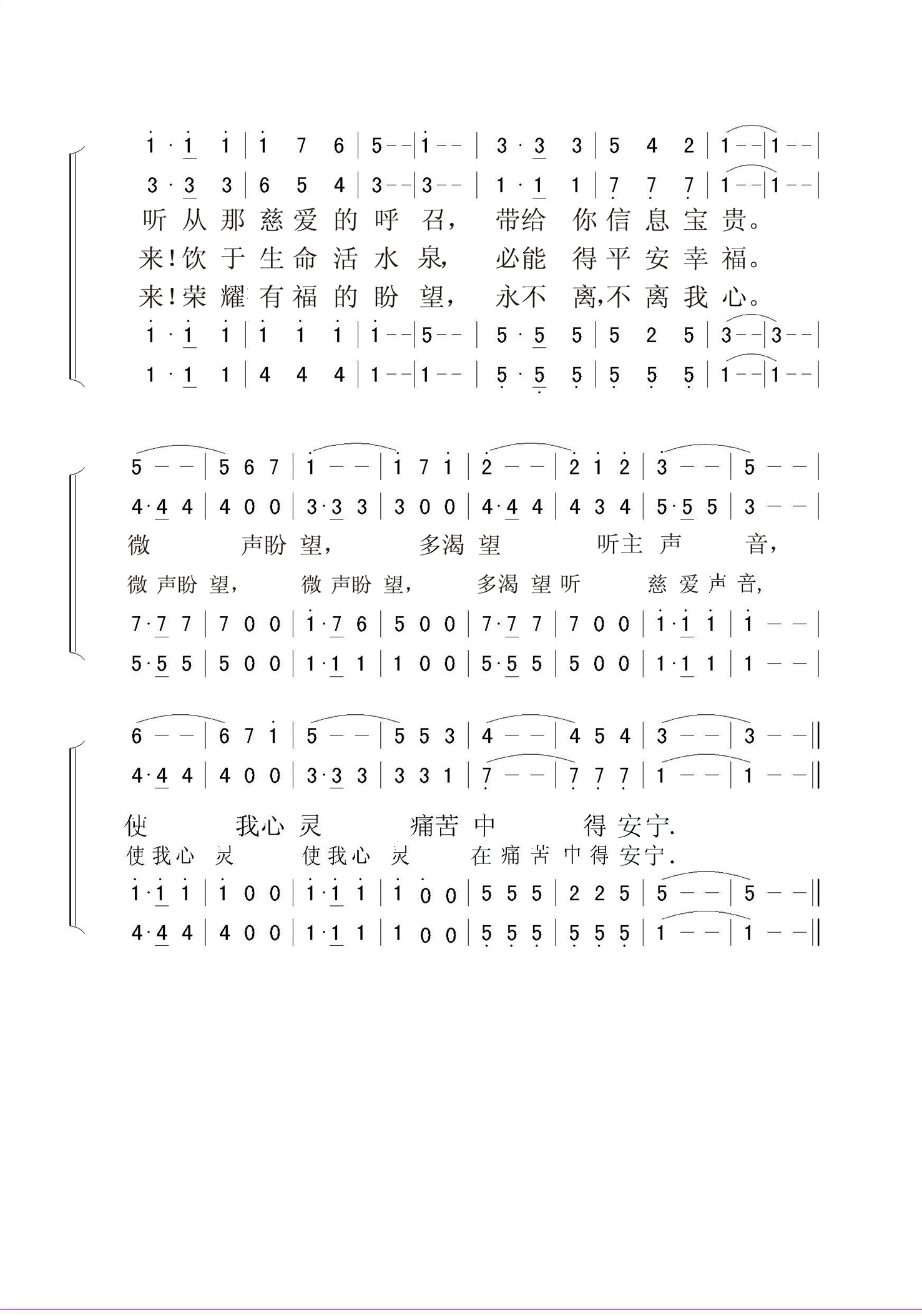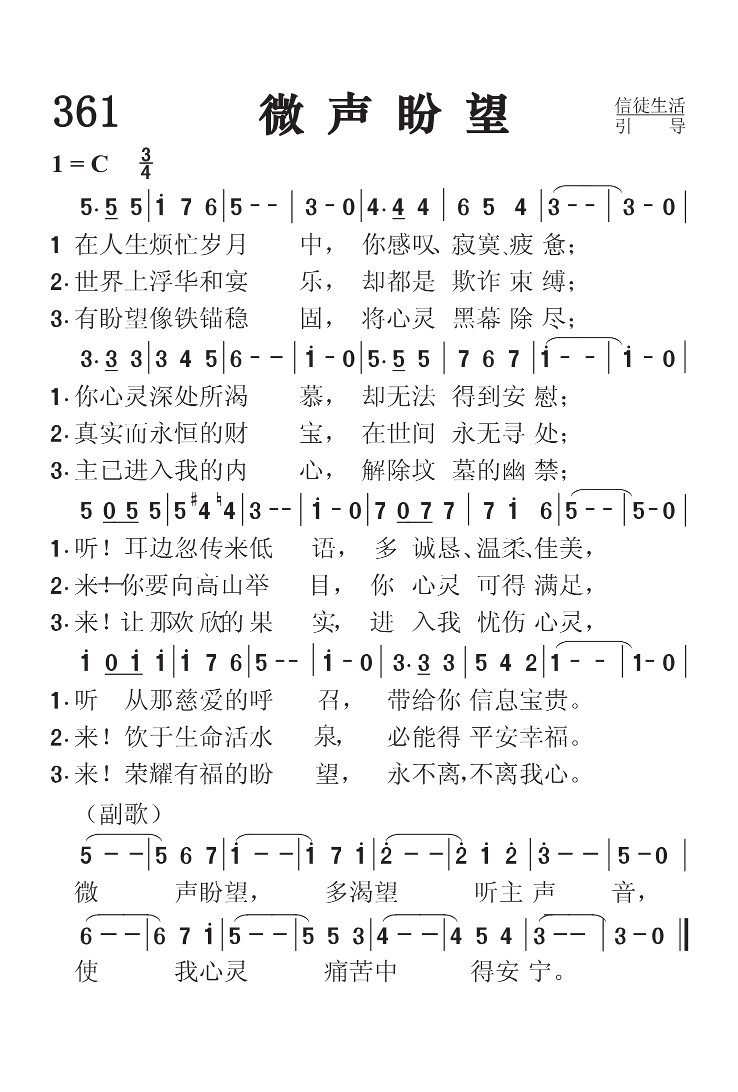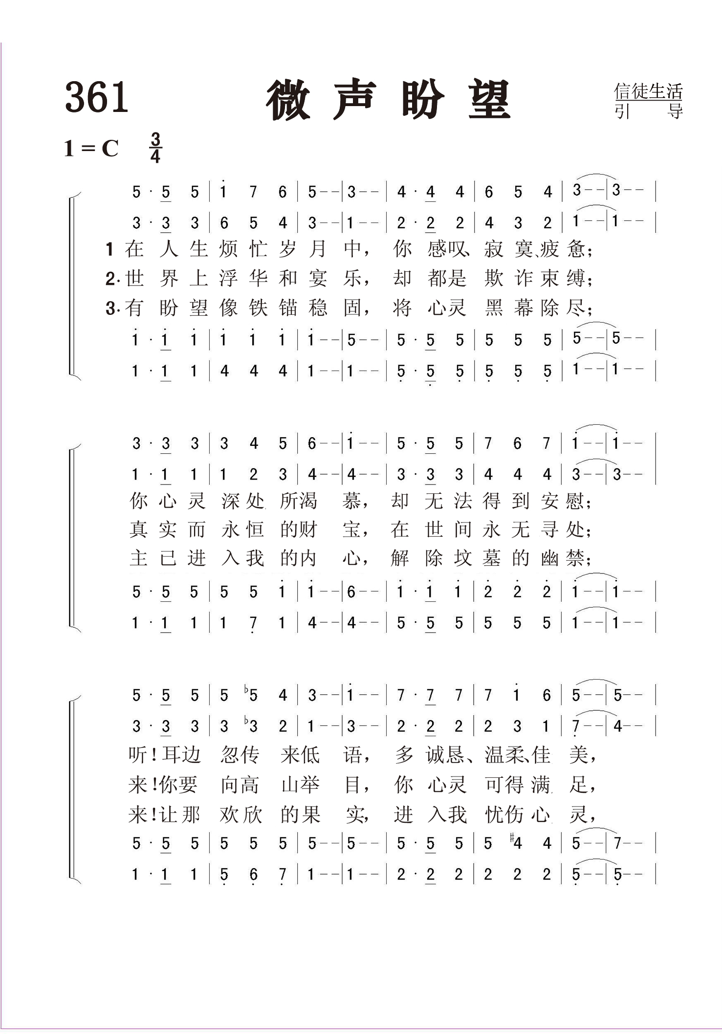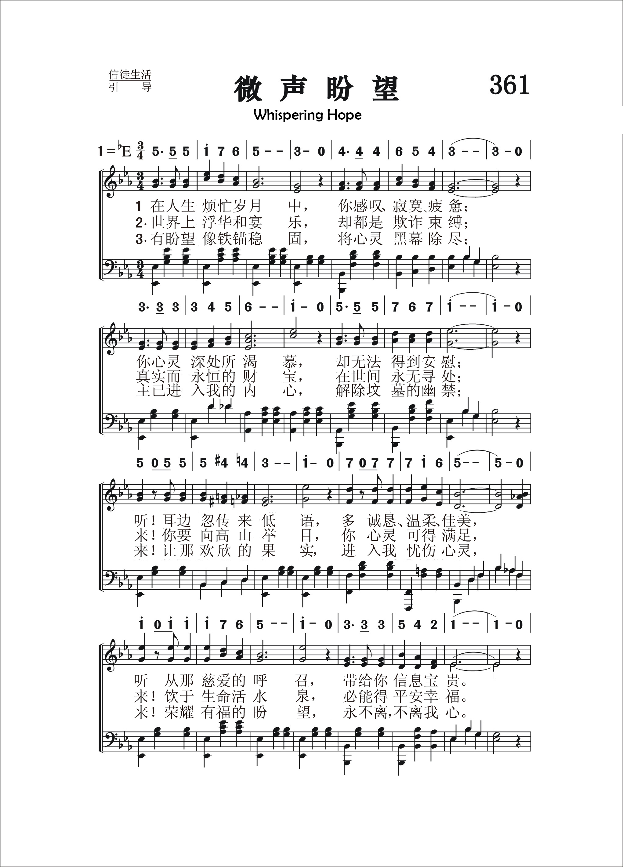 第361首 微声盼望Whispering Hope 温纳(Septimus Winner,1827,5,11-1902,11,22)作词作曲(1868年) 在人生烦忙岁月中, 你感叹寂寞疲惫; 你心灵深处所渴慕, 却无法得到安慰; 听!耳边忽传来低语,多诚恳温柔佳美, 听从那慈爱的呼召,带给你信息宝贵。 世界上浮华和宴乐, 却都是欺诈束缚; 真实而永恒的财宝, 在世间永无寻处; 来!你要向高山举目, 你心灵可得满足, 来!饮于生命活水泉, 必能得平安幸福。 有盼望像铁锚稳固, 将心灵黑幕除尽; 主已进入我的内心, 解除坟墓的幽禁; 来1!让 那欢 欣的 果 实, 进入我忧伤心灵, 来!荣耀有福的盼望, 永不离,不离我心。 微声盼望,多渴望听主声音, 使我心灵痛苦中得欢欣。 本诗歌词曲均出自温纳,他是美国十九世纪末很出名的诗人、作曲家及音乐家,是一位自学成才的音乐家,因为开了一家音乐教室而开设针对多种乐器的学习课程,也擅于写作,编辑了近两百册的音乐作品。他是费城交响乐队和塞西里安音乐协会的成员,曾改编了2000首钢琴和小提琴曲,创作了大量的歌曲。他在发表作品时有多个笔名,本诗是他用Alice Hawthorne他母亲的名字为笔名在1868年发表的作品。事实上,他本来并未将此诗视为宗教曲子,对于能得到广大基督徒的喜爱而感到惊喜,一直到如今这首诗歌还是被许多的教会收录为赞美诗歌。