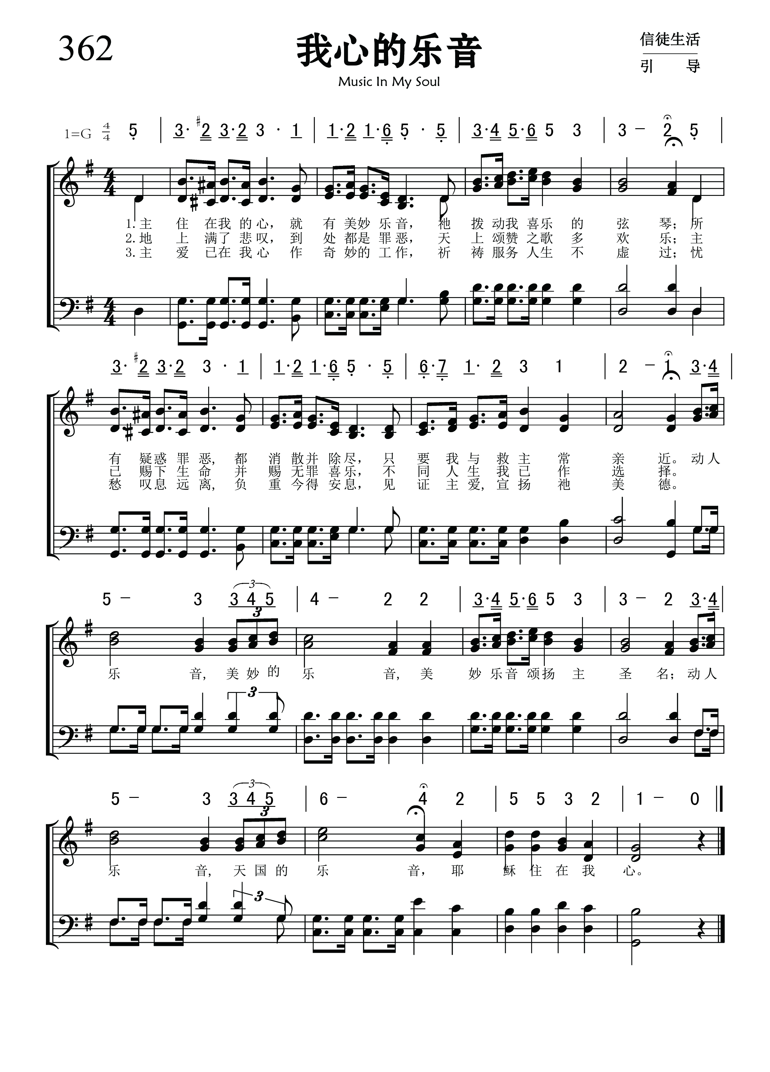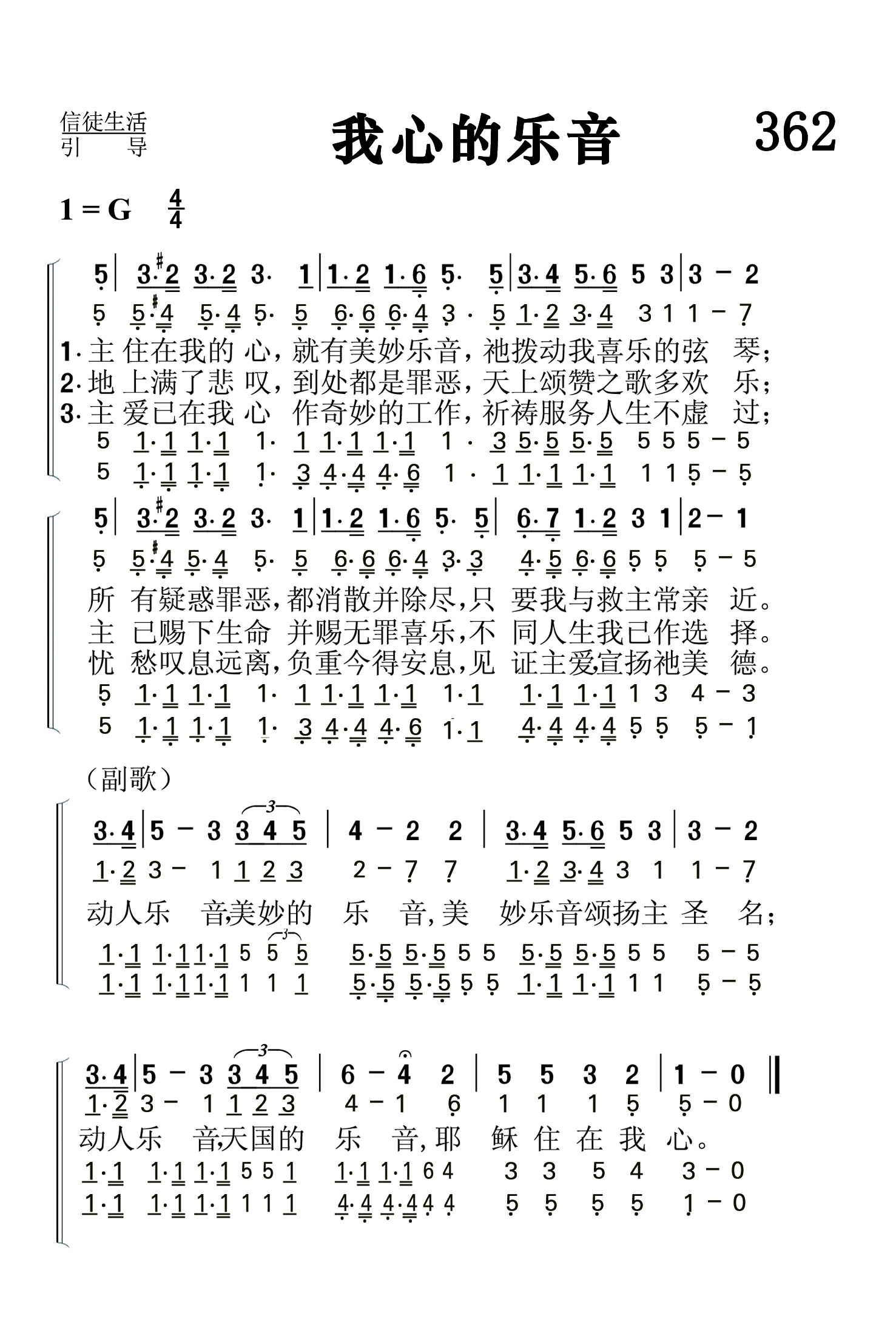 第362首 我心的乐音Music in My Soul 富兰克林.埃德森.贝尔登(Franklin.Edson.Belden,1858.3.21-1945.12.2)作词作曲,赵典仁、吴涤申合译 主住在我的心,就有美妙乐音,祂拨动我喜乐的弦琴; 所有疑惑罪恶都消散并除尽,只要我与救主常亲近。 地上满了悲叹,到处都是罪恶,天上颂赞之歌多欢乐; 主已赐下生命并赐无罪喜乐,不同人生我已作选择。 主爱已在我心作奇妙的工作,祈祷服务人生不虚过; 忧愁叹息远离负重今得安息,见证主爱宣扬祂美德。 动人乐音美妙的乐音.美妙乐音颂扬主圣名; 动人乐音天国的乐音,耶稣住在我心。 贝尔登是基督复临安息日会的创始人之一怀爱伦女士的外甥,出生在密歇根州的巴特尔克里克,8岁时全家迁往加利福尼亚州,在那里他开始创作音乐。他后来因呼吸问题而迁往科罗拉多州,但在30岁左右回到巴特尔克里克,加入《评论与通讯》出版社。他是该安息日会第一本赞美诗集的音乐编辑之一,曾担任《评论与通讯》杂志的主管。他创作了数百首安息日学诗歌和其他赞美诗,并且大部分是由他自己谱曲的。1907年,他因在诗歌集的出版和经营上与教会领袖产生误解而离开教会。1910年开始他为布道家比利.森迪写歌。但他临终时把他的作品文稿全部捐献给基督复临安息日会神学院。