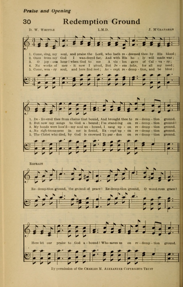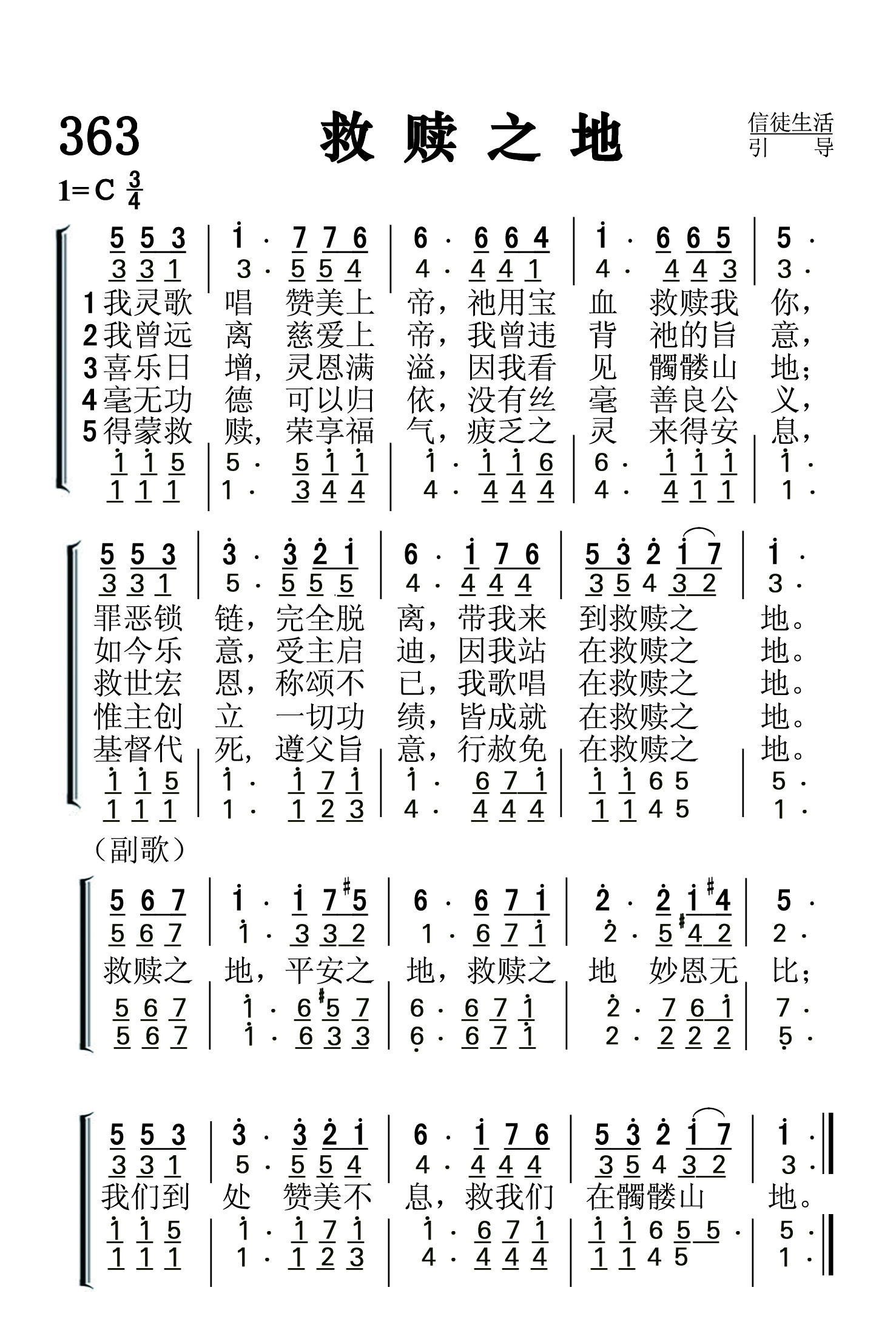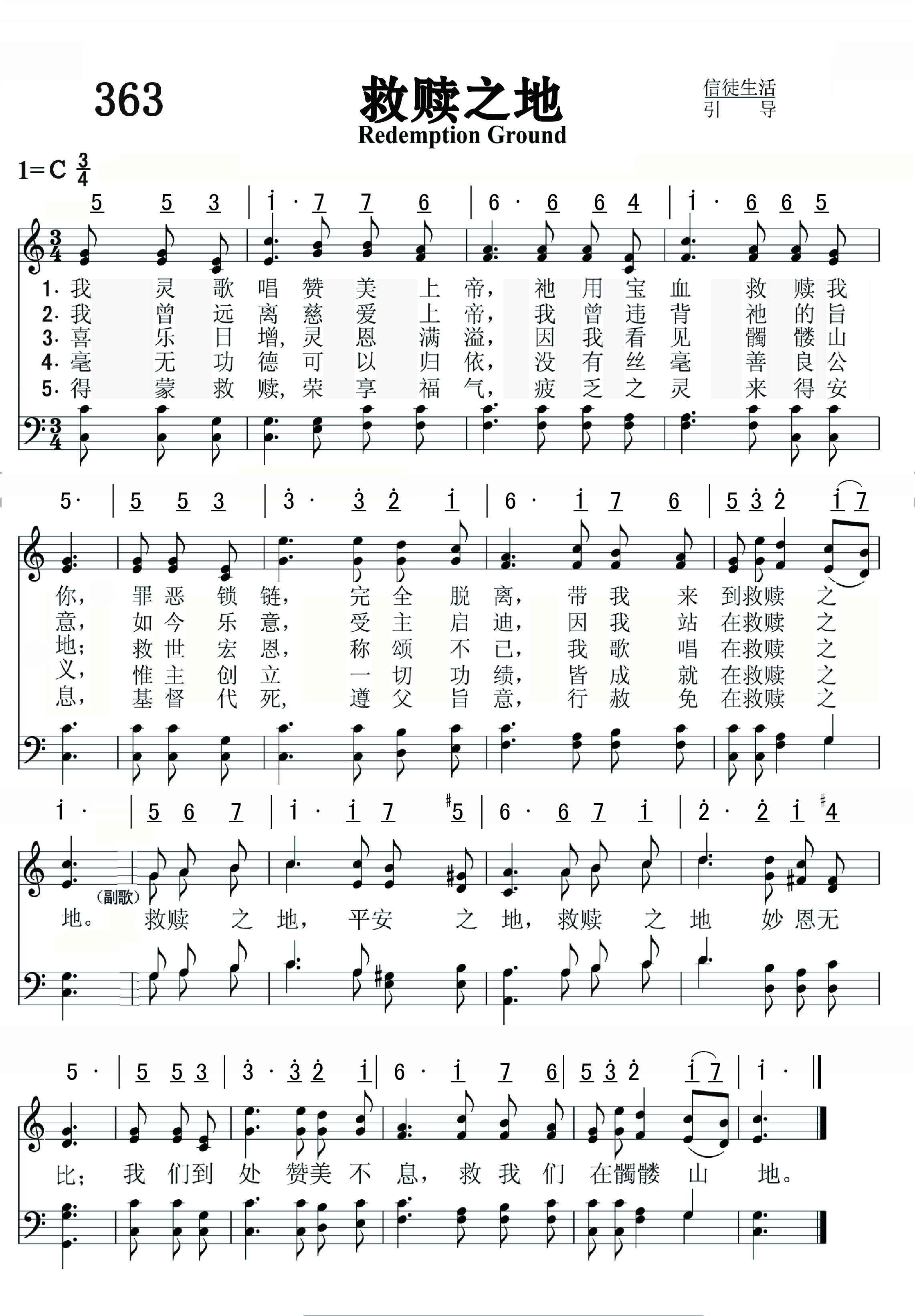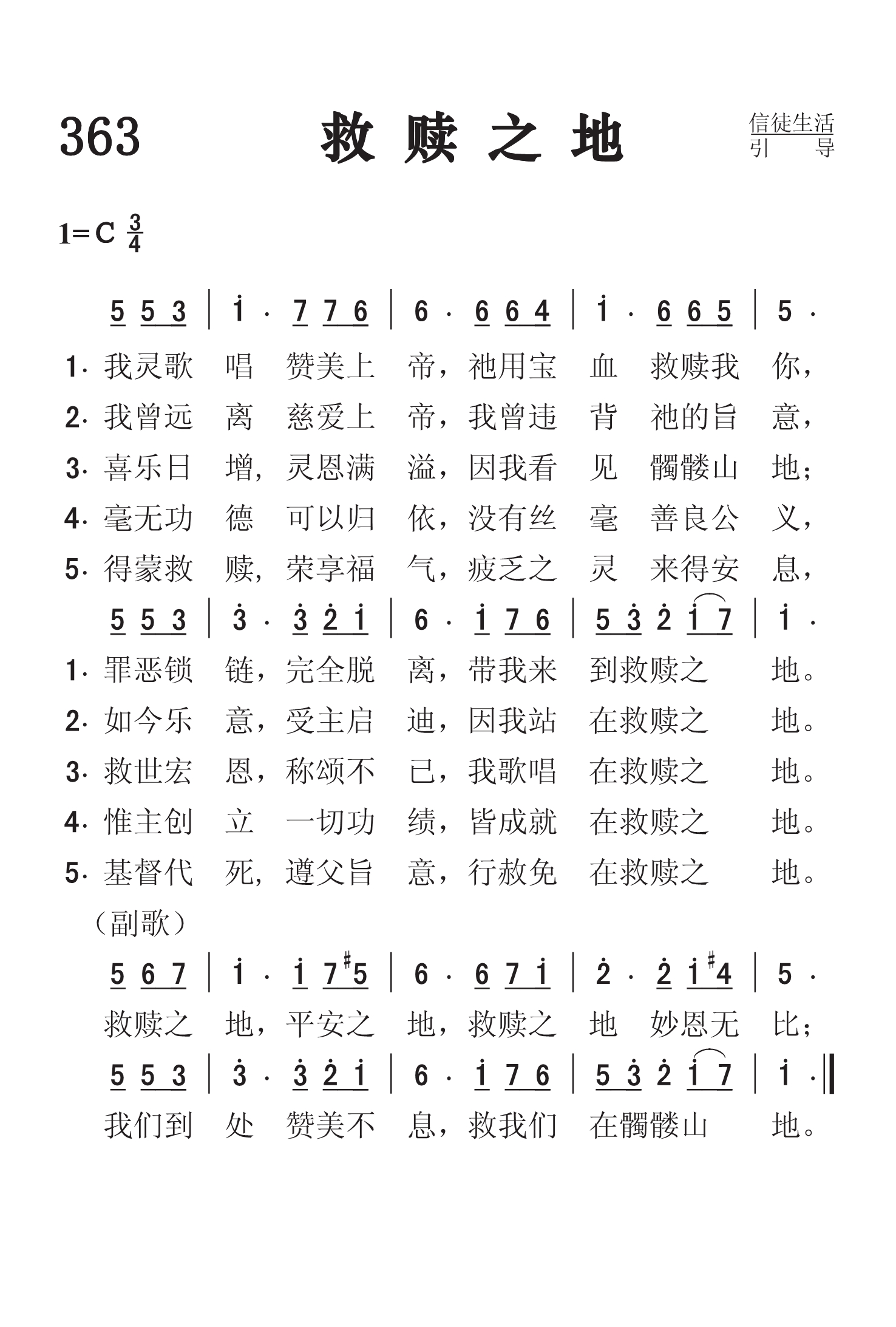 第363首救赎之地 Redemption Ground (桑基《圣诗与独唱》466首) 惠特尔(D.W.Whittle,1840,11,22-1901,3,4)作词,麦格拉纳汉(James McGranahan,1840,7,4-1907,7,9)作曲,赵典仁、吴涤申合译 我灵歌唱赞美上帝,祂用宝血救赎我你, 罪恶锁链,完全脱离,带我来到救赎之地。 我曾远离慈爱上帝,我曾违背祂的旨意, 如今乐意,受主启迪,因我站在救赎之地。 喜乐日增, 灵恩满溢,因我看见髑髅山地; 救世宏恩,称颂不已,我歌唱在救赎之地。 毫无功德可以归依,没有丝毫善良公义, 惟主创立一切功绩,皆成就在救赎之地。 得蒙救赎, 荣享福气,疲乏之灵来得安息, 基督代死, 遵父旨意,行赦免在救赎之地。 救赎之地,平安之地,救赎之地妙恩无比; 我们到处赞美不息,救我们在髑髅山地。 词作者丹尼尔. 惠特尔是美国奋兴布道家和歌唱家,出生在美国马萨诸塞州。他在少年时代随家迁往芝加哥,因家庭贫苦很早就参加工作,担任银行职员。在南北战争期间他投笔从戎,在战斗中负伤,失去右手而被俘。在监狱中他想到母亲在他参军前送给他的一本圣书,就拿出来阅读,因圣灵的感动,他接受了十字架的救恩。战争结束以后,他被晋升为少校。复员后仍回芝加哥,任钟表厂会计,业余从事布道工作。后与慕迪,桑基,斯宾斯特等一同周游各大城市布道。晚年他自己也动手写诗,深受同道的欢迎。 惠特尔在圣诗创作上有较高的造诣。他说:“我不希望创作一首不包含信息的圣诗。所写的诗要以上帝的话为基础,传递上帝爱的信息”。他认为福音诗歌创作的严肃性值得人们付出最高的代价。他写诗除了注重实质内容以外,还在结构上严格遵守音步和韵律的规则。他共创作了二百来首圣诗。慕迪曾说:“我认为惠特尔少校创作了本世纪一些最优秀的圣诗”。 曲作者麦格雷纳汉出生于美国的一个农民家庭,所受的正式教育很有限,却靠自己的努力和爱好,使他在19岁时就出任音乐教师。以后他到纽约州布雷德伯里所办的音乐学校短期学习,接着便参加福音布道团以歌声宣扬主名。1877年,福音歌唱家、作曲者布利斯突然去世,他便与诗人惠特尔合作,组织布道团,旅行美国各地并前往英国,担任唱诗班领唱,以他优美动听的男高音和亲切感人的魅力大获成功。他还首先组织完全是男声的唱诗班,曾与桑基,鲁特,斯特宾斯等人合编出版多本福音诗歌集,其中较有名的有《男声福音圣诗》二卷,《福音圣诗》等。他自己也写诗,如《颂赞诗歌》317首《信主得生命》。