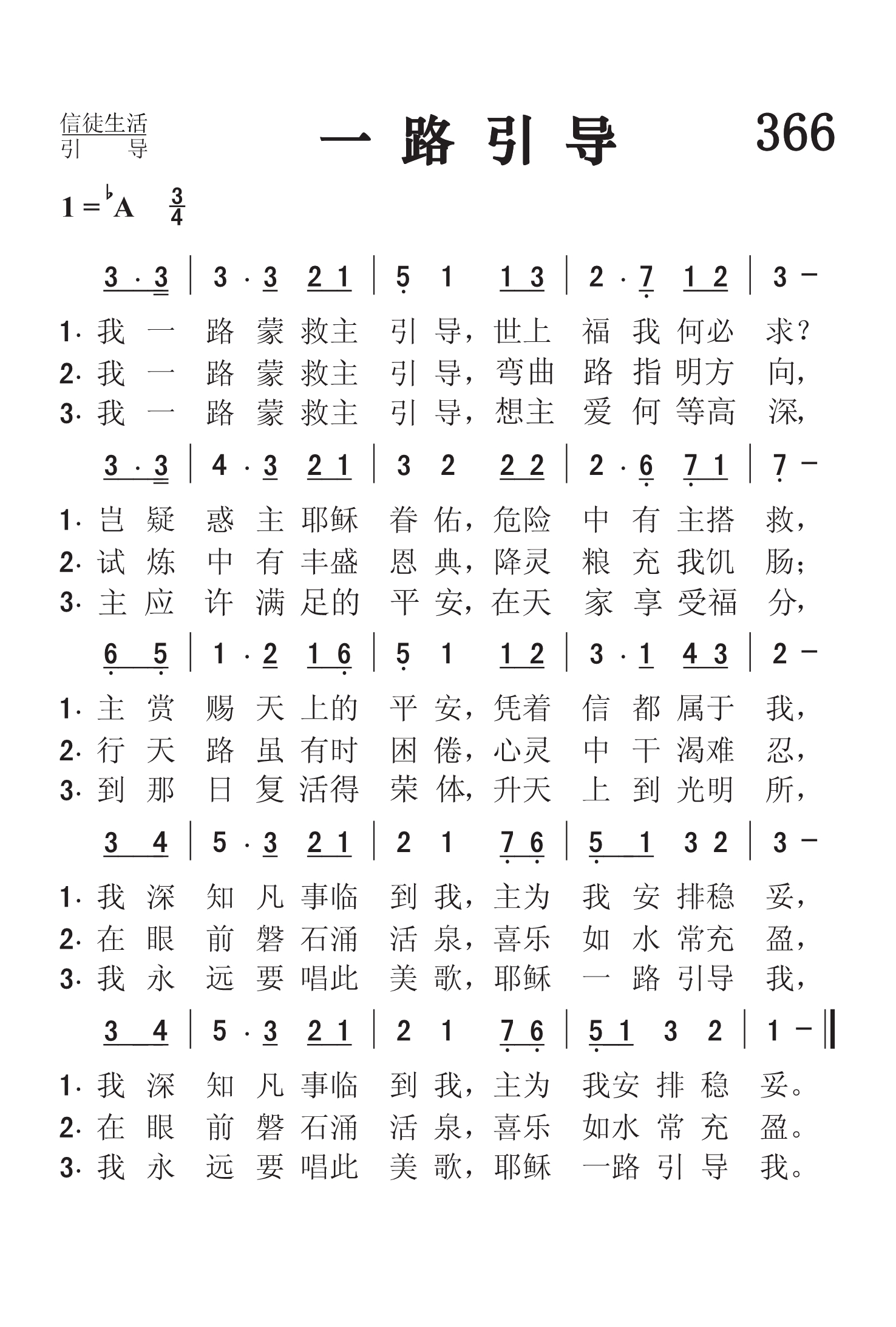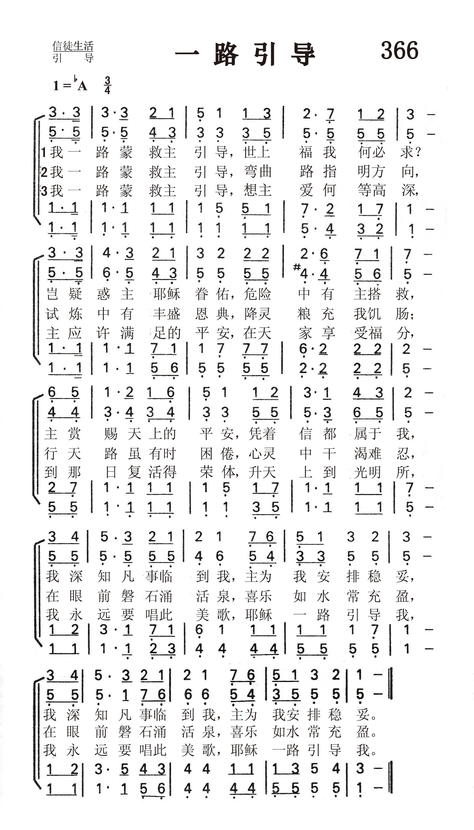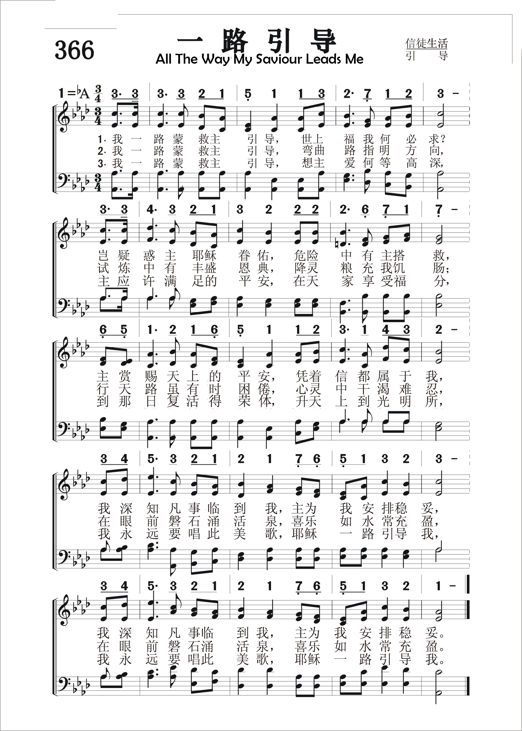 第366首 一路引导All the Way My Saviour Leads Me 克罗斯比(1820-1915年)作词(1875年);劳里(R .Lowry,1826,3,12-1899,11,25)作曲(1875年) 我一路蒙救主引导,世上福乐何必求? 岂疑惑主耶稣眷佑,危险中有主搭救, 主赏赐天上的平安,凭着信都属于我, 我深知凡事临到我,主为我安排稳妥。 我一路蒙救主引导,弯曲路指明方向, 试炼中有丰盛恩典,降灵粮充我饥肠; 行天路虽有时困倦,心灵中干渴难忍, 在眼前磐石涌活泉,喜乐如水常充盈。 我一路蒙救主引导,想主爱何等高深, 主应许满足的平安,在天家享受福分, 到那日复活得荣体,升到天上光明所, 我要永远唱此美歌,耶稣一路引导我。 这首旋律动听,属灵意境十分优美的诗歌,曾感动了无数基督徒在盼望和祈祷中努力奔走天路,不畏艰险,披荆斩棘,朝着那永久的目标前进。 这首圣诗的词作者芬妮克罗斯比1823年出生在清寒的家庭。她在纽约盲校就读时的音乐老师发现了她作诗的天赋。她每次写诗前必须先祷告,恳求圣灵带领再动笔。1874年秋的某日,她发现自己没有足够的钱缴房租,于是祷告求上帝供应,不久,一位陌生客来访,客人离去握别时递给她一张纸,正是她所需要的钱,她怀着感恩的心,静坐屋中,铭感主恩时,写下了这一首诗。字里行间,透露出她对于上主引导的完全信靠,内心的喜乐和安宁,以及她个人深刻的属灵经验。她的视线始终没有离开那“灵磐石”基督。这正是她人生的动力和安慰的泉源。再加上劳里所配的婉转流畅的旋律,更使词曲相得益彰,足以让下垂的手举起来,发酸的腿挺起来。因为有“耶和华独自引导”(申32:12)人生的道路。上帝在每一个儿女身上所做的,都是尽善尽美的。 词作者克罗斯比是美国才华出众,负有盛名的福音女诗人。她出生六个月时因庸医,误诊而双目失明。15岁时她就读于纽约最早的一所盲童学校。1847-1858年,她留在该校教授英语语法,修辞学,罗马史和美国历史。她少年时代就开始写诗,24岁时出版了《盲女与她的诗》,引起美国文坛的注意。1850年灵性奋兴的经验,使她集中全力专写圣诗,后在福音圣诗作曲家和编辑布雷得伯里的鼓励下,立志以创作福音圣诗作为自己的终生事业,于是与纽约一家出版社签订合同,每周写圣诗三首,结果写了5929首。此外,她还为布利斯写525首,为桑基写237首,为劳里写219首,为多恩写1500首。她一生共写了8440首圣诗,堪称为最多产的圣诗作家。 曲作者是劳里,这是他们第一首合作的诗歌。 劳里出生于美国费城。大学毕业后,担任费城,纽约布鲁克林等地浸会教堂的牧师。1869至1875年兼任母校修辞学教授,离校时母校赠送他荣誉神学博士学位。1875年起至1899年去世,一直任新泽西州普兰菲尔德地方浸会牧师。他自幼爱好音乐,但并没有专学音乐,直到他41岁后才致力于福音音乐圣诗的编写,并自己作曲配和声。有人问他:“你怎么又能作词又能作曲并能配以和声呢?”他回答说:“我也没有什么特别的办法。有时,音乐曲调在我心中出现,而词句也随着出来了,词与曲就配合得很好。我常常注意着自己的心境,无论是在家中,还是走在街上,任何事物触动了我的灵感,我就马上抓住它,把它记录下来。我有时在报纸的边上或一个旧信封的背面,把我的灵感记录下来。我觉得我的头脑就象一架常转动的纺车,音乐从其中流了出来,有时并不注意在我头脑里流出来的曲调是C调还是A调,只有当我把它写在纸上时,才想它当用什么调。我在纸上一面写,一面把它完成,成为一首曲调,然后再到管风琴上去试奏,不是先试奏而后写出,而常常是曲调与词一同写出。” 劳里还说:“我有时宁愿写赞美诗可以长期流传下来,影响很多的人,因为讲道完毕后常常会被人遗忘。”的确,他当时讲道的听众只有一千人,而他所写的赞美诗多年以来却有成千上万的人在颂唱。劳里牧师一生编辑过十八种不同的赞美诗集。
