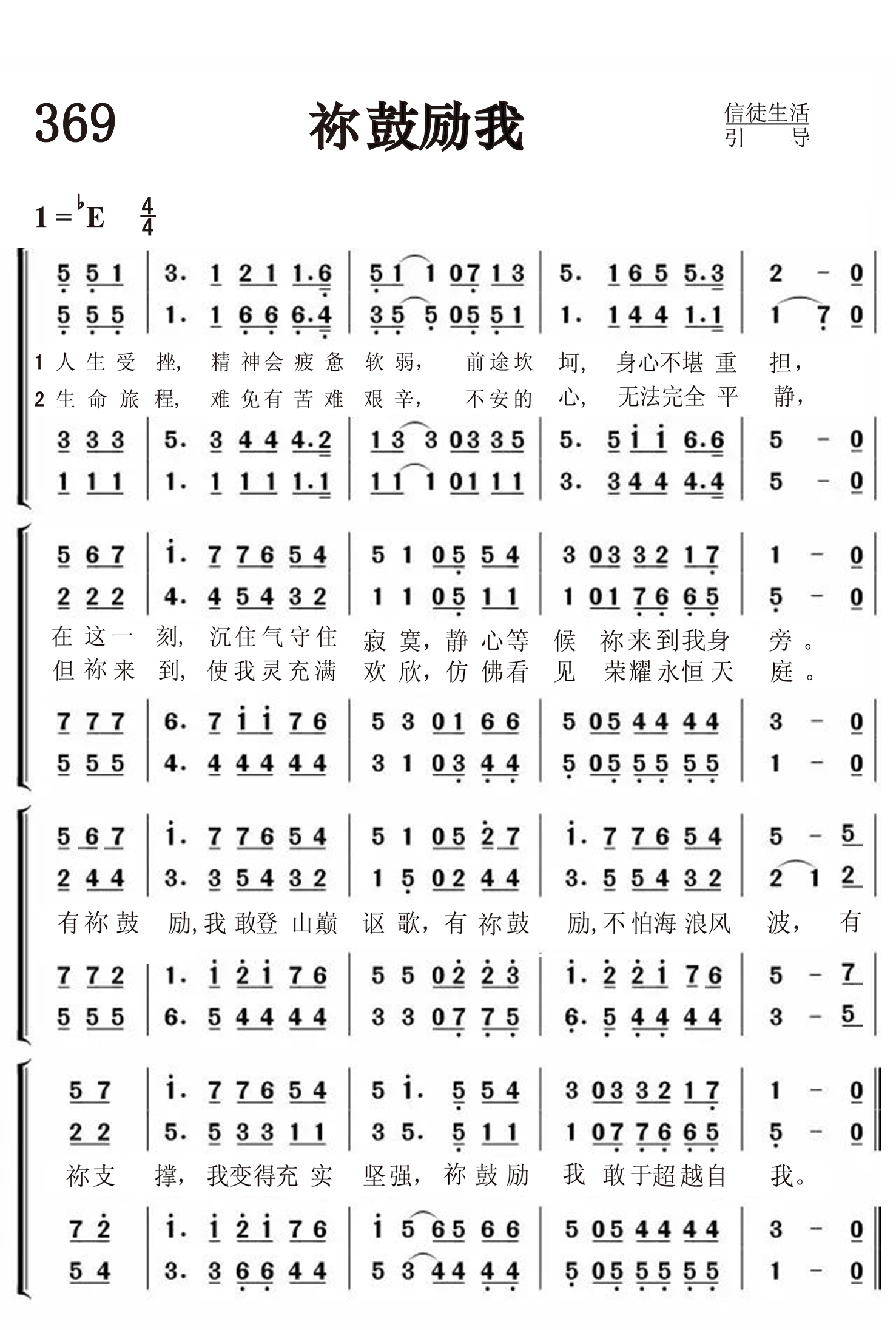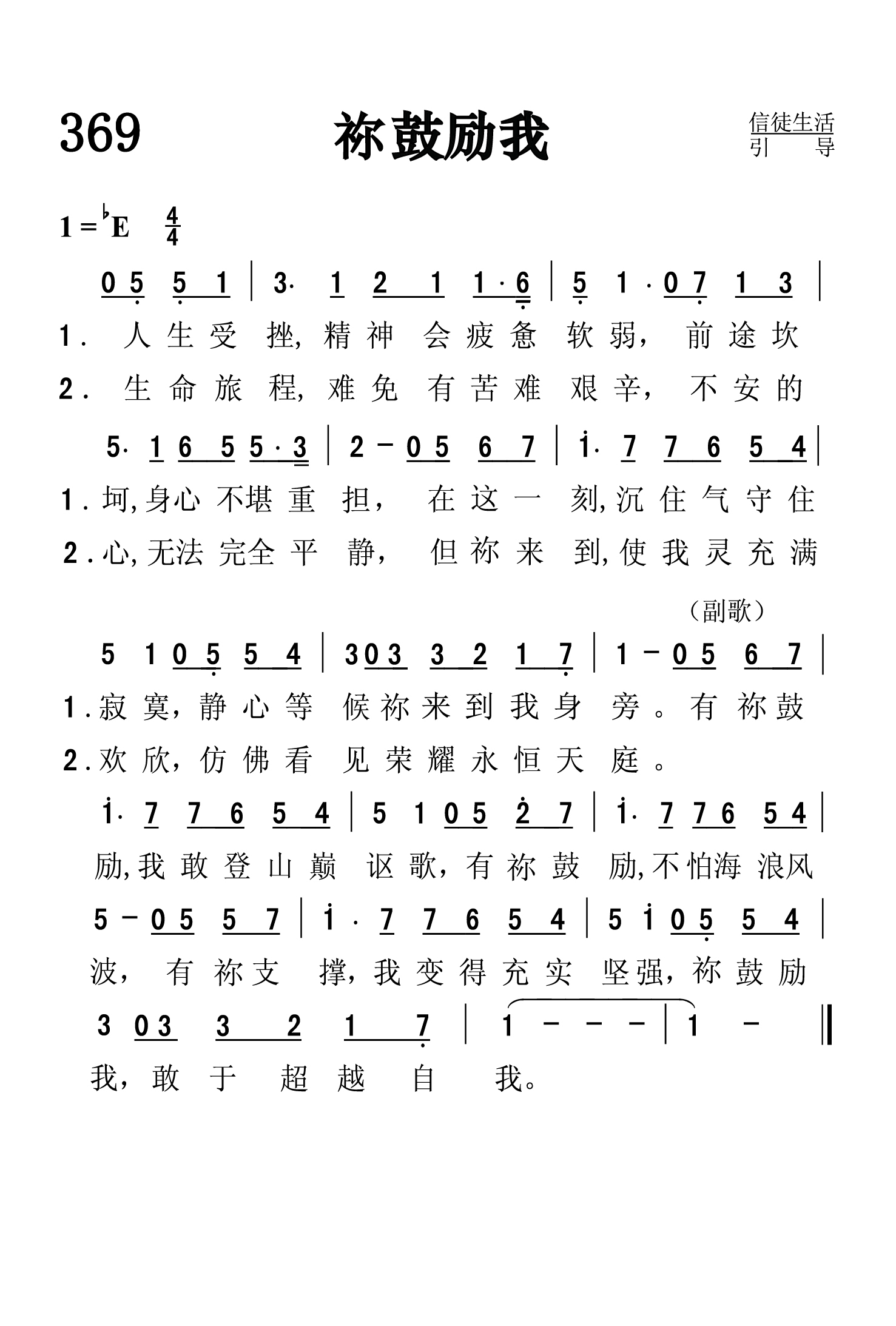 第369首 祢鼓励我You Raise Me Up 人生受挫, 精神会疲惫软弱,前途坎坷,身心不堪重担, 在这一 刻,沉住气守住寂寞,静心等候祢来到我身旁。 生命旅程, 难免有苦难艰辛,不安的心,无法完全平静, 但祢来到, 使我灵充满欢欣,仿佛看见荣耀永恒天庭。 有祢鼓励, 我敢登山巅讴歌,有祢鼓励,不怕海浪风波, 有祢支撑,我变得充实坚强,祢鼓励我,敢于超越自我。 这首诗歌告诉人们在任何艰难压抑的情况下都要靠着上帝胜过环境、超越自我。其中的歌词“You raise me up to walk on stormy seas”是由《圣书》中耶稣使彼得行走在海面上这件神迹而来。词作者是格雷厄姆(Brendan Graham),曲作者是神秘园(Secret Garden)的罗尔夫.拉夫兰(Rolf Lovland)根据爱尔兰传统民歌《Danny Boy》获得创作灵感,在读了爱尔兰小说家和歌曲作家Brendan Graham(布伦丹格雷厄姆)的小说《最白的花》后,请他为该歌填词。最初题为《无声的故事》,后成为世界上最适合被钢琴和小提琴演奏的经典曲目。迄今为止,这首诗歌已被全球100多位歌唱家翻唱过,被用不同语言录制了125次以上。这首歌在美国被用于纪念911事件,仅2004年,就在美国电台共计播放了至少50万多次,获得福音音乐奖包括“年度最佳歌曲”奖项在内四个提名。