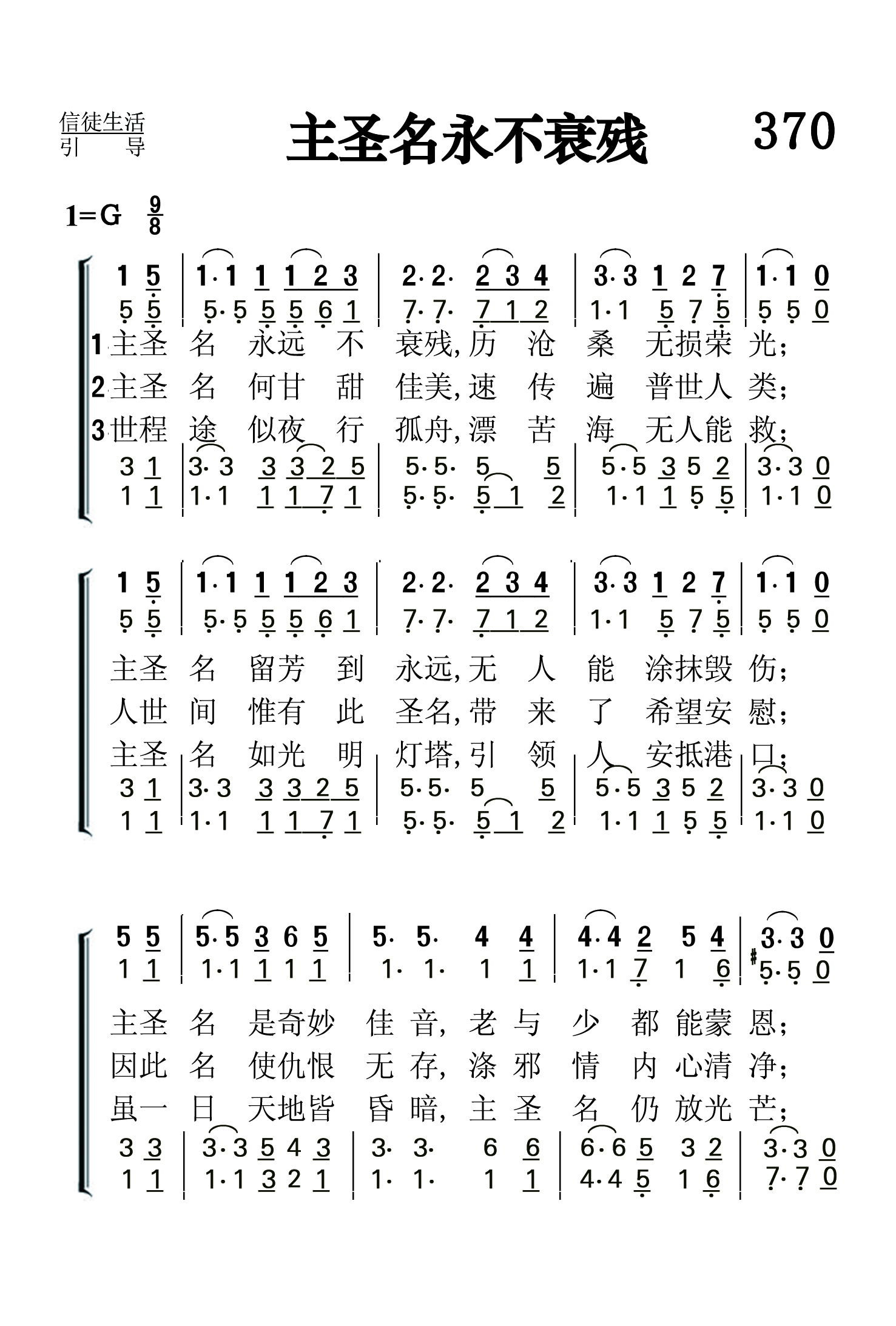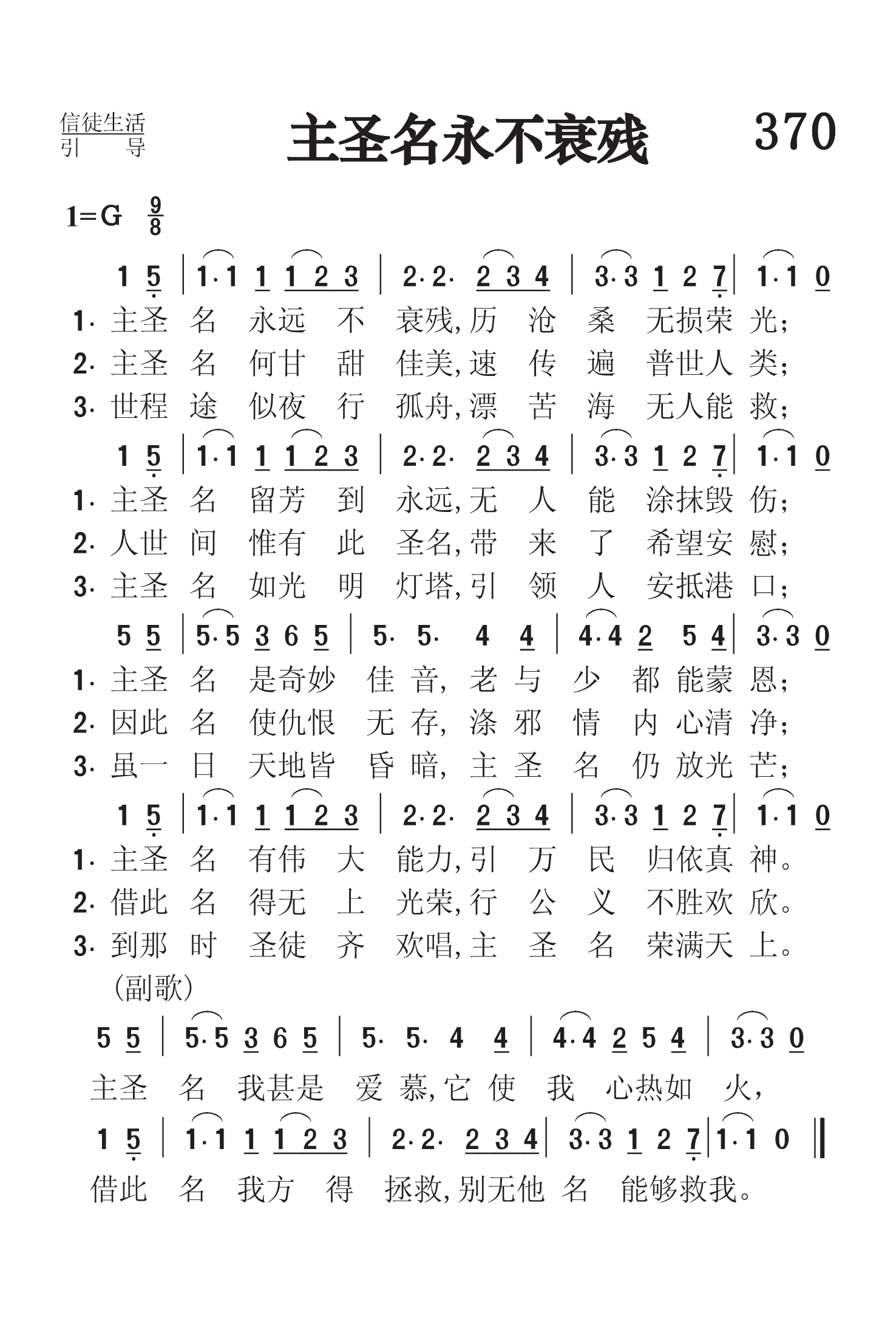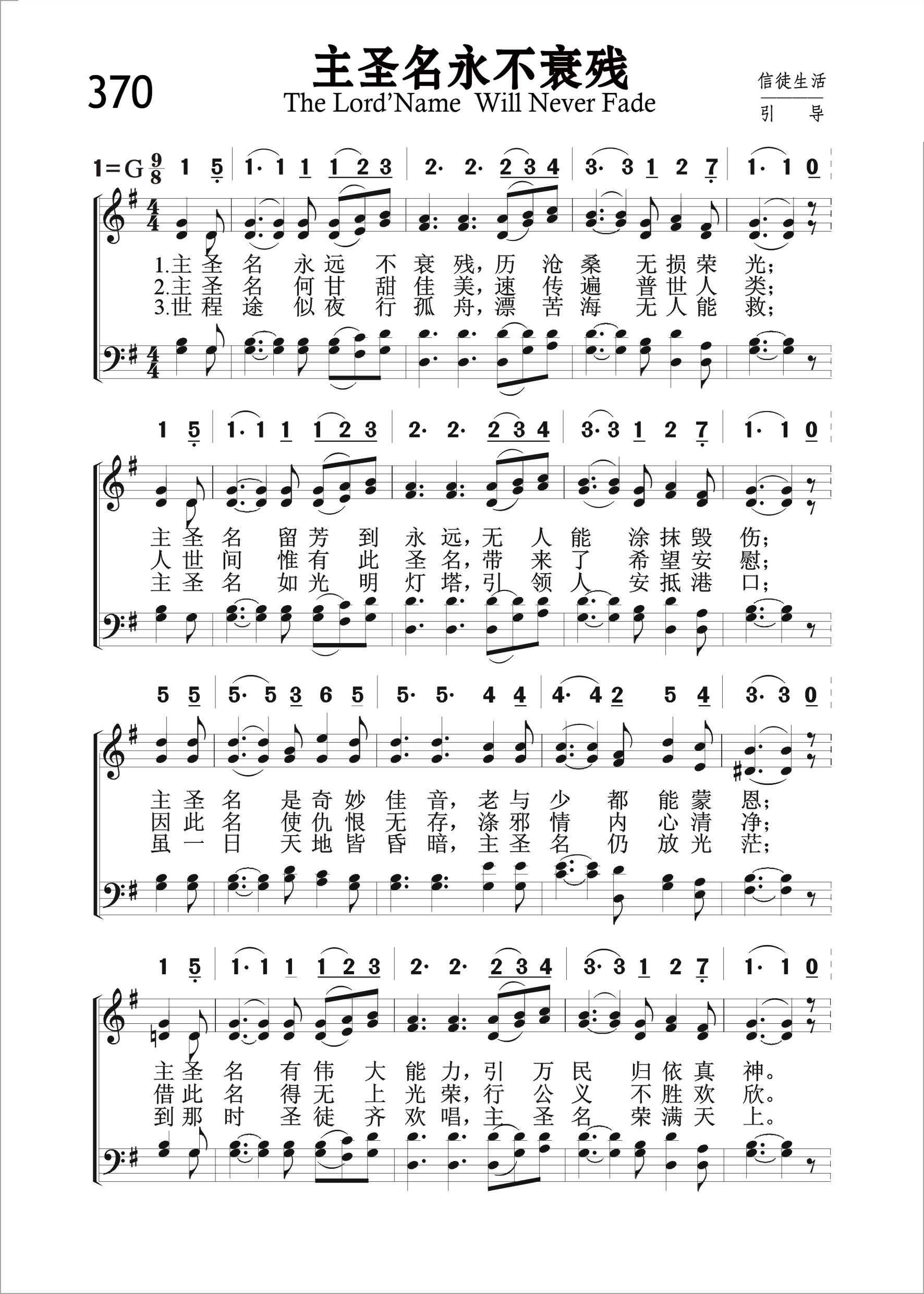 第370首 主圣名永不衰残The Lord’NameWill Never Fade (《颂赞圣诗》147首) 主圣名永远不衰残,历沧桑无损荣光; 主圣名留芳到永远,无人能涂抹毁伤; 主圣名是奇妙佳音, 老与少都能蒙恩; 主圣名有伟大能力,引万民归依真 神。 主圣名何甘甜佳美,速传遍普世人类; 人世间惟有此圣名,带来了希望安慰; 因此名使仇恨无存,涤邪情内心清净; 借此名得无上光荣,行公义不胜欢欣。 世程途似夜行孤舟,漂苦海无人能救; 主圣名如光明灯塔,引领人安抵港口; 虽一日天地皆昏暗,主圣名仍放光芒; 到那时圣徒齐欢唱, 主圣名荣满天上。 主圣名我甚是爱慕,它使我心热如火, 借此名我方得拯救,别无他名能够救我。 “除祂以外,别无拯救;因为在天下人间,没有赐下别的名,我们可以靠着得救” (徒4:12)。 通观古今,没有一个人名字是可以久存不朽的。在历史的舞台中,所有的人都只是过客而已。惟有主耶稣的名字是永垂不朽的。这首诗歌所赞颂的,就是主耶稣的圣名。这个名字具有无限的功效,值得我们爱慕、思考和追求。