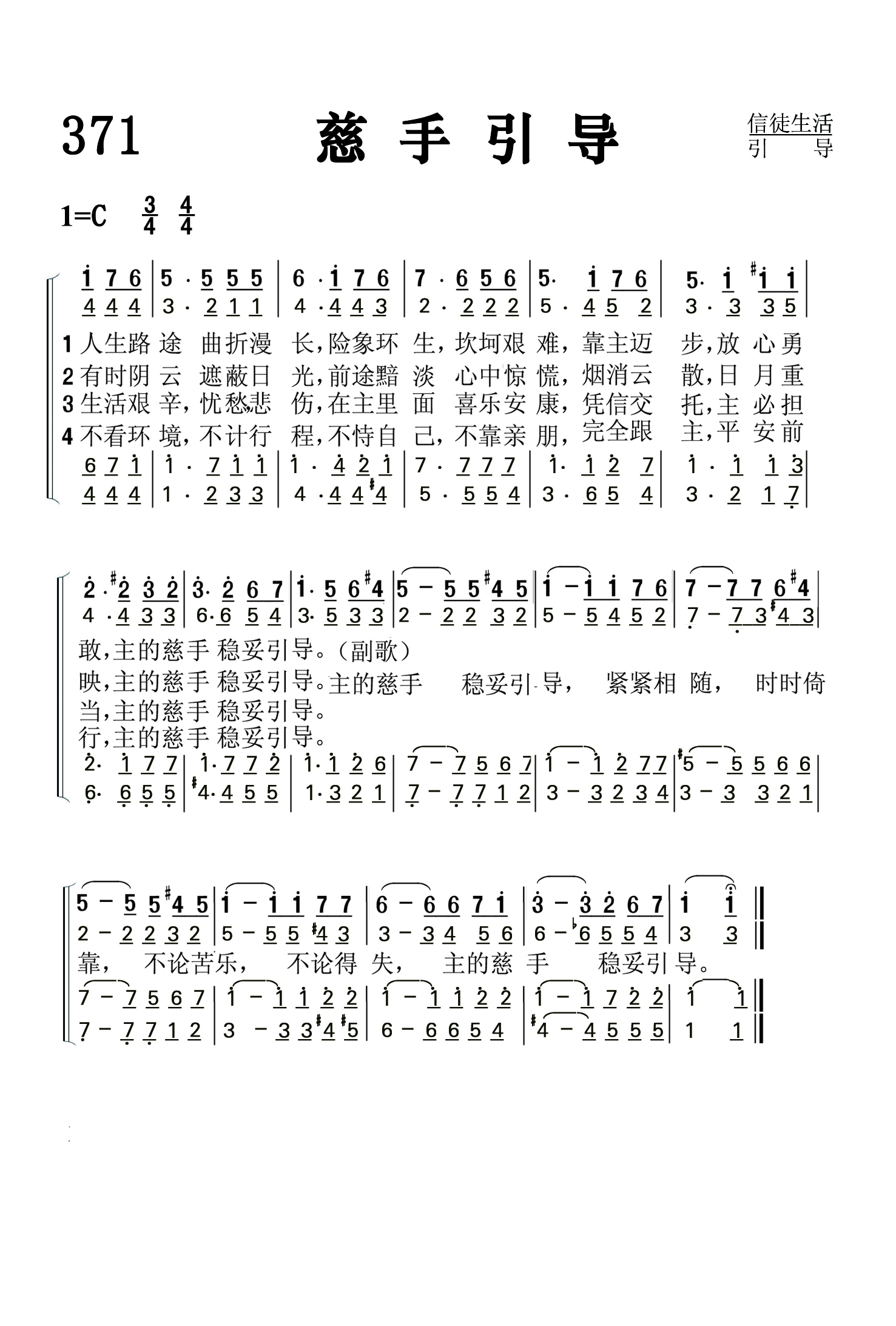 第371首 慈手引导(《颂赞圣诗》426首) The Guidance of Lord’s Gracious Hand 人生路途曲折漫长,险象环生,坎坷艰难, 靠主迈步,放心勇敢,主的慈手稳妥引导。 有时阴云遮蔽日光,前途黯淡心中惊慌, 烟消云散日月重映.主的慈手稳妥引导。 生活艰辛忧愁悲伤,在主里面喜乐安康, 凭信交托主必担当,主的慈手稳妥引导。 不看环境,不计行程.不恃自己不靠亲朋, 完全跟主平安前行,主的慈手稳妥引导。 主的慈手 稳妥引导,紧紧相随,时时倚靠, 不论苦乐,不论得失,主的慈手, 稳妥引导。 我们行走世路,危机四伏,布满陷阱。靠着自己的智慧和经验,我们不可能稳妥前进。只有把自己软弱无能的手,安放在主全能的圣手之中,我们才有安全和保障。这首诗歌向我们呈现了主引导我们的慈手,使我们对主有更坚强的信心。
