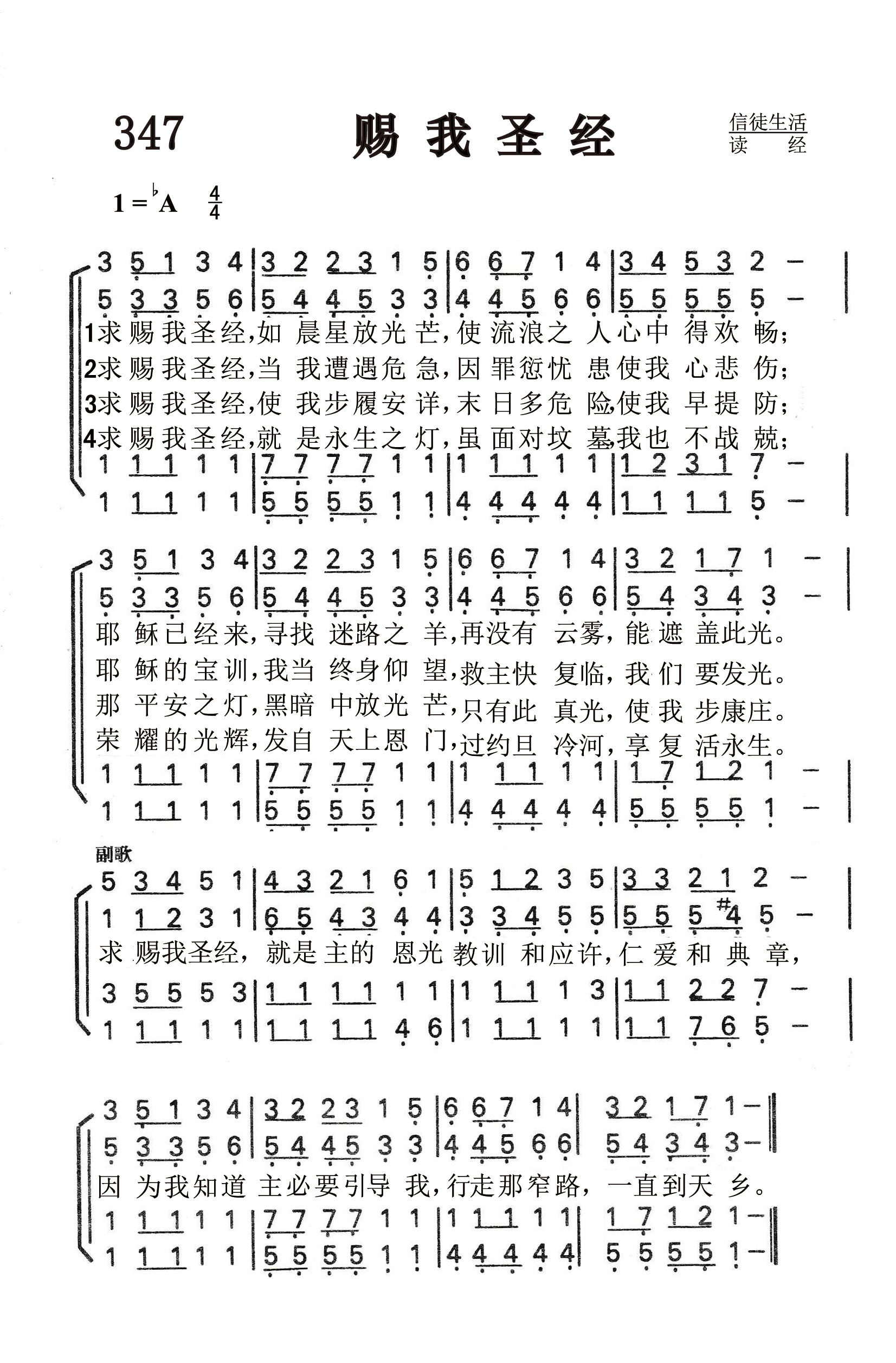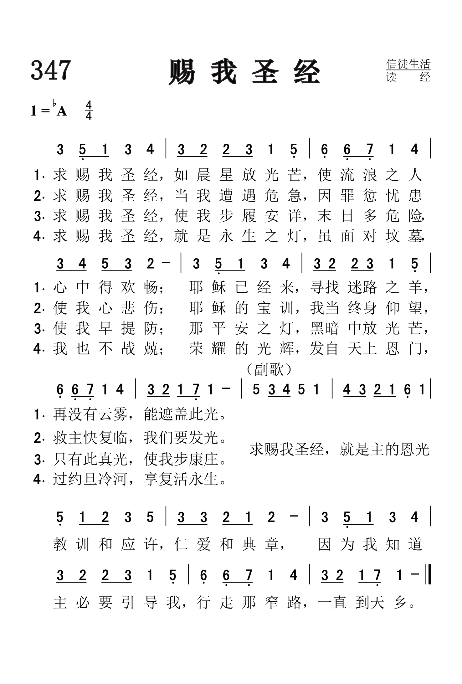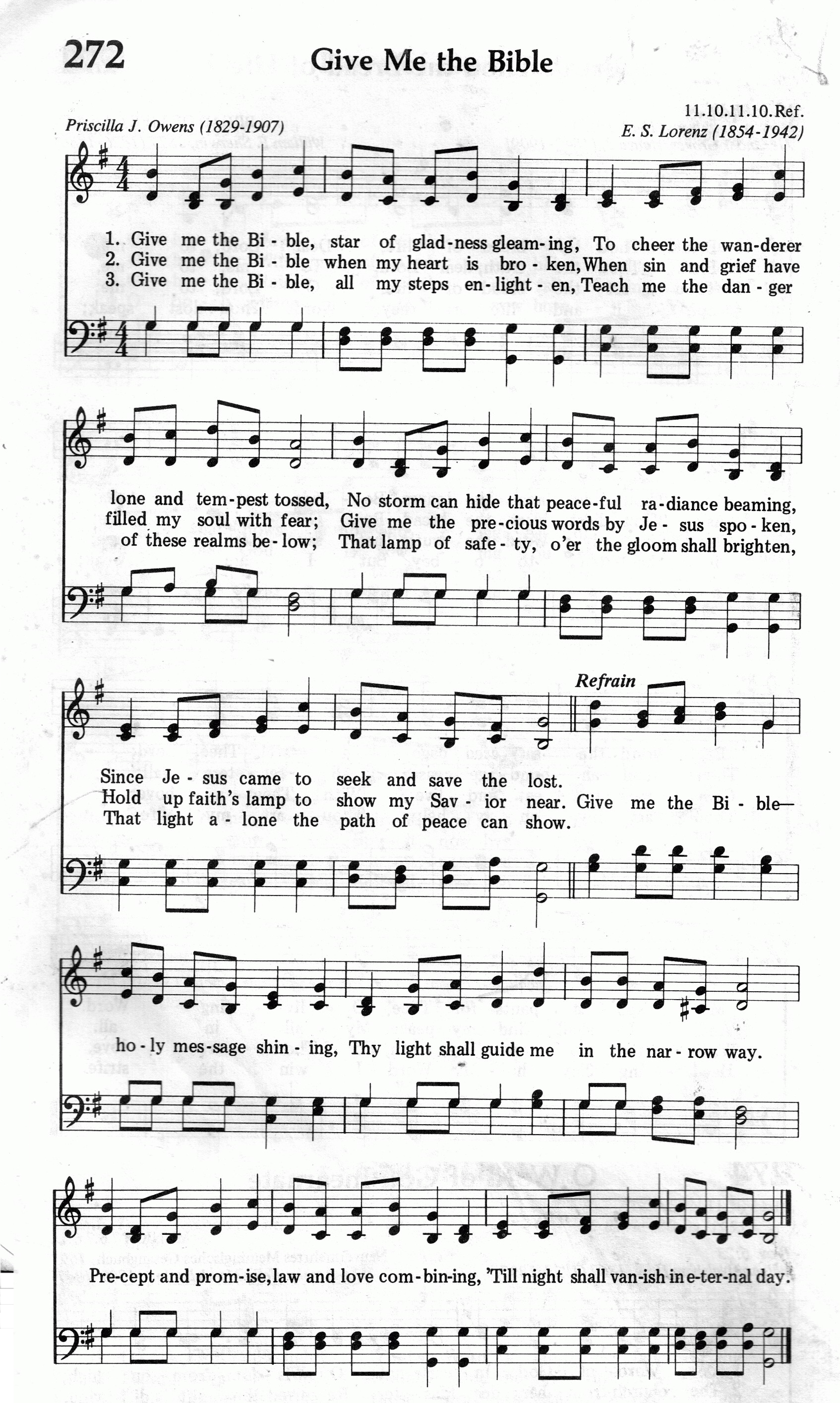 第347首 赐我圣书Give Me the Bible 欧文思(P.J.Owens,1829,7,21-1907,12,5)作词,洛伦茨(E.S.Lorenz,1854-1942)作曲 求赐我圣书,如晨星放光芒,使流浪之人心中得欢畅; 耶稣已经来寻找迷路的羊,再没有云雾能遮盖此光。 求赐我圣书,当我遭遇危急,因罪愆忧患,使我心悲伤; 耶稣的宝训,我当终身仰望,救主快复临,我们要发光。 求赐我圣书,使我步履安详,末日多危险,使我早提防; 那平安之灯,黑暗中放光芒,只有此真光,使我步康庄。 求赐我圣书,就是永生之灯,虽要入坟墓我也不战兢; 荣耀的光辉,发自天上恩门,过约旦冷河,享复活永生。 求踢我圣书,就是主的恩光.教训与应许,仁爱和典章, 因为我知道主必要引导我,行走那窄路,一直到天乡。 词作者欧文斯是美国卫理会的热心女信徒。她自中学毕业后,在美国马里兰州巴尔的摩市中学担任教员,辛勤地从事教育工作四十九年,业余时间则在该地的卫理公会教堂担任义工。她终身未曾离开过巴尔的摩市,但她所写的圣诗却不胫而走,流传到世界各地,深入信徒心灵。她所写的圣诗和散文主要是为教会使用,曾在卫理公会所发行的教会杂志上发表。 《赐我圣书》这首美丽的诗歌向我们指出圣书“如晨星放光芒。”在人生的道路上“再没有云雾能遮盖此光。”求主“在我危急之时”赐我们宝贵的上帝圣言,使我们终生仰望主的训诲和主的来临,即使面对死亡冷河也无所畏惧。诗歌的副歌尤其经典,是全诗主题的最好总结。 第166首《至宝佳音》和532首《抛碇于灵磐》也是欧文思作词的。 曲作者洛伦茨在学生时代就显示出非凡的编辑才能。他从耶鲁大学毕业以后,就开始从事教会音乐的出版工作。1890年,他创办了洛伦茨出版公司,不断地为各地教会提供赞美诗歌。第73首《主名流芳》,191首《蒙召赴筵》和《赞美诗》(505版)第210首《圣洁喜乐》也是洛伦茨作曲的。