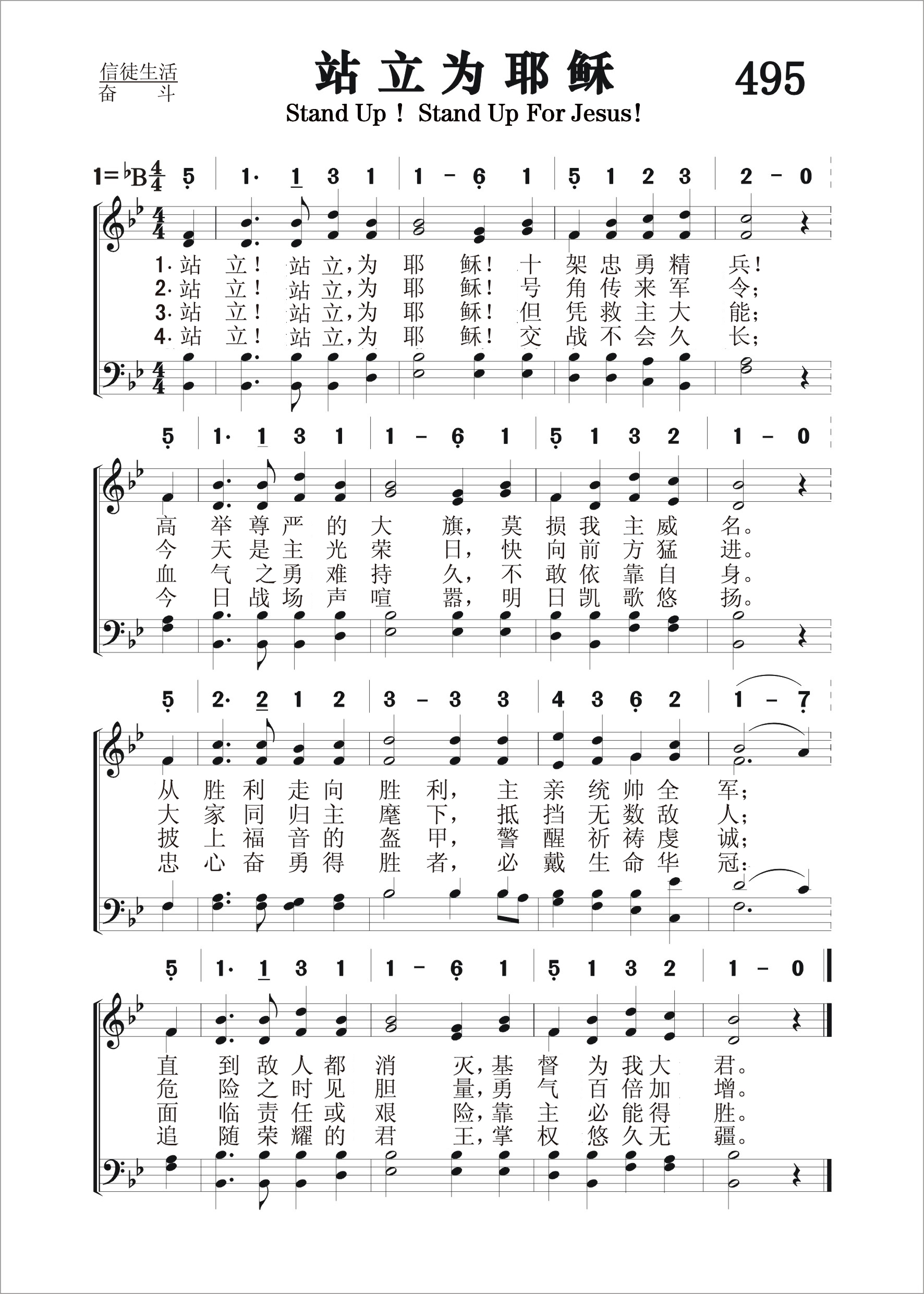 第495首 站立为耶稣Stand Up !Stand Up for Jesus! 达菲尔德(G.Duffield,1818,9,12-1888,7,6)作词(1858年),韦布(G.J.Webb,1803,6,24-1887,10,7)作曲(1837年)。,刘廷芳原译(1934年) 站立,站立为耶稣!十架忠勇精兵! 高举尊严的大旗,莫损我主威名。 从胜利走向胜利,主亲统帅全军; 直到敌人都消灭,基督为我大君。 站立,站立为耶稣!号角传来军令; 今天是主光荣日,快向前方猛进。 大家同归主麾下,抵挡无数敌人; 危险之时见胆量,勇气百倍加增。 站立,站立为耶稣!但凭救主大能; 血气之勇难持久,不敢依靠自身。 披上福音的盔甲,警醒祈祷虔诚; 面临责任或艰险,靠主必能得胜。 站立,站立为耶稣!交战不会久长; 今日战场声喧嚣,明日凯歌悠扬。 忠心奋勇得胜者,必戴生命华冠: 追随荣耀的君王,掌权悠久无疆。 “我们争战的兵器,本不是属血气的,乃是在上帝面前有能力,可以攻破坚固的营垒”(林后10:4)。 这首庄严雄峻,激昂感人的基督徒战歌,原是为纪念一位英年早逝的基督教牧师而作的。这位年青的圣公会牧师名叫丁达礼(Dudley A Tyng),在美国南北战争的前夕,曾为反对罪恶的蓄奴制度,倡导解放黑奴而大声疾呼。1858年3月,他在费城基督教青年会作长篇演讲,以圣书中“你们这壮年人去事奉耶和华吧!”为主题,号召人们起来为正义的事业而斗争。当年4月,丁达礼遭遇意外,手臂被打谷机卷进碾伤,医治无效,骤然去世。临终时留下了“去告诉他们要为耶稣而站立”的遗言。几天以后,他的同工达菲尔德在一次聚会的上引述《以弗所书》第六章有关基徒精兵的经文,追忆丁达礼的生平,并以自己根据丁达礼的遗言而写的《站立为耶稣》作为讲道的结束。 乔治. 达菲尔德出身牧师世家,耶鲁大学毕业后秉承父志,进协和神学院专攻神学,历任长老会好几所教堂的牧师。 本诗所采用的曲调原为韦布所写的非宗教歌曲《破晓,百灵鸟在歌唱》,经布雷德伯里于1861年配上本诗,遂在教会中迅速传唱开来。 韦布出生于英国农民家庭,自幼却受过良好的音乐教育,曾任教会司琴。27岁移民美国,定居波士顿,与著名宗教音乐家梅森结为好友,积极参加各项音乐活动。1833年,他与梅森合作创办波士顿音乐学院,并亲自任教。1840年任亨德尔与海顿协会会长,协助梅森举办音乐培训班,培养音乐人才。他一生谱写了许多赞美诗。鲁特和布雷德伯里都是他的学生。