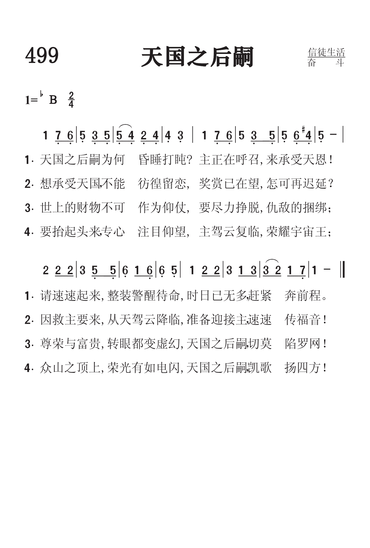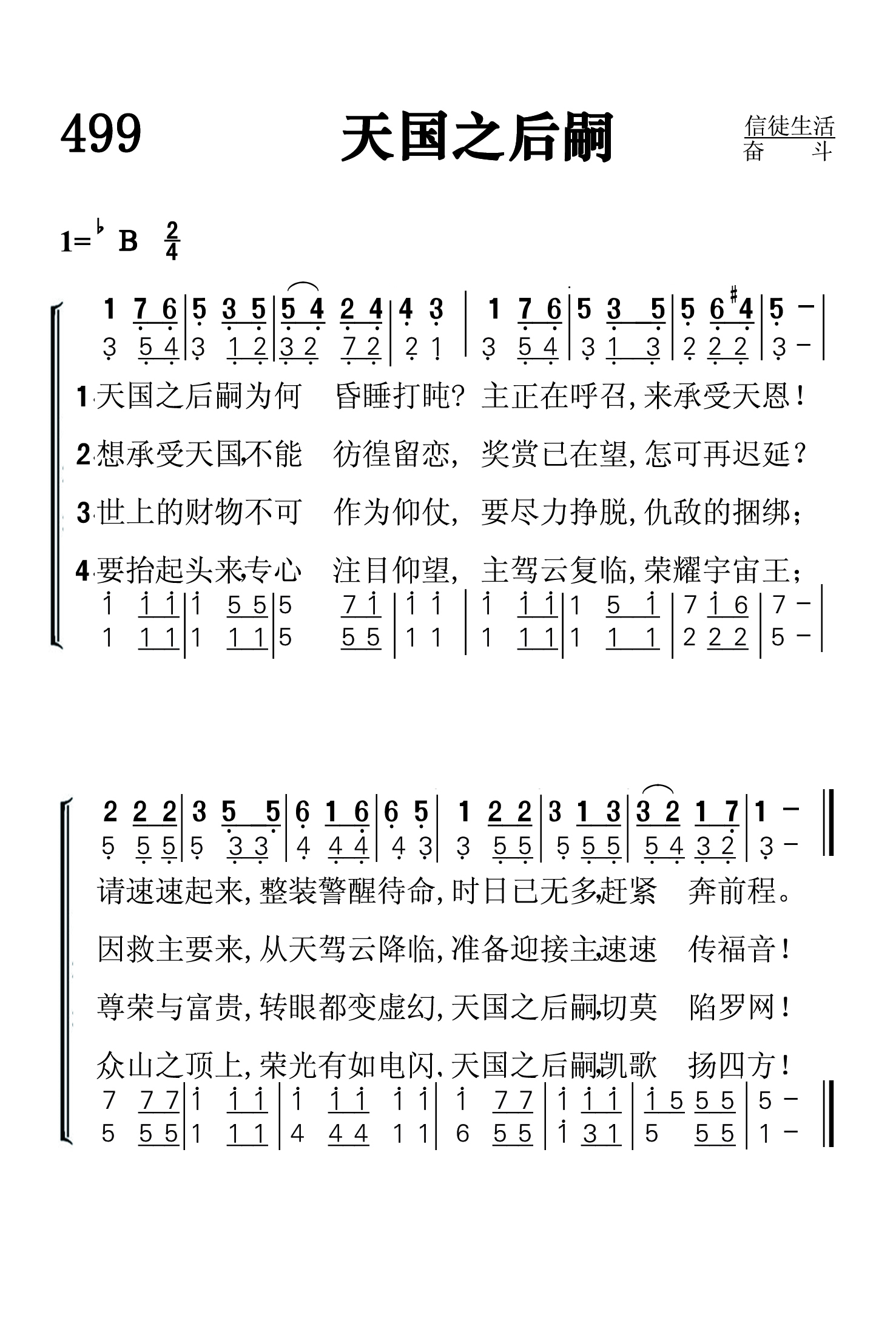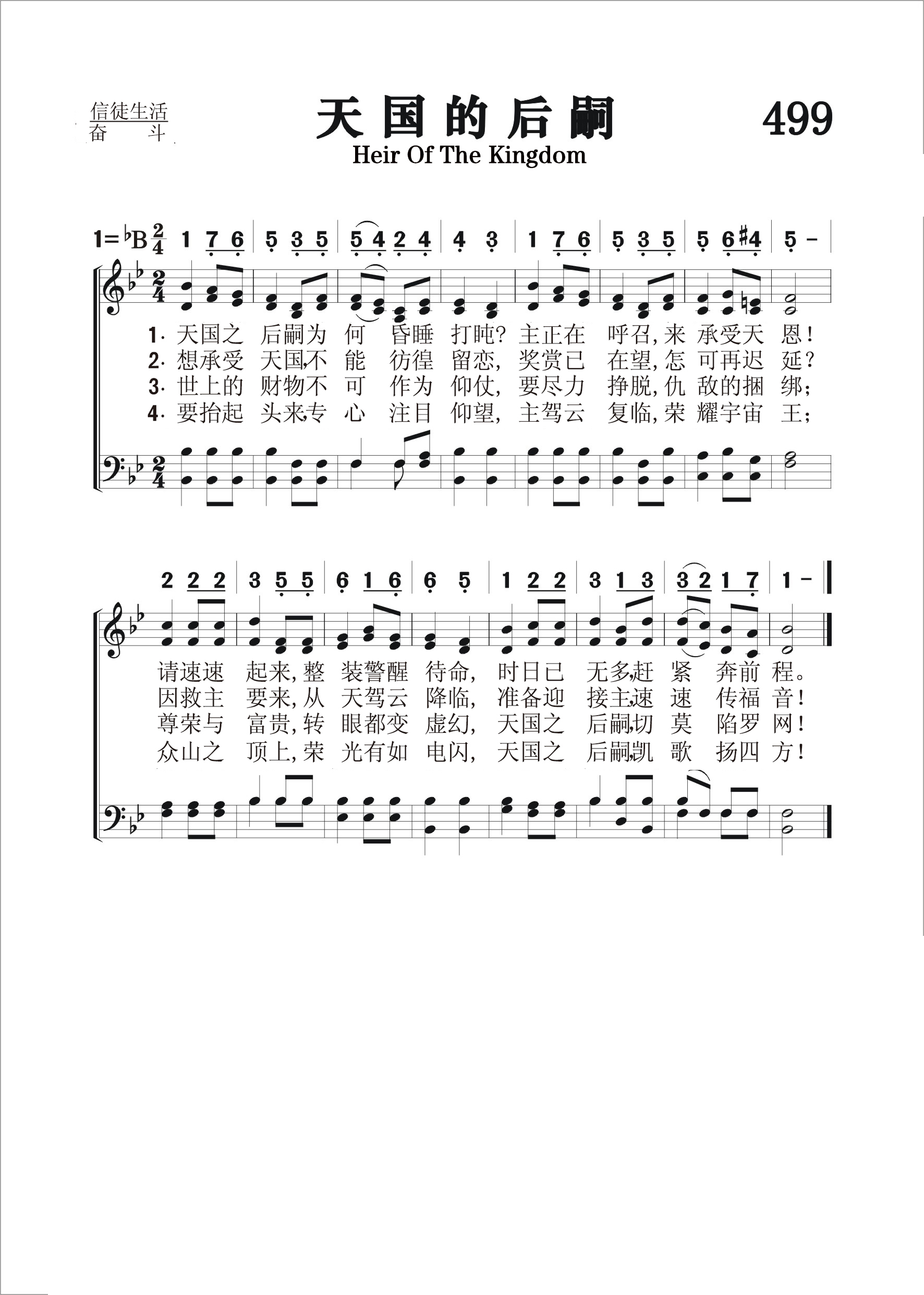 第499首 天国之后嗣Heir of the Kingdom 词作者佚名,梅森(Lowell Mason,1792,7,8-1872,8,11)作曲 天国之后嗣为何昏睡打盹主正在呼召来承受天恩! 请速速起来整装待命警醒,时日已无多赶紧奔前程。 想承受天国不能彷徨留恋,奖赏已在望怎可再迟延 因救主从天而来驾云降临,准备迎接主速速传福音! 世上的财物不可作为仰仗,要尽力挣脱仇敌的捆绑。 尊荣与富贵转眼都变虚幻,天国的后嗣慎勿陷罗网! 要抬起头来专心注目仰望,主驾云复临荣任宇宙王。 众山峰顶上荣光有如电闪,天国的后嗣凯歌扬四方! 这首诗歌在一开始就提醒我们作为天国后嗣的光荣身份,呼吁我们警醒起来,振作待命,努力奔跑天国的路程。诗歌劝勉我们不要贪恋世俗的财富,而当仰慕那极重无比的奖赏,挣脱仇敌的缠累,注目大君基督的威严和荣耀。 本诗配上梅森的曲调以后,主题更加鲜明,艺术感染力更强。 圣乐音乐家梅森出生于美国马萨诸塞州的梅德菲尔德。幼年在校时就喜欢音乐,16岁时已成了乡村教堂唱诗的指挥。1812年迁居乔治亚州,在一家银行当办事员,同时在长老会礼拜堂任管风琴师及唱诗班指挥,并开始学习和声学和作曲。他自编了一本《圣乐曲调集》,送到好几家印刷长和出版社去,虽然讲明不要稿费,也没有一家肯承印。后经波士顿亨德尔.海顿音乐社出资代印,结果销路之广,出人意料,大大鼓舞了梅森,使他决定以音乐为他的终生事业。1827年他迁居波士顿,当选为亨德尔及海顿学会主席,并任教堂唱诗班指挥十四年。1829年编辑出版了第一本《儿童赞美诗》。他为了培养训练儿童唱诗,创办成立波士顿音乐学院,专门训练儿童唱歌。1834年又在音乐学院内成立了培训儿童音乐的教师培训班。他还负责出版音乐杂志,编辑出版了80多种诗歌集,创作诗歌曲谱1126首,改编496首,对提高美国的音乐水平,改善教会圣乐方作出突出贡献,为19世纪美国音乐界最有影响的人物。1835年纽约大学授予他第一位音乐博士学位,以表钦仰。