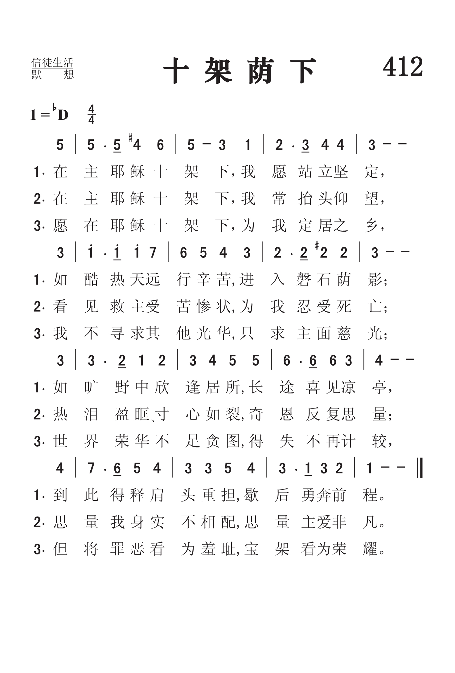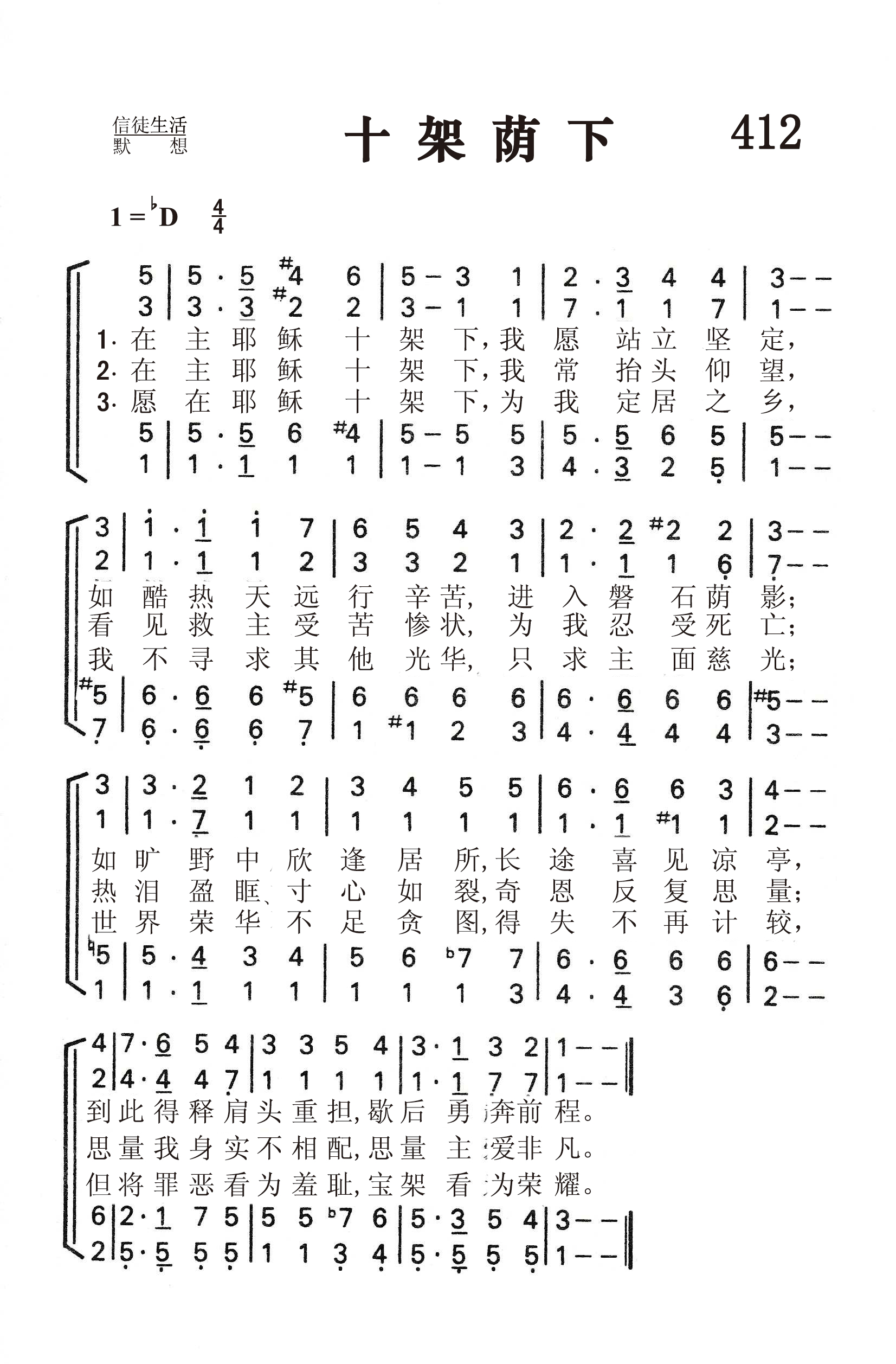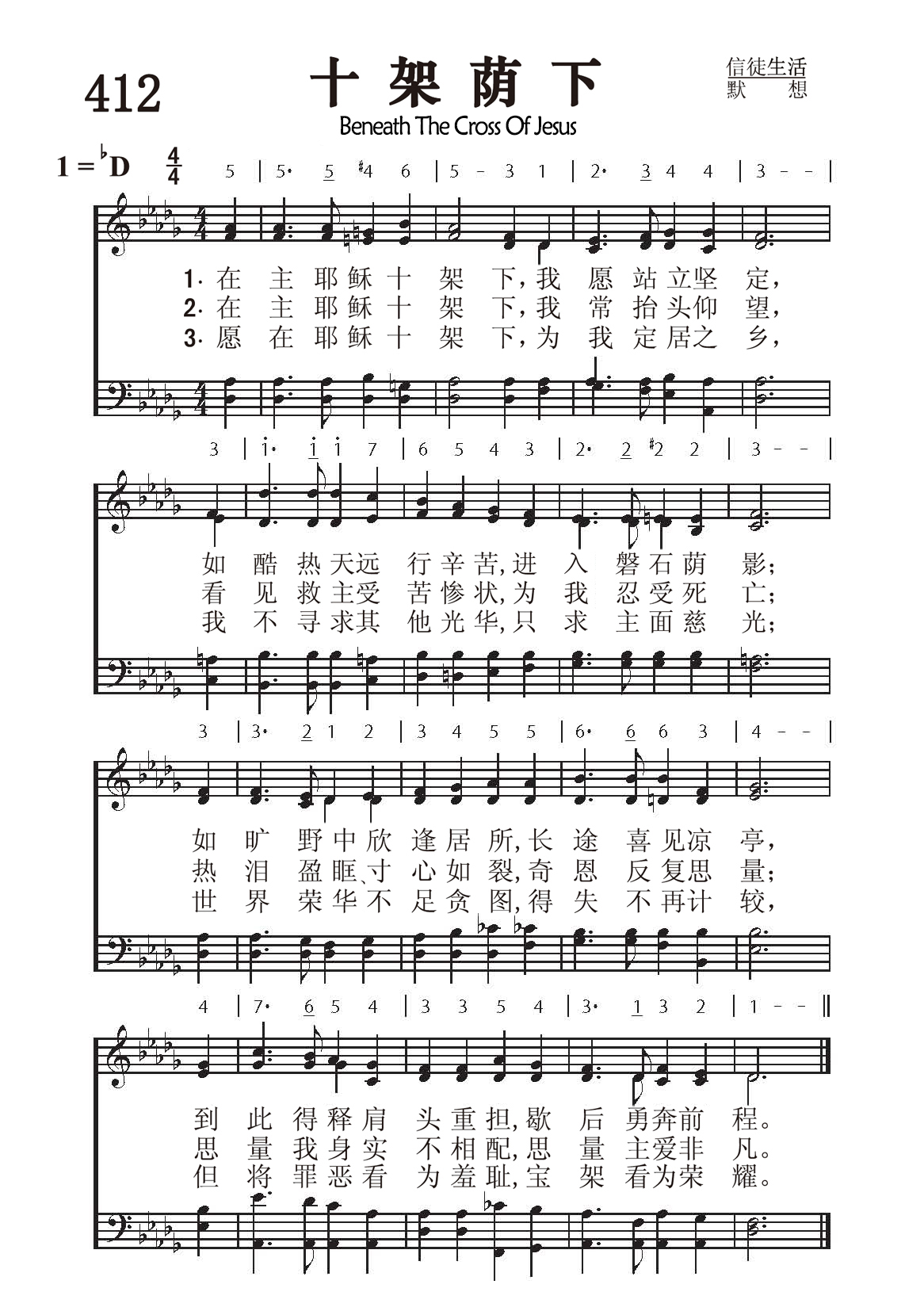第412首十架荫下Beneath the Cross of Jesus (《赞美诗》506版第395首) 克雷芬(Elizabeth.Clephane.1830,6,18-1869,2,19)作词(1872年),梅克(Frederick C.Maker,1844-1927)作曲(1881年),赵典仁、吴涤申合译 在主耶稣十架下,我愿站立坚定, 如酷热天远行辛苦,进入磐石荫影; 如旷野中欣逢居所,长途喜见凉亭, 到此得释肩头重担,歇后勇奔前程。 在主耶稣十架下,我常抬头仰望, 看见救主受苦惨状,为我忍受死亡; 热泪盈眶\寸心如裂,奇恩反复思量; 思量我身实不相配,思量主爱非凡。 愿在耶稣十架下,为我定居之乡, 我不寻求其他光华,只求主面慈光; 世界荣华不足贪图,得失不再计较, 但将罪恶看为羞耻,宝架看为荣耀。 词作者克雷芬出生于英国爱丁堡。在一个僻静的农村长大。她从小爱主,在本地贫穷人中常助人为乐,很讨人喜欢,大家称她为“和暖的春光”。她想象力丰富,为人温柔大方,她的妹妹也与她很同心。她曾至少创作过8首赞美诗,其中最著名的是《赞美诗》505版第486首《主寻亡羊》和本诗。一八六九年,她因病离世,年仅39岁。 曲作者梅克出生于英国布里斯托尔,是圣公会的信徒。他自幼参加圣诗班,后担任公理会教堂琴师达28年。他还兼任当地音乐学院客席教授和教会联合会圣乐指挥,曾创作了若干大型乐曲,教会乐章,钢琴曲和康塔塔《摩西在荆棘丛中》。他虽然从未离开过布里斯托尔,却因他的音乐而名扬四海。《赞美诗》506版348首《亲爱之主》(1887年)和505版第33首《日光普照》(1867年)也是梅克作曲的。
