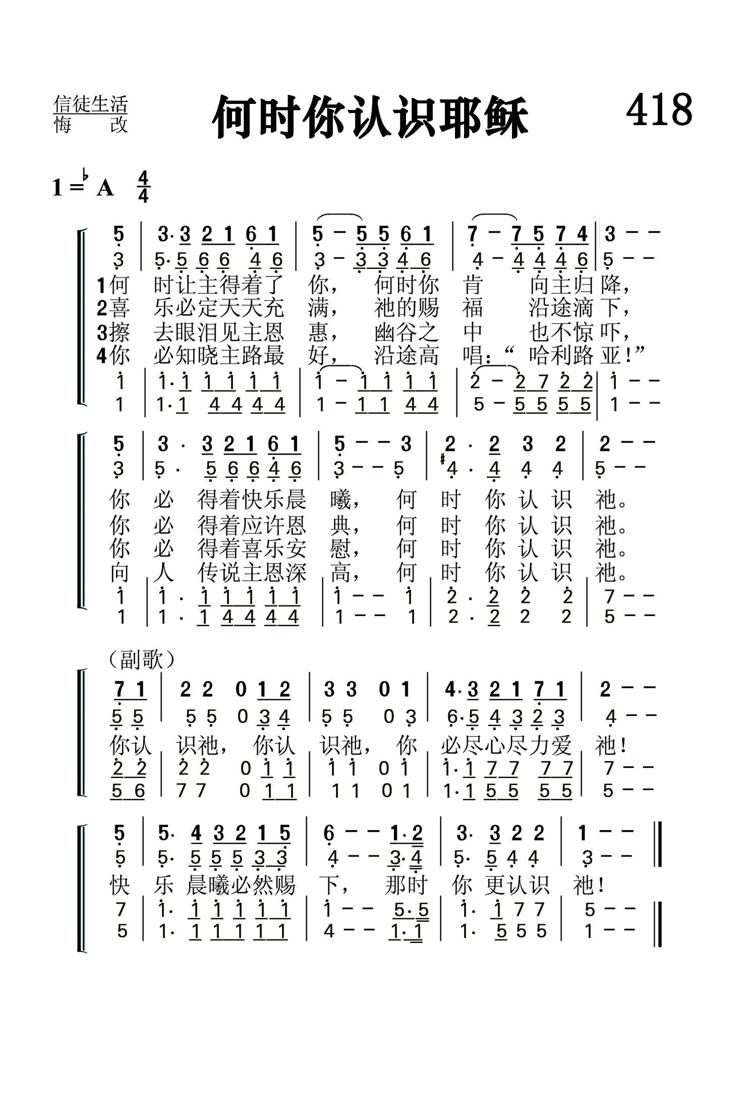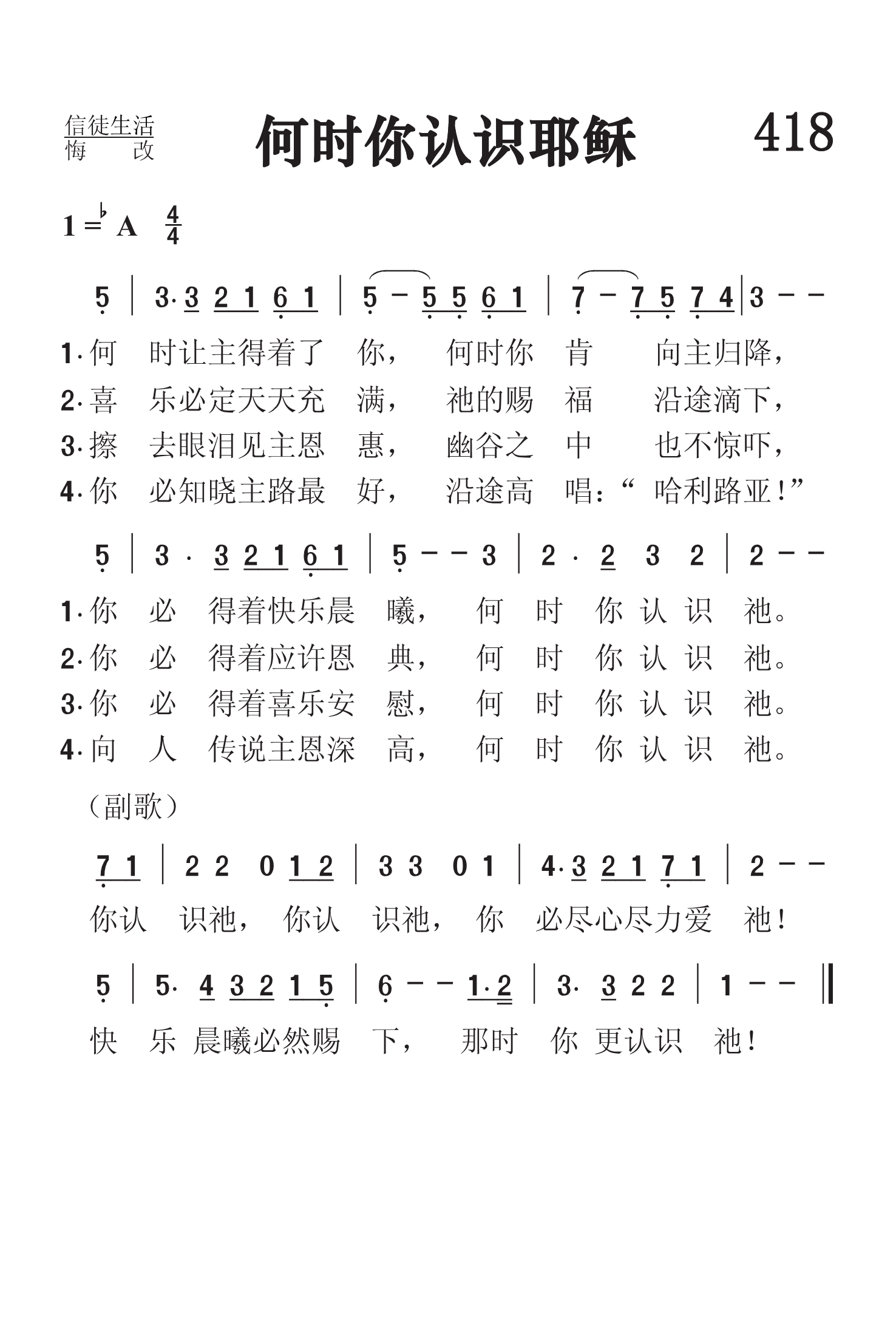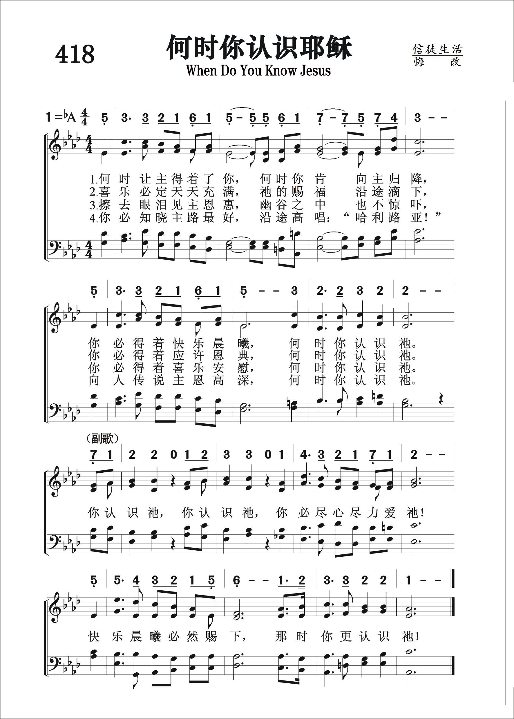 第418首 何时你认识耶稣 When Do You Know Jesus 《颂赞圣诗》363首 何时让主得着了你,何时你肯向主归降, 你必得着快乐晨曦,何时你认识祂。 喜乐必定天天充满,祂的祝福沿途滴下, 你必得着应许恩典,何时你认识祂。 擦去眼泪见主恩惠,幽谷之中也不惊吓, 你必得着喜乐安慰,何时你认识祂。 你必知晓主路最好,沿途高唱:“哈利路亚!” 向人传说主恩高深,何时你认识祂。 你认识祂.你认识祂,你必尽心尽力爱祂! 快乐晨曦必然赐下,那时你更认识祂! 当上帝把基督的爱启示在我们心里的时候,我们对主耶稣就有了真正的认识。我们会被祂的慈爱和荣美所胜,将自己完全向祂归降。这首诗歌颂赞了认识耶稣多带来的丰盛福气。我们会恩上加恩,光中见光。