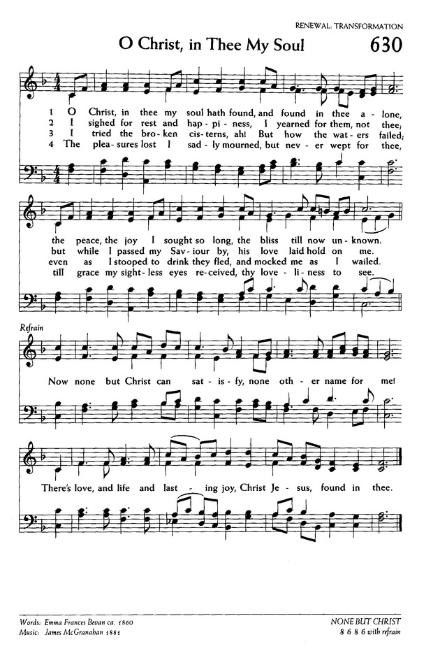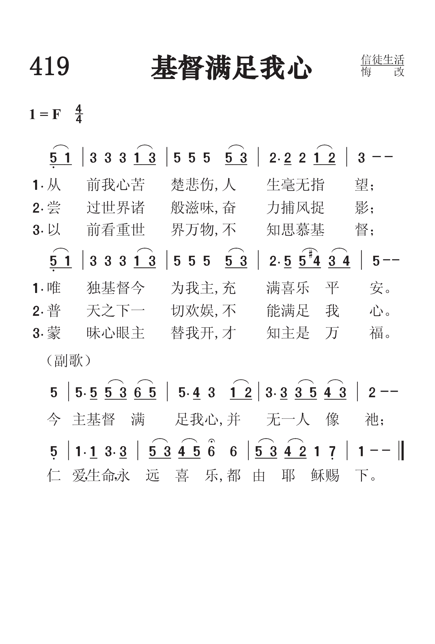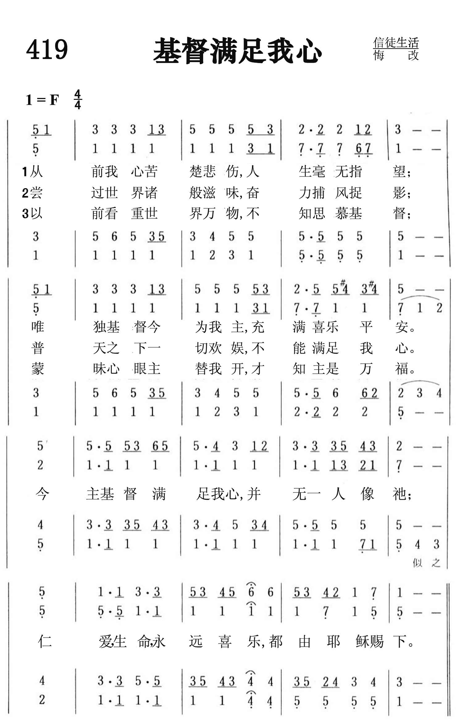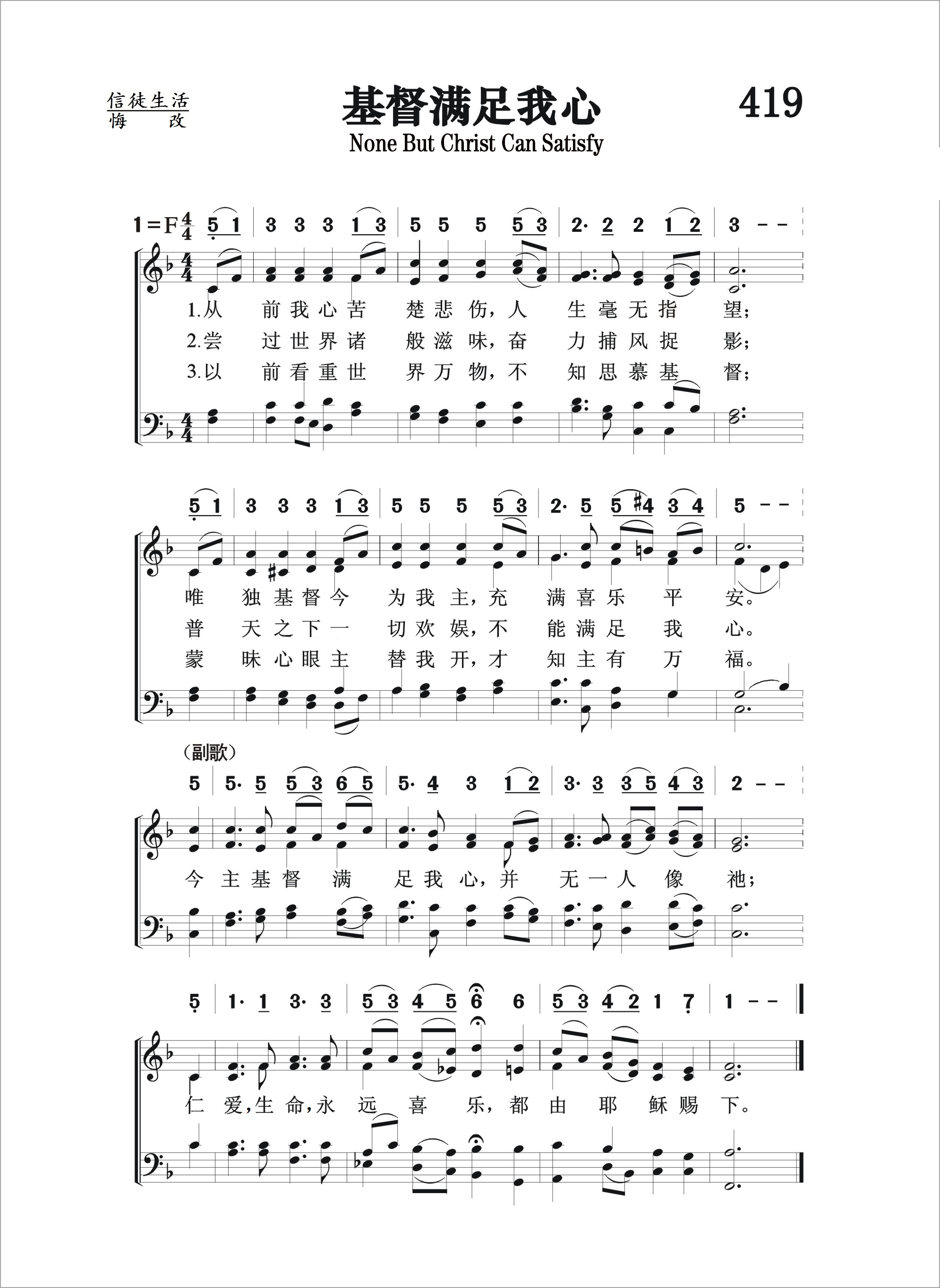 第419首 基督满足我心None but Christ Can Satisfy 词作者佚名,曲作者为麦格雷纳汉(James McGranahan,1840,7,4-1907,7,9) 从前我心苦楚悲伤,人生毫无指望; 唯独基督今为我主,充满喜乐平安。 尝过世界诸般滋味,奋力捕风捉影; 普天之下一切欢娱。不能满足我心。 以前看重世界万物,不知思慕基督; 蒙昧心眼主替我开,才知主有万福。 今主基督满足我心,并无一人像祂; 仁爱、生命、永远喜乐,都由耶稣赐下。 曲作者麦格雷纳汉出生于美国的一个农民家庭,所受的正式教育很有限,却靠自己的努力和爱好,使他在19岁时就出任音乐教师。以后他到纽约州布雷德伯里所办的音乐学校短期学习,接着便参加福音布道团以歌声宣扬主名。1877年,福音歌唱家、作曲者布利斯突然去世,他便与诗人惠特尔合作,组织布道团,旅行美国各地并前往英国,担任唱诗班领唱,以他优美动听的男高音和亲切感人的魅力大获成功。他还首先组织完全是男声的唱诗班,曾与桑基,鲁特•斯特宾斯等人合编出版多本福音诗歌集,其中较有名的有《男声福音圣诗》二卷,《福音圣诗》等。他自己也写诗,如《颂赞诗歌》317首《信主得生命》。