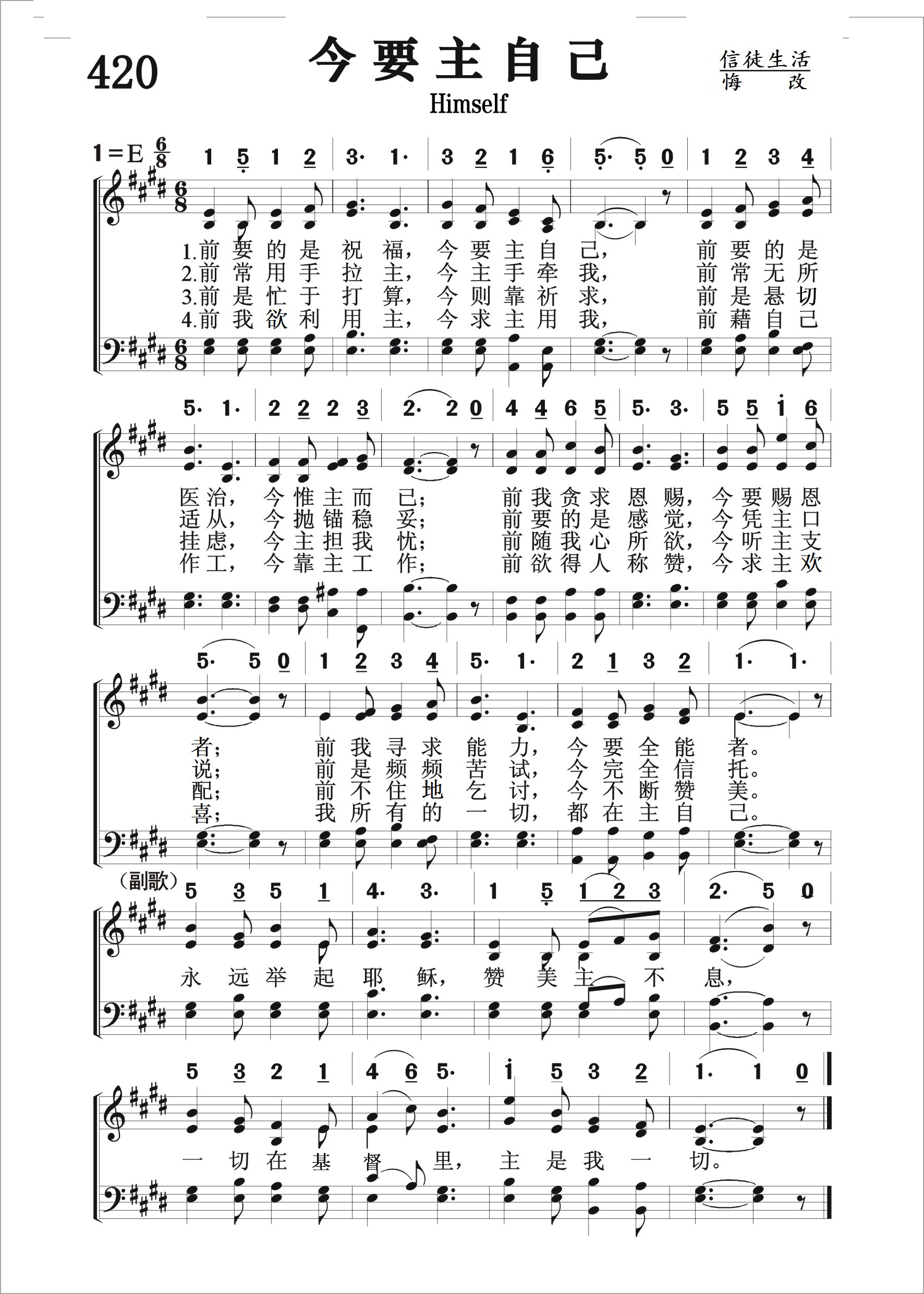第420首今要主自己Himself 辛普森(Albert B.Simpson,1843-1919)作词作曲 1前要的是祝福,今要主自己; 前要的是医治,今惟主而已; 前我贪求恩赐,今要赐恩者; 前我寻求能力,今要全能者。 前常用手拉主,今主手牵我; 前常无所适从,今抛锚稳妥; 前要的是感觉,今凭主口说; 前是频频苦试,今完全信托。 前是忙于打算,今则靠祈求; 前是悬心挂虑,今主担我忧; 前随我心所欲,今听主支配; 前不住的乞讨,今不断赞美。 前我想利用主,今求主用我; 前藉自己作工.今靠主工作; 前欲得人称赞,今求主喜欢; 我所有的一切,都在主自己。 永远举起耶稣,赞美主不息, 一切在耶稣里,主是我一切。 辛普森出生于英属小岛的一个牧师家庭。 他自幼体弱多病,对每晨要读经祷告,感到枯燥乏味。在他十四岁时,因长期受压力又勤学过度,神经系统受损,有生命之虞。 他知道自己尚未得救,因此十分害怕。有一天他在父亲的书房看《圣洁的福音奥秘》,其中有一段话为他开启了永生之门:“凡你们能作的第一件最好的事,就是相信主耶稣基督。不然,你所有的行为、祷告、眼泪以及一切的立志都是徒然的。相信主耶稣,就是信祂、照祂的话而行。 此时此地,祂说收留你、拯救你,因祂曾说过‘到我这里来的,我必不丢弃他。’”于是他跪下接受主,并且他的病也得医治。自此他确定蒙呼召,幼年所受的属灵教育,在他灵里茁长。 十七岁时开始讲道,以后他完全凭信心,靠奖学金读毕神学院。 1874的一个黑夜,辛普森感到十分孤单和痛苦。他再次把自己毫无保留地完全奉献。这是他生命中第二个转机。《今要主自己》就是他在那时写下的心声。这次的转机使他体会到什么才是真正的事奉,他的信念使他与许多人隔绝,也因而使他更孤单寂寞。1881年夏,辛普森参加慕迪的同工退修会,听到一位兄弟见证说:“我本想得着慕迪先生的帮助,但昨夜,我见到主耶稣,我定睛仰望祂,我感到今后一生,除主之外,别无他求。”这些话深深感动他。 回家后,他跪在主前,直到主充满他心,他感谢地说:“我已经看见主了,我心得喜乐平安满足,一切得供应,主是我一切。”这是他生命中第三个转机。 他辞去优薪的教会牧师之职,成立宣道会(Christian and Missionary Alliance),在美国、加拿大平民中传福音。 1897年,他动员北美洲的宣教士往普天下传主福音。辛普森写有九千多首诗,但未全部谱曲。我们熟悉的有《惟独耶稣》(Jesus Only),《到遥远地方》(The Regions Beyond)和《耶稣不改变》(Yesterday, Today, Forever)等。