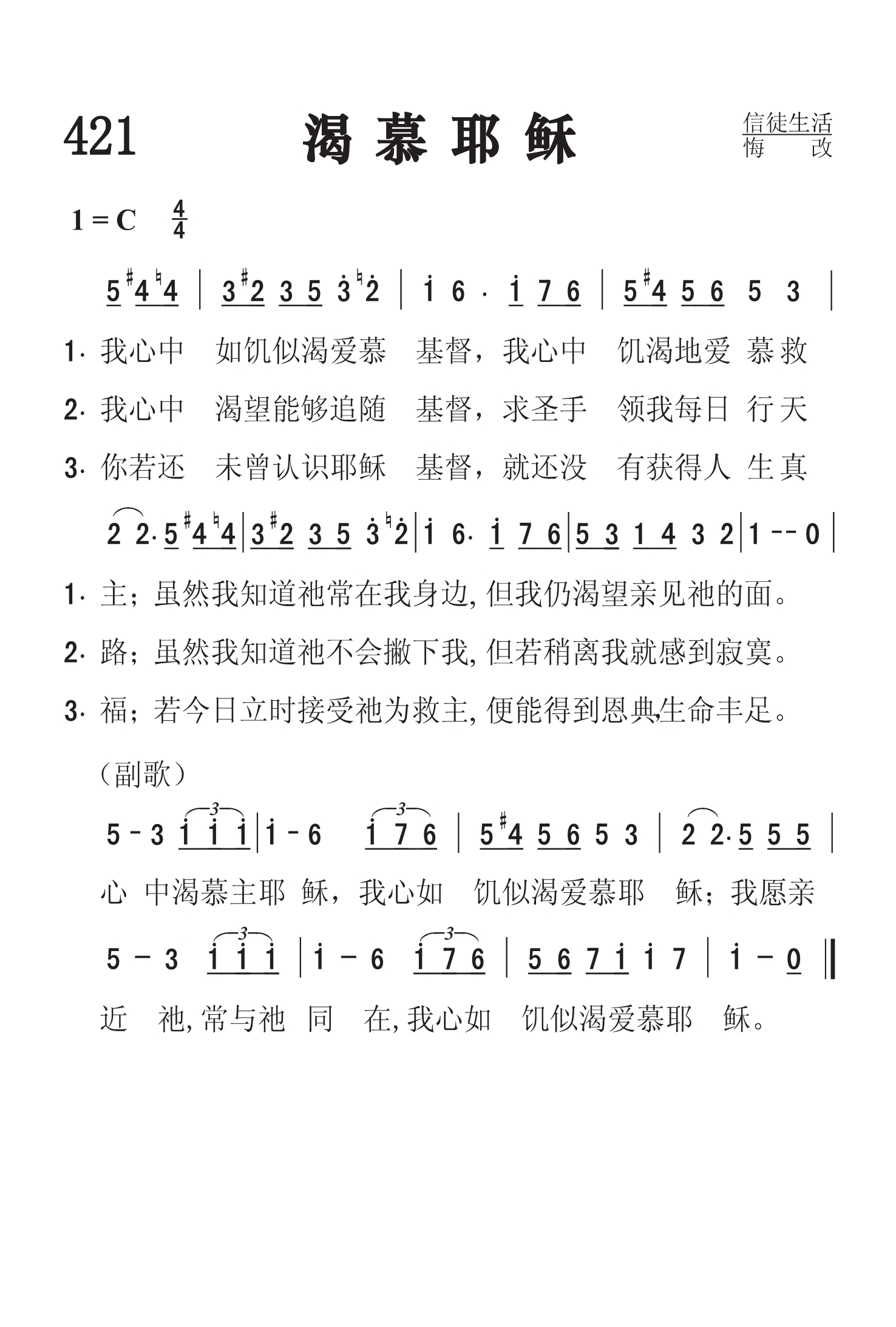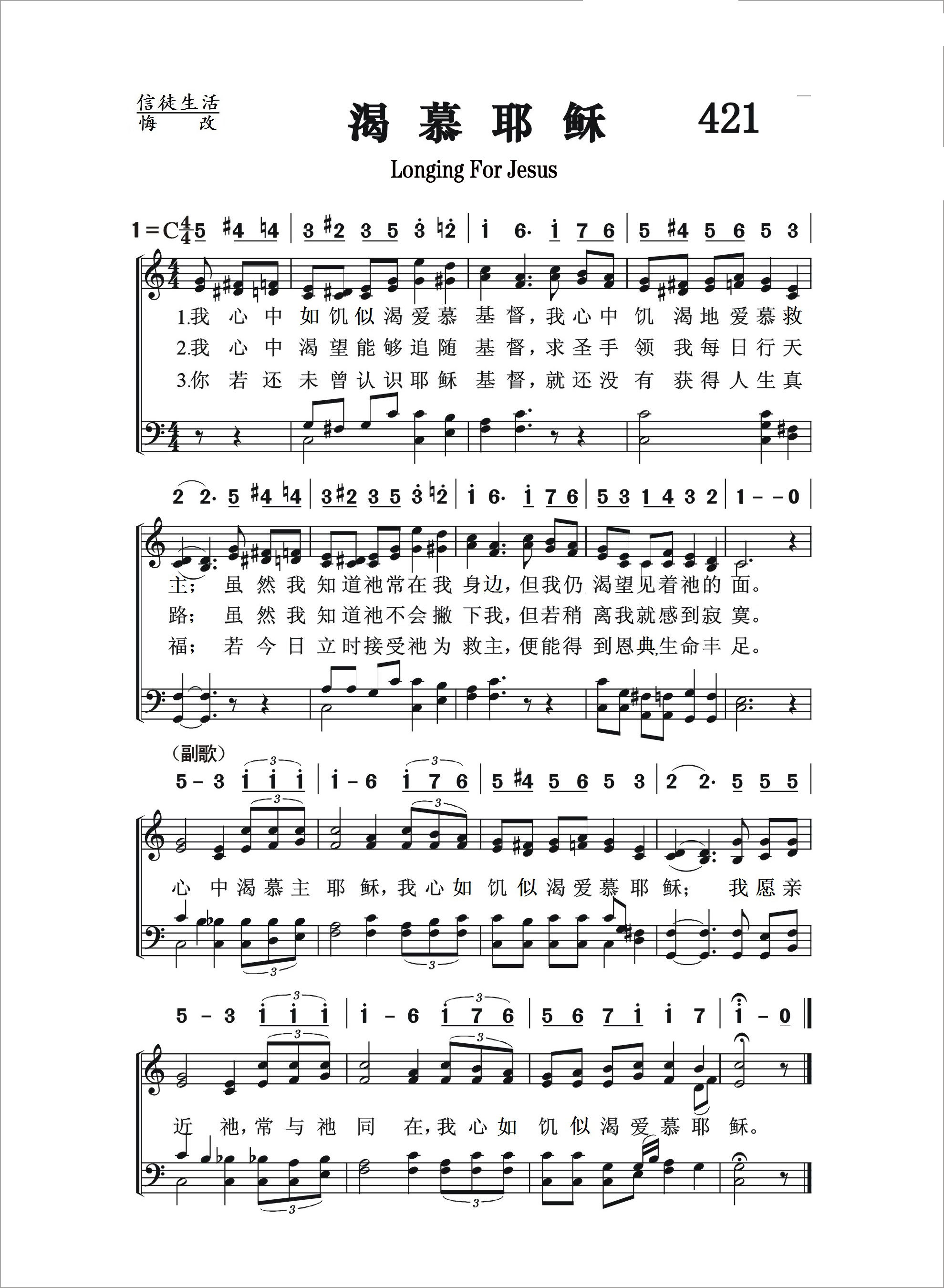 第421首 渴慕耶稣Longing for Jesus 理查德.贝克(Richard D.Paker,1927-2012)作词作曲 我心中饥渴地爱慕主耶稣,我心中饥渴地爱慕耶稣, 虽然我知道祂常在我身旁,我仍要渴望见着祂的面。 我心中渴望能够追随耶稣,求圣手领我每日行天路, 虽然我知道祂不会撇下我.但若稍离我就感到寂寞。 你若还未曾认识基督耶稣,就还没有获得人生真福, 若今日立时接受祂为救主,便能得到主恩生命丰足。 心中渴慕主耶稣,我心如饥似渴爱慕耶稣; 但求亲近祂,常与祂同在,我心如饥私渴爱慕耶稣。 理查德.贝克是美國德克萨斯州人,先後就读於贝勒大学(Baylor University)及浸信会西南神学院。毕业後出任德克萨斯州福和市浸信会的音乐主任。 六年後,他转向音乐布道的事工达十八年之久。 他在浸信會全國大會中擔任獨唱,負責音樂事工,也在葛理翰佈道大會上獻唱。贝克的兄弟贝博是布道家,他們常相偕在世界各地布道。 他也录制唱片,一共作了一百多首歌。 他曾是德克萨斯州一家音乐出版社的副总裁。