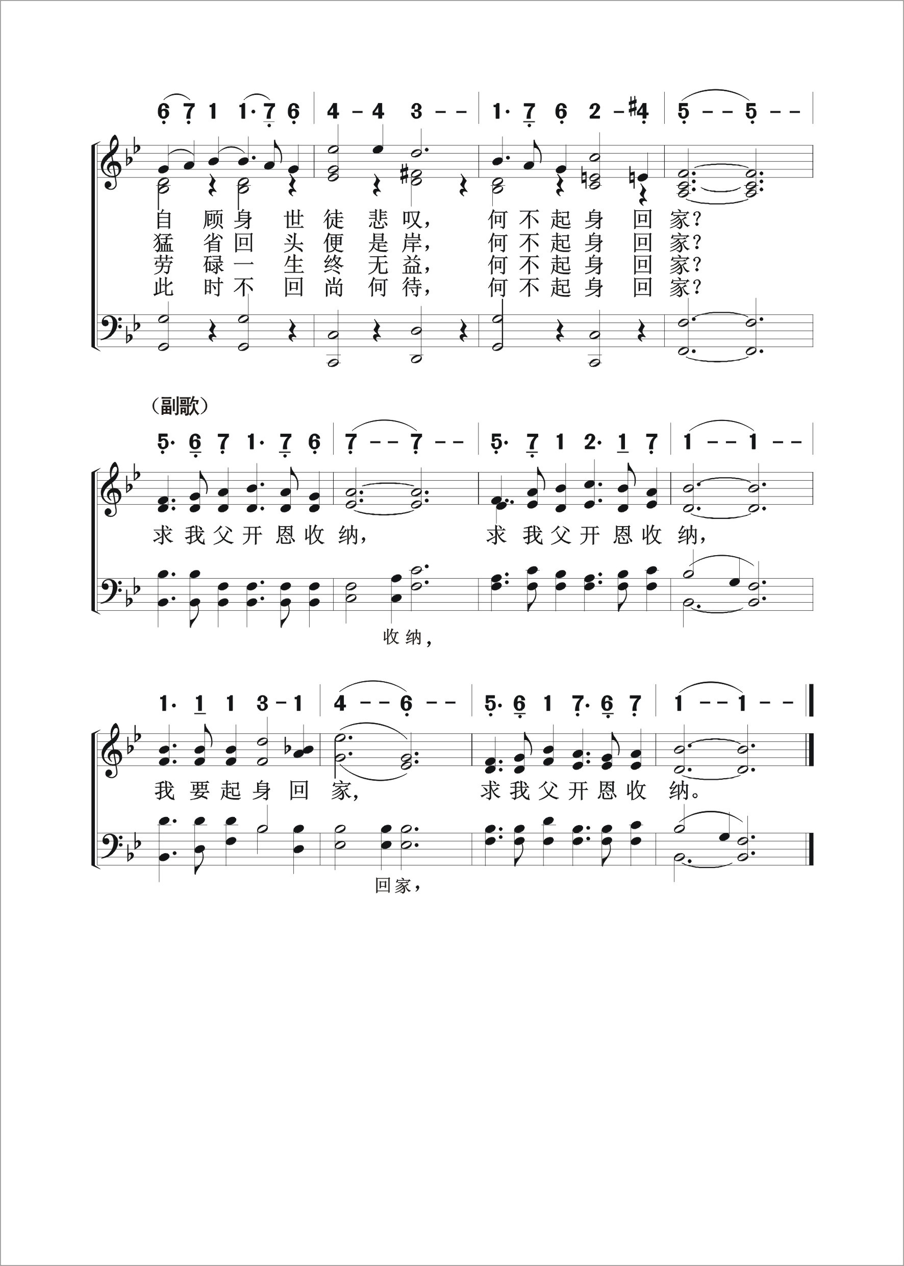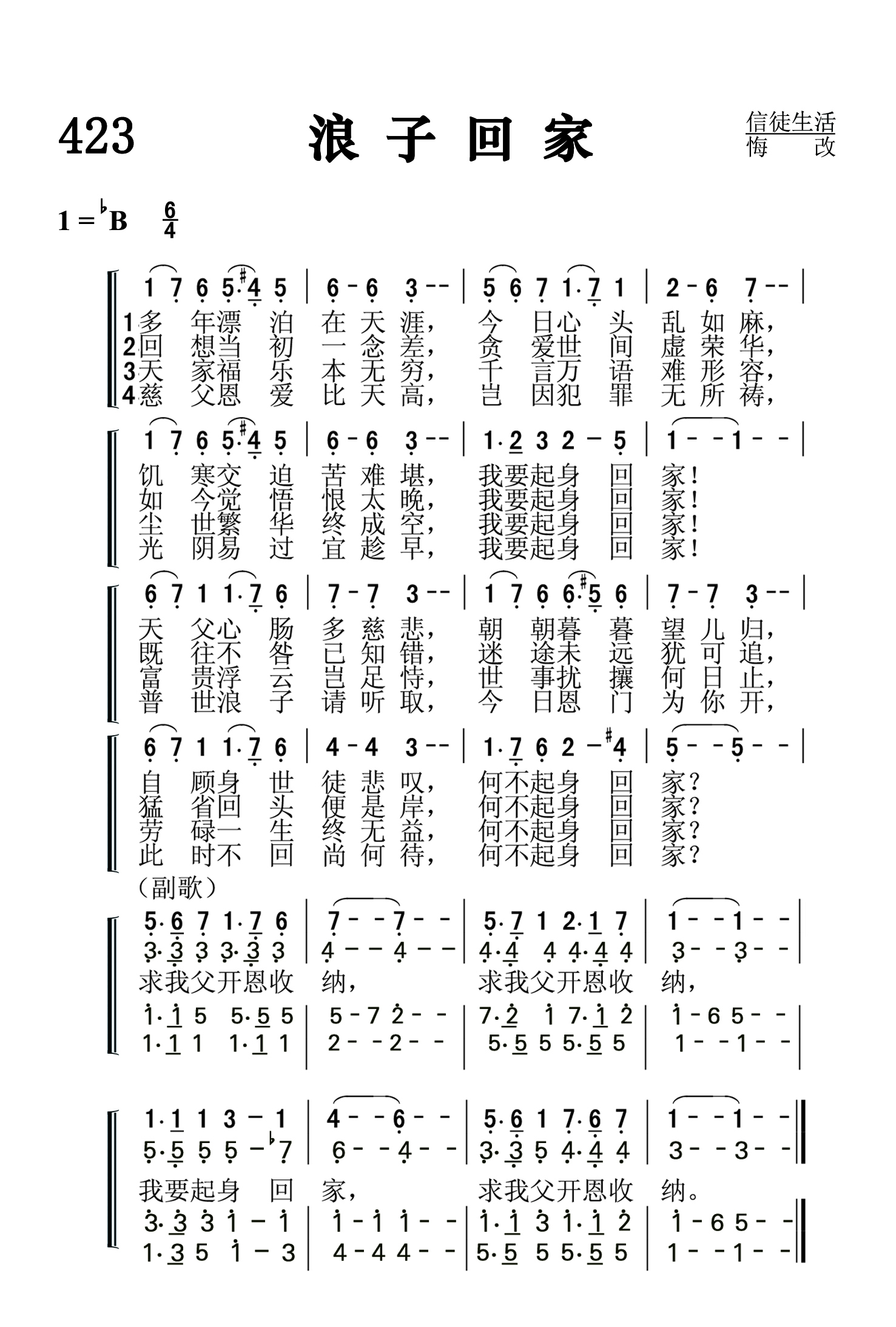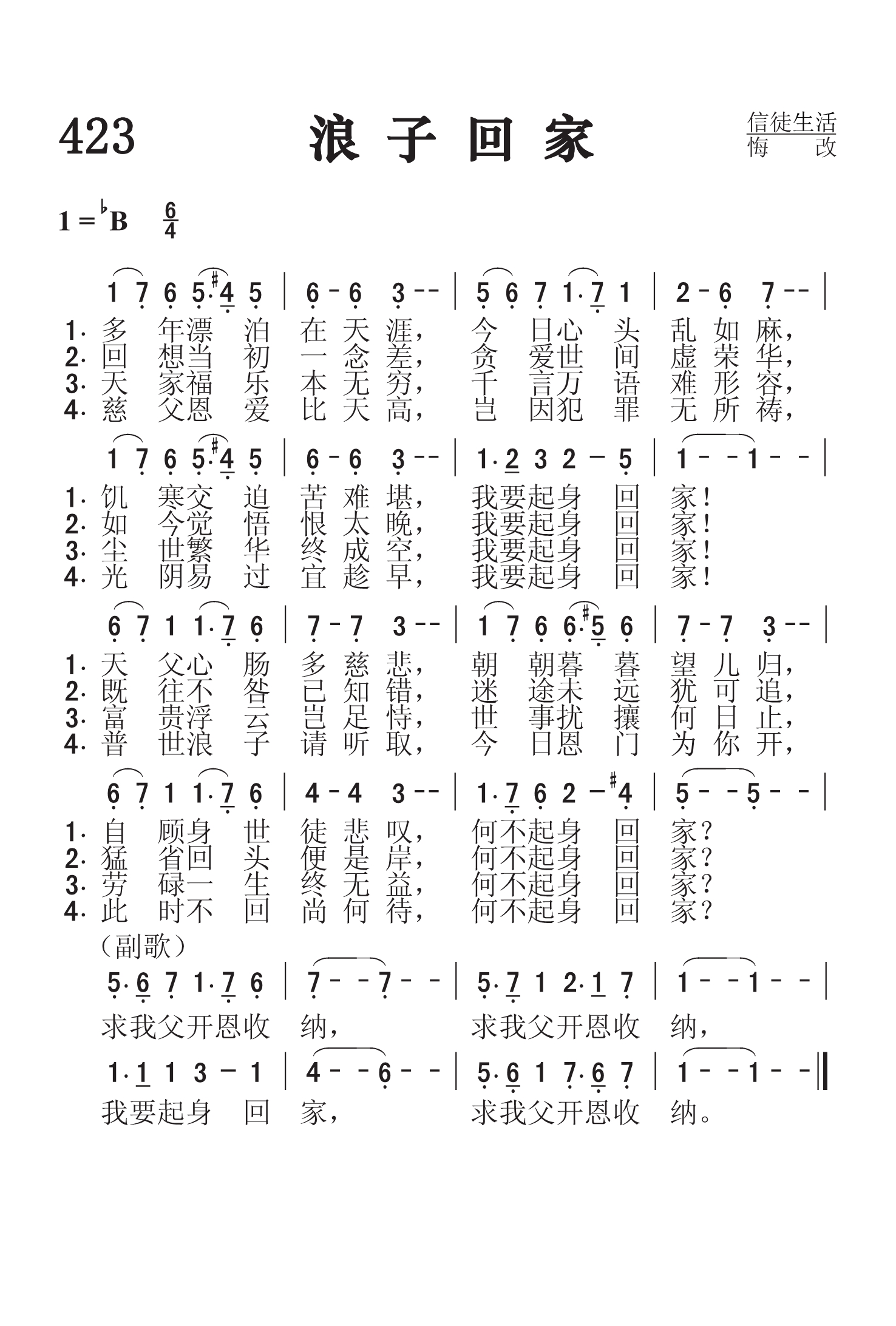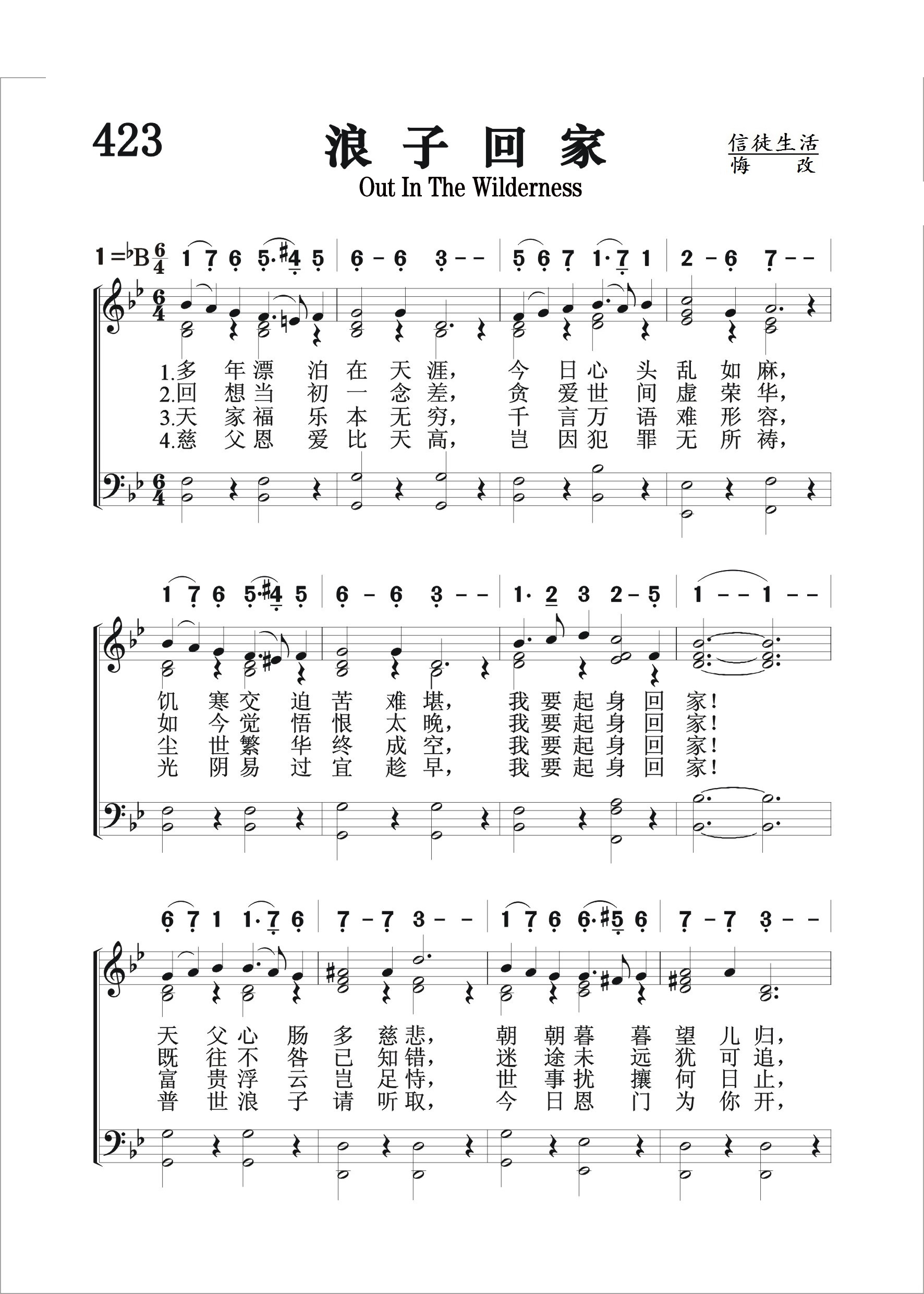 第423首浪子回家Out in the Wilderness 奇舒姆(Thomas.O.Chisholm,1866,7,29-1960,2,29)作词,斯特宾斯(George C.Stebbins,1846,2,26-1945,10,6)作曲 多年漂泊在天涯,今日心头乱如麻, 饥寒交迫苦难堪,我要起身回家! 天父心肠多慈悲,朝朝暮暮望儿归。 自顾身世徒悲叹.何不起身回家 回想当初一念差,贪爱世间虚荣华, 如今觉悟恨太晚,我要起身回家! 既往不咎已知错,迷途未远犹可追。 猛省回头便是岸,何不起身回家 天家福乐本无穷,千言万语难形容, 尘世繁华终成空,我要起身回家! 富贵浮云岂足恃,世事扰攘何日止。 劳碌一生终无益,何不起身回家 慈父恩爱比天高,岂因犯罪无所祷, 光阴易过宜趁早,我要起身回家! 普世浪子请听取,今日恩门为你开。 此时不回尚何待,何不起身回家 求我父开恩收纳,求我父开恩收纳, 我要起身回家,求我父开恩收纳。 词作者奇舒姆出生于美国肯塔基州的农村,没有受过多少学校教育,靠着自己的勤奋好学,16岁就在乡村小学当上教员。他21岁出任当地周报的编辑,27岁蒙恩重生,经马利逊牧师介绍,任《五旬节先锋》杂志主编。1903年,他就任美以美会牧师。后因健康原因辞职退休,但继续从事诗歌创作,共写了1200余首,发表了800余首,其中有许多被配上了曲调。 第24首《你的信实广大》和第461首《为耶稣而活》也是奇舒姆作词的。 曲作者斯特宾斯出生于美国纽约州的一个乡村,自幼喜爱音乐,13岁即进音乐学校学习,后到布法罗和纽约市继续深造。他23岁到芝加哥一个音乐商店工作,业余担任一个教堂唱诗班的指挥。1876年他随墓迪和桑基的布道团到过英国、印度、巴勒斯坦、埃及等地,以他的歌声为主作见证,并且多半是他自编自唱,收到了良好的效果。后来他将所谱的曲调和诗歌出版发行,使福音诗歌流传各地,备受欢迎。有人称他是福音诗歌的泰斗。他晚年所著《回忆录与福音圣诗的故事》,一方面作自传式的叙述,一方面收集其他福音诗歌作家的生平和故事,成为一部美好的见证。该书至今仍为研究圣诗的重要参考资料。