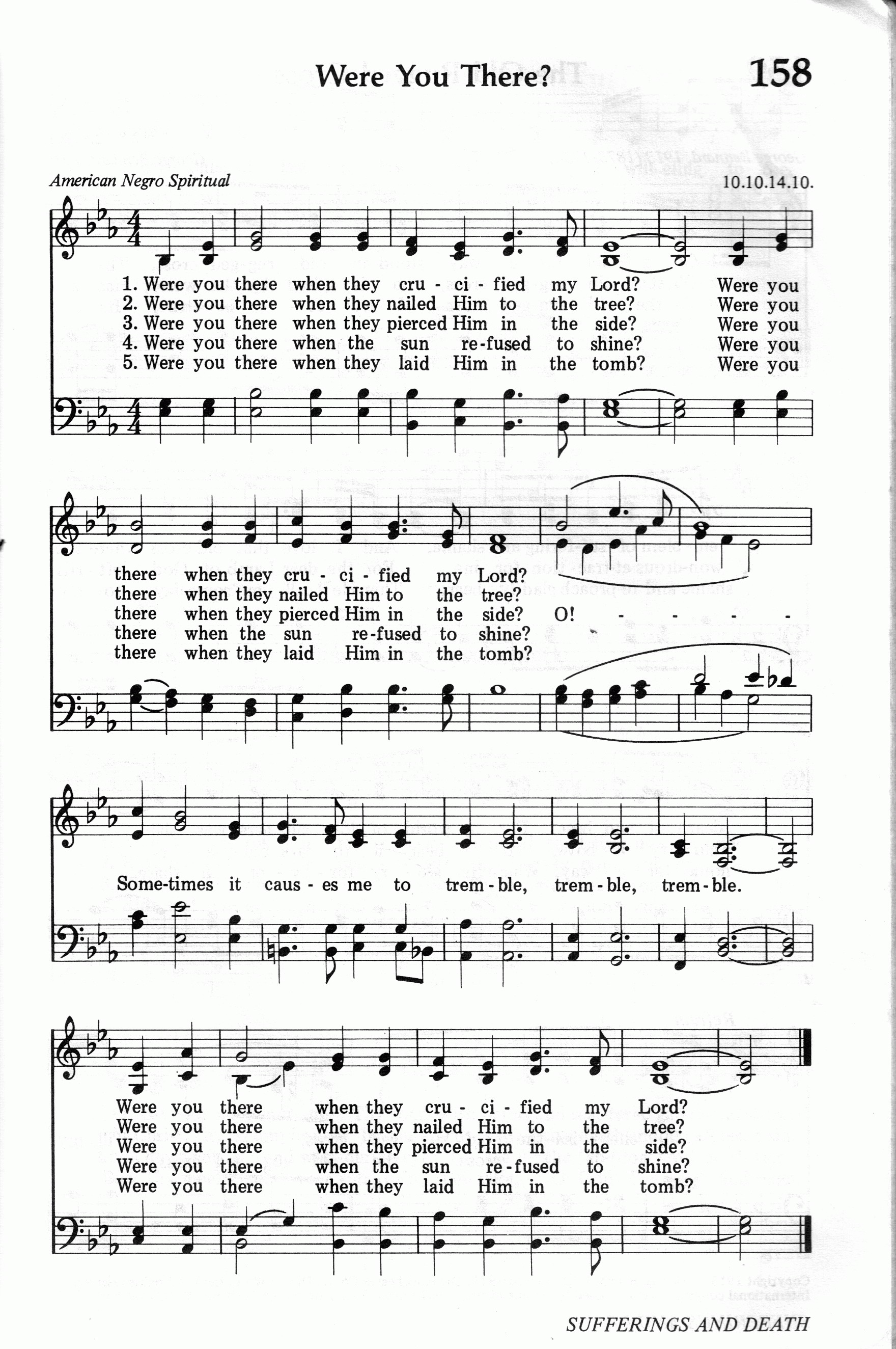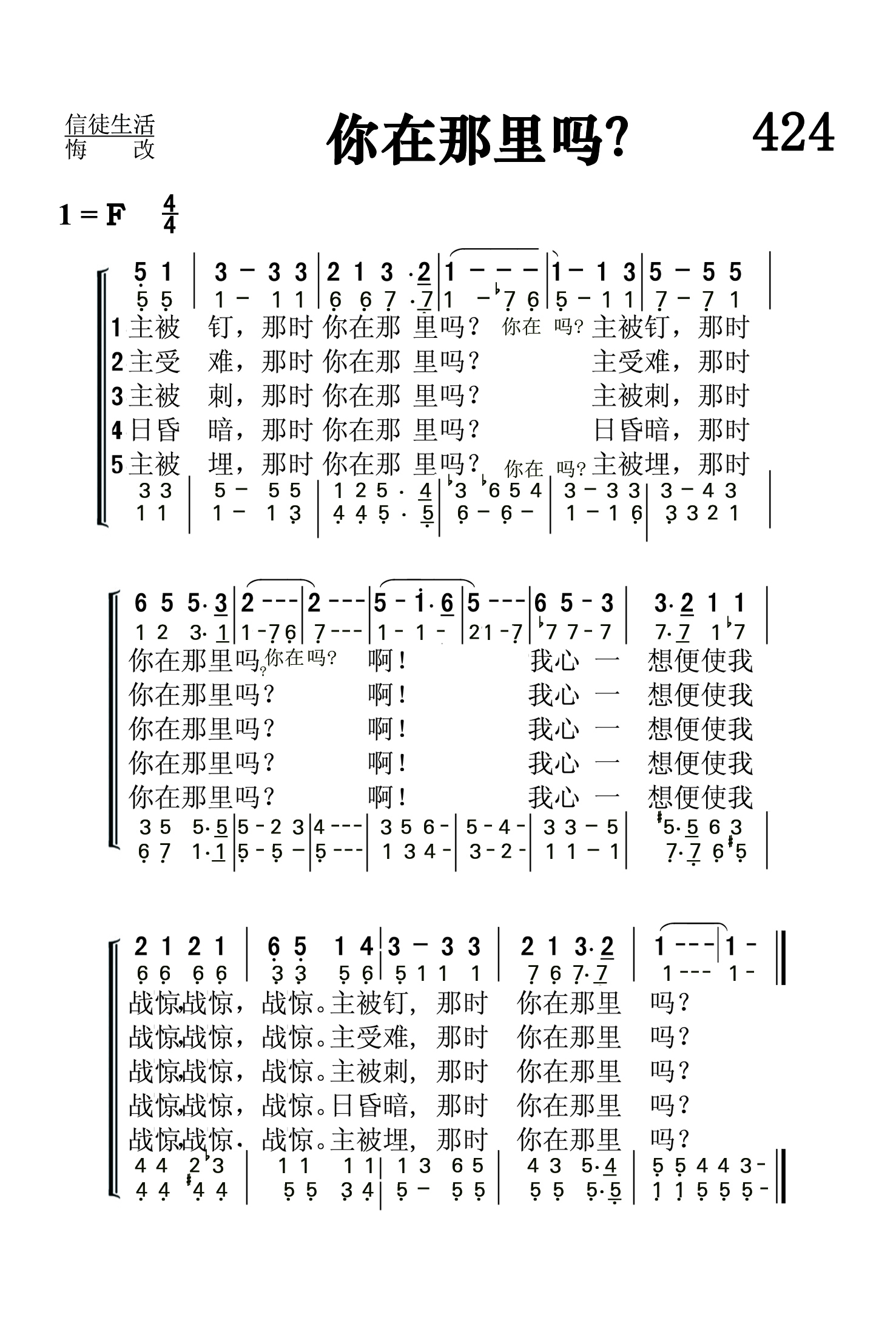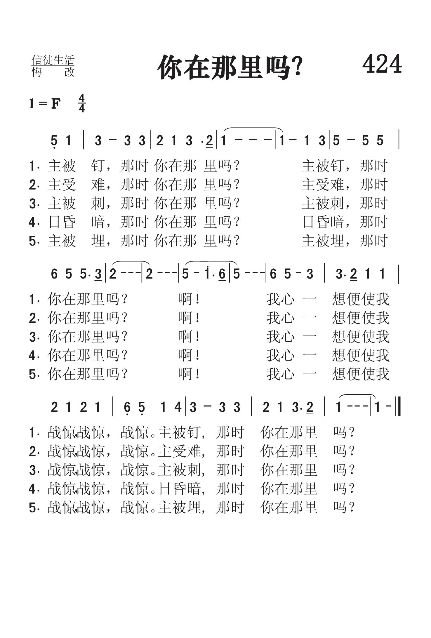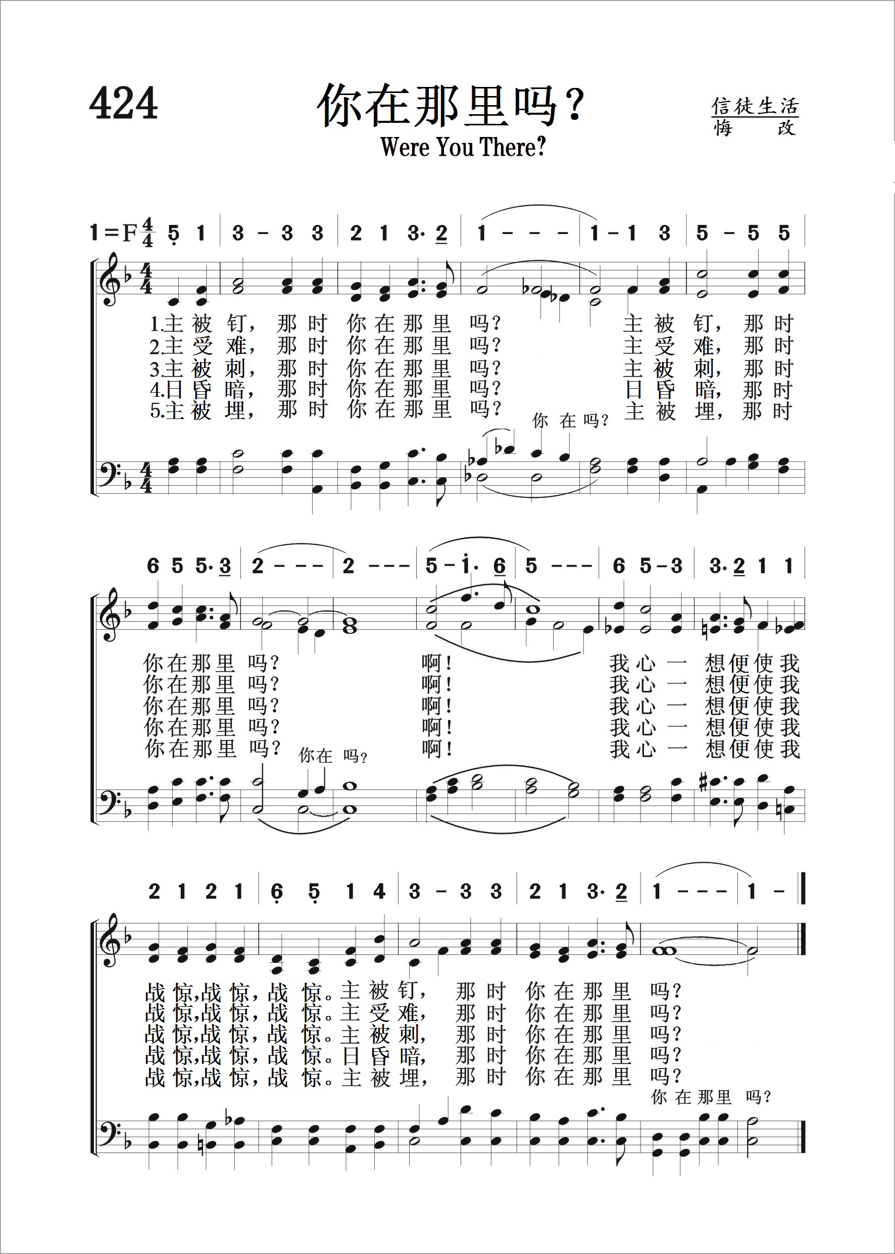第424首你在那里吗?Were You There? 美国黑人灵歌,胡珀(Wayne Hooper,1920,7,4-2007,2,28)改编 主被钉.那时你在那里吗 主被钉,那时你在那里吗 啊! 我心一想就使我战惊,战惊,战惊。主被钉,那时你在那里吗 主受难,那时你在那里吗主受难,那时你在那里吗 啊! 我心一想就使我战惊,战惊,战惊。主受难,那时你在那里吗 主被刺,那时你在那里吗 主被刺,那时你在那里吗 啊! 我心一想就使我战惊,战惊,战惊。主被刺,那时你在那里吗 日昏暗,那时你在那里吗 日昏暗,那时你在那里吗 啊! 我心一想就使我战惊,战惊,战惊。日昏暗,那时你在那里吗 主被埋,那时你在那里吗 主被埋,那时你在那里吗 啊! 我心一想就使我战惊,战惊,战惊。主被埋,那时你在那里吗 本曲的改编者胡珀曾在美国著名的圣乐组合《君王四重唱》中担任男中音达18年,为这个组合作曲和配乐达33年。他曾在俄勒冈州的波特兰学院和内布拉斯加州林肯市的联合学院教授音乐,担任《预言之声》广播的音乐编导,和撒那出版社的经理,1985年版基督复临安息日会《赞美诗》的音乐编辑。鉴于他的杰出贡献,安德烈大学曾授予他荣誉音乐博士学位。