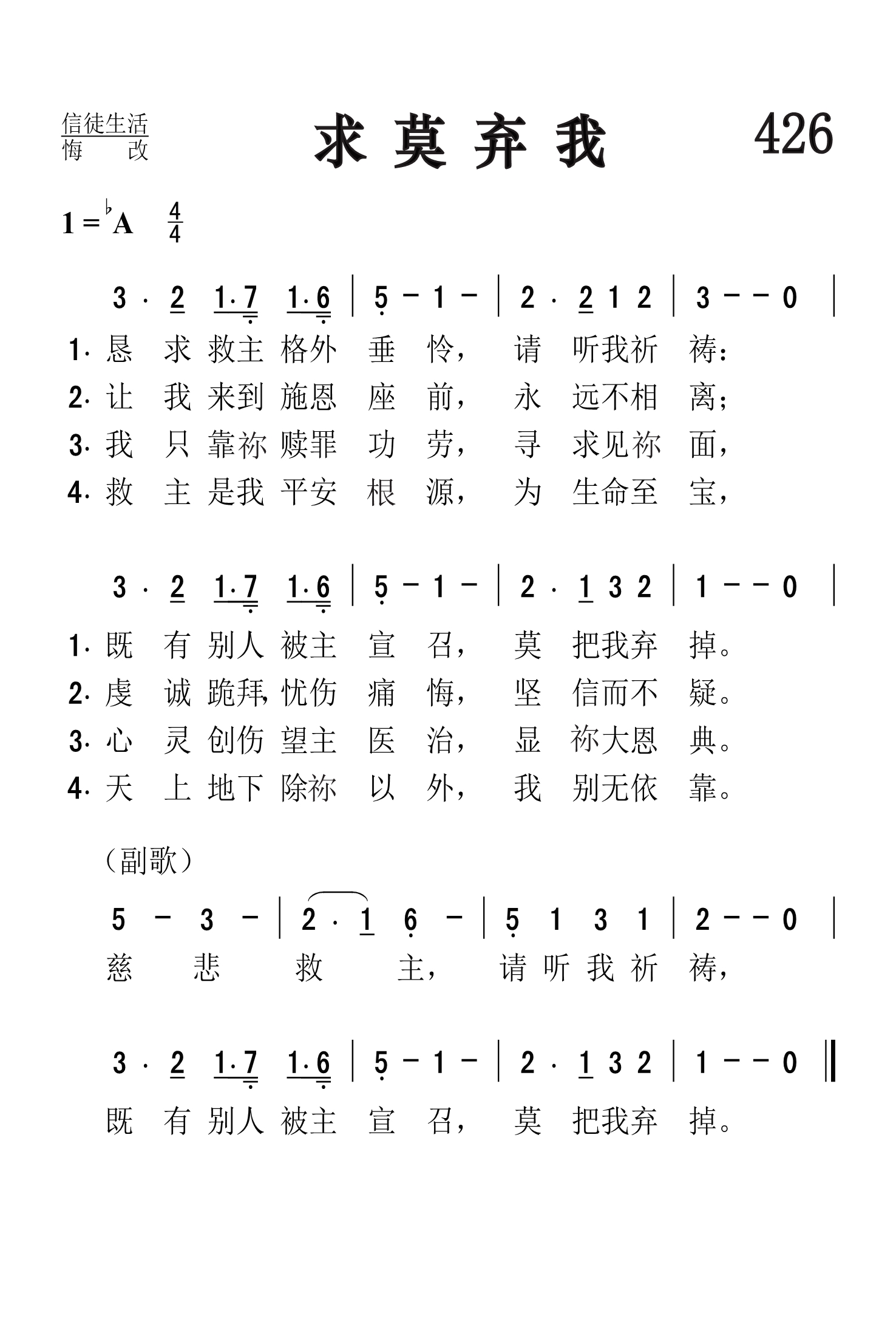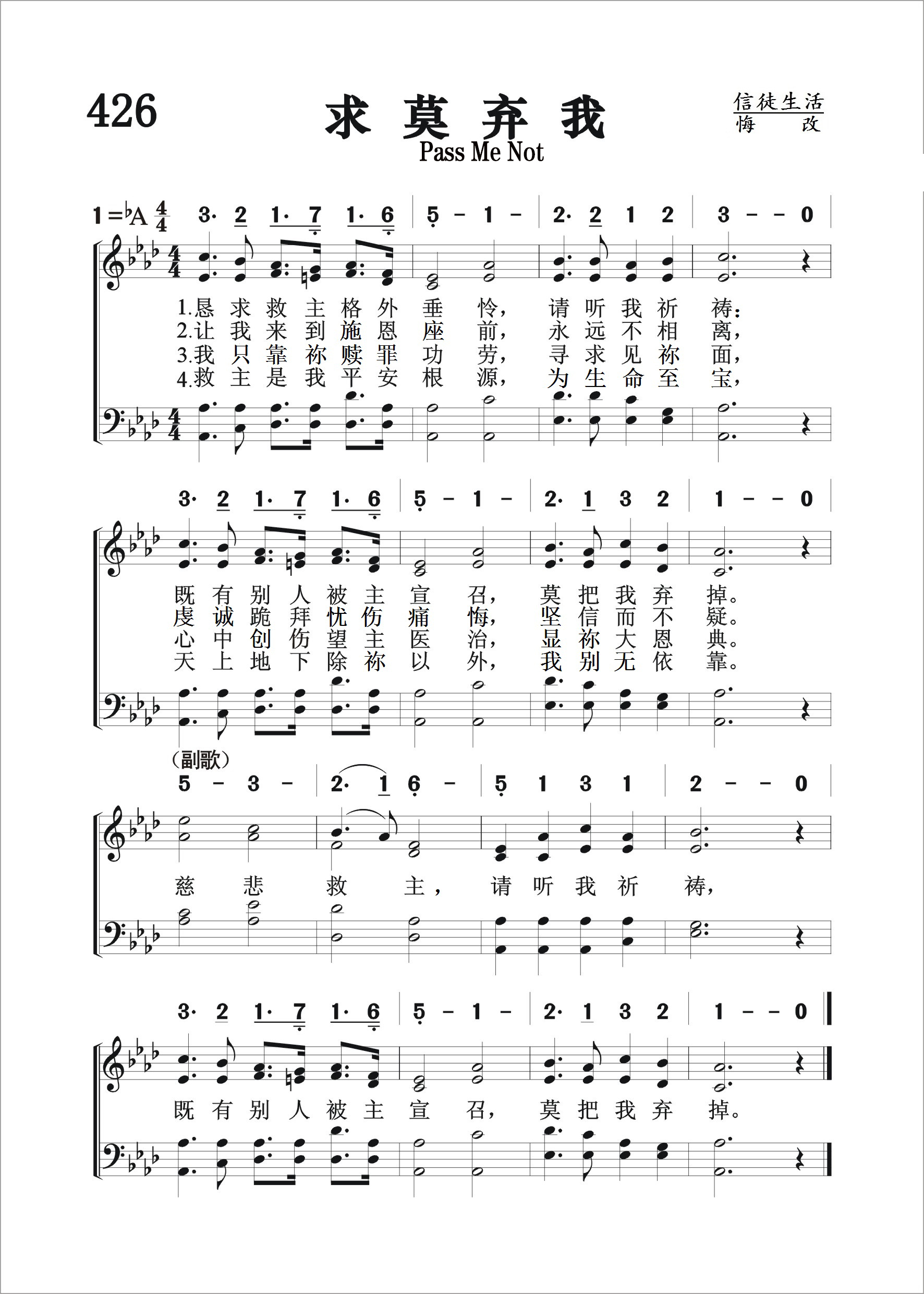 第426首 求莫弃我Pass Me Not 克罗斯比(1820-1915)作词 ;多恩(William H.Doane ,1832-1915)作曲(1870年) 恳求救主格外垂怜,请听我祈祷; 既有别人被主宣召,莫把我弃掉。 让我来到恩主台前,永远不相离; 虔诚跪拜,忧伤痛悔,坚信而不疑。 我只依靠救主功劳,寻求见主面, 心中创伤望主医治,显祢大恩典。 救主是我平安根源,为生命至宝, 天上地下除祢以外,我别无依靠。 慈悲救主请听我祈祷. 既有别人被主宣召,莫把我弃掉。 “显我为义的上帝啊,我呼吁的时候,求你应允我!我在困苦中,你曾使我宽广;现在求你怜恤我,听我的祷告”(诗4:1)。 这首著名的福音圣诗是肓诗人克罗斯比和威廉多恩于1868年合作写成的 ,也是克罗斯比第一首引起全球注目的诗歌。诗的首句是多恩所写,他请克罗斯比填词,但未果。1868年春的一天,克罗斯比访问监狱时听到哭声说:“良善的主啊,不要把我丢弃。”这呼声触动了她的心,回家后就作成这诗,多恩也谱上了感人的曲调。这首诗歌风行全球,被译成多种语言,信徒们满怀感激的心情来唱这首诗歌,藉着诗歌回忆主如何叫他们接受救恩,继而献上感谢。慕迪和桑基的布道团经常使用这首诗歌。它曾感动许多人认罪悔改。原诗的第一节的第三句“主既向别人显微笑。”后来改为“既有别人被主选召”。克罗斯比虽然自幼双目失明,却一直充满感恩的心。她曾说:“感谢主使我失明,因为我看不见就可以多思考,多创作一些赞美诗。”她又说:“如果还有来生,我祈愿上帝仍让我失明。” 英国里兹有一位青年商人,嗜酒不能自拔,日趋坠落。有一天他去参加聚会,听见会众唱: “恳求救主格外垂怜,请听我祷告, 既有别人被主选召,莫把我弃掉”。 他深受感动,立刻跪下,向主祈求“莫把我弃掉”,毅然戒掉他的恶习,从此跟从了耶稣。 历世以来,许多忠诚的基督徒,都怀着感激的心歌唱这首《求莫弃我》。 词作者克罗斯比是美国才华出众,负有盛名的福音女诗人。她出生六个月时因庸医,误诊而双目失明。15岁时她就读于纽约最早的一所盲童学校。1847-1858年,她留在该校教授英语语法,修辞学,罗马史和美国历史。她少年时代就开始写诗,24岁时出版了《盲女与她的诗》,引起美国文坛的注意。1850年灵性奋兴的经验,使她集中全力专写圣诗,后在福音圣诗作曲家和编辑布雷得伯里的鼓励下,立志以创作福音圣诗作为自己的终生事业,于是与纽约一家出版社签订合同,每周写圣诗三首,结果写了5929首。此外,她还为布利斯写525首,为桑基写237首,为劳里写219首,为多恩写1500首。她一生共写了8440首圣诗,堪称为最多产的圣诗作家。 曲作者霍华德多恩是富有才华的音乐家,克罗斯比的多年合作者。他出生于美国康涅狄格州普理斯顿市,14岁就带领唱诗班,青年时代与他父亲经营布店,以后转任机器厂厂商。因他服务态度很好,受到市民的欢迎,曾被选为市政委员。他业余为福音圣诗谱曲达二千多首。其中有不少经典之作。