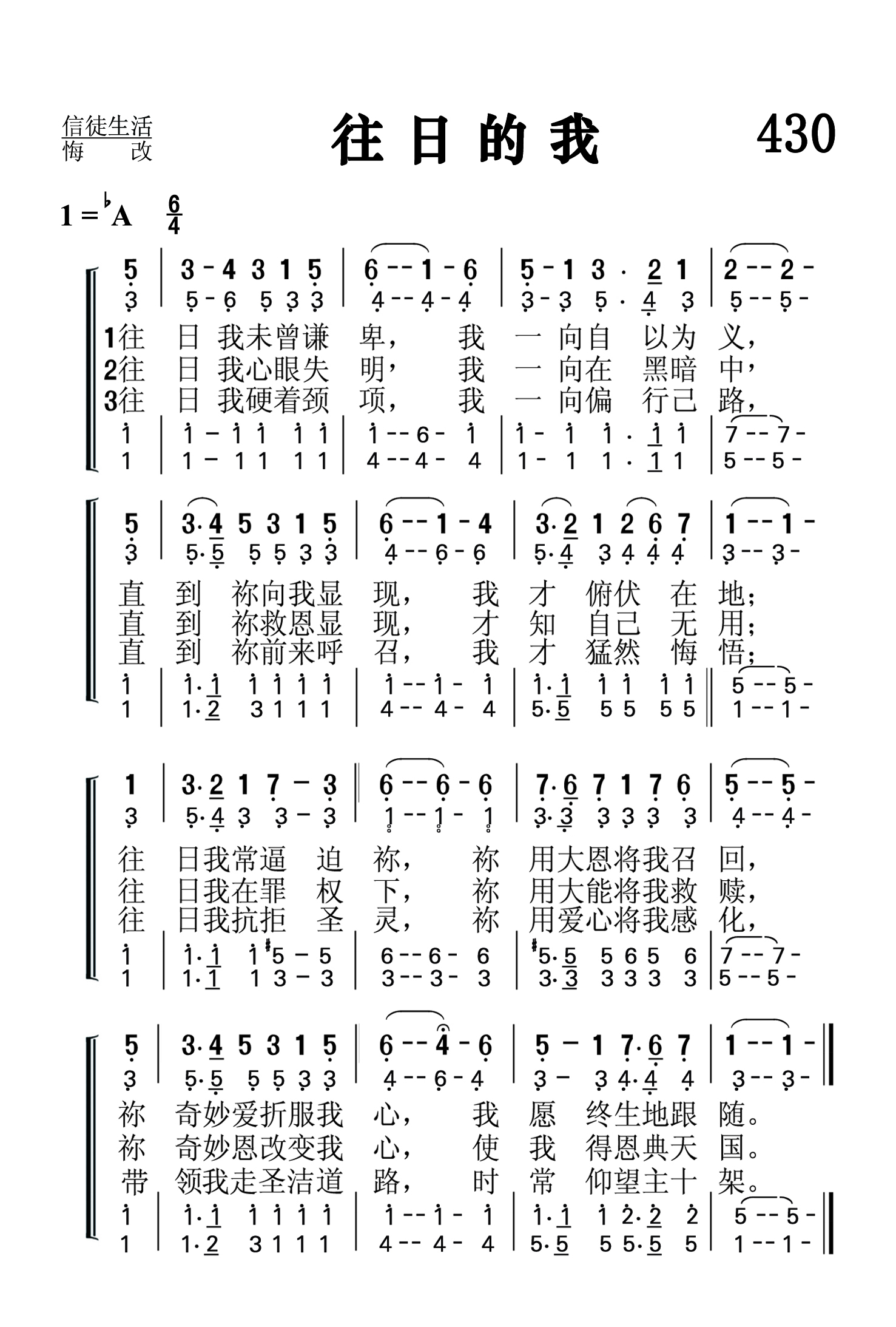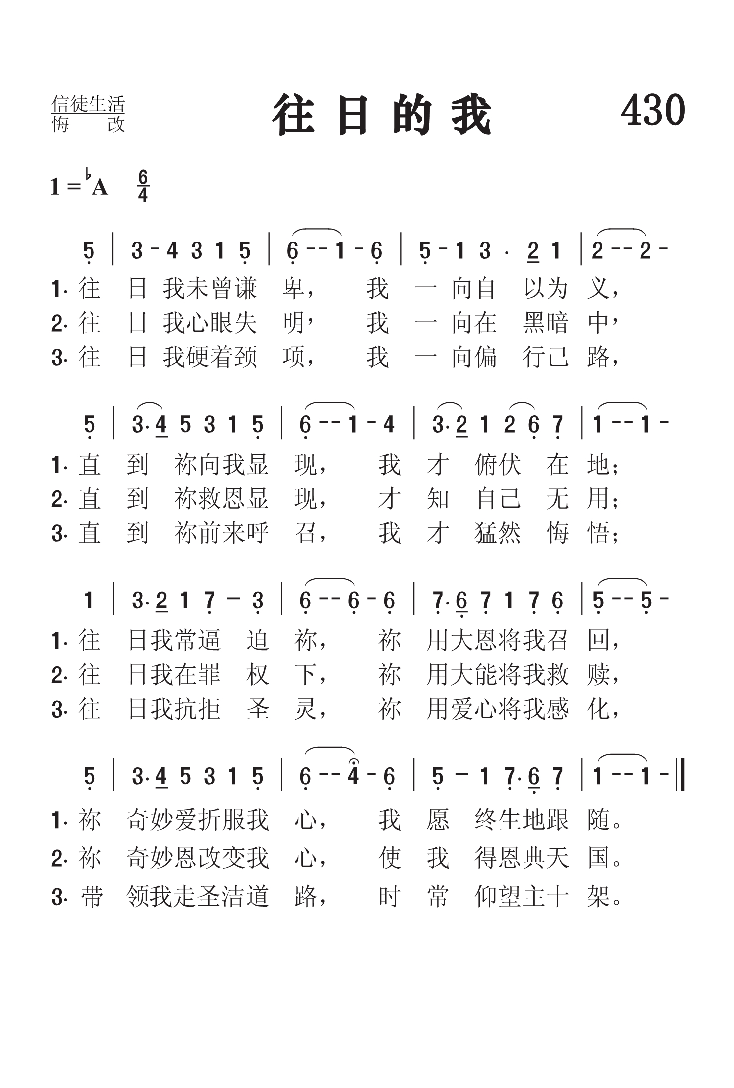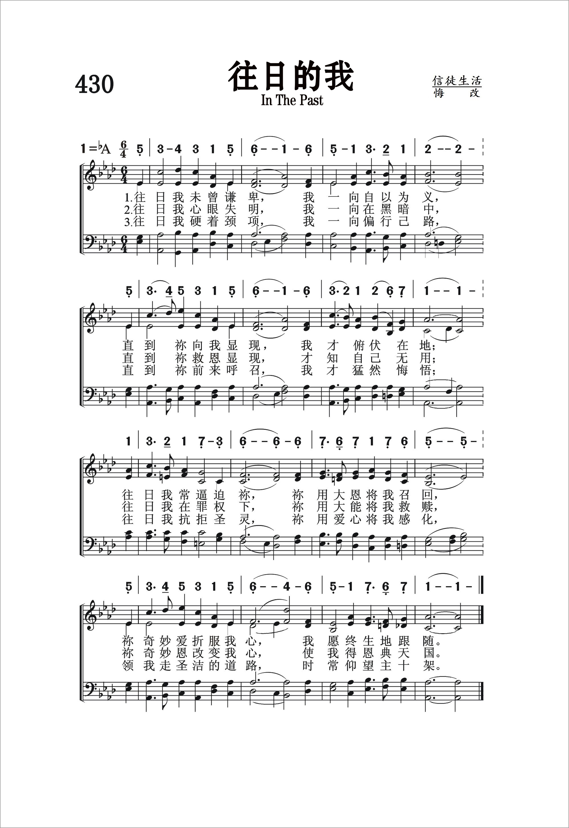 第430首 往日的我 In the Past (《颂赞圣诗》257首) 往日我未曾谦卑,我一向自以为义, 直到祢向我显现,我才俯伏在地; 往日我常逼迫祢,祢用大恩将我召回, 祢奇妙爱折服我心,我愿终生地跟随。 往日我心眼失明,我一向在黑暗中, 直到祢救恩显现.才知自己无用: 往日我在罪权下,祢用大能将我救赎, 祢奇妙恩改变我心,使我得恩典天国。 往日我硬着颈项,我一向偏行己路, 直到祢前来呼召,我才猛然悔悟: 往日我抗拒圣灵,祢用爱心将我感化, 领我走圣洁的道路,时常仰望主十架。 这首诗歌描写了信徒悔改信主的过程,将一个人蒙恩得救的前后进行了鲜明的对比。的确,在我们承受主耶稣的救恩之前,我们是生活在黑暗,盲目,劳苦负重,自以为义,抗拒感化的状态之中。直到主的大恩将我们召回,我们人生的方向才发生根本的变化。从此我们“走圣洁的道路,时常仰望主十架”。