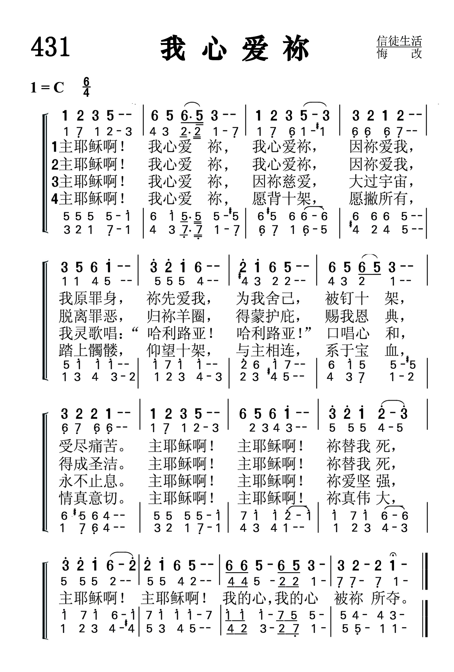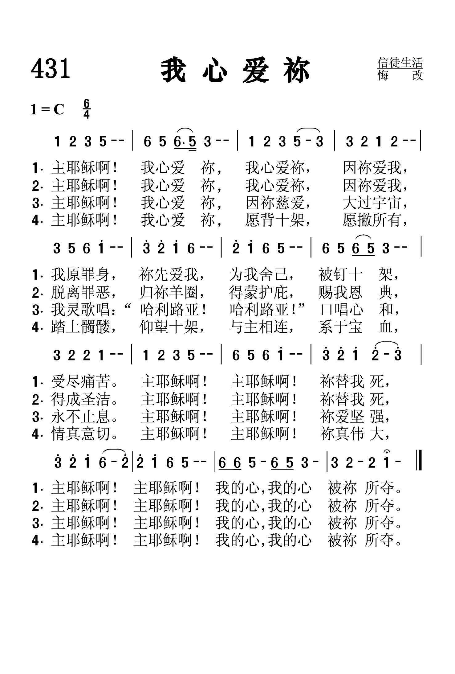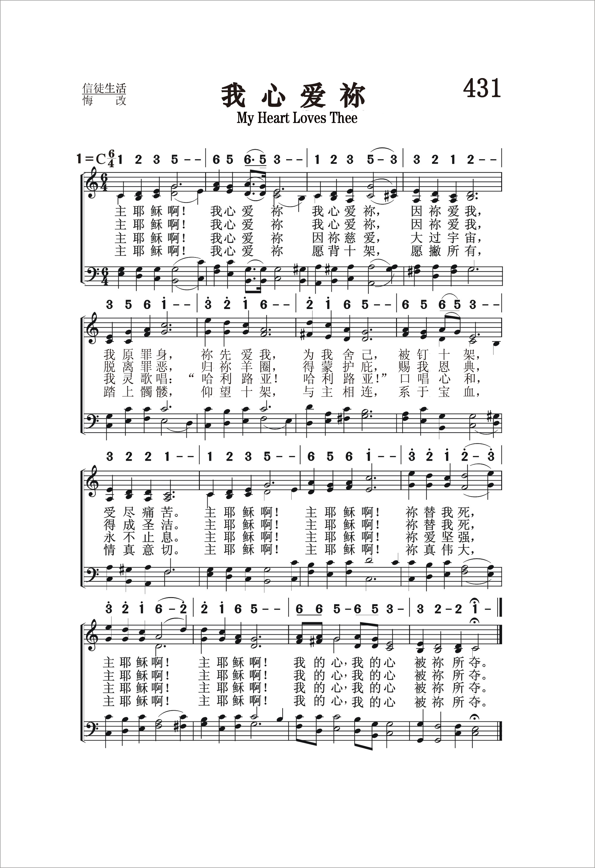 第431首 我心爱你 My Heart Loves Thee (《颂赞圣诗》286首) 主耶稣啊!我心爱祢,我心爱祢,因祢爱我, 我有罪身,祢先爱我.祢先爱我,被钉十架, 受尽痛苦。主耶稣啊!主耶稣啊!祢替我死, 主耶稣啊!主耶稣啊!我的心,我的心被祢所夺。 主耶稣啊!我心爱祢我心爱祢,因祢爱我。 脱离罪恶,归祢羊圈,得祢护庇,赐我恩典, 得成圣洁。主耶稣啊!主耶稣啊!祢替我死, 主耶稣啊!主耶稣啊!我的心我的心被祢所夺。 主耶稣啊!我心爱祢因祢慈爱,大过宇宙, 我灵歌唱,哈利路亚,哈利路亚,口唱心和, 永不止息。主耶稣啊!主耶稣啊!祢爱坚强, 主耶稣啊!主耶稣啊!我的心我的心,被祢所夺。 主耶稣啊!我心爱祢愿背十架,愿撇所有, 踏上髑髅,仰望十架,与主相连,系于宝血, 情真意切。主耶稣啊!主耶稣啊!祢真伟大, 主耶稣啊!主耶稣啊!我的心,我的心被祢所夺。 这首诗歌表达了信徒对主的爱。那是因为主先爱了我们,为救我们,祂历尽艰辛,克己牺牲,且死在十字架上。主的爱激发了我们的爱。我们的心已被祂所夺。我们要高唱“哈利路亚!”撇下世俗,跟随主走十字架的道路。