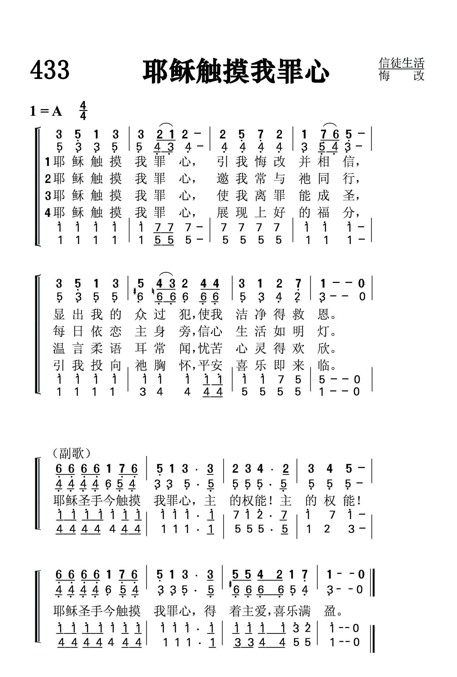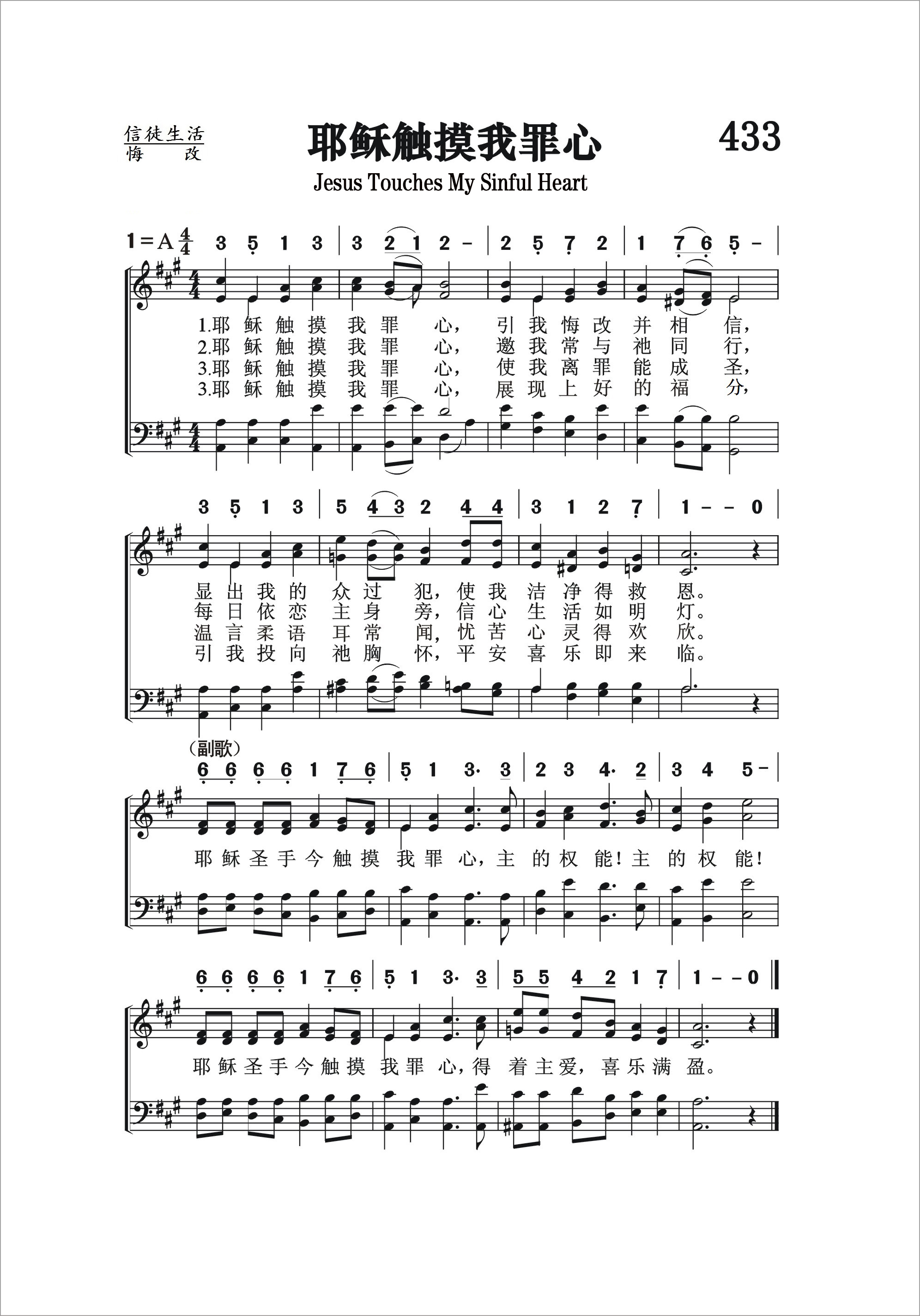 第433首 耶稣触摸我罪心 Jesus Touches My Sinful Heart 《颂赞圣诗》49首,赵典仁、吴涤申译自英文《青年圣歌》79首 耶稣触摸我罪心.引我悔改并相信, 显出我的众过犯,使我洁净得救恩。 耶稣触摸我罪心,邀我常与祂同行, 每日依恋主身旁,信心生活如明灯。 耶稣触摸我罪心,使我离罪能成圣, 温言柔语耳常闻,忧苦心灵得欢欣。 耶稣触摸我罪心,展现上好的福分, 引我投向祂胸怀,平安喜乐即来临。 耶稣圣手今触摸我罪心,主的权能!主的权能! 耶稣圣手今触摸我罪心,得着主爱,喜乐满盈。 赦罪之恩和悔改的心都是主所赐的。若是没有主耶稣的圣手主动抚摸我们罪迹斑斑的心,我们是无法感受到自己的不堪和主之大爱的。主的温柔和耐心使我们心悦诚服。我们感激祂的慈仁,颂赞祂恩不已。