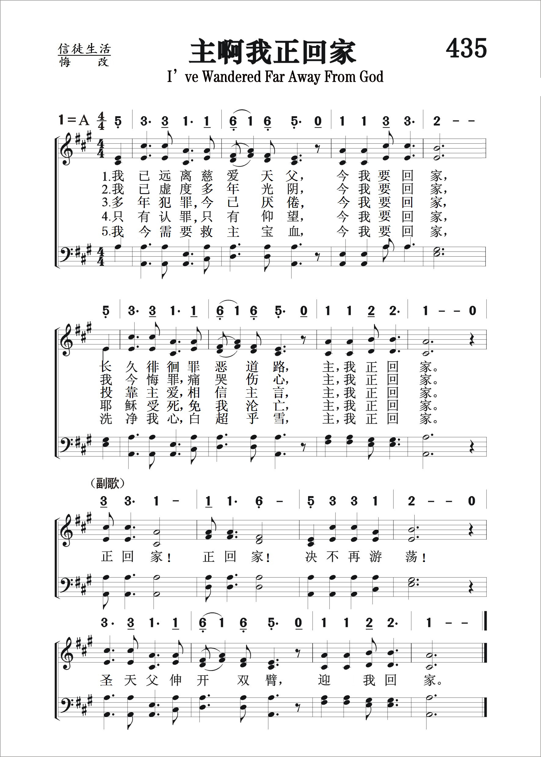 第435首 主啊我正回家I’ve Wandered Far Away From God 柯克帕特里克(W.J.Kirkpatrick,1838,2,27-1921,9,20)作词作曲 我已远离慈爱天父,今我要回家; 长久徘徊罪恶道路,主,我正回家。 我已虚度宝贝光阴,今我要回家; 我今悔罪,痛哭伤心,主,我正回家。 多年犯罪,今已厌倦,今我要回家; 投靠主爱,相信主言,主,我正回家。 只有认罪,只有仰望,今我要回家; 耶稣受死,免我沦亡,主,我正回家。 我今需要救主宝血,今我要回家; 洗净我心,白超乎雪,主,我正回家。- 正回家!正回家!决不再游荡! 我天父伸开双臂,欢迎我回家。 柯克帕特里克在宾夕法尼亚州的一次露营布道会上主领诗歌。他的一位担任独唱的助理有着优美的歌喉,其富于色彩的嗓音,往往使听众感动得流泪。但令柯克帕特里克感到难过的是,这位歌手还不是基督徒。他多么希望能把这位歌手争取到主的一边来啊!一天早晨聚会结束以后,他到帐篷里跪下祷告,求主给他一个信息,使他感能帮助这位助理悔改归主。他在不住祈祷的时候,脑海里出现了以下的诗句:“回家吧!回家吧!不要再游荡;慈爱天父伸开双手,渴望你回家。”于是他迅速着手写完这首诗,配上曲调,交给助理以一贯的热情和技能演唱,哪知圣灵藉着这首诗感动了这位助理悔改,进而又感动了千万人悔改,顺服基督。他们和那位浪子一同说:“我要起来,到我父亲那里去”(路15:18)。 柯尔帕特里克是美国音乐出版家,宗教音乐作曲家。他出生于爱尔兰,自幼跟他父亲学音乐,以后受教于几个名师,青年时移居美国。南北战争时他参军,任军乐队吹笛手。1862年至1872年在美国费城做家具商,并在美以美会担任义工,曾任美国费城美以美会唱诗班指挥。同时他还作曲。他在1859年21岁时即开始编辑出版赞美诗工作,以后与斯托克顿.斯威尼合编出版约一百多部宗教音乐集和书刊。他谱写了不少信徒所喜爱的福音歌曲。