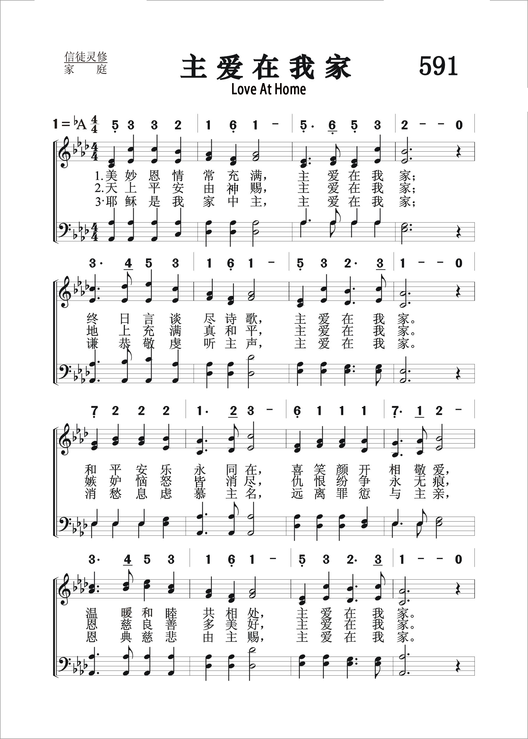 第591首 主爱在我家Love at Home 约翰.麦克诺顿(John Hugh.McNaughton,1829-1891)作词作曲 美妙恩情常充满,主爱在我家; 终日言谈尽诗歌,主爱在我家。 和平安乐永同在,喜笑颜开相敬爱; 温暖和睦共相处,主爱在我家。 天上平安由神赐,主爱在我家; 地上充满真和平,主爱在我家。 嫉妒恼怒皆消尽,仇恨纷争永无痕; 恩慈良善多美好,主爱在我家。 耶稣是我家中主,主爱在我家; 谦恭敬虔听主声,主爱在我家。 消愁息虑慕主名,远离罪愆与主亲; 恩典慈悲由主赐,主爱在我家。 爱的家,爱的家,喜乐幸福常充满,主爱在我家。 约翰.麦克诺顿出生于美国纽约州喀利多尼亚一个苏格兰移民的家庭。那里有一座纪念碑,以纪念他所作的贡献。 这是一首以家庭之爱为主题的诗歌。其中并没有刻板的说教,而是呈现一幅美丽感人的画面。主的爱在家庭里,能把爱向更大的世界扩散。我们的天父很愿意看到这个世界充满爱。 麦克诺顿因他的音乐和诗歌所表达的诗情画意而被誉为“诗人麦克诺顿”。他深爱自己的苏格兰传统,因而把这首歌的曲调定名为《喀利多尼亚》。那是罗马时代在诗歌中对苏格兰的称呼,也是他出生地的地名。