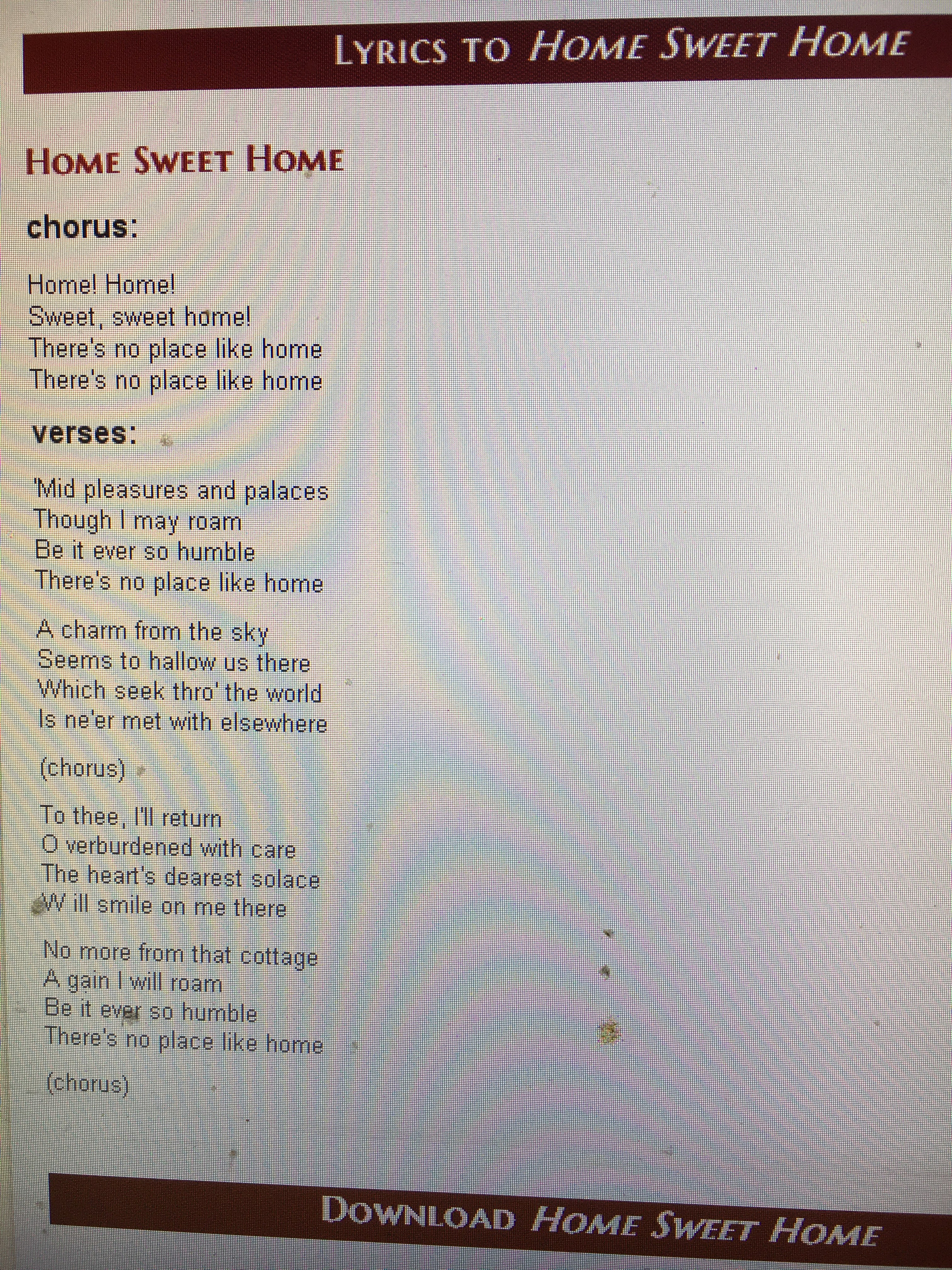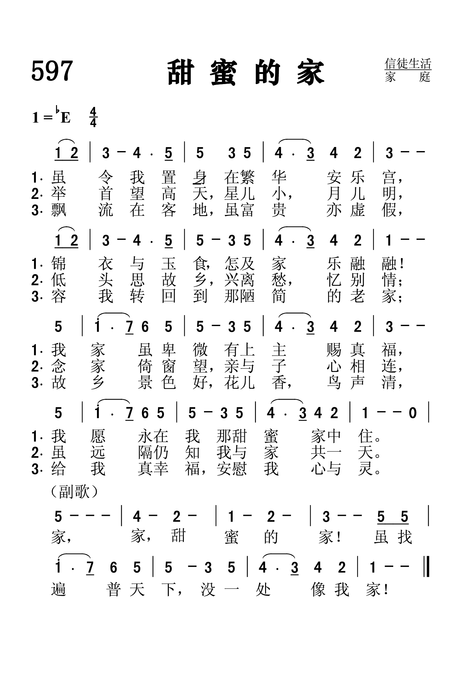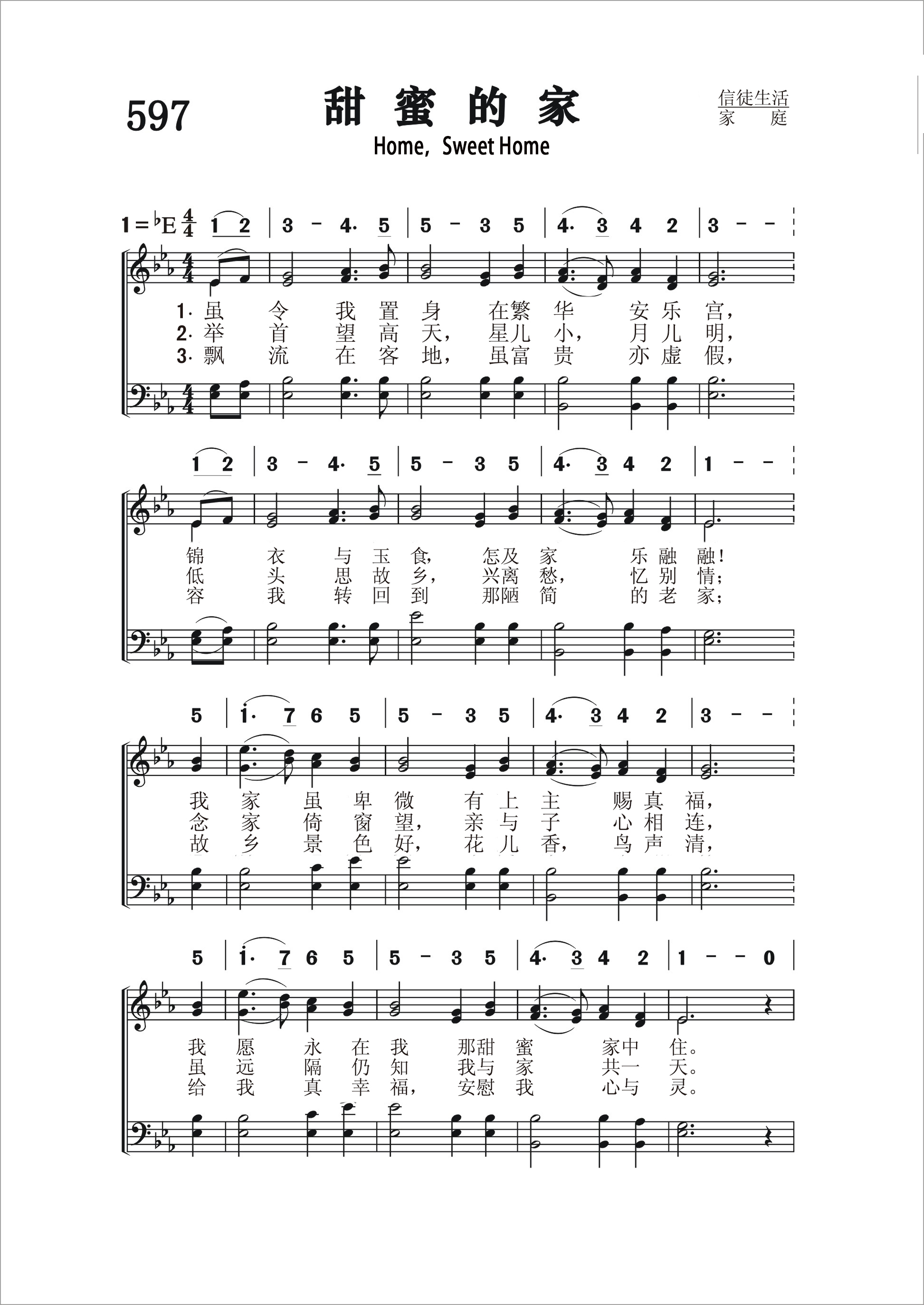 第597首 甜蜜的家Home,Sweet Home 佩恩(John Howard Payne,179l-1852)作词,毕晓普(Henry R.Bishop,1786,11,18—1856,4,30)作曲 虽令我置身在繁华安乐宫, 锦衣与玉食,怎及家乐融融! 我家虽卑微,有上主赐真福, 我愿永在我那甜蜜家中住。 举首望高天,星儿小,月儿明, 低头思故乡,兴离愁,忆别情; 念家倚窗望,亲与子心相连, 虽远隔仍知我与家共一天。 飘流在客地,虽富贵亦虚假, 容我转回到那陋简的老家; 故乡景色好,花儿香,鸟声清, 给我真幸福,安慰我心与灵。 家,家,甜蜜的家!虽找遍普天下,没一处像我家! 这是一首经典的世界名曲。词作者约翰.霍华德.佩恩是一个演员兼剧作家。他的职业生涯不同寻常。他写第一个剧本时,年仅十五岁,后到协和学院学习一年,十八岁第一次登台演出。他在欧洲演出十分成功,但他作为一个剧作家的名声更大。他写过六十多部剧本,其中有两部是与华盛顿.欧文合作的。他的剧本《布鲁图斯》于1818年在伦敦首演后一直到十九世纪末在大西洋两岸都很流行。《甜蜜的家》就是他的喜歌剧《米兰姑娘克拉里》的主题曲。他的剧本虽然很受欢迎,却很少收到版权税,常常身无分文,甚至有时还被关进债务人监狱。佩思的名字最后被公众遗忘了,但《甜蜜的家》却留在了人的心中,并被绣在千百万的布片上作为装饰。诗中最著名的一句“虽找遍了天下,无一处像我家”,曾作为《奥兹的巫师》这部影片中多萝西的护身符。也许美国人对于家如此多愁善感是由于他们是移民、拓荒者、边疆开发者和一个历史比较短的民族传统造成的。 曲作者亨利罗利毕晓普是英国作曲家、指挥家。出生于伦敦,是当时非常有名望和受人尊敬的作曲家、歌剧指挥家。据说曾创作过120多部戏剧作品,但俱未能流传。现在仅以他的歌曲《甜蜜的家》而知名。这首歌的曲调,据推测源于“西西里岛旋律”(Sicilian Air),见于1821年他所编订的《民歌旋律》(National Airs),后来在1823年又被剧作家佩恩用作喜歌剧《米兰姑娘克拉里》的主题歌。1842年,他被维多利亚女王授予爵士称号,是历史上第一位授勋的音乐家。他还担任过牛津大学的音乐教授。1856年4月30日逝世于伦敦,葬于圣玛丽勒本(Saint Marylebone)公墓。