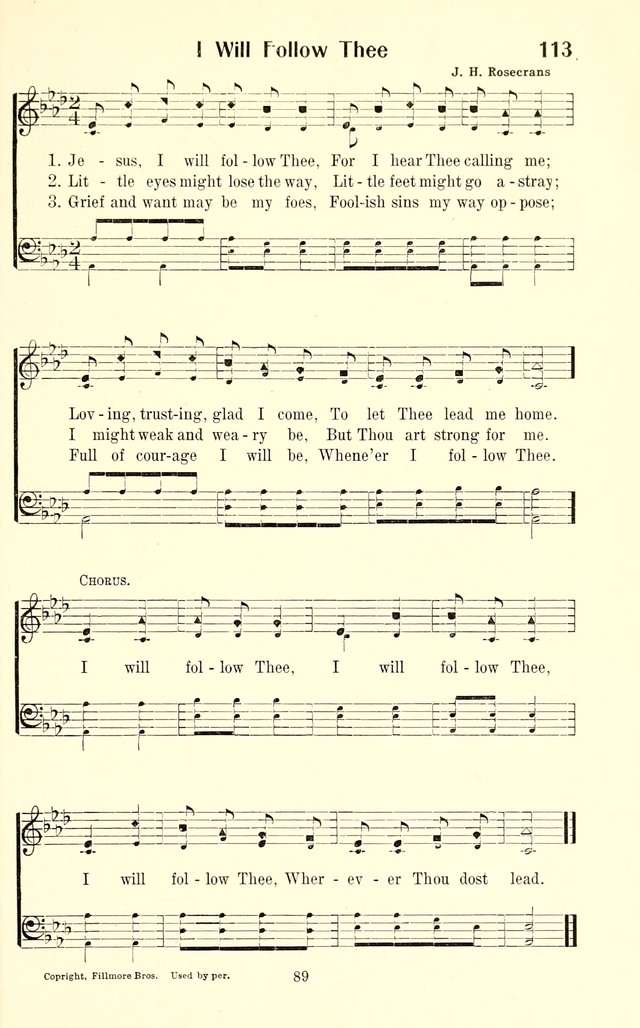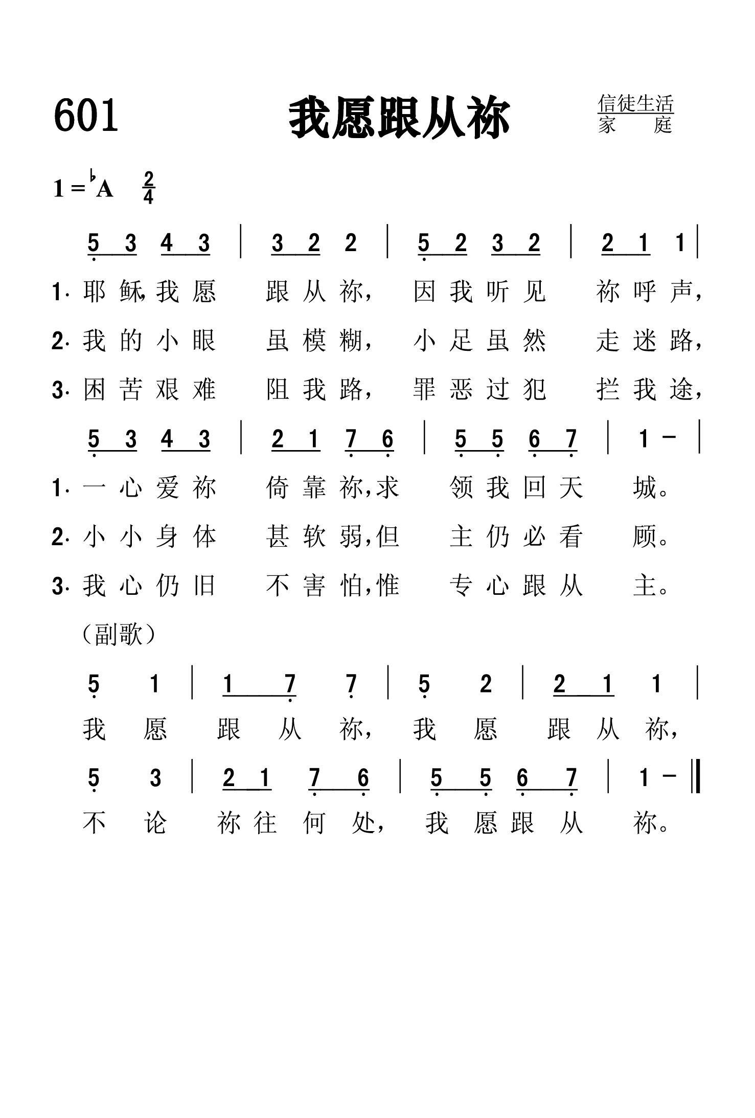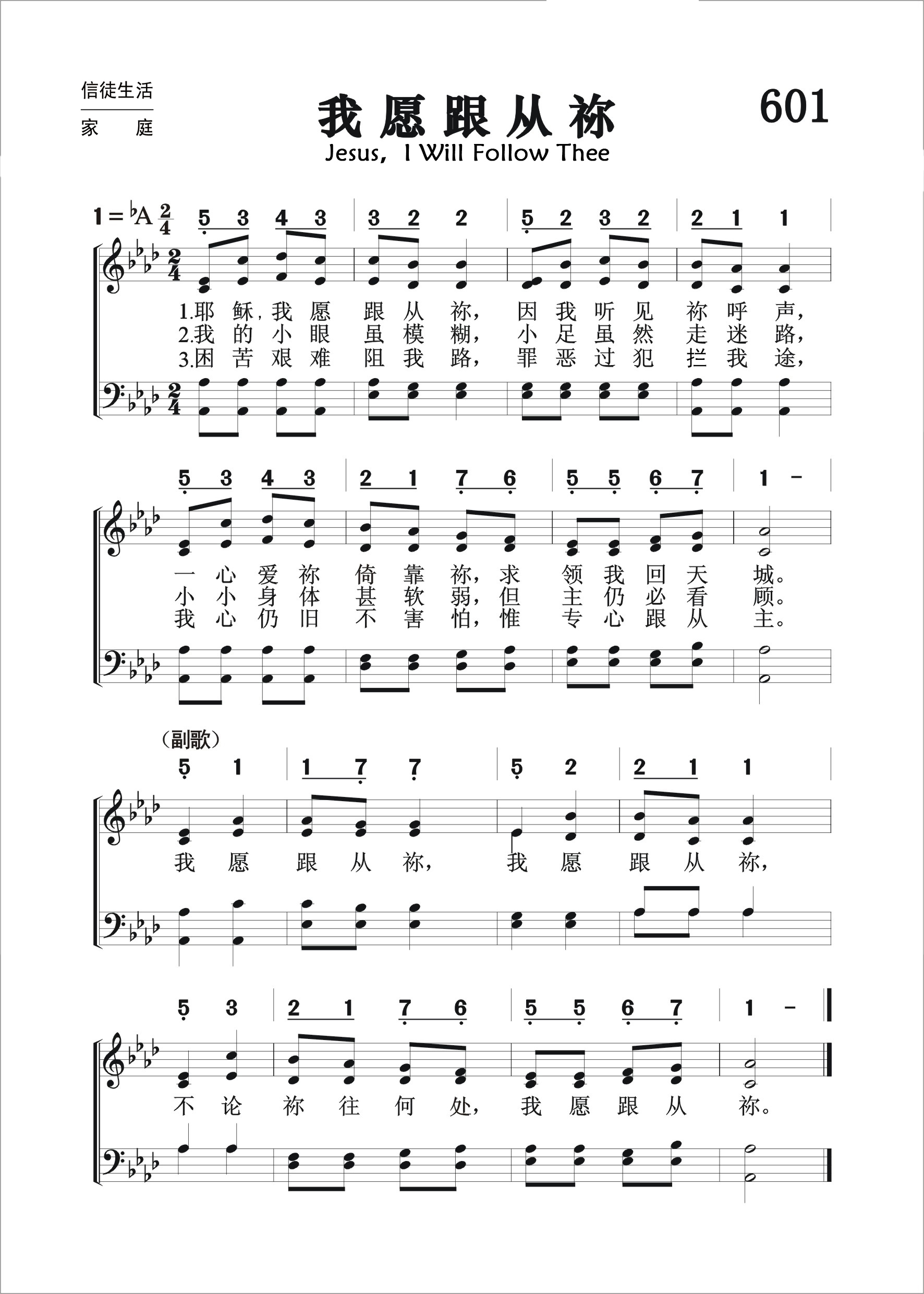 第601首我愿跟从你Jesus,I Will Follow Thee 格雷斯.格伦(Grace Glenn)作词,罗斯克兰斯(J.H.Rosecrans)作曲 耶稣,我愿跟从祢,因我听见祢呼声, 一心爱祢倚靠祢,求领我回天城。 我的小眼虽模糊,小足虽然走迷路, 小小身体甚软弱,但主仍必看顾。 困苦艰难阻我路,罪恶过犯拦我途, 我心仍旧不害怕,惟专心跟从主。 我愿跟从祢,我愿跟从祢, 不论祢往何处,我愿跟从祢。 这首儿童诗歌旋律优美,节奏明快,表达了信主的儿童希望跟从主,依靠主的纯真信心。主耶稣最喜欢小孩子。祂十分愿意接纳他们软弱的信赖之心,帮助他们克服一切困难,牵着他们的小手,指引着他们的小脚,行走在公义的道路上。