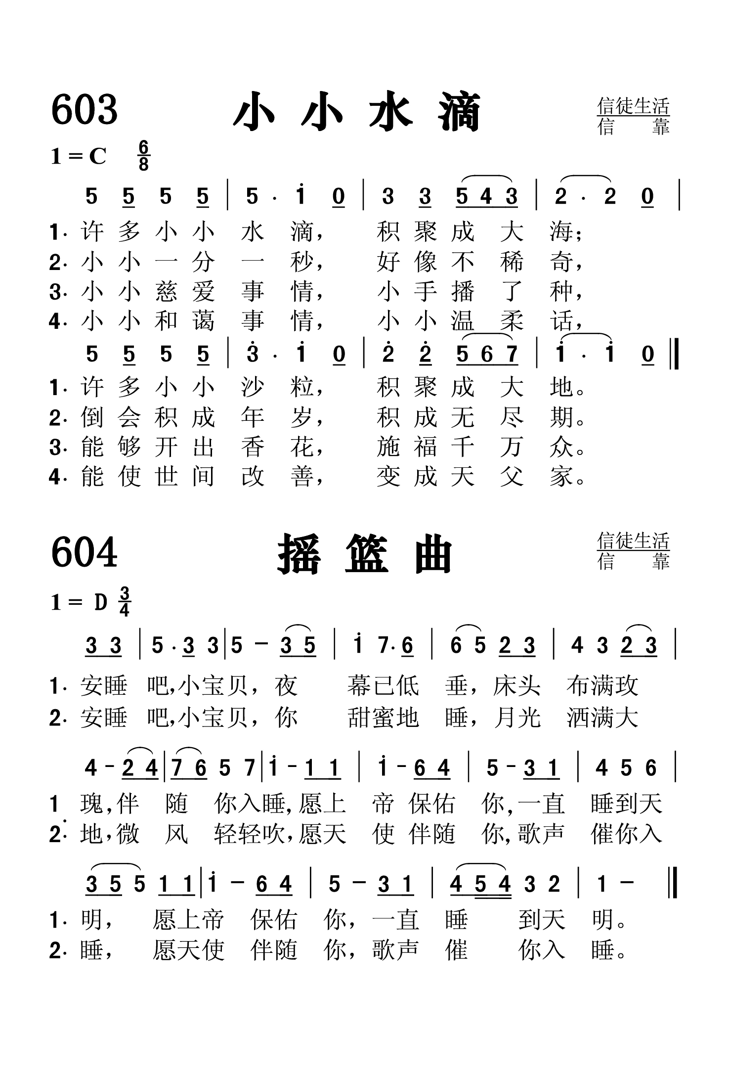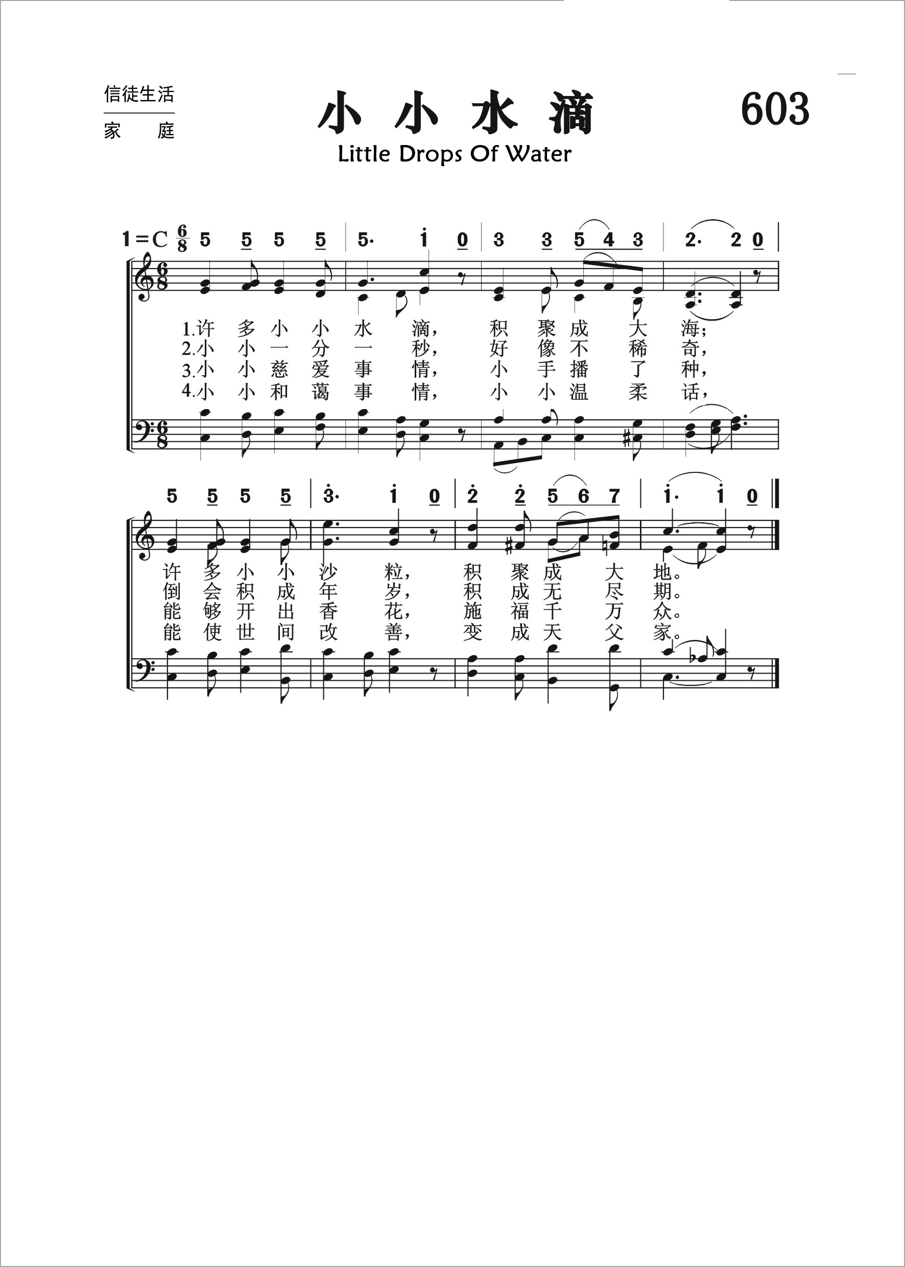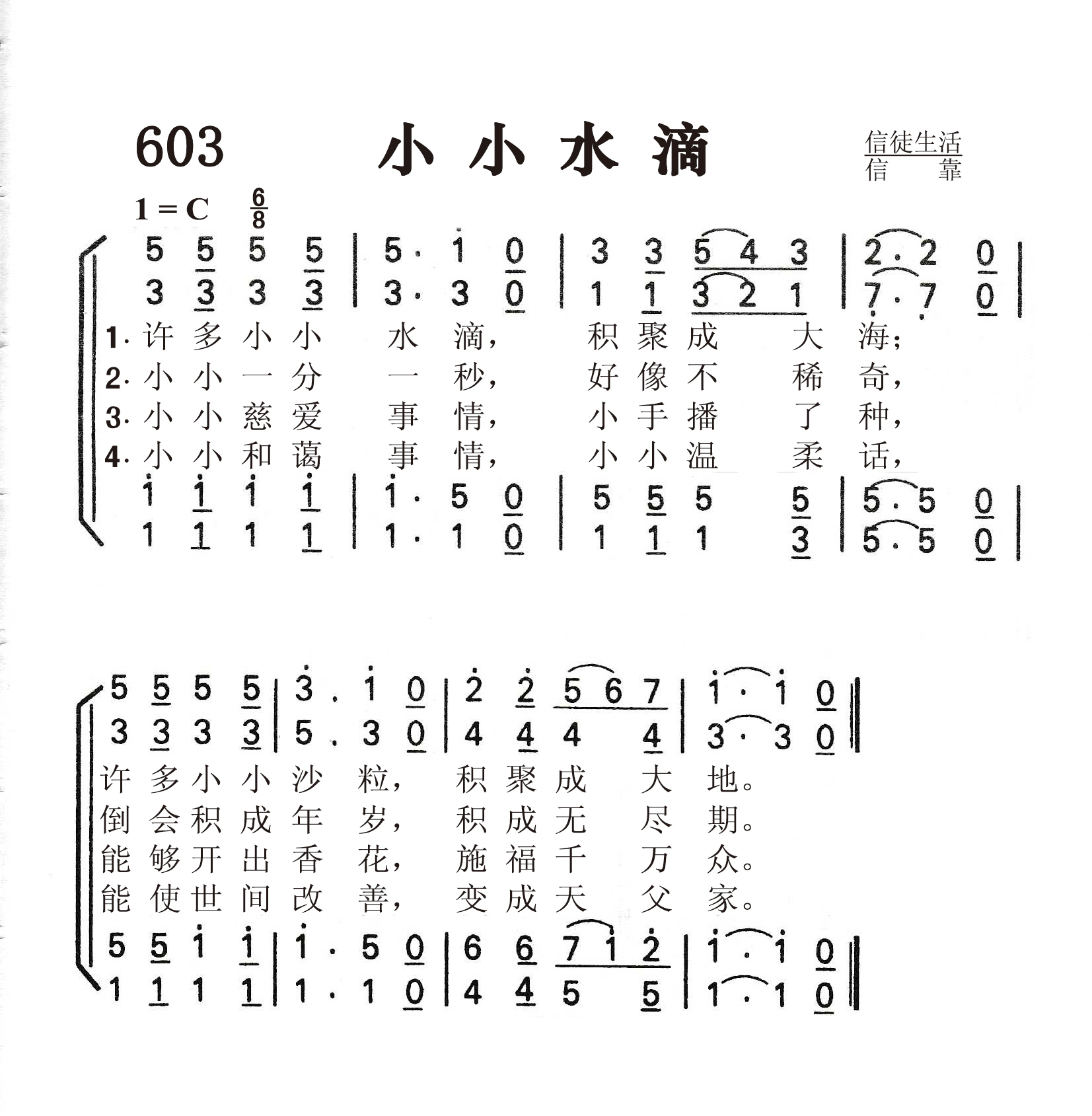 第603首小小水滴Little Drops of Water 卡尼(Julia A.Carney,1823-1908)作词(1845年),刘廷芳,杨荫浏合译(1934年),哈特(Sarah Hart)作曲(约1848年) 小小许多水滴,积聚成大海;小小许多砂粒, 积聚成大地。 小小一分一秒,好象不希奇;倒会积成年岁,积成无尽期 我们小小过失,会使我的灵;离开德行路程,转向恶中行。 小小慈爱事情,小手播了种;能够开出香花,施福千万众 小小和爱事情,小小温柔话;能使世间改善,变成天父家。 词作者卡尼是美国波士顿一座礼拜堂附设小学的教师。这首诗是他为该校的儿童们所写的,原收入《福音教员》一书,后被收入赞美诗集,成为一收流行的儿童诗歌。以后曾有数位作者对该诗进行改编和补充,使之内容更为丰富和完整。