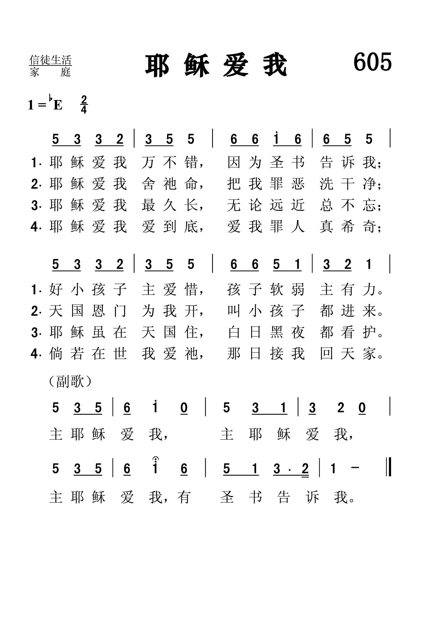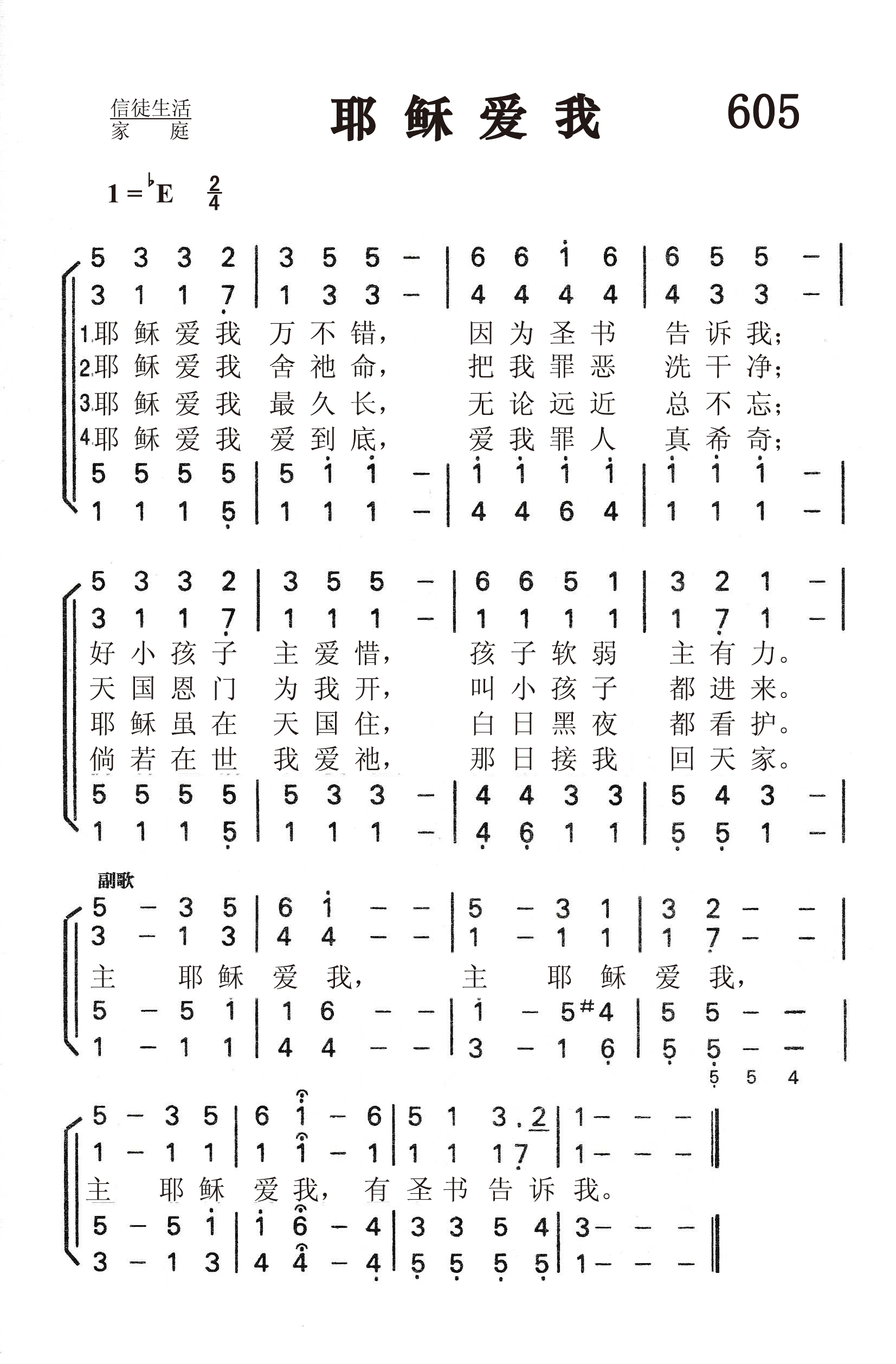 第605首 耶稣爱我Jesus Loves Me 沃纳(Anna B.Warner,1827,8,31-1915,1,22)作词(1859),布雷德伯里(W.B.Bradbury,1816,10,6-1868,1,8)作曲 耶稣爱我万不错,因为圣书告诉我; 好小孩子主爱惜,孩子软弱主有力。 耶稣爱我舍祂命,把我罪恶洗干净; 天国恩门为我开,叫小孩子都进来。 耶稣爱我最久长,无论远近总不忘; 耶稣虽在天国住,白日黑夜都看护。 耶稣爱我爱到底,爱我罪人真希奇; 倘若在世我爱祂,那日接我回天家。 主耶稣爱我,主耶稣爱我, 主耶稣爱我,有圣书告诉我。 《耶稣爱我》美国女作家安娜.沃纳1859年在西点军校领查经班时所写的。诗歌用天真淳朴的语言表达了少年儿童对主耶稣的仰慕和热爱,同时也赞美了救主对世人的眷爱和看顾。本诗曲调是布雷德伯里所谱的。这是布雷德伯里专为主日学儿童所谱写的圣诗。他是编写美国主日学赞美诗的发起人。 安娜.沃纳出生于美国纽约长岛的一个富裕的律师家庭。1837年的经济萧条使家庭失去了大部分财产。他们被迫搬家。从那时起,她和她的姐姐苏珊开始写作谋生。她曾用笔名发表近二十本小说,其中最有名的一本为《广阔世界(The wide, wide world)》。她翻译创作过圣诗两册。她和她姐姐都是敬虔的信徒。她们住的地方离美国西点军校不远。姐妹二人除写作外,还时常被请去西点军校为士兵员工领查经班,教他们唱诗。 《赞美诗》505版第362首《我愿见耶稣》也是安娜.沃纳作词的。她去世后,《我愿见耶稣》的第二节刻在她的墓志铭上。 曲作者布雷德伯里出生于美国缅因州约克。他14岁以前没有接触过风琴,钢琴。1830年随家迁往波士顿,才接触这些乐器。他参加了梅森的唱诗培训班,后来与梅森在师范研究所共事。他在工作中表现了杰出的音乐天才,曾任浸信会数个会堂的管风琴师和唱诗班指挥,待遇菲薄,年薪仅25美元,但他却毫不计较。他后来到纽约教儿童唱歌,并向中学生介绍音乐,讲解乐理。1847年他获得机会去德国深造,跟名师学习,返美后专任音乐教师。他在1841-1867的二十六年时间里,平均每年出两本赞美诗集,总计59本,包括《金链》,《鲜月桂》等,销量达二百万册以上。 1854年,他自己成立钢琴制造厂。1917年该厂并入纳普音乐工厂。他所编写的许多音乐书籍和圣诗曲调,已在世界各地广泛流传。