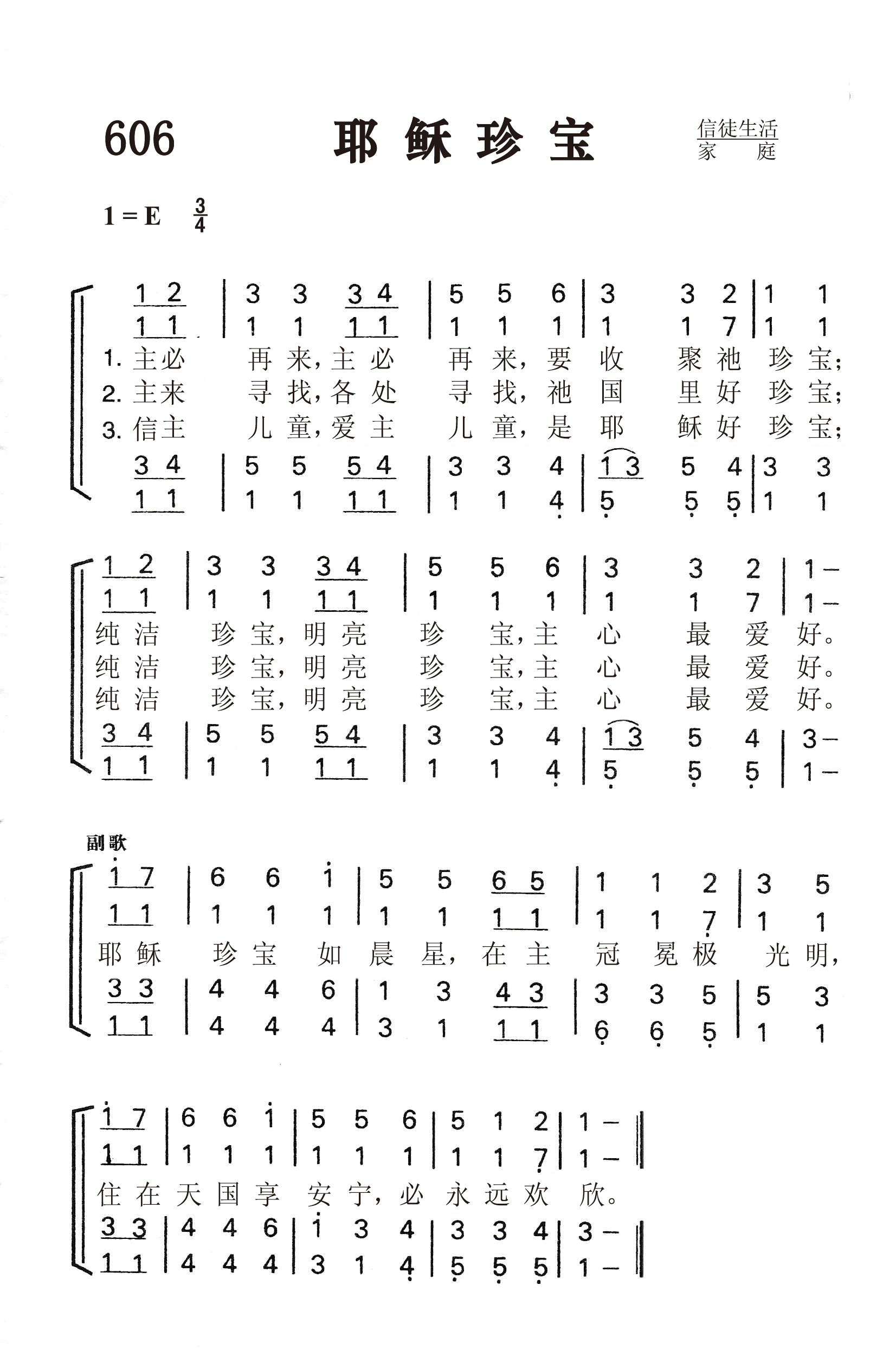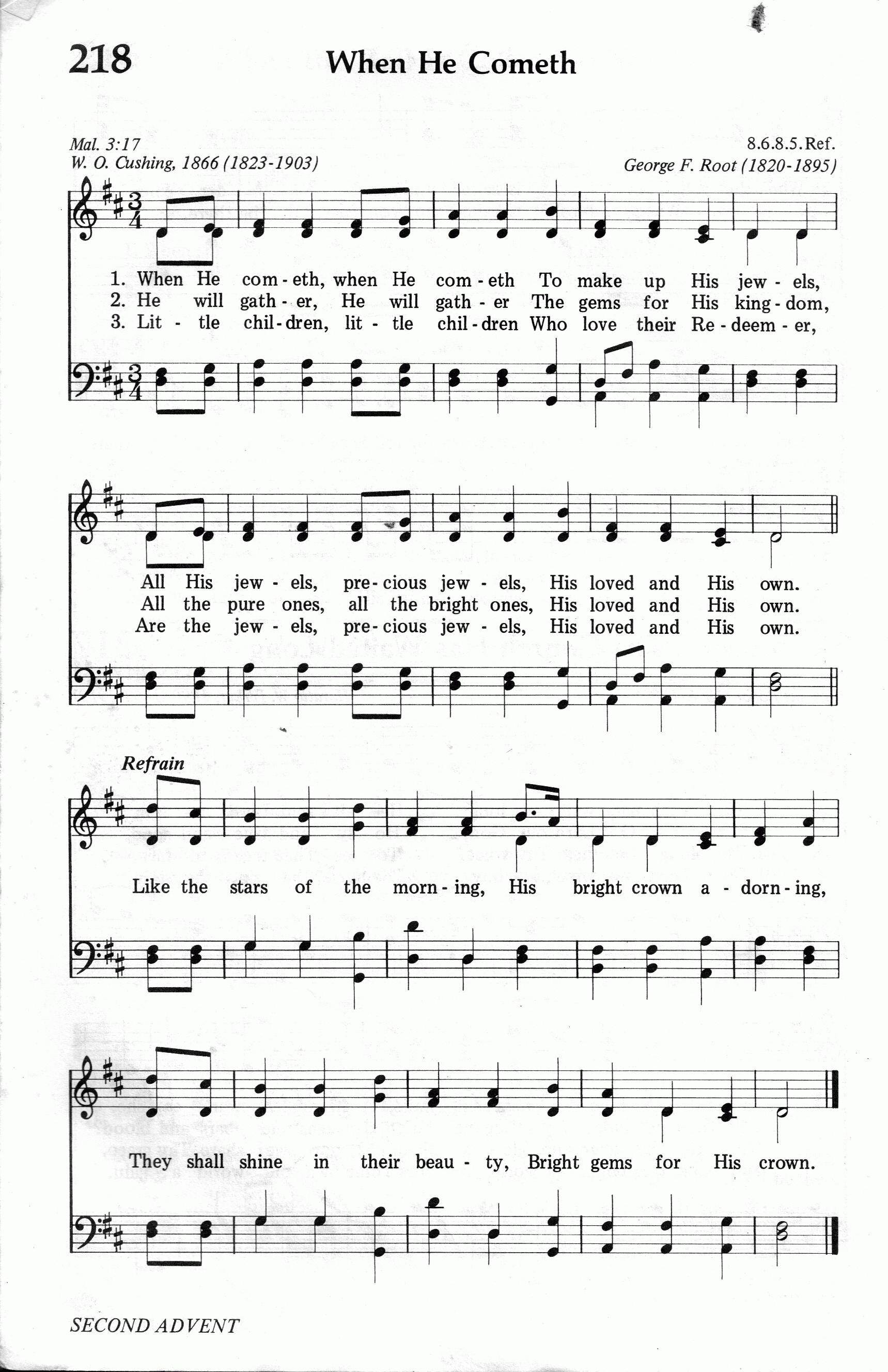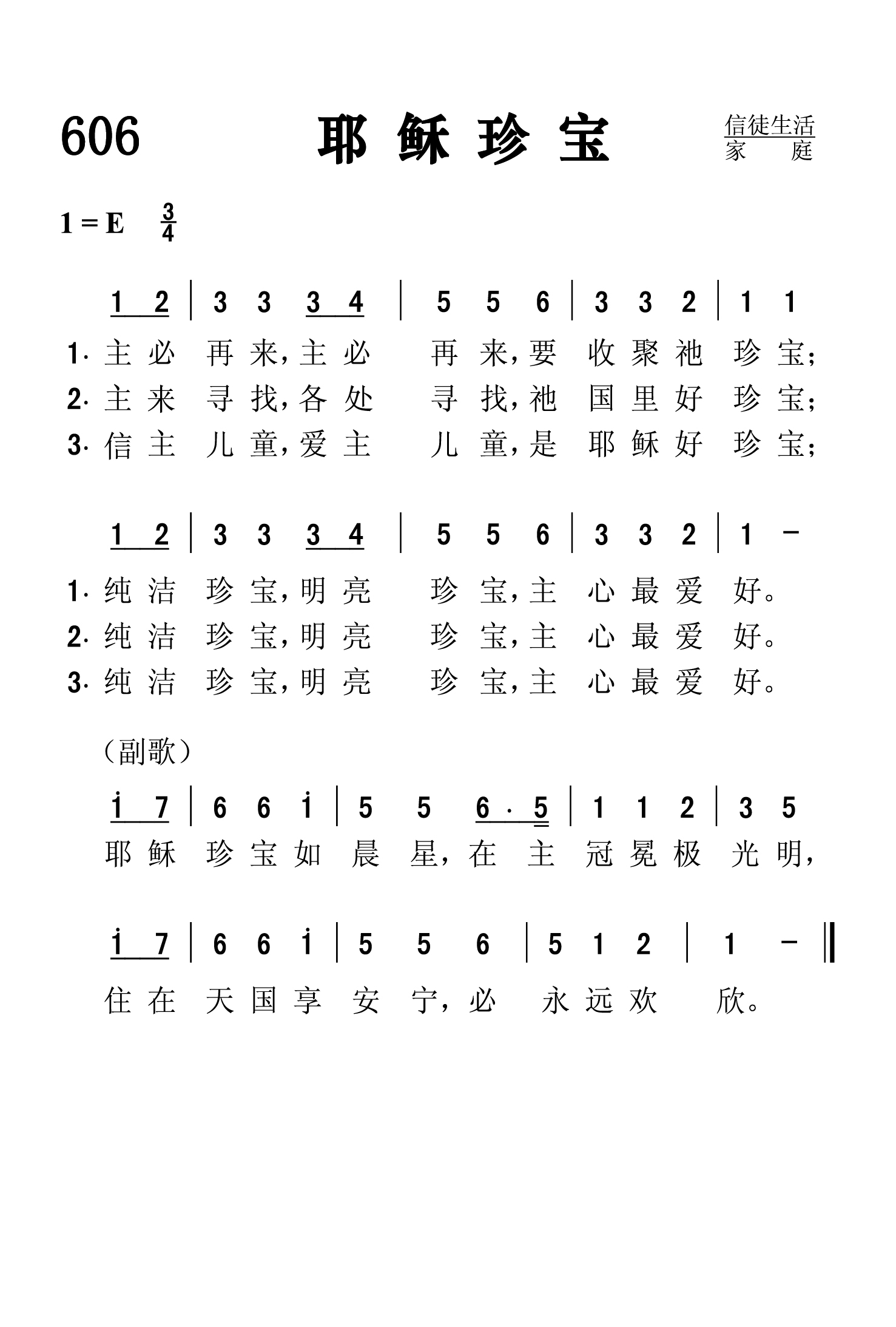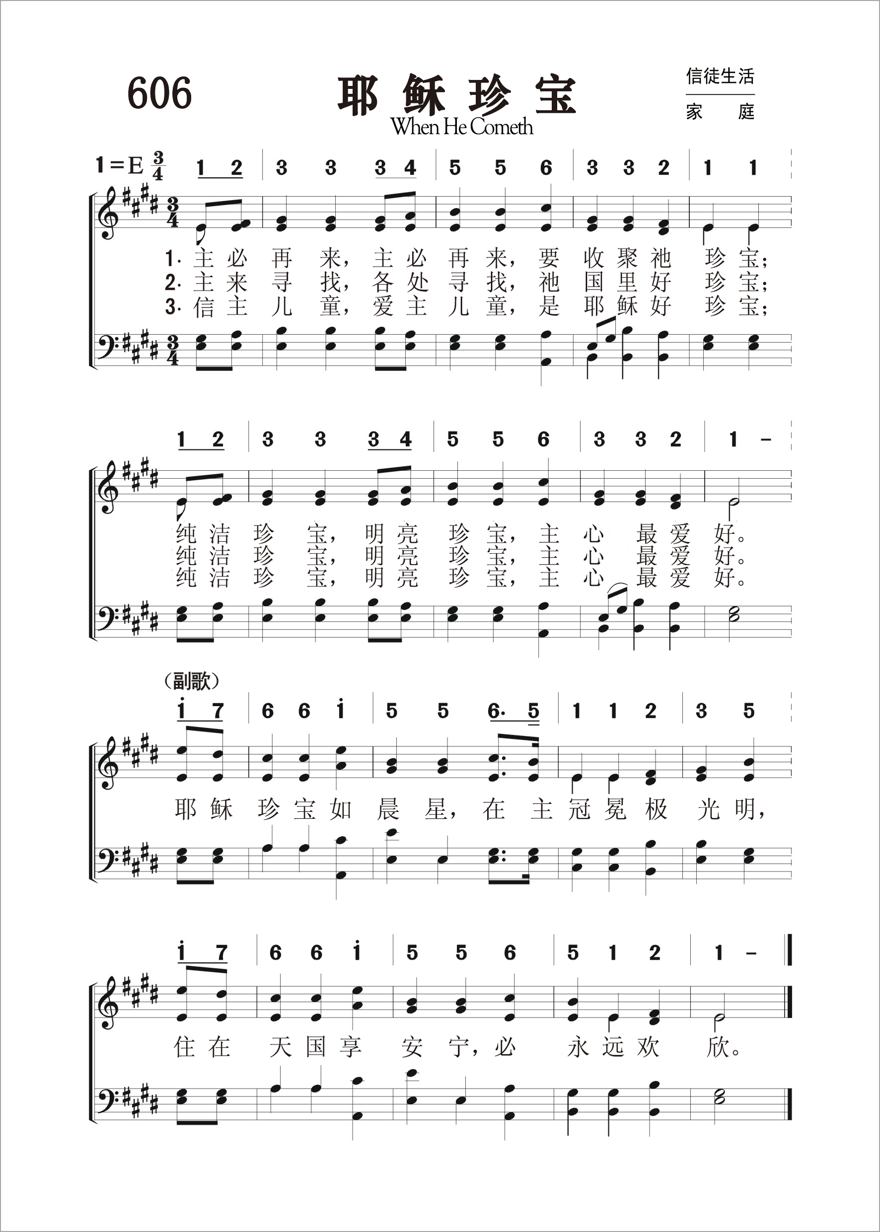 第606首 耶稣珍宝When He Cometh 库欣(W.O.Cushing, 1823-1902)作词 (1866年),鲁特(G.F.Root.1820-1895)作曲 主必再来,主必再来,要收聚祂珍宝; 纯洁珍宝,明亮珍宝,主心最爱好。 主来寻找,各处寻找,祂国里好珍宝; 纯洁珍宝,明亮珍宝,主心最爱好。 信主儿童,爱主儿童,是耶稣好珍宝; 纯洁珍宝,明亮珍宝,主心最爱好 耶稣珍宝如晨星,在主冠冕极光明, 住在天国享安宁,必永远欢欣。 “万军之耶和华说:‘在我所定的日子里,他们必属我,特特归我’”(玛3:17)。 《耶稣珍宝》是库欣牧师阅读《玛拉基书》第3章第17节时有感而作的。这节圣书英文的意思是:“万军之耶和华说:当我来收聚我的珍宝的日子,他们必要属我。”库欣牧师从以色列人的渴望,联想到主的再来,因而写下“等主回来,快要回来,要收聚祂珍宝”的诗句。这首诗经鲁特谱曲,先发表在美国芝加哥出版的《红岛诗集》,后由桑基收入其《圣诗与独唱》,很快就流传到各地,感动了许多人,使他们愿意为预备见主而珍惜今天的时光,做主的“净白珍宝,明亮珍宝。” 英国海兰兹有一个信心冷淡的青年。他的牧师认为他已经到了无法挽回的地步,谁都想不到有一天他会悔改归主,变成非常热心事奉主的信徒。牧师问他为何会有如此大的改变,他说是因为听到他的小妹妹唱“等主回来,快要回来,要收聚祂珍宝”而受的感动。 还有一个见证:一次,有一位牧师乘英国海船从欧洲回家。他去参观三等舱,见到不少各国的移民,就建议举行一个诗歌崇拜。他开始就领他们唱《耶稣珍宝》。由于歌词简单易懂,曲调轻快和谐,一会儿这些移民就都学会了 ,并在整个旅程中不断吟唱颂,把全船沉闷的气氛推向了高潮。时间过得很快,不知不觉,船已抵达港口,移民们忙着上岸换乘火车,在车厢里还传出兴高采烈的歌声。 我们每一个基督徒都是主的“珍宝”。祂曾舍身十架,用重价把我们赎回,所以祂视我们如眼中瞳人,掌上明珠。当祂驾天云复临的时候,祂必带着天上众使者降世,收聚祂所救赎的“珍宝”,使我们永远与主同居。 词作者库欣出生于美国新英格兰,自幼信主;青年时代受奋兴布道的影响,献身事奉主,担任牧师圣职。1870年他47岁时,不幸患病,健康恶化。后来疾病虽愈,但口以不能说话,无法再宣传主道,于是求主赐下写作圣诗的才能。此后,他以惊人的毅力写了圣诗三百余首,感动了许多人。他以坚强的信心,在世上又生活了三十三年,去世时80岁。他的圣诗多由鲁特、桑基、劳里等福音派圣诗作曲家为他配曲。 曲作者鲁特是美国19世纪著名音乐家。在他来改行谱写和出版福音圣诗歌曲之前,就已经是一位遐尔闻名,家喻户晓的作曲家,因为他所谱的《自由战歌》,《健儿们前进》是当时北方军队的进行曲,几乎人人都会唱,至今仍相当流行,并且已经有人将之配到赞美诗中来。鲁特长期从事圣乐教学和创作,一生共着有75部宗教歌曲的乐谱和几百首赞美诗,包括与盲诗人克罗斯比合作编着宗教歌剧《花后》。