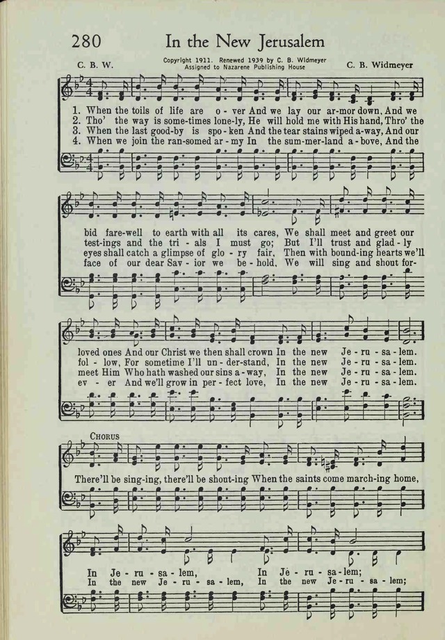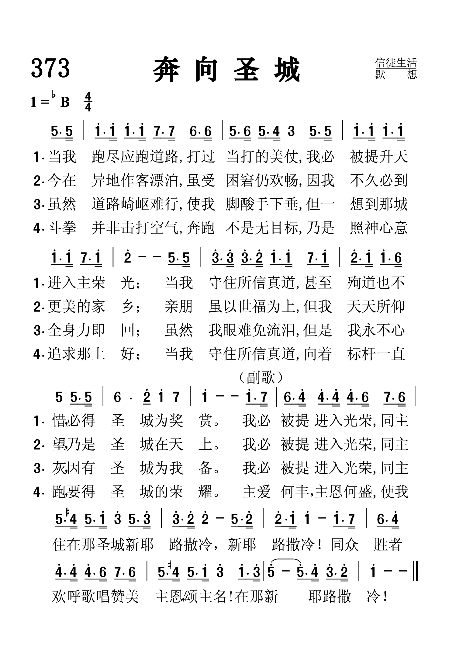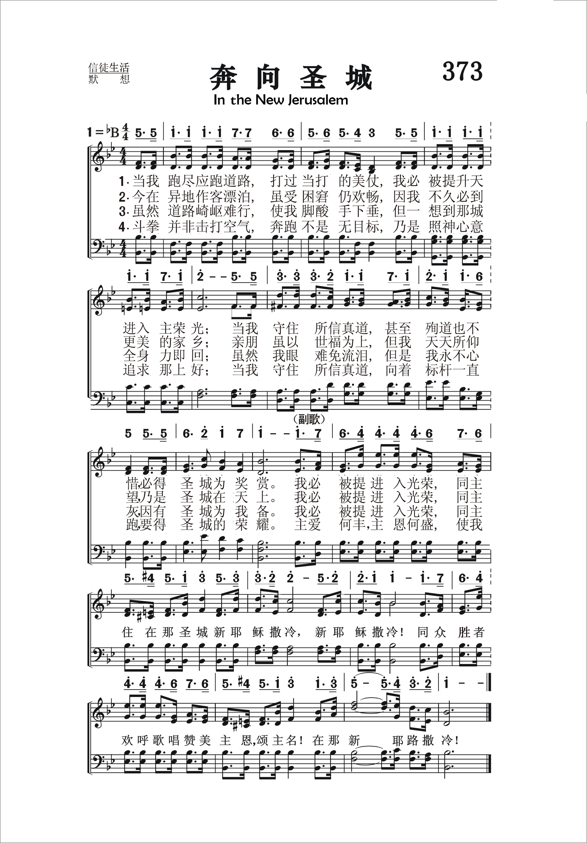 第373首 奔向圣城In the New Jerusalem 威德米尔(Charles Brenton Widmeyer,1884,7,19-1974,12,4)作词作曲(1911年) 当我跑尽应跑道路,打过当打的美仗,我必被提升天进入主荣光; 当我守住所信真道,甚至殉道也不惜,必得圣城为奖赏。 我必被提进入光荣,同主住在那圣城新耶路撒冷,新耶路撒冷! 同众胜者欢呼歌唱赞美主恩,颂主名!在那新耶路撒冷! 今在异地作客漂泊,虽受困窘仍欢畅,因我不久必到更美的家乡; 亲朋虽以世福为上,但我天天所仰望, 乃是圣城在天上。 我必被提进入光荣,同主住在那圣城新耶路撒冷,新耶路撒冷! 同众胜者欢呼歌唱赞美主恩,颂主名!在那新耶路撒冷! 虽然道路崎岖难行,使我脚酸手下垂,但一想到那城全身力即回; 虽然我眼难免流泪,但是我永不心灰, 因有圣城为我备。 我必被提进入光荣,同主住在那圣城新耶路撒冷,新耶路撒冷! 同众胜者欢呼歌唱赞美主恩,颂主名!在那新耶路撒冷! 斗拳并非击打空气,奔跑不是无目标,乃是照神心意追求那上好; 当我守住所信真道,向着标杆一直跑, 要得圣城的荣耀。 主爱何丰, 主恩何盛,使我住在那圣城新耶路撒冷,新耶路撒冷! 同众胜者欢呼歌唱赞美主恩,颂主名!在那新耶路撒冷! 威德米尔出生于美国西弗吉尼亚州的摩根市,曾任洛马角拿撒勒大学校长(1923-1926年)和服务救援组织拿撒勒部的主席(1923-1948年。1974年,他逝世于洛杉几。在诗歌创作方面,他颇有建树。