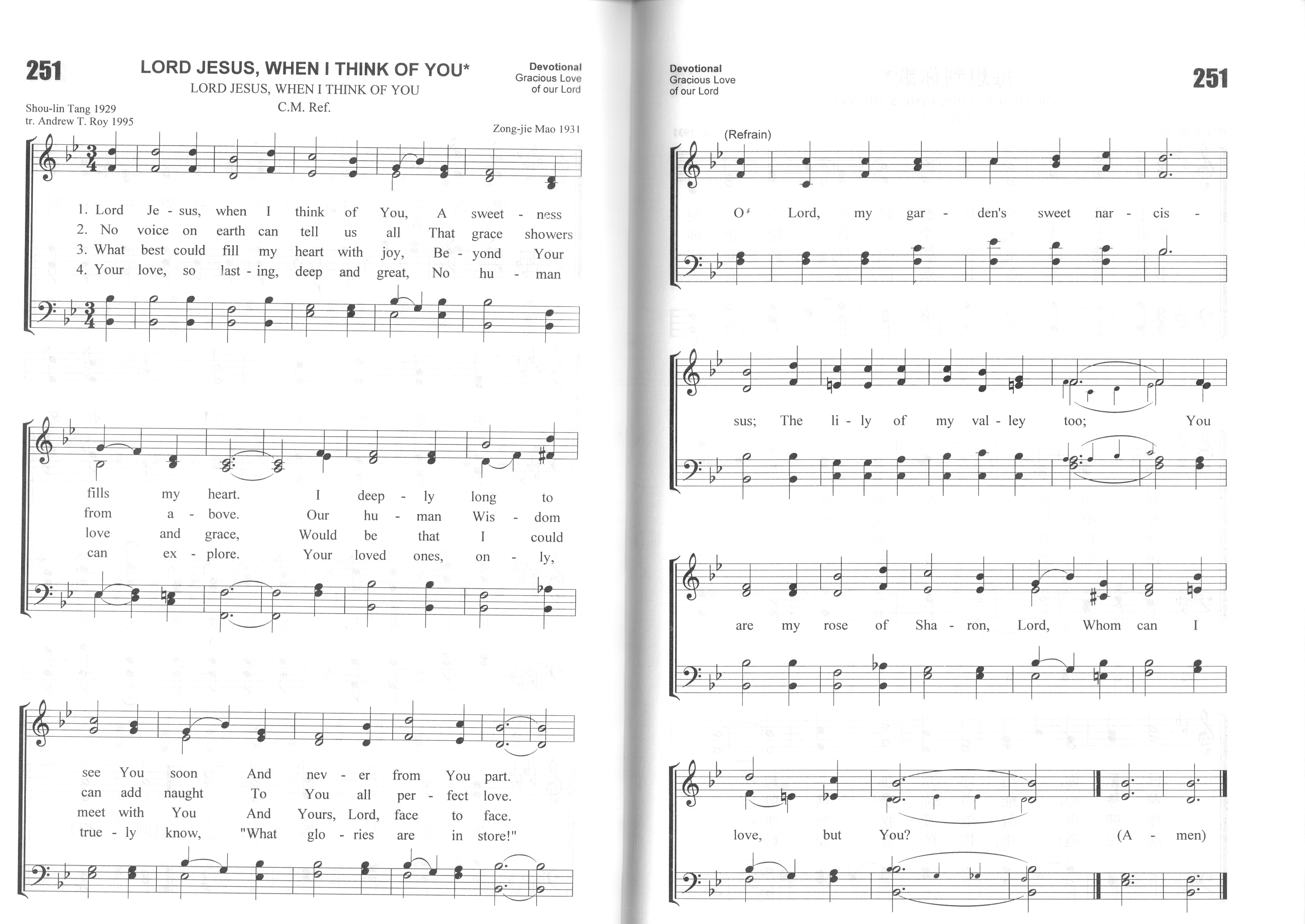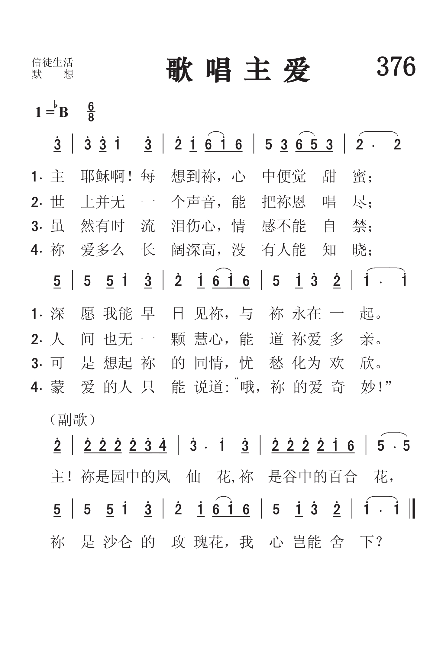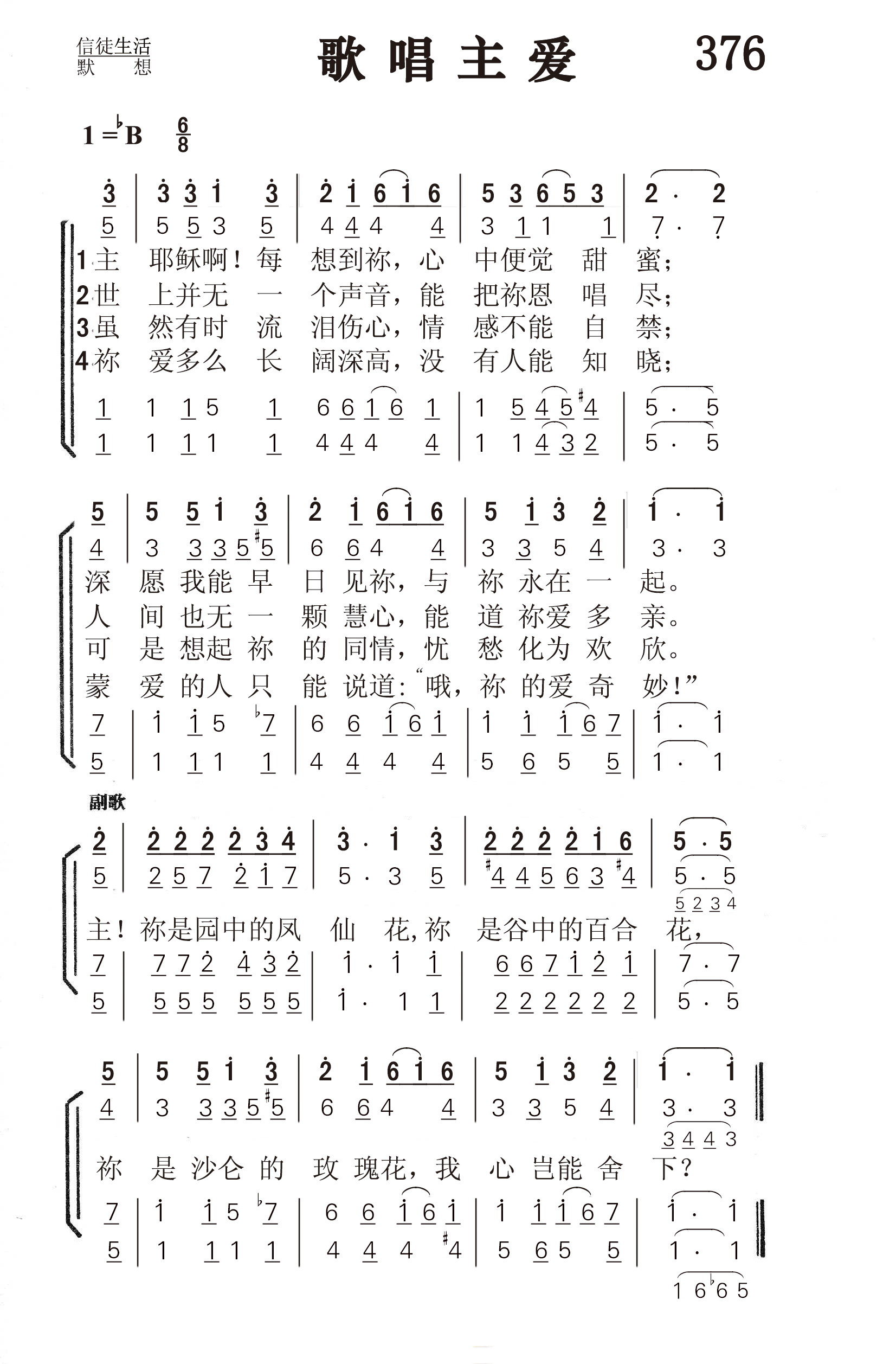 第376首歌唱主爱Lord Jesus,When I Think of You 唐守临(1906-1993)作词(1929年),毛宗杰(Mao Zong-jie,1913 - )作曲(1939年) 主耶稣啊!每想到祢.心中便觉甜蜜; 深愿我能早日见祢,与祢永在一起。 世上并无一个声音,能把祢恩唱尽; 人间也无一颗慧心.能道祢爱多亲。 虽然有时流泪伤心,情感不能自禁; 可是想起祢的同情,忧愁化为欢欣。 祢爱多么长阔深高.没有人能知晓; 蒙爱的人只能说道:“哦,祢的爱奇妙!” 主!祢是园中的风仙花,祢是谷中的百合花. 祢是沙仑的玫瑰花.我心岂能舍下 《歌唱主爱》是唐守临最初的习作,曾被宋尚节,周志禹等牧师在奋兴会中采用。后在各教会中广泛传唱。 本诗曲调是毛宗杰所谱。毛宗杰出生在上海,外祖父和父亲是传道人。他自幼在教会环境长大,从小就接触圣乐,在唱诗班唱诗。 他毕业于东吴大学文学院,先后在四川白沙国立女子师范学院音乐系任讲师,长沙湖南省立音乐专科学校及文艺学院音乐学系任教授。1956年起在上海音乐学院钢琴系任教,1984年退休。 当年毛宗杰就读于东吴大学附属第二中学,唐守临是他老师,因两人都喜欢音乐,就常在一起编唱诗歌。唐守临将这首歌词交给毛宗杰谱曲时,毛宗杰很受感动,他说:“这是所罗门王的雅歌,也是我们基督徒的希望和欢乐,它表达了信徒对主的爱。” 唐守临,又名唐醒,毕业于苏州东吴大学,曾在清心中学,复旦大学,东吴大学附属二中学执教。1929年献身传道。先在上海福音书房任编辑,参与修订基督徒聚会处的《诗歌》。作为倪柝声的同工,他先后在浙江、江苏、上海等地负责教会工作。抗战期间他曾去长沙、重庆等地传道。1950年至1958年担任上海教会长老。1956年以后带领一部分基督徒聚会处信徒参加三自,并长期担任中国基督教三自爱国运动委员会副主席。1982年,他担任中国基督徒圣诗委员会委员。1988年后任中国基督教协会第二、三届顾问。唐守临在诗歌创作方面很有才华。他自己又是出色的男低音。他写的许多诗歌在信徒中广为传唱。
