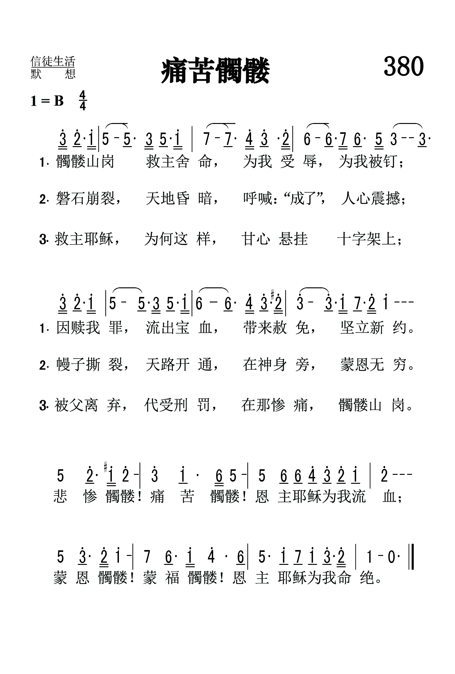 第380首 痛苦髑髅On the Mount of Calvary (《颂赞圣诗》88首,《诗歌》97首) 髑髅山岗,救主舍命,为我受辱,为我被钉; 因赎我罪,流出宝血,带来赦免,坚立新约。 磐石崩裂,天地昏暗,呼喊:“ 成了 ”,人心震撼; 幔子撕裂,天路开通,在神身旁,蒙恩无穷。 救主耶稣,为何这样,甘心悬挂十字架上; 被父离 弃,代受刑罚,在那惨痛,髑髅山岗。 悲惨髑髅!痛苦髑髅!恩主耶稣为我流血; 蒙恩髑髅!蒙福髑髅!恩主耶稣为我命绝。 当主悬挂在十字架上的时候,祂所牵挂的,乃是你我罪人。祂不顾及自己的痛苦,却在为苦害祂的人代祷。祂的慈悲心肠,由此可见一斑。我们想到髑髅山冈惨痛的画面,顽梗之心岂不融化净尽。我们岂能再犯罪作恶,让救主为我们白白受苦!
