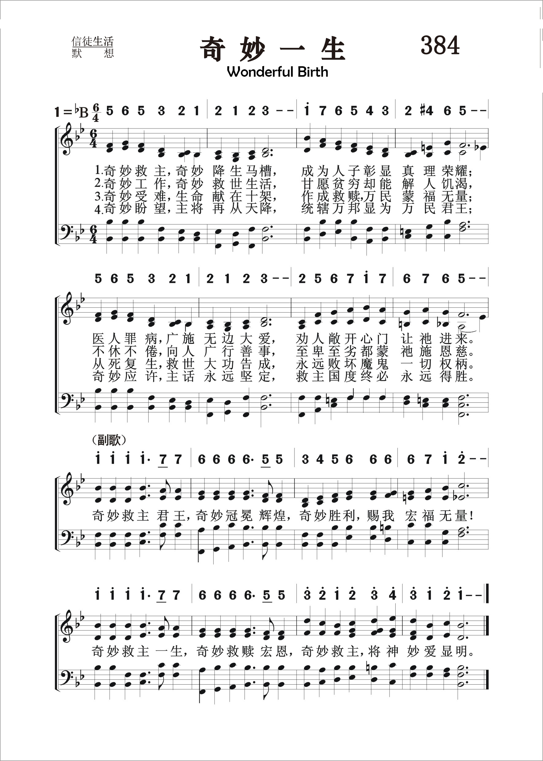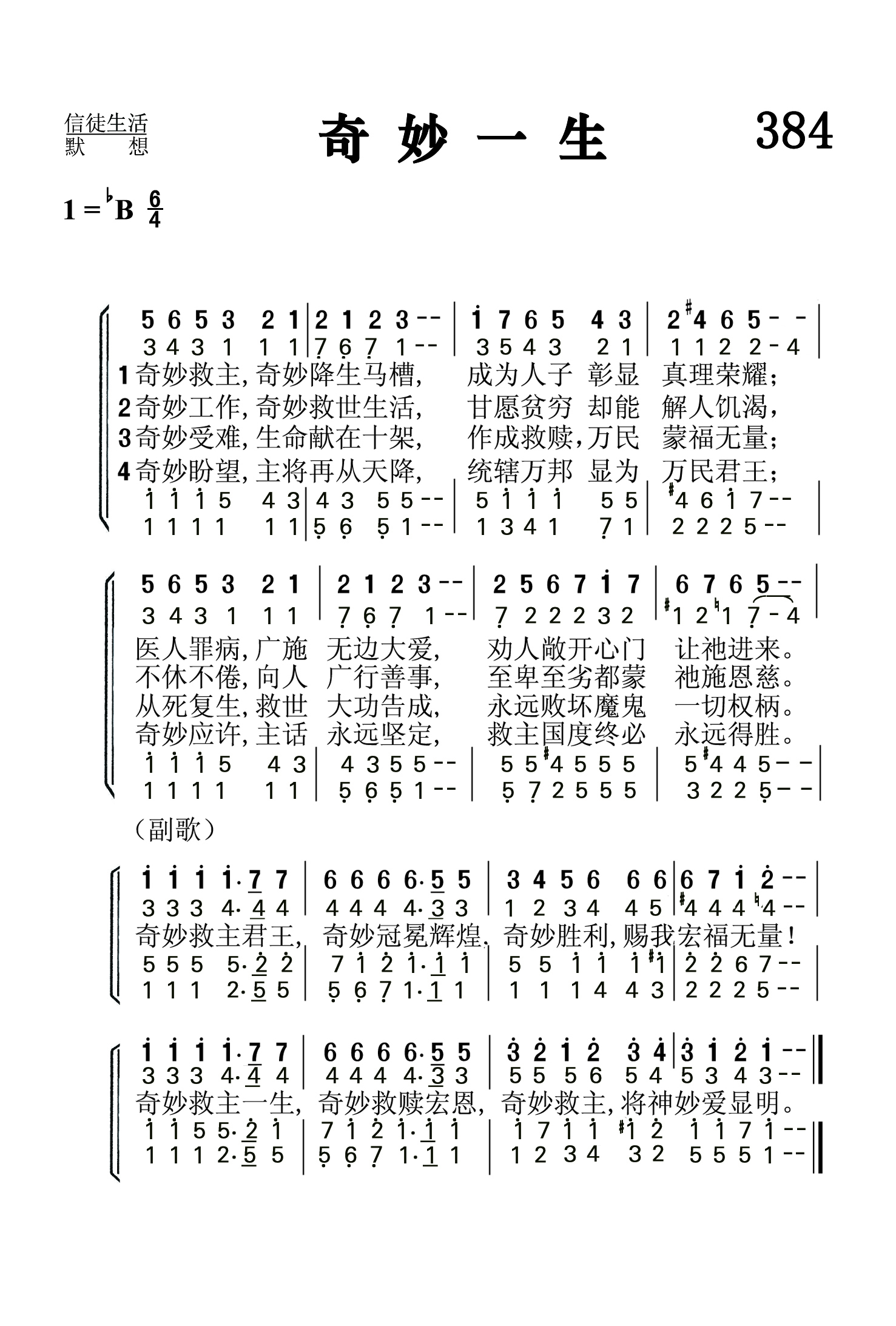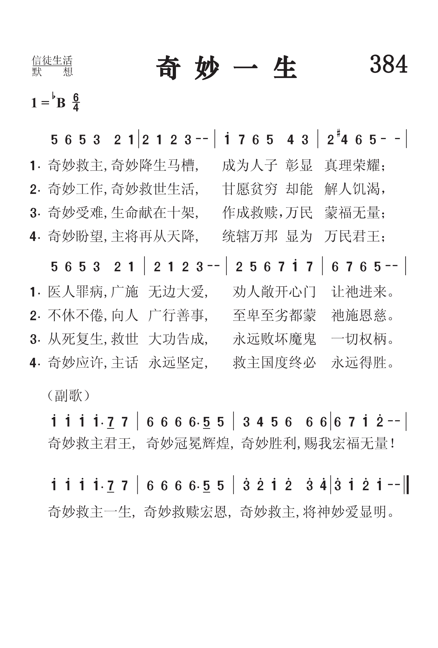 第384首奇妙一生Wonderful Birth 阿克利(A.H.Ackley,1887,1,21-1960,7,3)作词作曲 奇妙救主.奇妙降生马槽,成为人子彰显真理荣耀; 医人罪病,广施无边大爱,劝人敞开心门让祂进来。 奇妙工作,奇妙救世生活.甘愿贫穷却能解人饥渴, 不休不倦,向人广行善事,至卑至劣都蒙祂施恩慈。 奇妙受难,生命献在十架,作成救赎万民蒙福无量, 从死复生,救世大功告成,永远败坏魔鬼一切权柄。 奇妙盼望,主将再从天降,统辖万邦显为万民君王; 奇妙应许,主话永远坚定,救主国度终必永远得胜。 奇妙救主君王,奇妙冠冕辉煌,奇妙胜利。赐我宏福无量! 奇妙救主一生,奇妙救赎宏恩,奇妙救主,将神妙爱显明。 阿克利的这首诗歌赞颂了救主奇妙的一生,节奏明快,感情真挚,把救主屈尊降卑,治病救人,扶贫解困,广行善事,献身受难,得胜复活,败坏死权,以及将来在荣耀中再来的画面展示在我们面前。 阿尔福雷德.阿克利是美国.颇具盛名的音乐家。他出生于宾夕法尼亚州斯普林希尔市,自幼跟父亲学音乐,后到伦敦皇家音乐学院深造,成为出色是大提琴演奏家。他毕业于马里兰州威斯敏斯特神学院,1914年被按立为长老会牧师。他曾协助编写长老会赞美诗集,创作了1500余首诗歌。