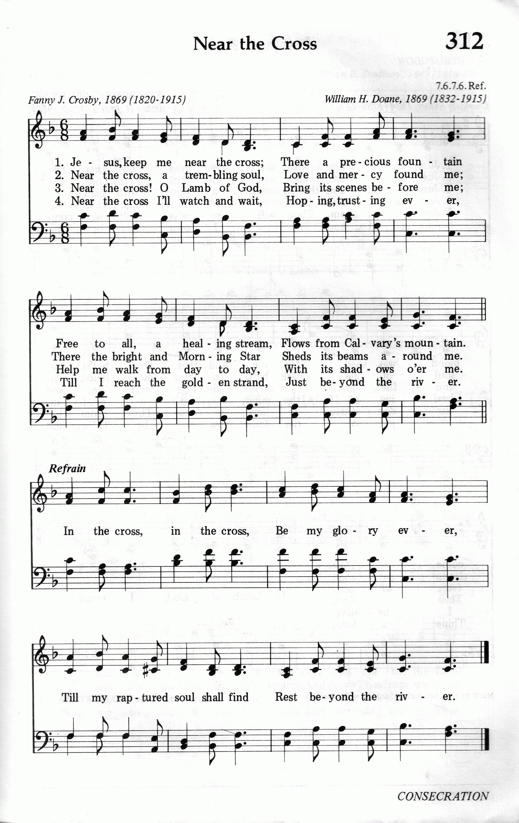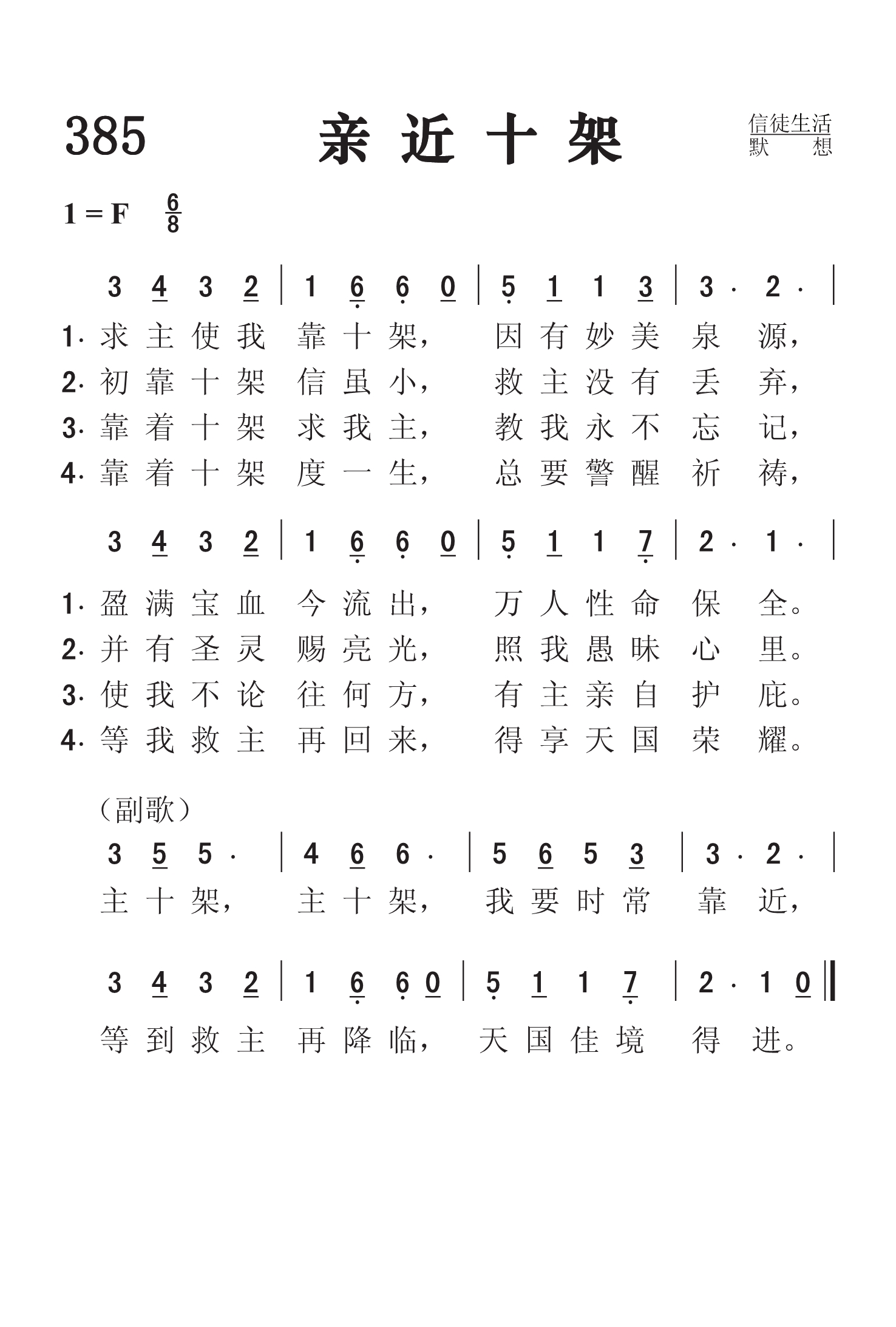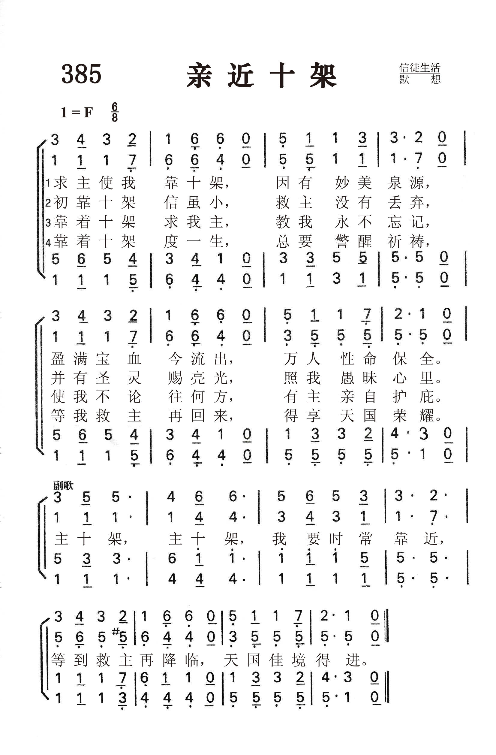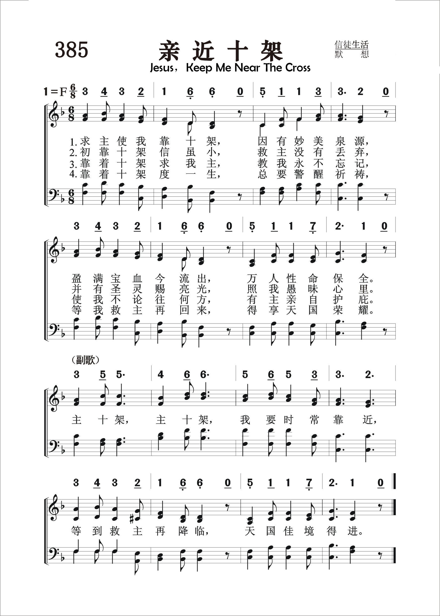 第385首 亲近十架Jesus,Keep me Near the Cross 克罗斯比(1820-1915年)作词,多恩(1832-1915年)作曲 求主使我靠十架,因有妙美泉源, 盈满宝血今流出.万人性命保全。 初靠十架信虽小,救主没有丢弃, 并有圣灵赐亮光.照我愚昧心里。 靠着十架求我主,救我永不忘记, 使我不论往何方.有主亲自护庇, 靠着十架度一生,总要警醒祈祷, 等我救主再回来,得享天国荣耀。 主十架,主十架,我要时常靠近, 等到救主再降临,天国佳境得进。 词作者克罗斯比是美国才华出众,负有盛名的福音女诗人。她出生六个月时因庸医,误诊而双目失明。15岁时她就读于纽约最早的一所盲童学校。1847-1858年,她留在该校教授英语语法,修辞学,罗马史和美国历史。她少年时代就开始写诗,24岁时出版了《盲女与她的诗》,引起美国文坛的注意。1850年灵性奋兴的经验,使她集中全力专写圣诗,后在福音圣诗作曲家和编辑布雷得伯里的鼓励下,立志以创作福音圣诗作为自己的终生事业,于是与纽约一家出版社签订合同,每周写圣诗三首,结果写了5929首。此外,她还为布利斯写525首,为桑基写237首,为劳里写219首,为多恩写1500首。她一生共写了8440首圣诗,堪称为最多产的圣诗作家。 这首诗是美国盲女诗人克罗斯比所写的最优美,最流行的圣诗之一。它的副歌“十字架,十字架,永是我的荣耀。”是奋兴会上经常听到的短歌,三十年代我国教会已常唱颂。它是先由多恩谱好了曲调,再请克罗斯比作词。词曲配合的很好,所以把调名称为《亲近十架(NEAR THE CROSS)》。最初见于布雷德伯里所编的《明珠(BRIGHT JEWELS)》一书。1869年在纽约出版。 《亲近十架》共有四节,第一节讲到依傍主十架,只有基督宝血洗净万众罪愆,第二节作者谦卑地说自己信心小,但主爱不丢弃他;第三节是要在十架前祷告,思想救主宏恩;第四节讲要仰望,等候救主再来,同享天国荣耀;副歌则指出了我们之所以罪得洗清,是唯靠耶稣宝血。 曲调平稳朴素,高潮是在副歌“十字架,十字架”。是发自虔敬信徒内心深处的呼声,使唱者、听者都受感动。 曲作者霍华德多恩是富有才华的音乐家,克罗斯比的多年合作者。他出生于美国康涅狄格州普理斯顿市,14岁就带领唱诗班,青年时代与他父亲经营布店,以后转任机器厂厂商。因他服务态度很好,受到市民的欢迎,曾被选为市政委员。他业余为福音圣诗谱曲达二千多首。其中有不少经典之作。