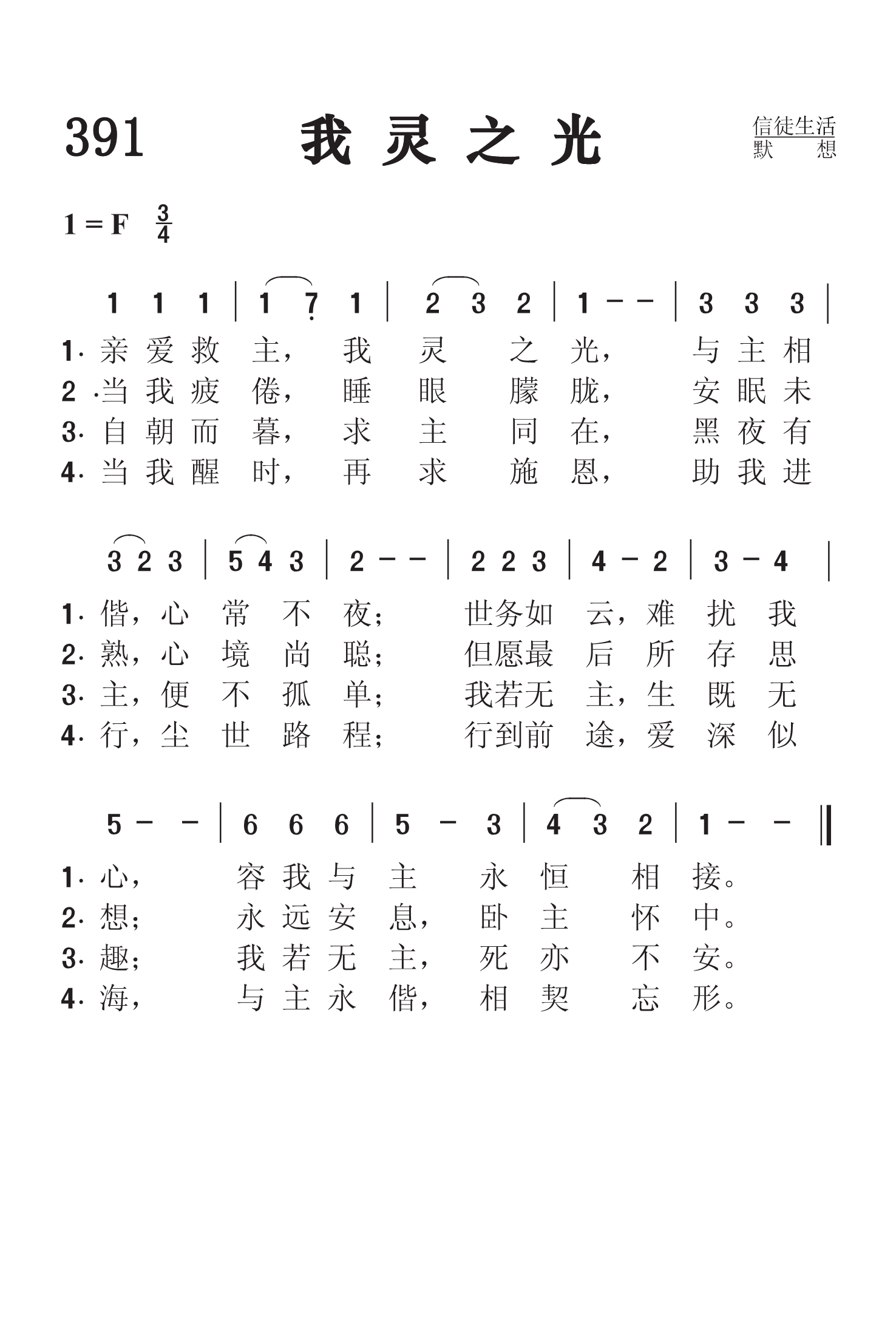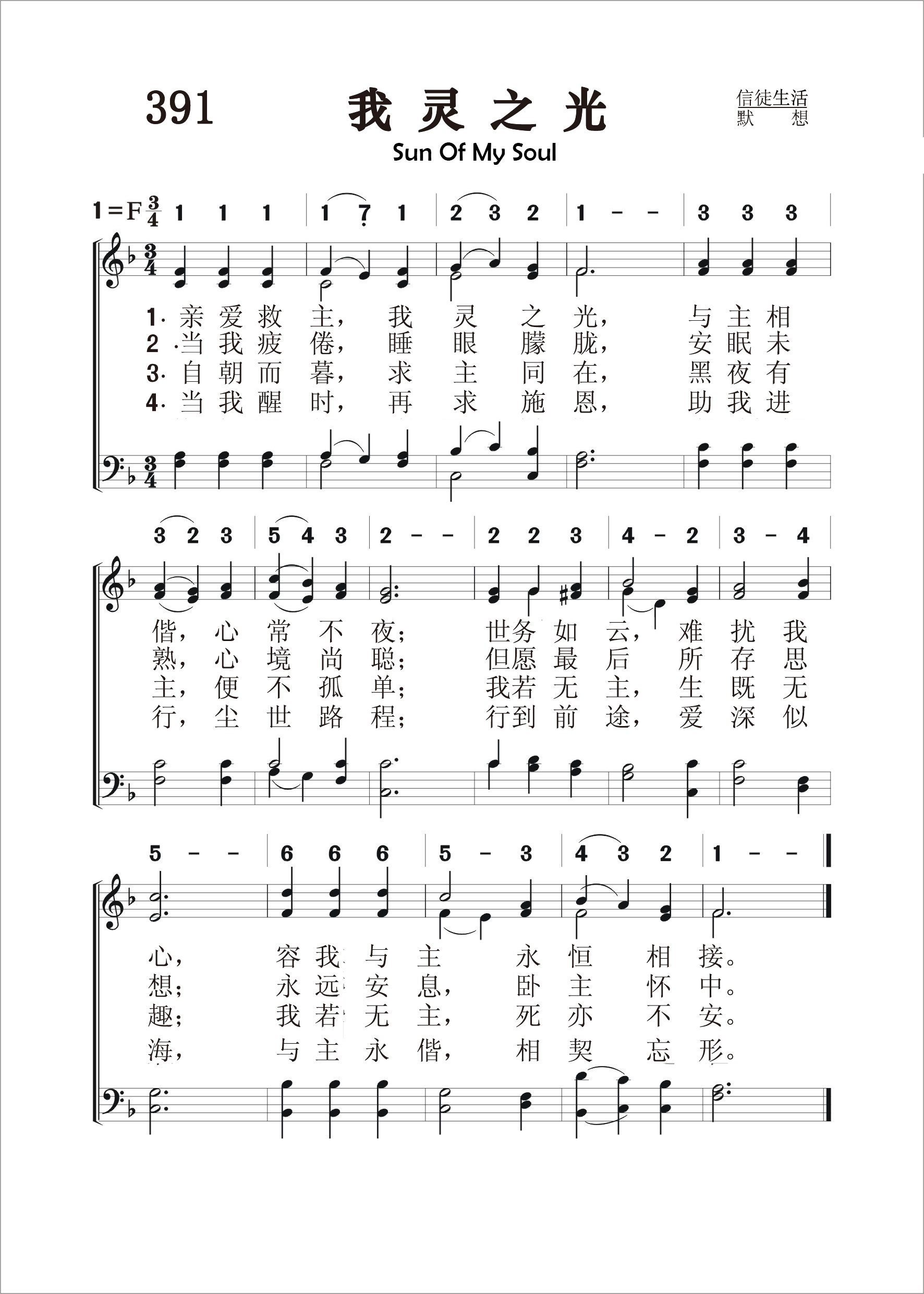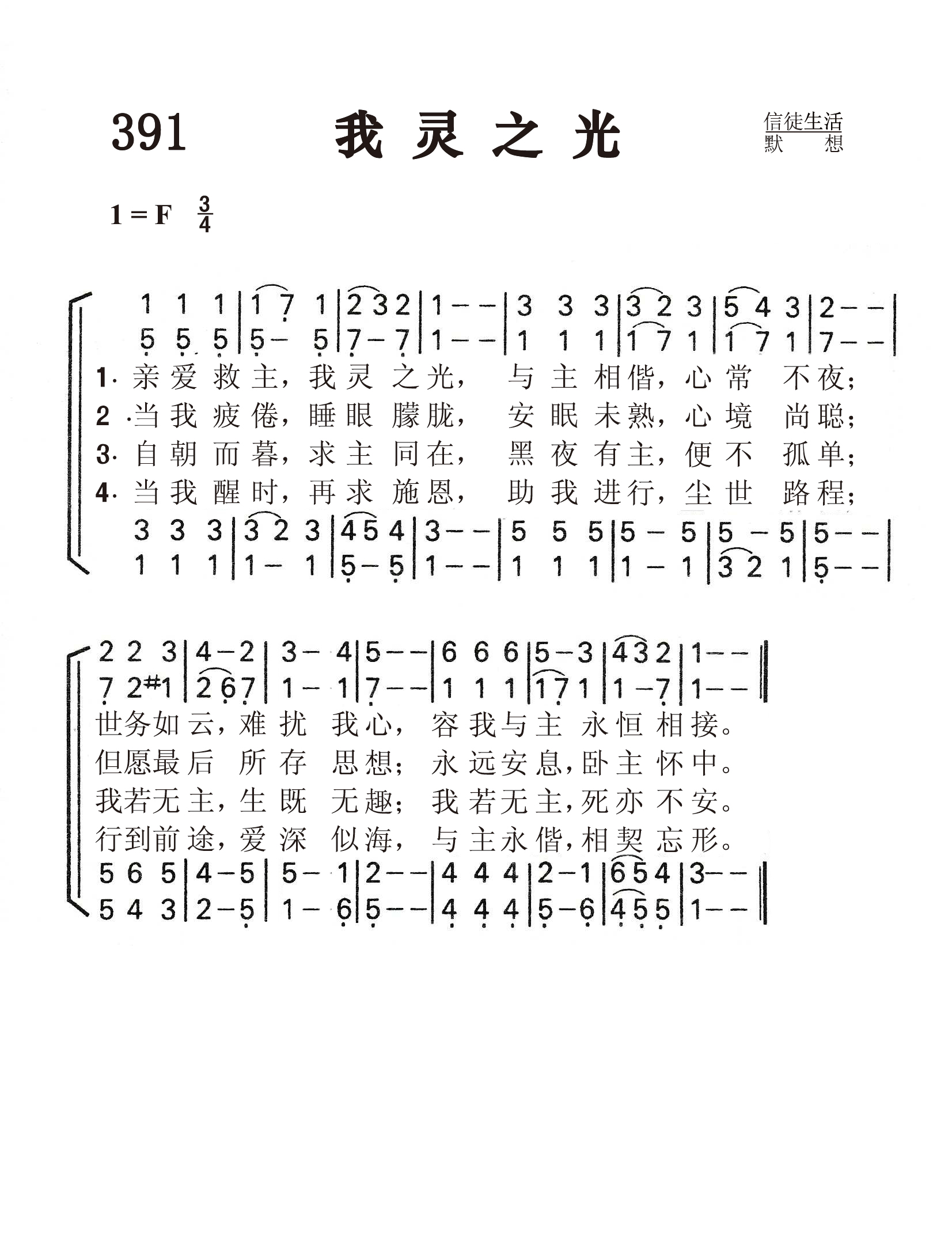 第391首 我灵之光Sun of My Soul 基布尔(John Keble,1792,4,25-1866,3,29)作词(1820),蒙克(W .Honk ,1823,3,16-1889,3,1)改编(1861),刘廷芳译(1933年) 亲爱救主,我灵之光, 与主相偕,心常不夜; 世务如云,难扰我心, 容我与主永恒相接。 当我疲倦,睡眼朦胧, 安眠未熟,心境尚聪; 但愿最后所存思想; 永远安息,卧主怀中。 自朝而暮,求主同在, 黑夜有主,便不孤单; 我若无主,生既无趣; 我若无主,死亦不安。 当我醒时,再求施恩, 助我进行,尘世路程; 行到前途,爱深似海, 与主永偕,相契忘形。 词作者基布尔是英国圣公会的牧师。他父亲也一位牧师,属于圣公会高派,非常博学,对布尔影响很大。基布尔14岁就读于牛津大学,在校时成绩优异,曾获重奖。毕业后留校任教九年。他1823年起任汉普郡赫斯黎农村教堂牧师,四十三年如一日,始终不渝地从事牧养教会信徒的工作。 基布尔同时也是一位著名的宗教诗人,是英国牛津大学运动的领导人之一。1827年他出版了诗集——《基督教周年》。这是一本按教会周年节日编写的灵修默想诗集,表达了他对教会历史的向往,和个人的属灵追求,并继承了17世纪以来英国神学的宝贵遗产,出版之后风行全国。这本专集在基布尔生前先后出了一百版,被认为是最伟大英语宗教经典之一,曾一度与圣公会《公祷书》齐名。如果说《公祷书》是信徒公共礼拜使用的散文巨著,那么《基督教周年》就是个人灵修的韵文杰作。据说一位英国信徒,一次要同他四个儿子到外地度假。他叫每个人都带一本自己最喜欢的书;到了度假地,他发现四个儿子带的都是《基督教周年》。本诗原题《清晨》,共有16段。依据的经文是哀3:22-23:“我们不至消灭,是出于耶和华诸般的慈爱,是因祂的怜悯不至断绝。每早晨这都是新的。”一般赞美诗集采用六段或三段。 《我灵之光》是基布尔的长诗《夜晚》中摘选出来的,收集在基布尔的《基督教周年》中,它是根据以马忤斯途中两位门徒在夕阳西沉之时求主一同住下的经历为背景的(路24:29)。基布尔在夜幕降临之际,想到救主乃信徒心灵中不夜之光,就写下了这首诗: 亲爱之主,我灵之光。 与主相偕,心常不夜…… “我灵之光”直译是“我心灵的太阳”。有一次,有人问英国著名大诗人丁尼森对基督有什么认识的时候,他指着花园中盛开的美丽花卉回答说:“太阳对这些花朵的影响是怎样,基督对我们的心灵也是怎样,基督是我心中的太阳。” 在一个暴风骤雨的夜晚,一艘载满旅客的轮船在大海中失事飘荡,发出紧急的求救信号,可是岸上的人们因天色一片漆黑,无法确定失事船只的位置。这时船上有一位女子唱起了“亲爱之主,我灵之光”。他们就循着歌声找到了轮船,救上了全船的旅客。 《我灵之光》的乐调名《赫斯莱(HURSLEY)》,出自1774年在维也纳出版的《教会圣诗集》。基布尔写了这首诗后,就和妻子选定它作为曲谱。作曲家蒙克于1861年对它进行了改编并配上和声。 《我灵之光》的意境十分宽广,它使信徒的思想从“贫乏之家”,“病痛之人”,延伸到“普世愁人”。勉励信徒要“万人恳求、祷告、代求、祝谢”(提前2:1),平稳柔和的旋律,使人在吟唱的时候,心灵更加贴近恩主。这是晚间祷告灵修的一首好诗歌。 “我躺下睡觉,我醒着,耶和华都保佑我”(诗3:5)。 曲作者蒙克出生于英国伦敦,是著名的琴师,唱诗班指挥,圣乐作家,圣诗编辑,声乐教授。他把毕生的精力都奉献献给了教会,一生只写过一首世俗歌曲,其余均为圣乐。当他在纽英伦圣马提亚堂任管风琴师时,曾领导一个业余唱诗班,每天唱诵早晚礼拜众赞歌的全部祷文,同时兼任伦敦皇家音乐学院声乐教授。他曾对人说:“教堂的管风琴是感动人心的工具,而不是炫耀自己技术的乐器。”他所谱写的圣诗旋律既有历史风采,又有时代特征。1882年达勒姆大学授予他音乐博士学位。 蒙克是英国圣公会《古今圣诗集》(Hymns Ancient and Modetm)的发起人和首任主编。该诗集在他生前就出版了四次。第四版正好在1889年他去世前出版。1861年第一版有他谱的曲19首,1868年第二版有6首,1875年第3版有13首,1889年第四版中有18首。他毕生出事编辑赞美诗的工作,直到最后一息。1889年3月1日临终前他还在校阅诗稿。